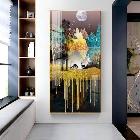 Alpine Gold Reindeer Waterfall Glass Finish Vertical Wall Art