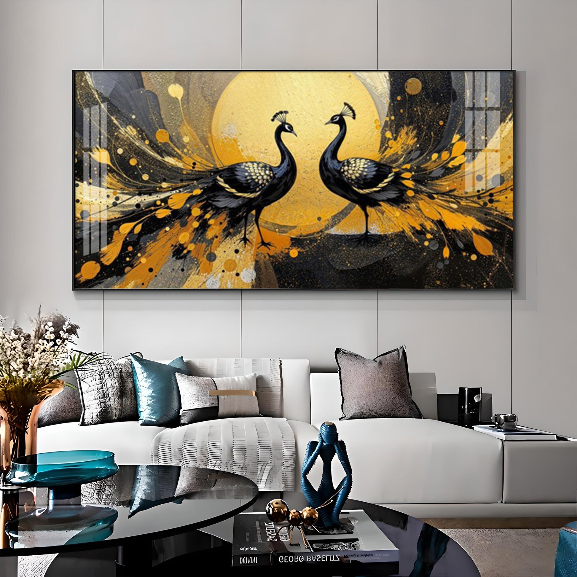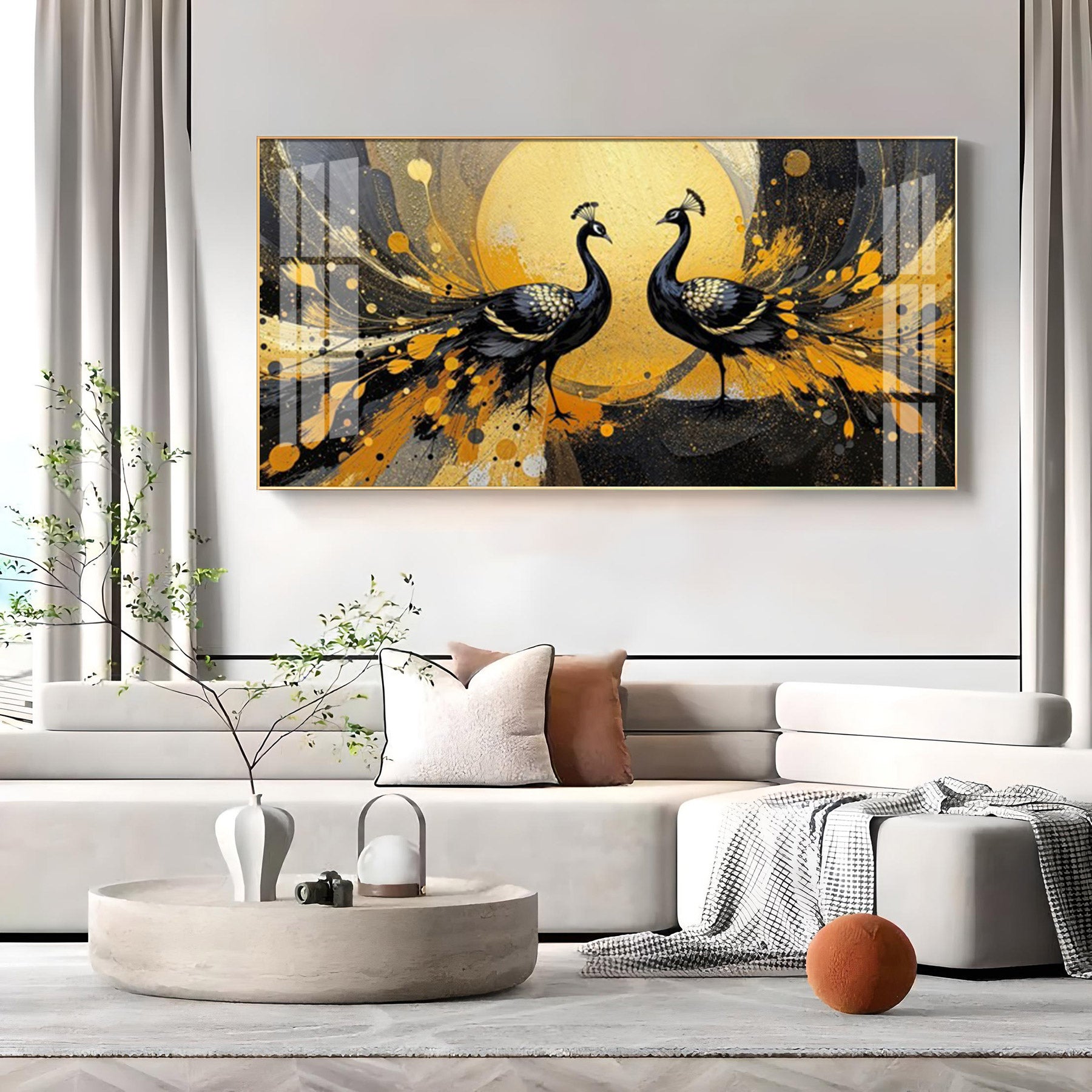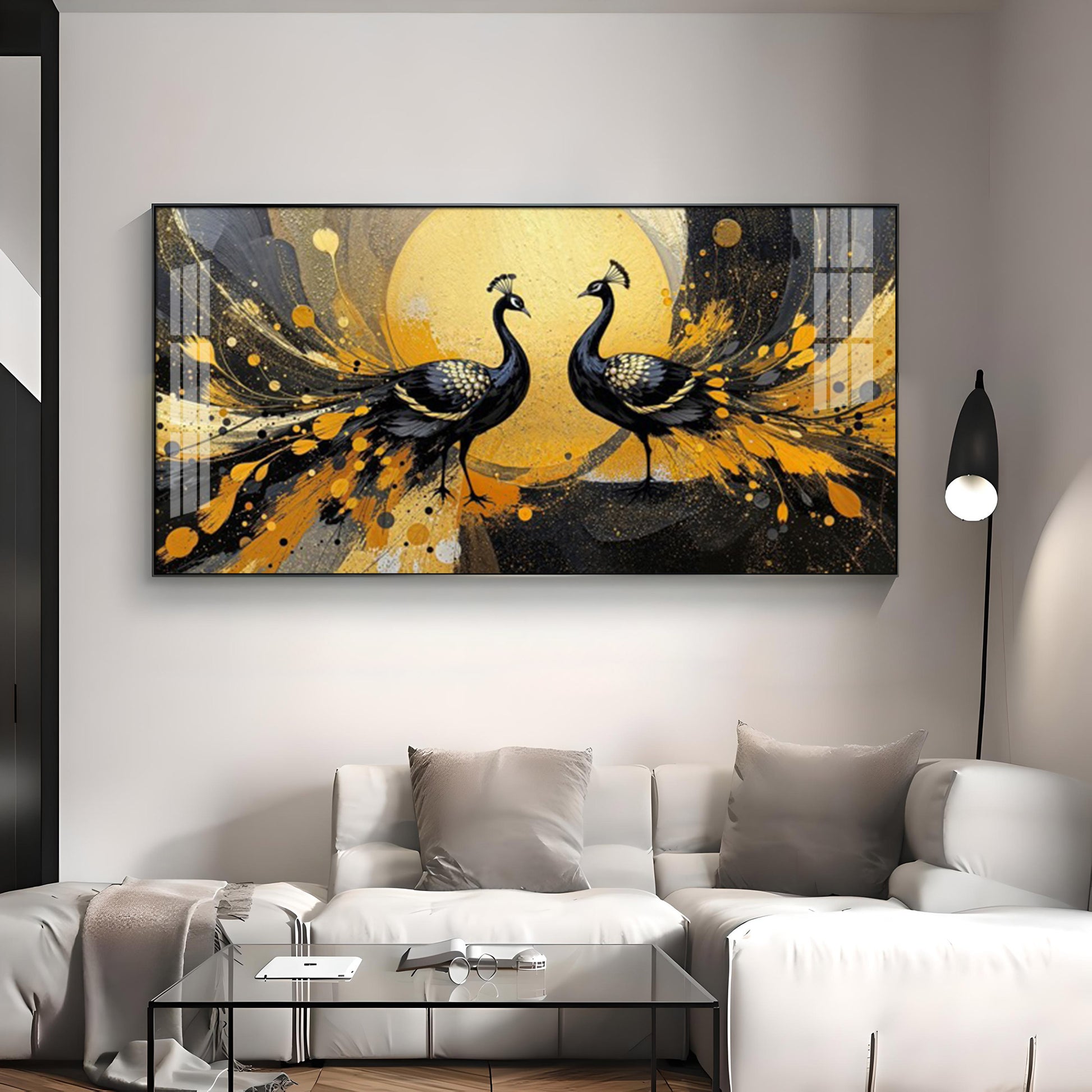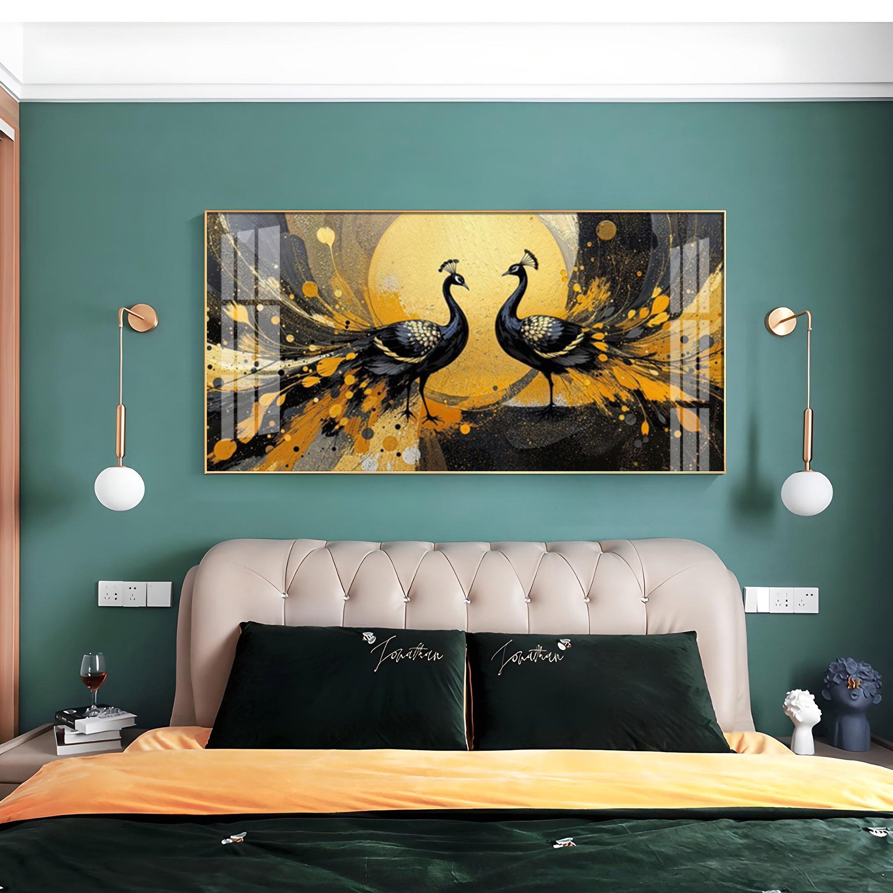 Abstract Two Peacock Looking Each Other Glass Finish Horizontal Wall Art