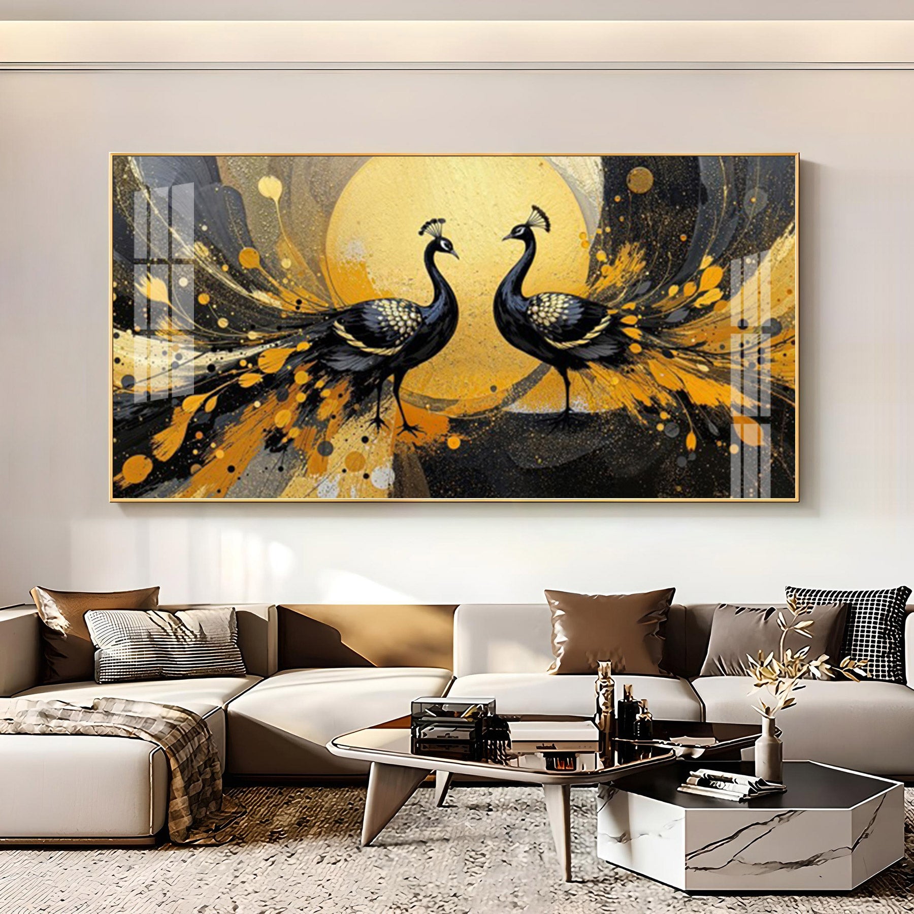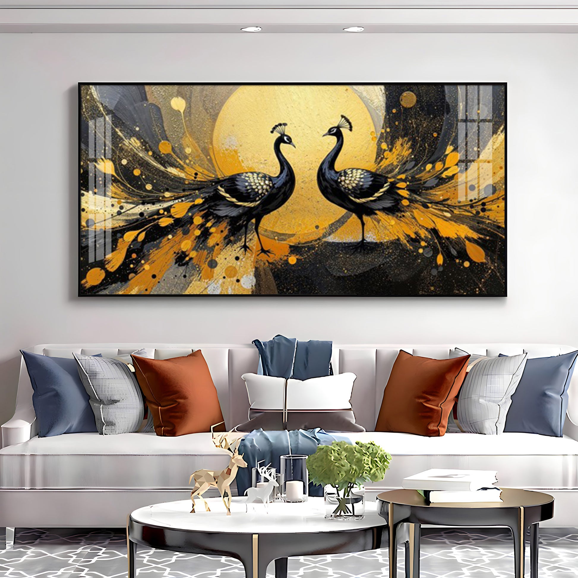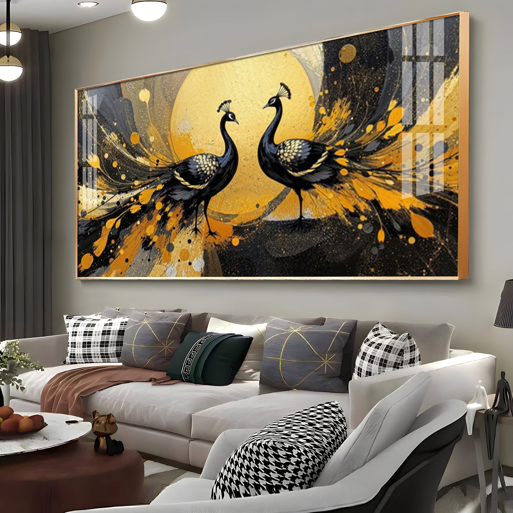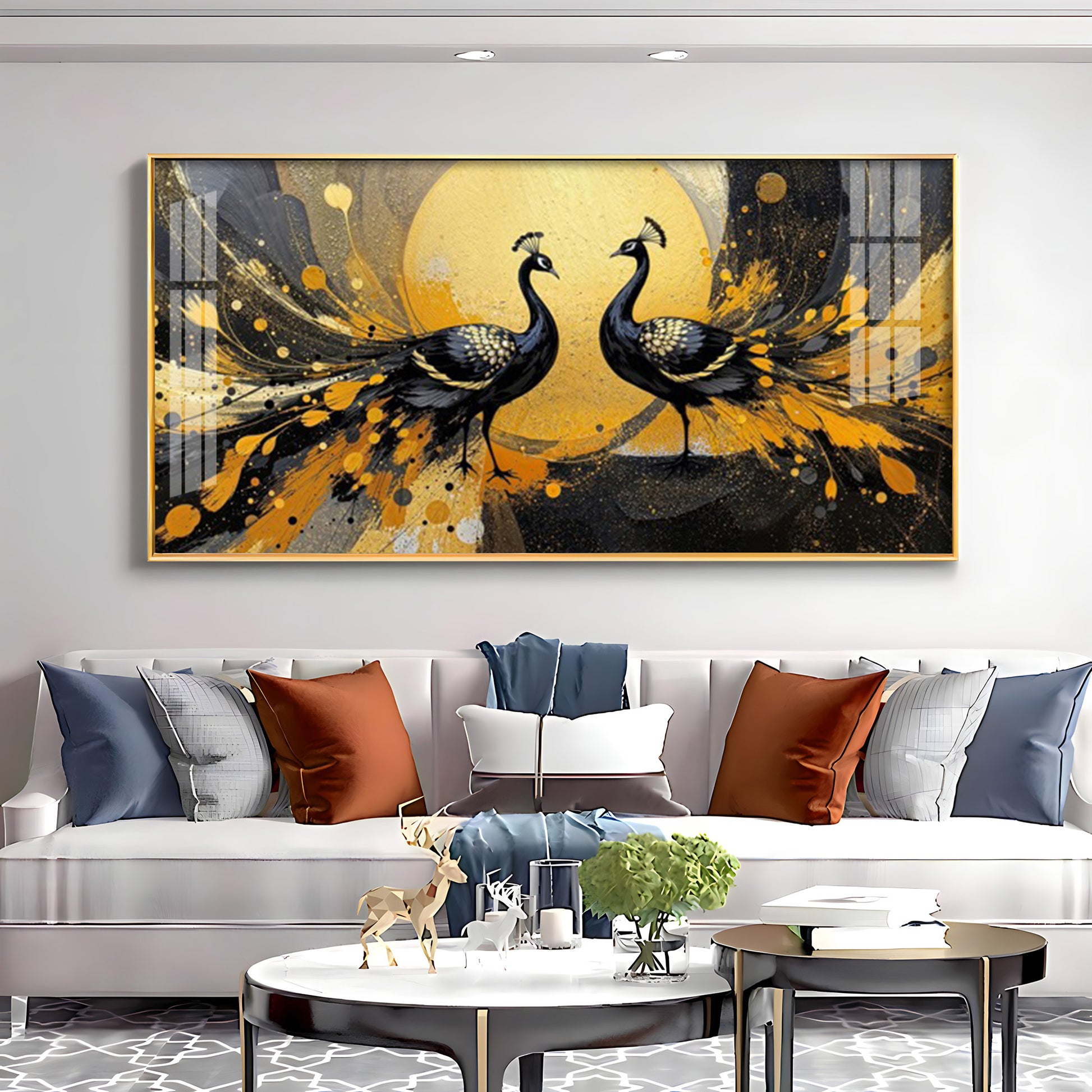 Abstract Two Peacock Looking Each Other Glass Finish Horizontal Wall Art