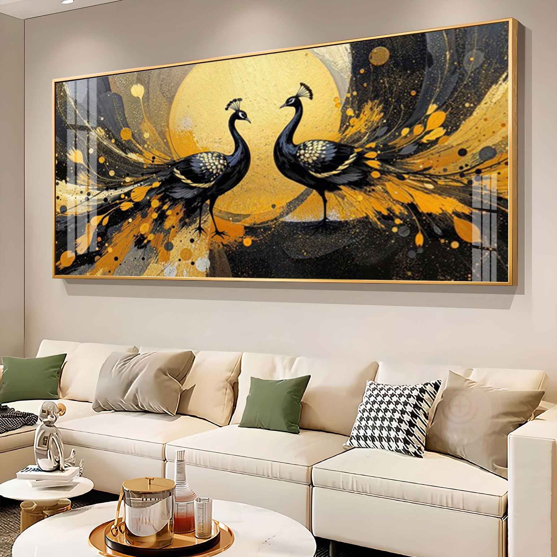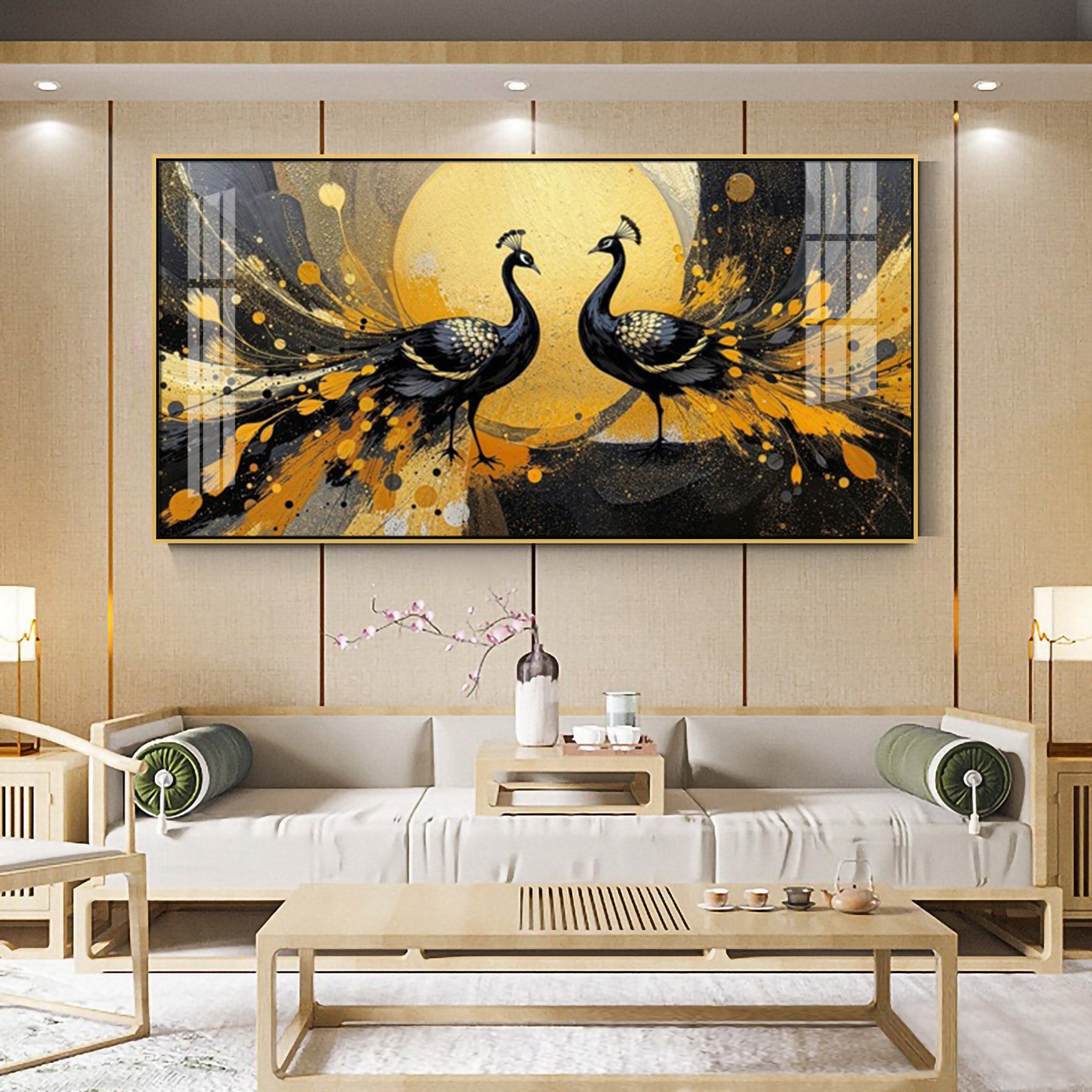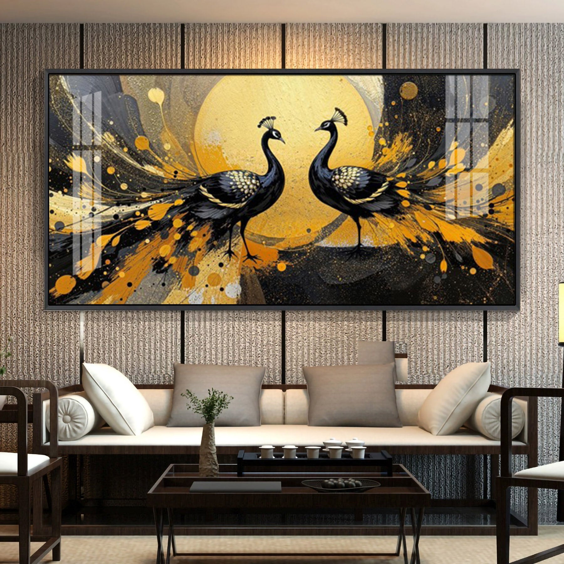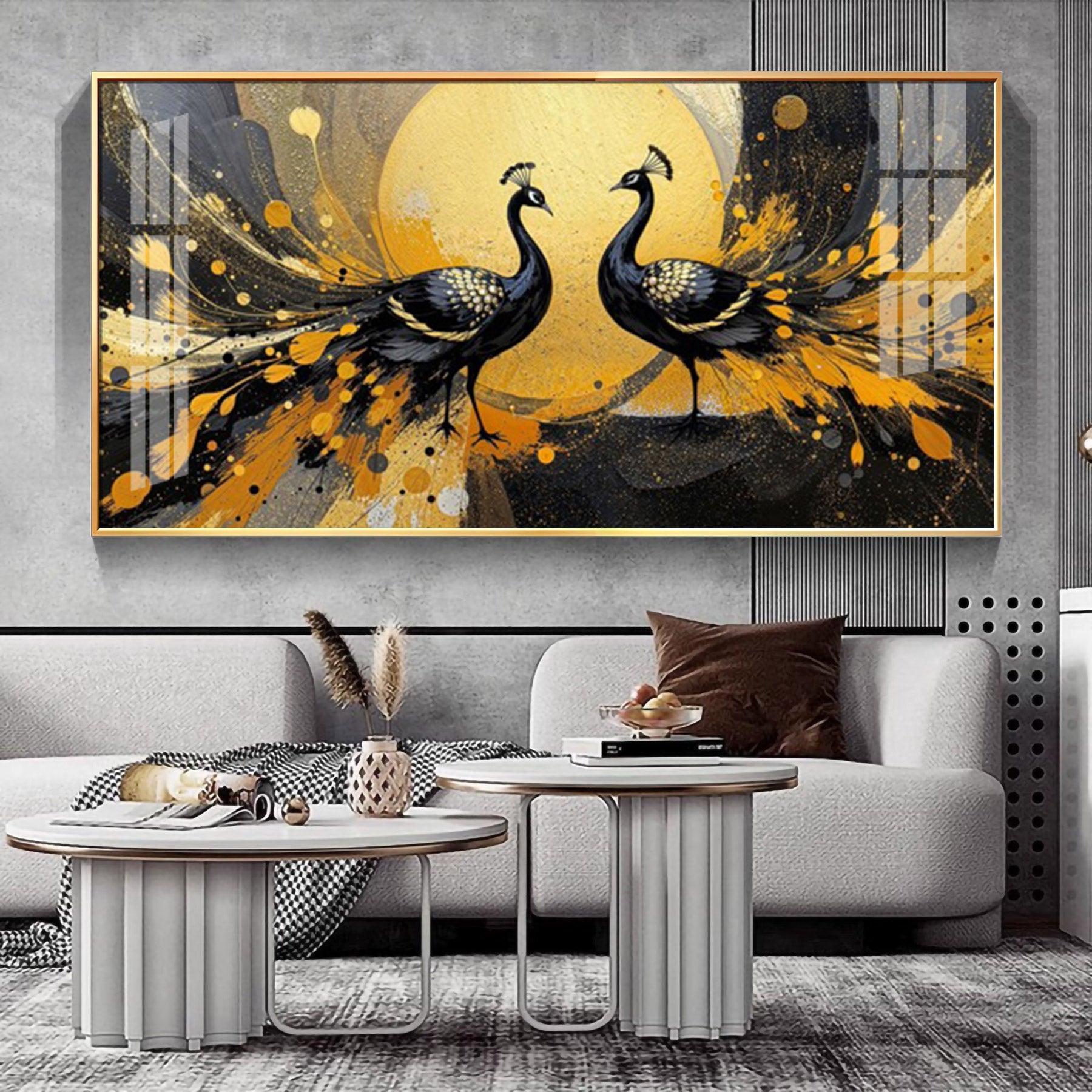 Abstract Two Peacock Looking Each Other Glass Finish Horizontal Wall Art