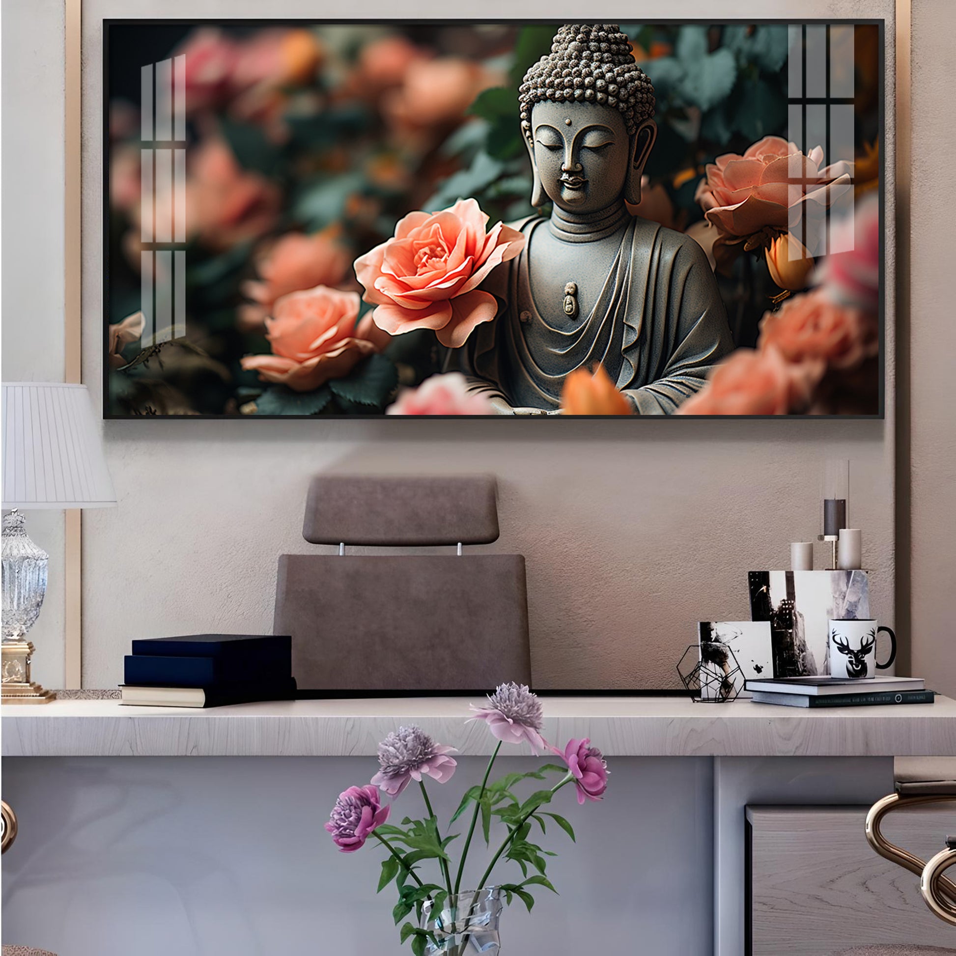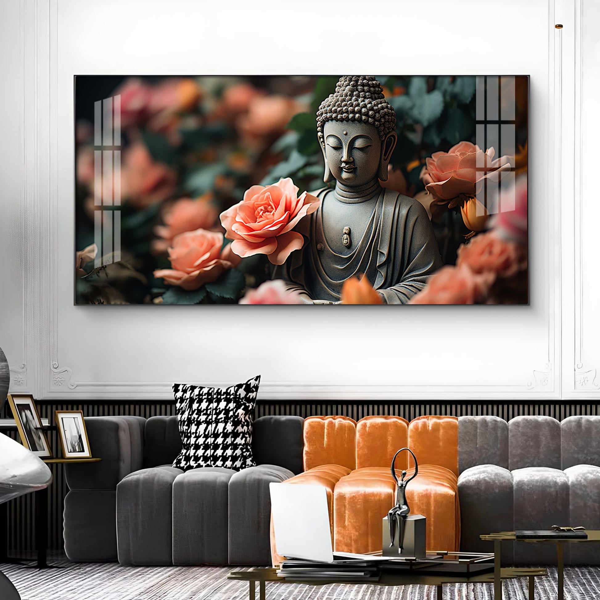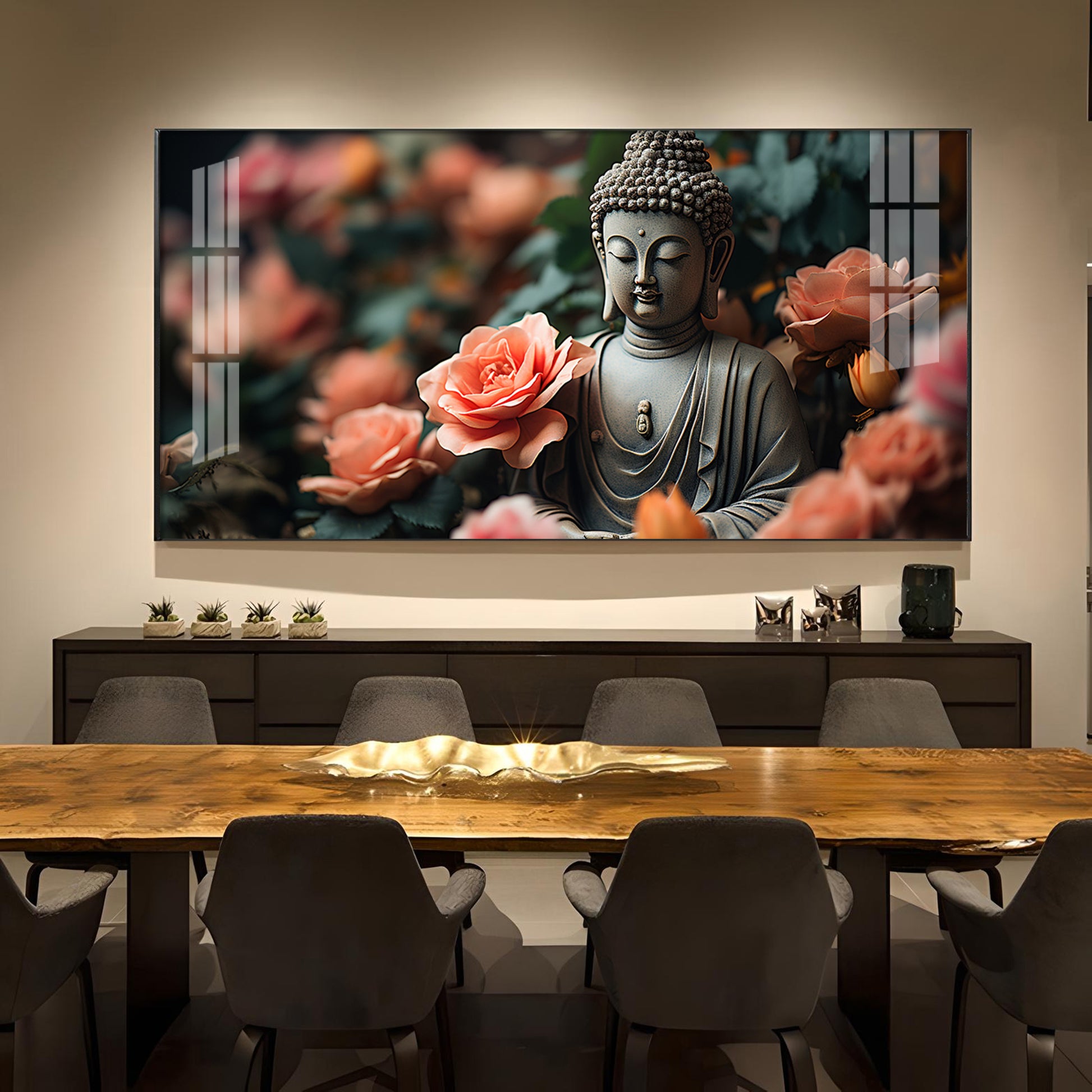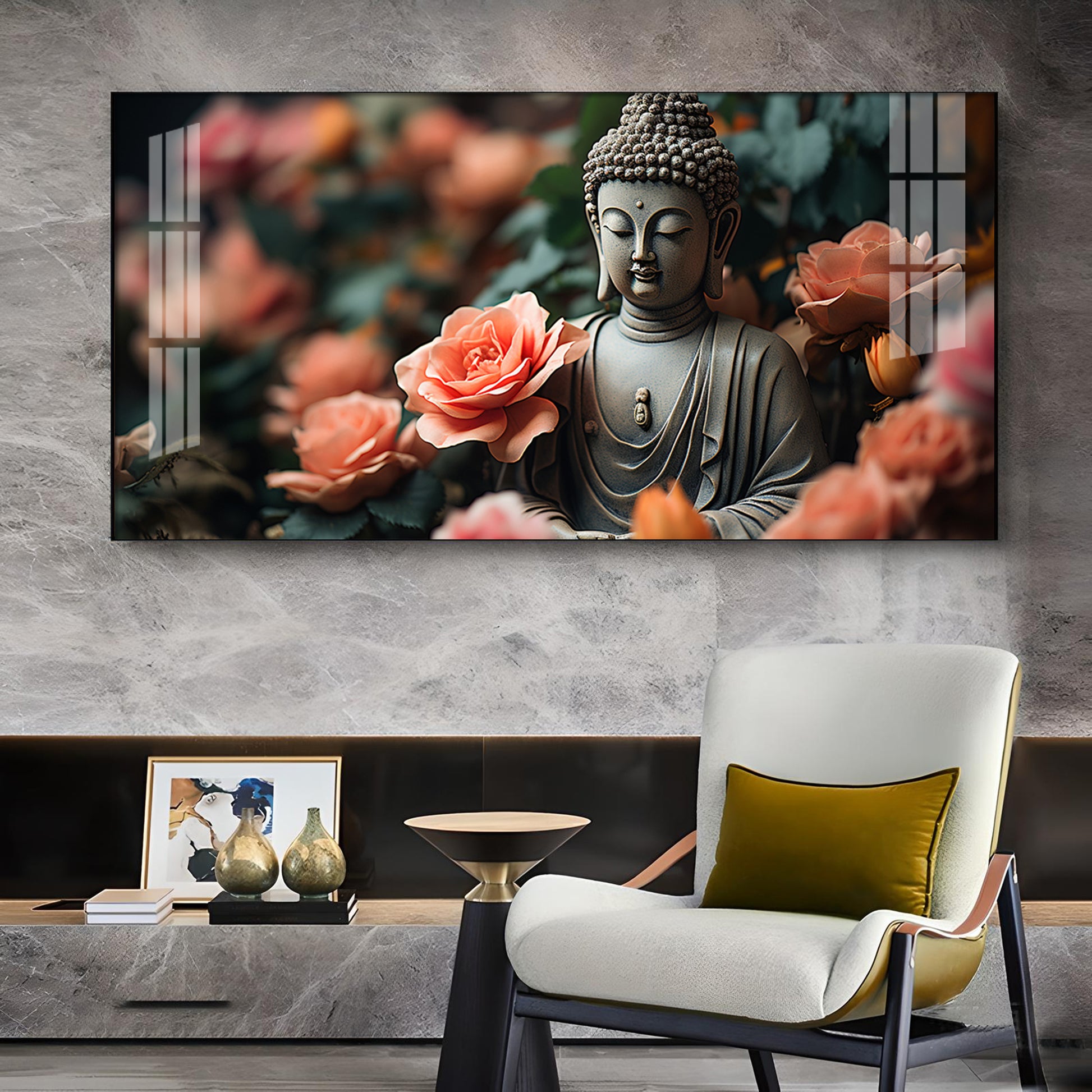 Calm Buddha With Flower Glass Finish Horizontal Wall Art