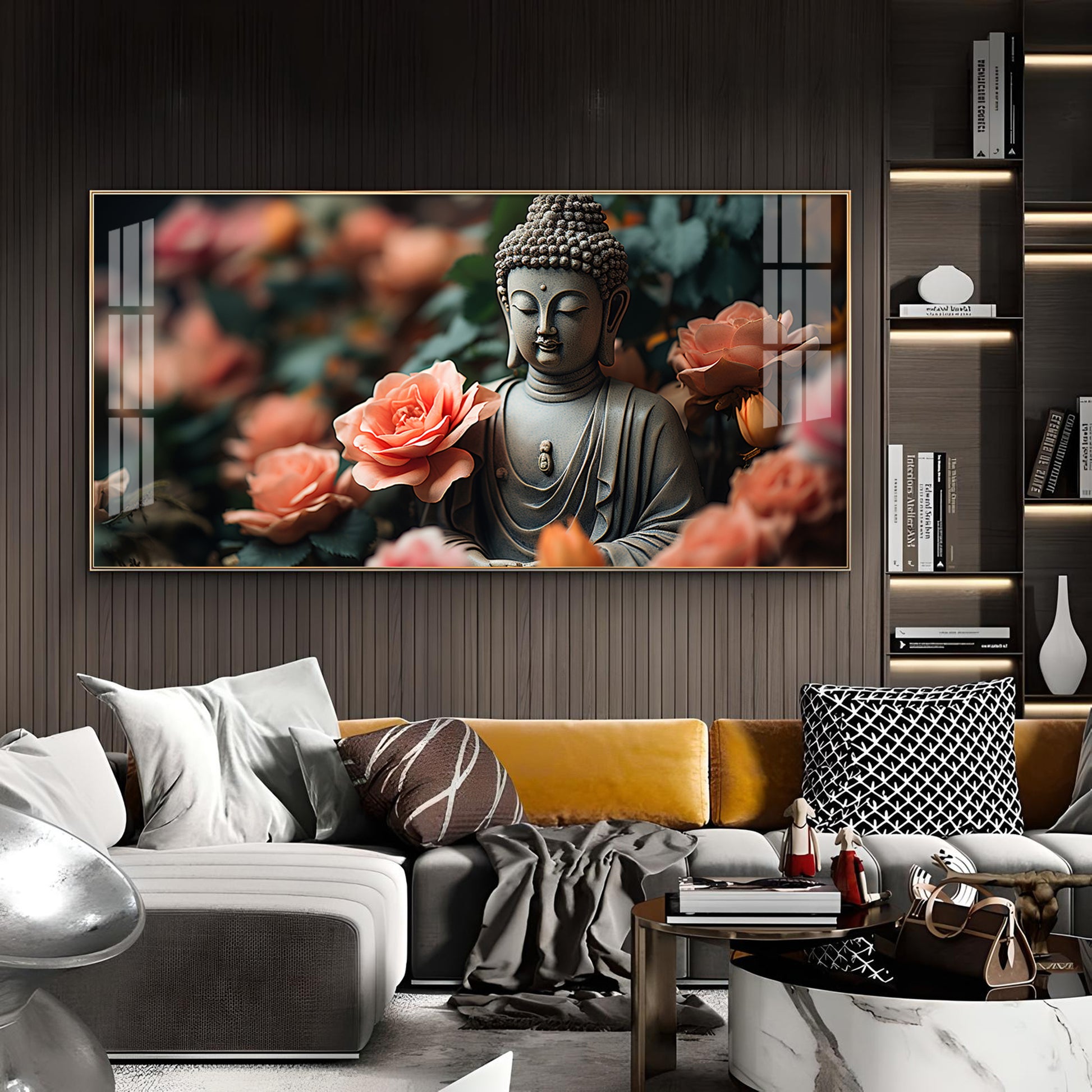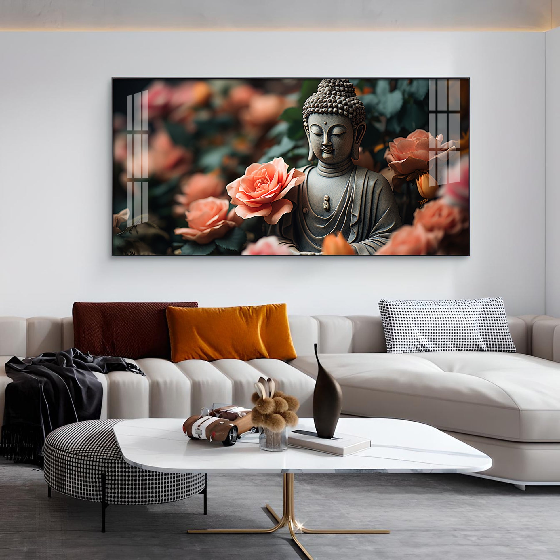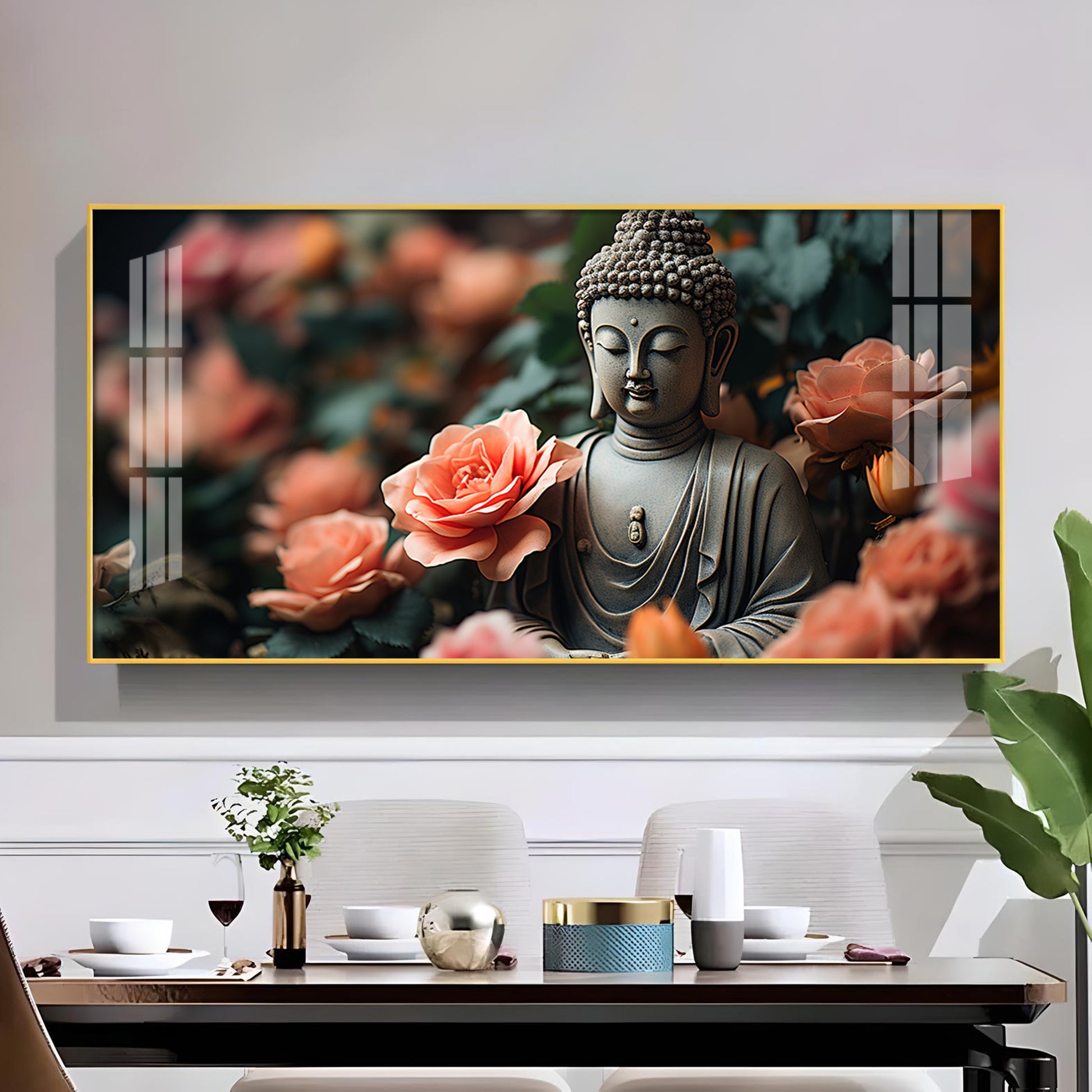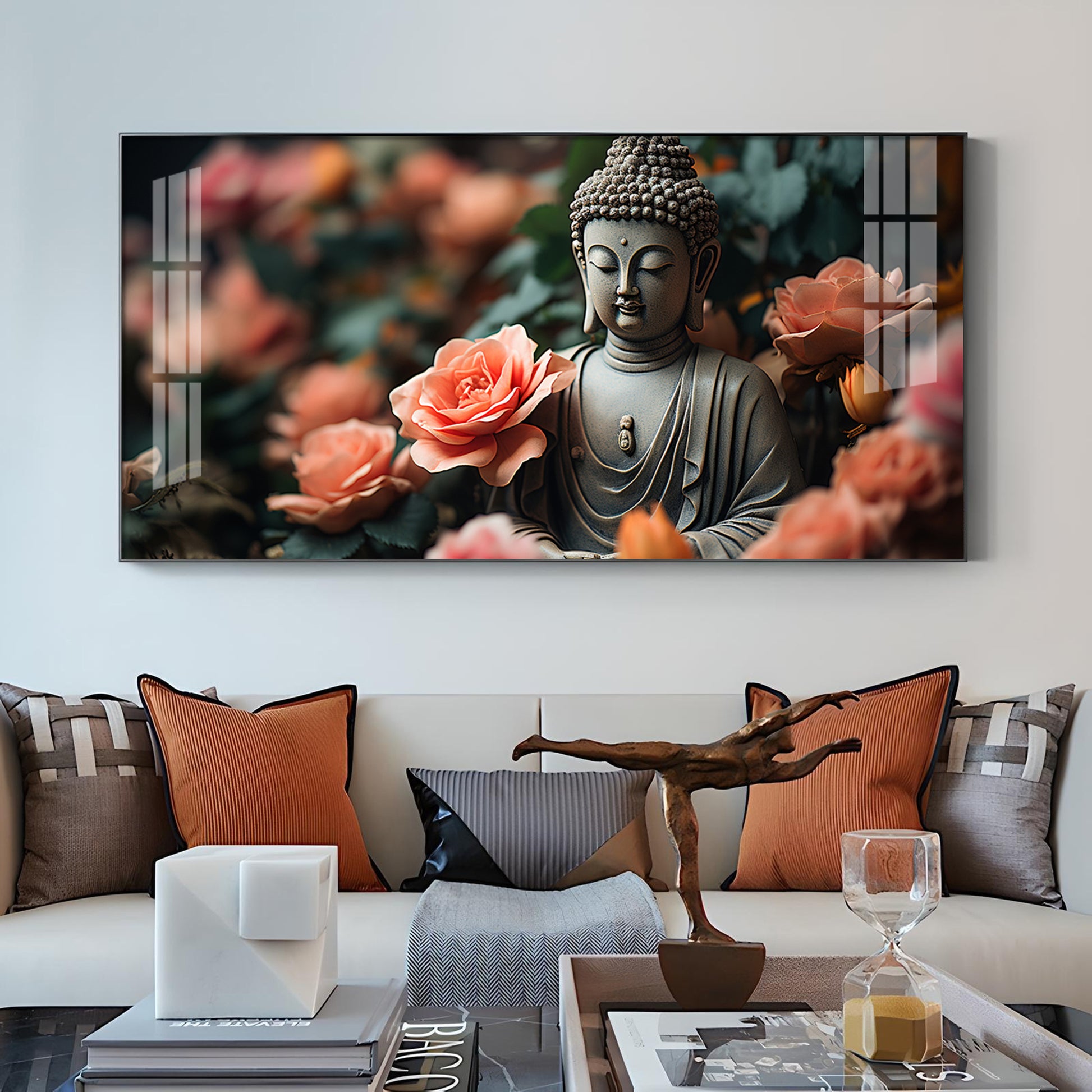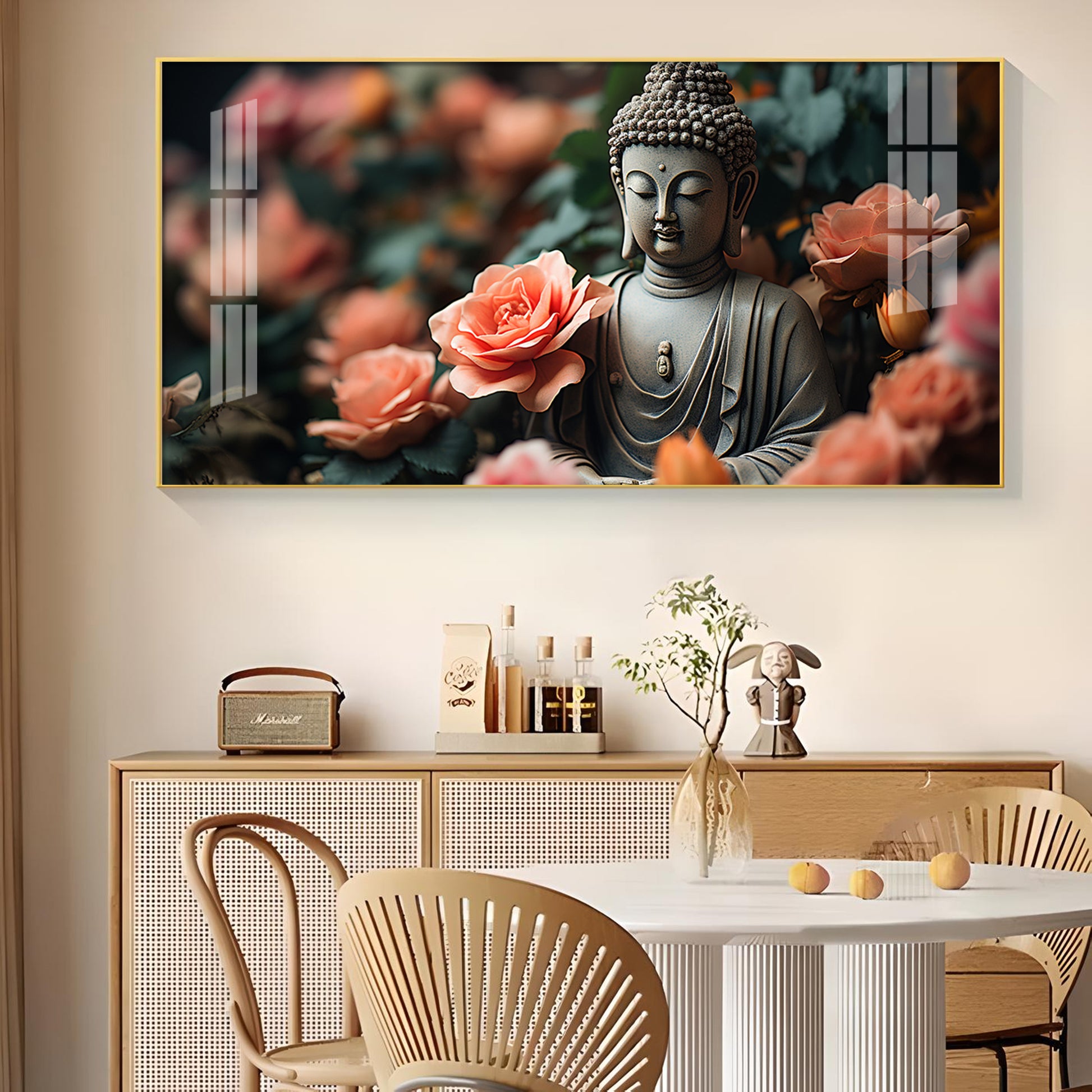 Calm Buddha With Flower Glass Finish Horizontal Wall Art