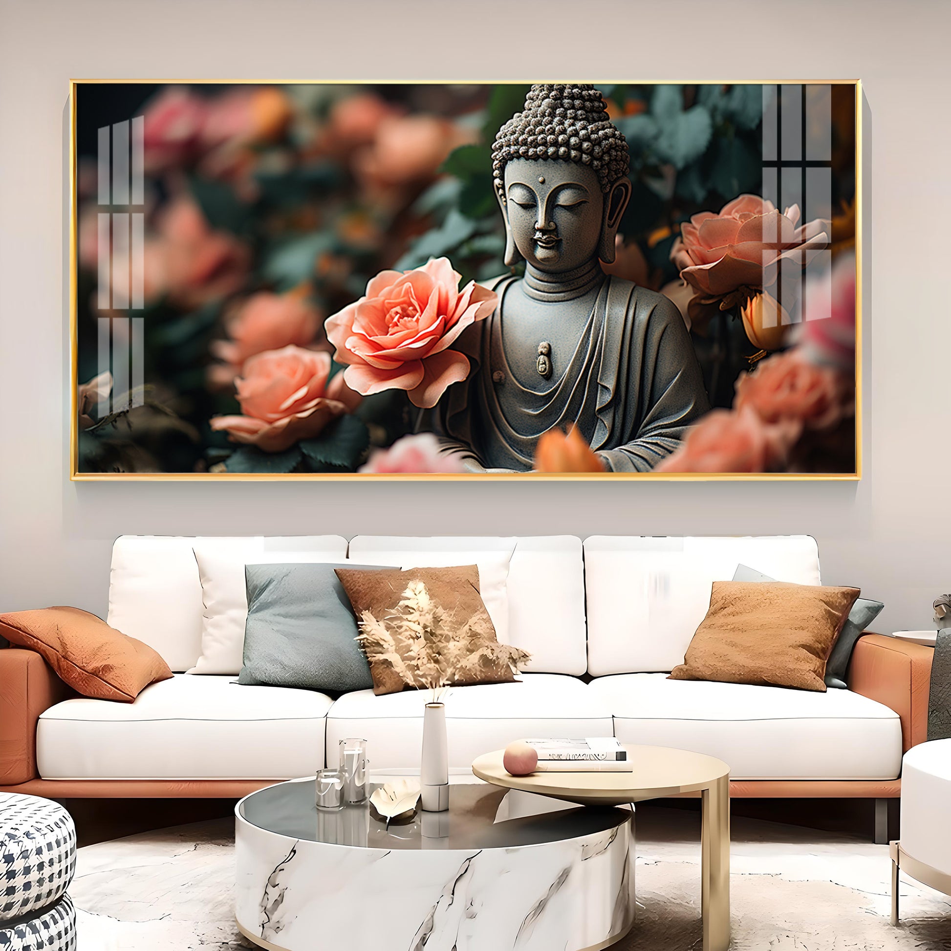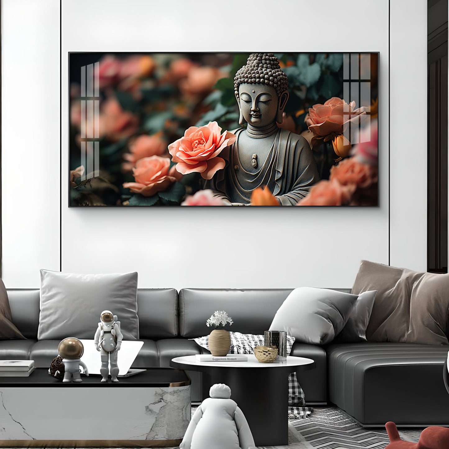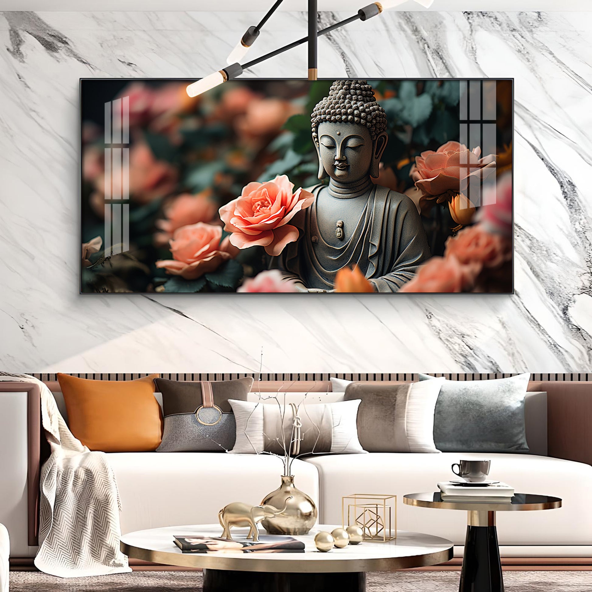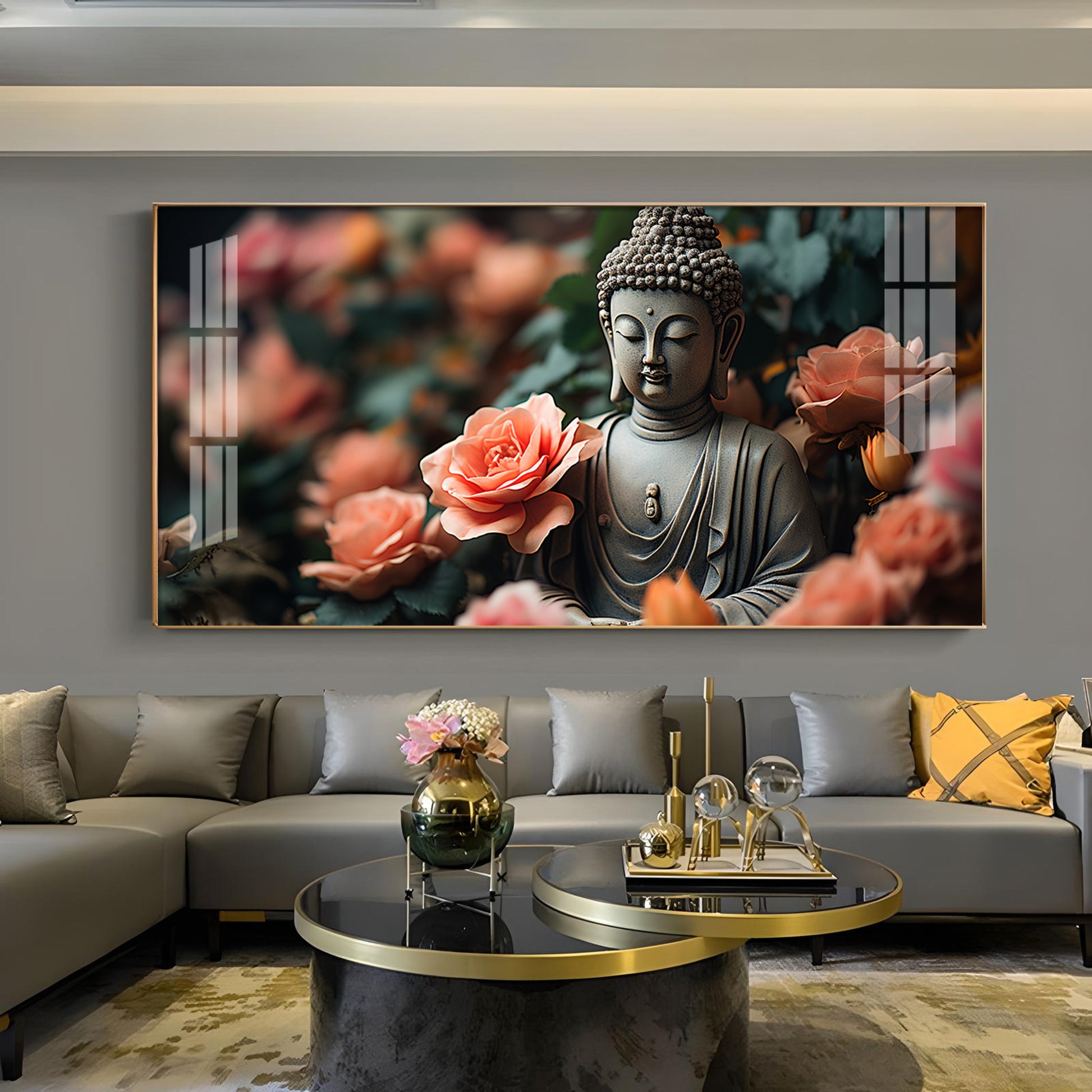 Calm Buddha With Flower Glass Finish Horizontal Wall Art