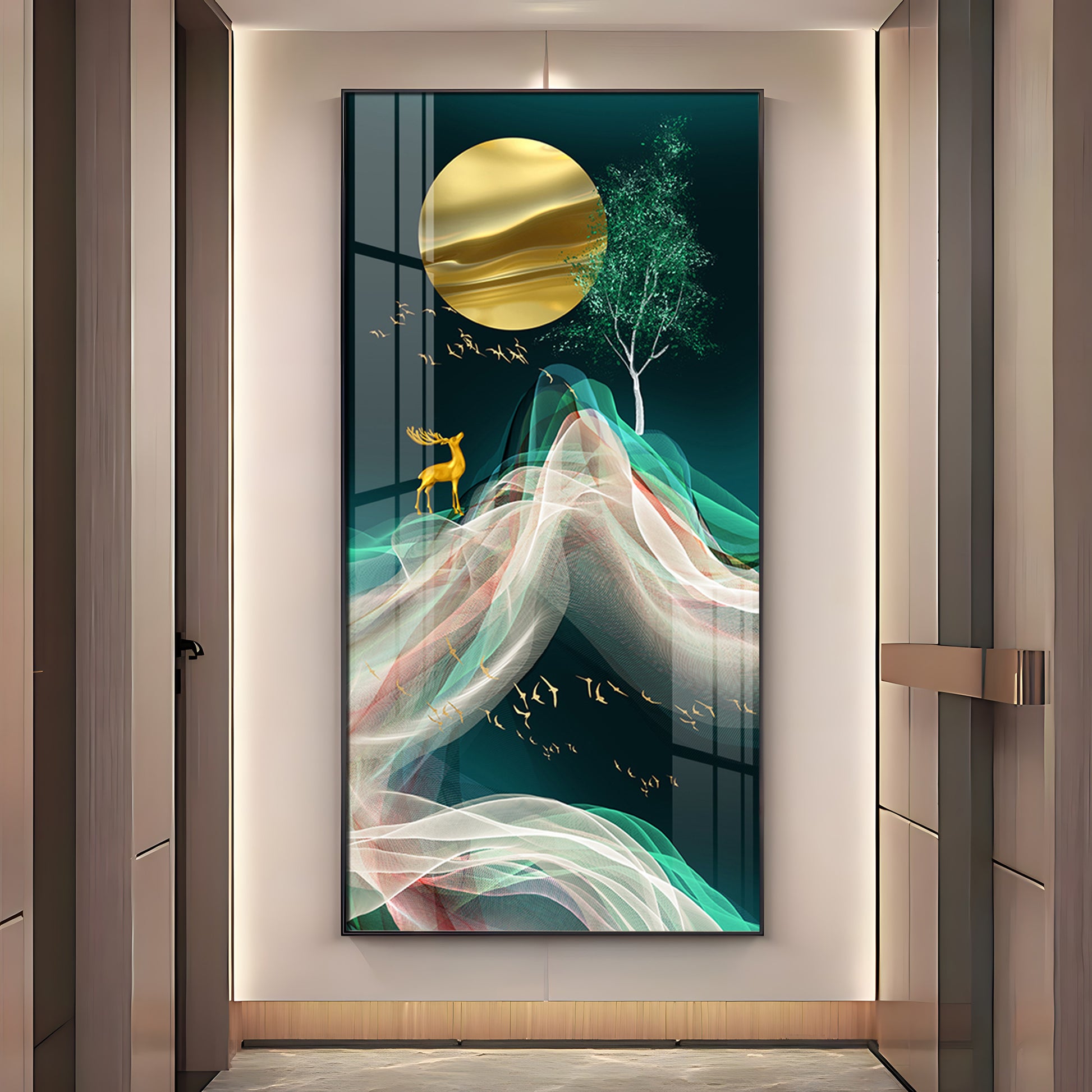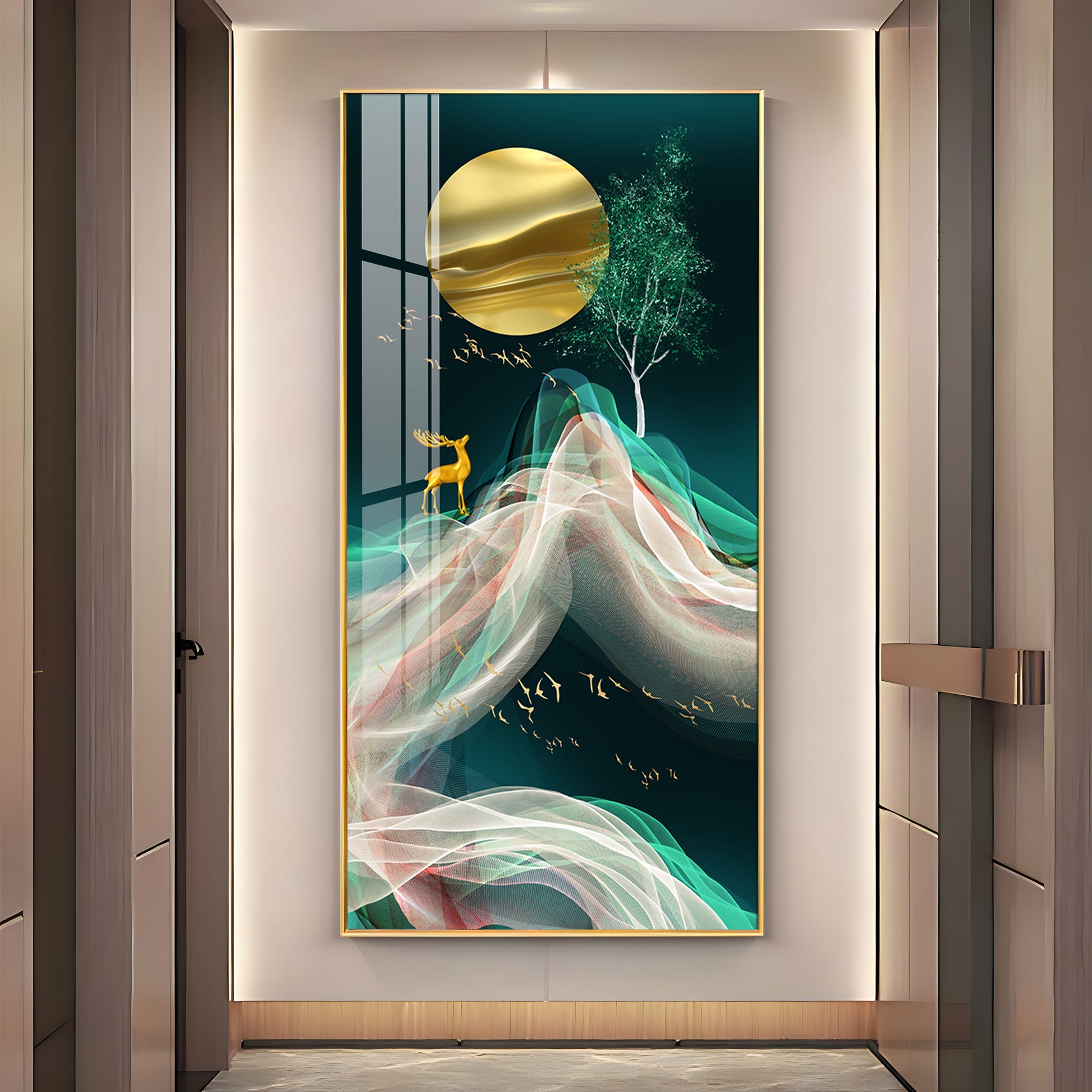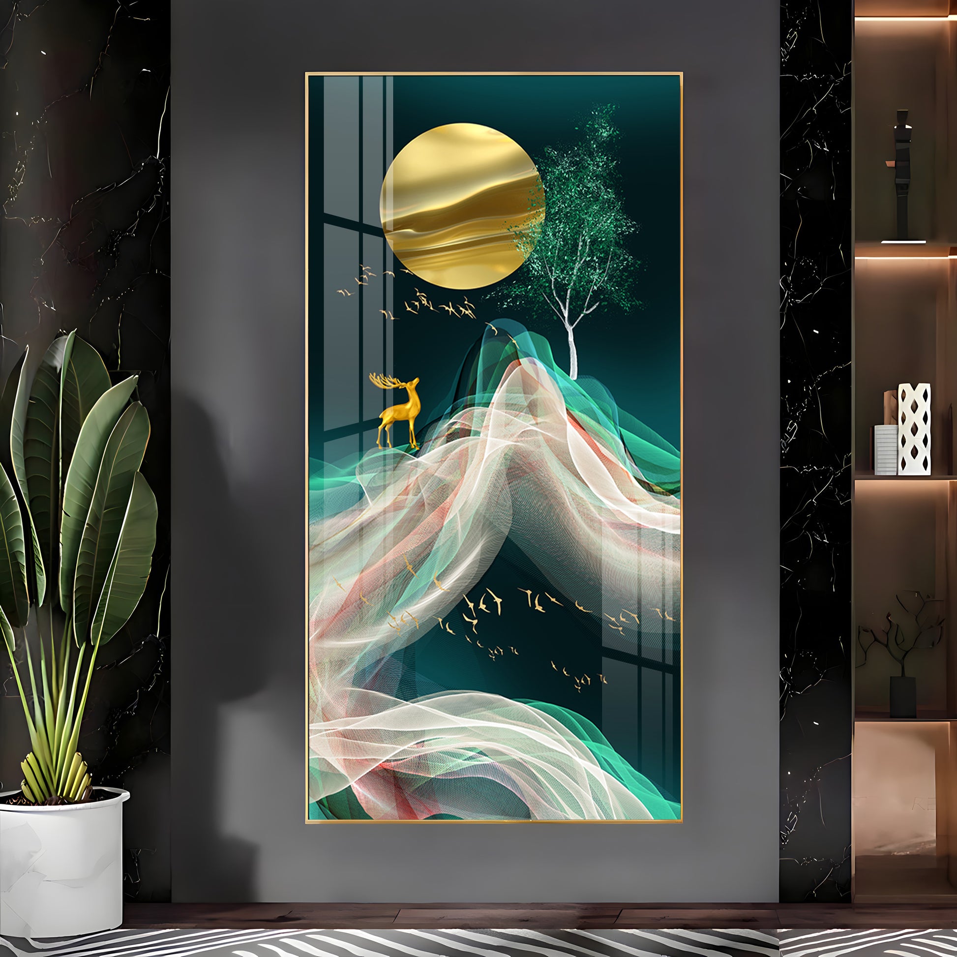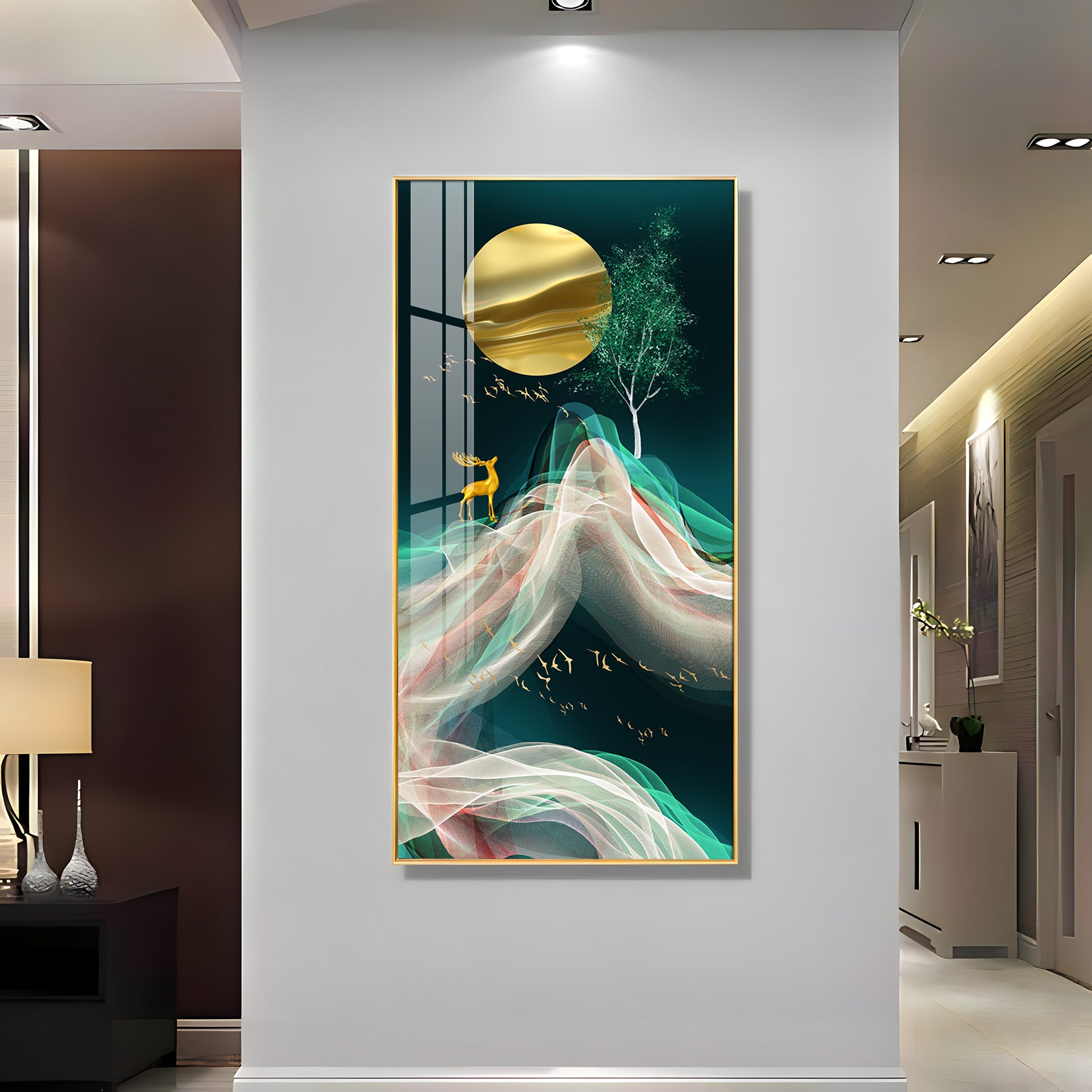 Deer with Golden Moon Glass Finish Vertical Wall Art