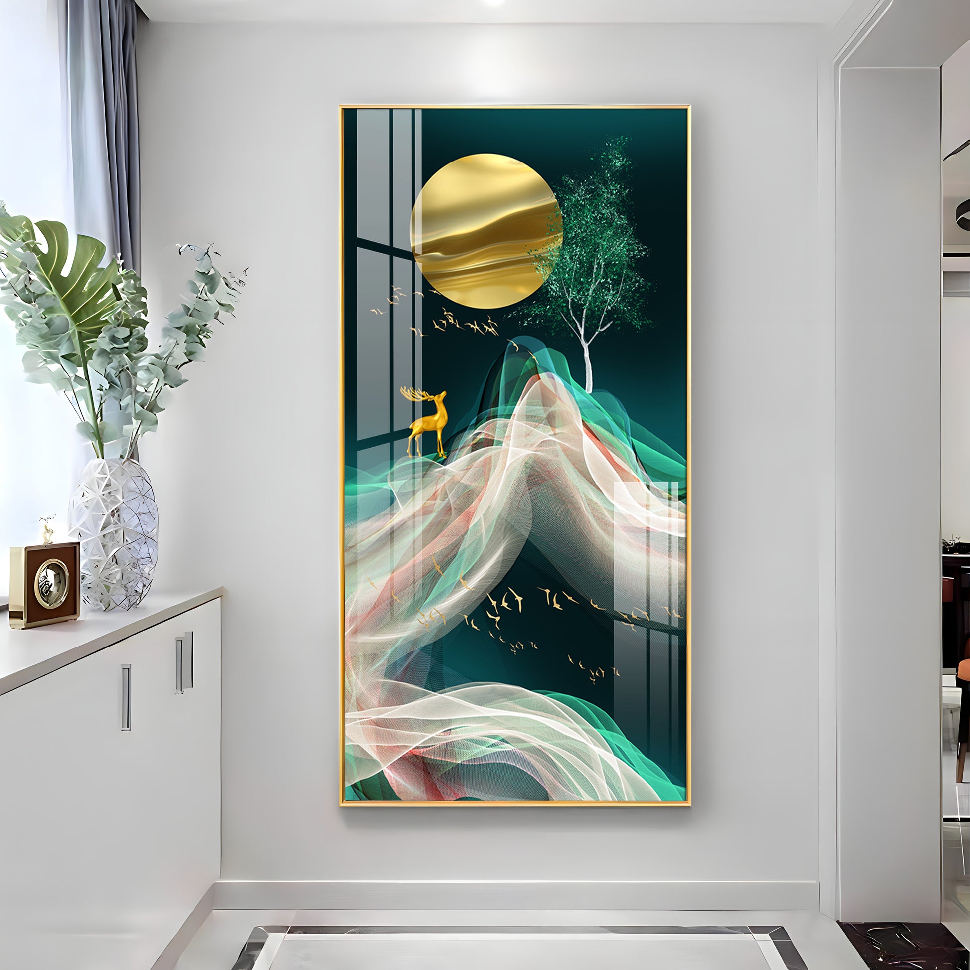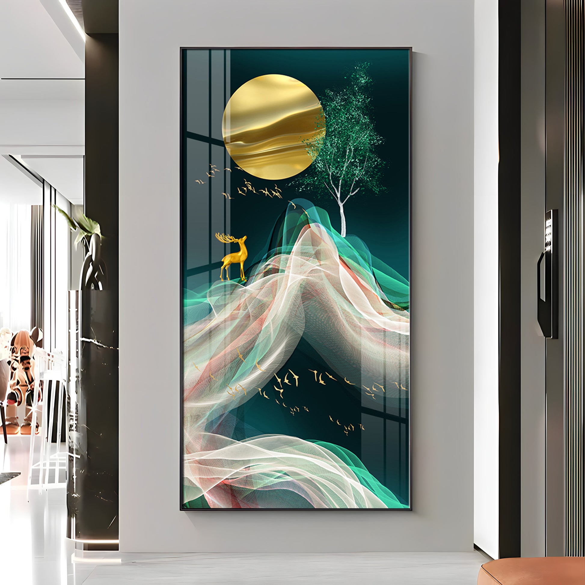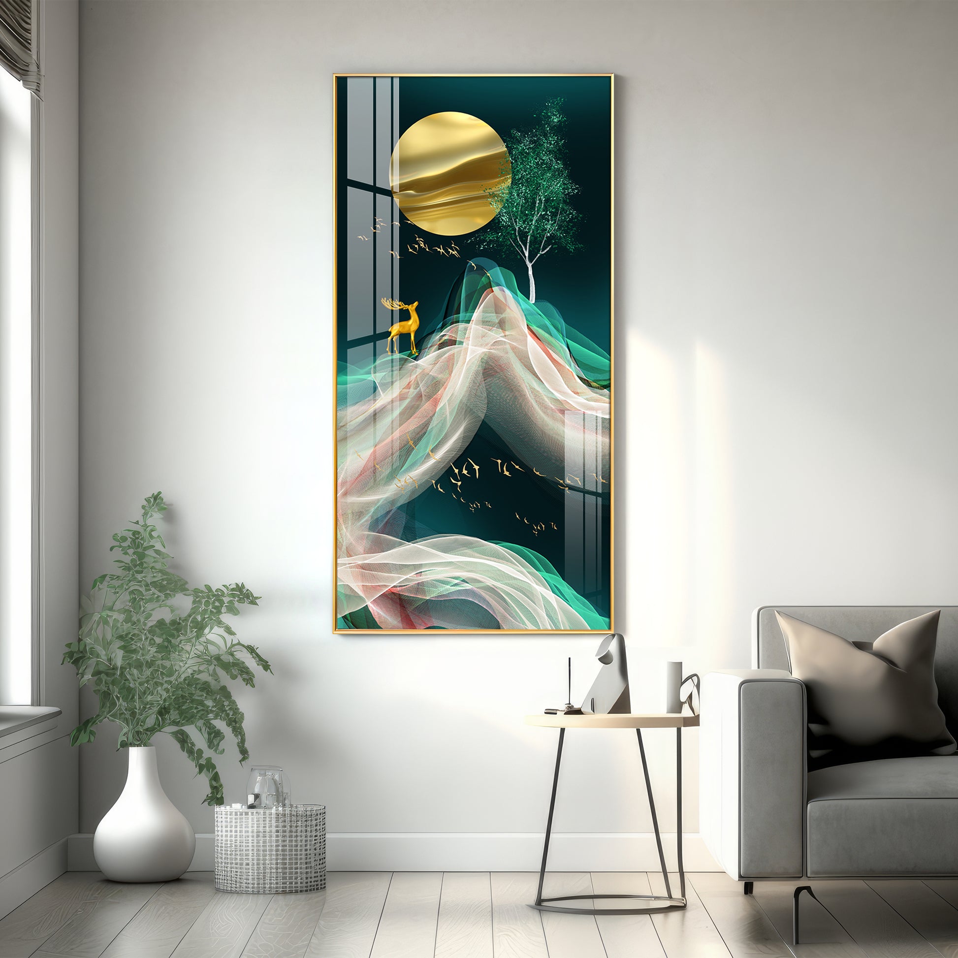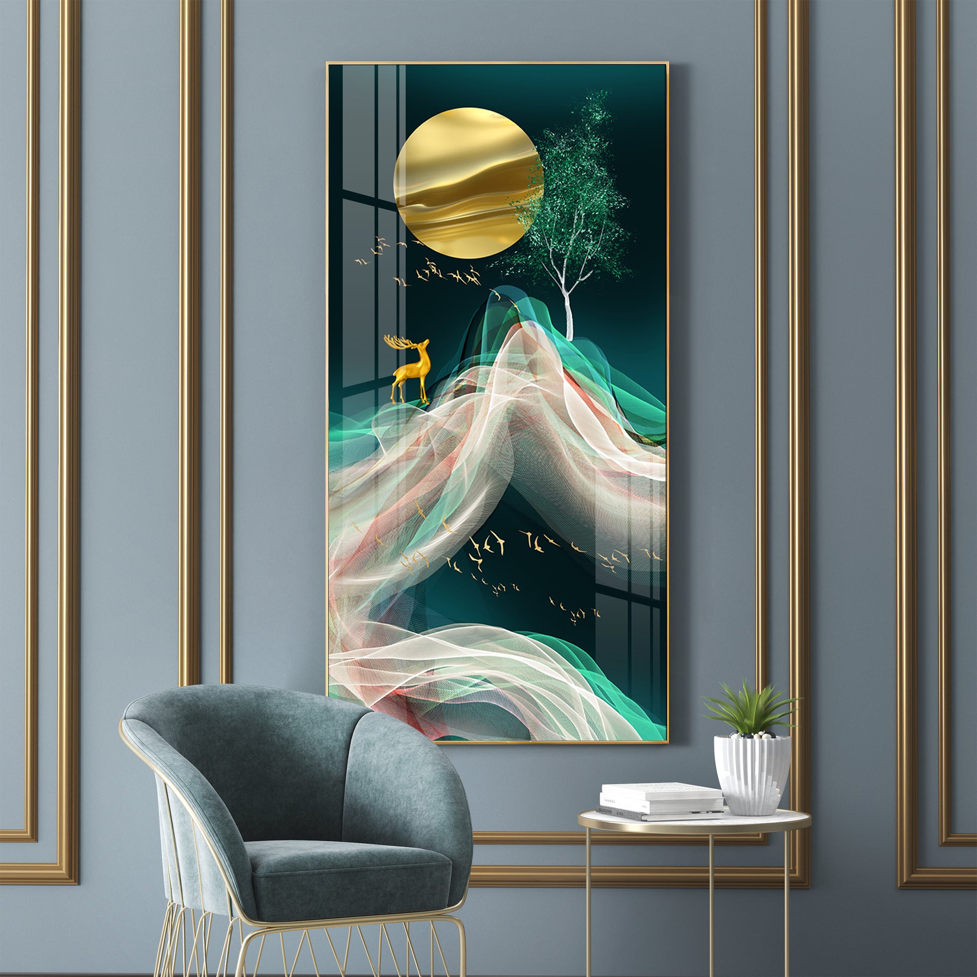 Deer with Golden Moon Glass Finish Vertical Wall Art