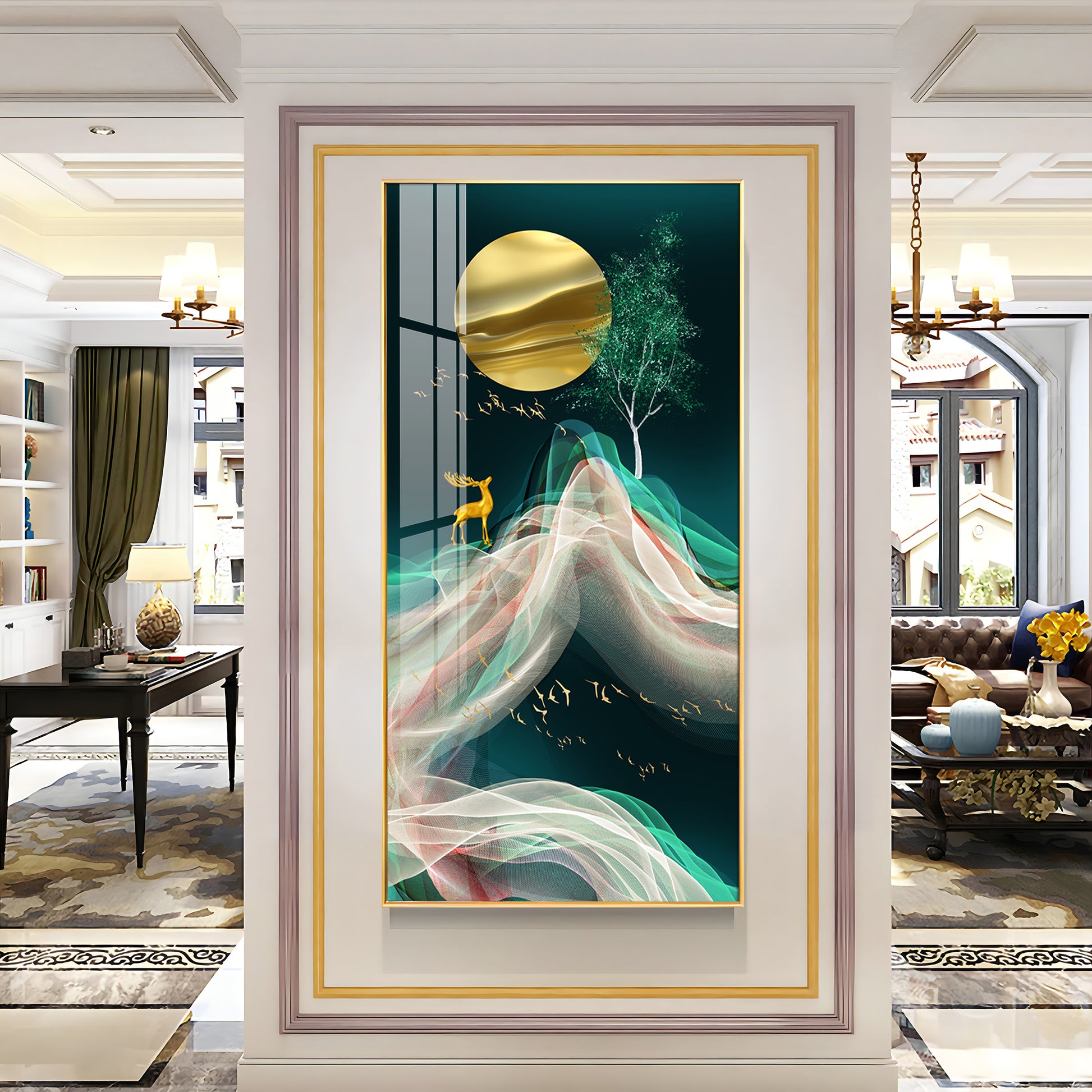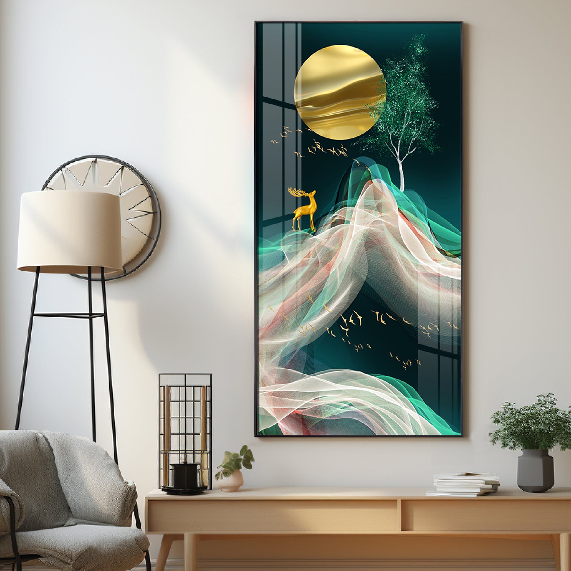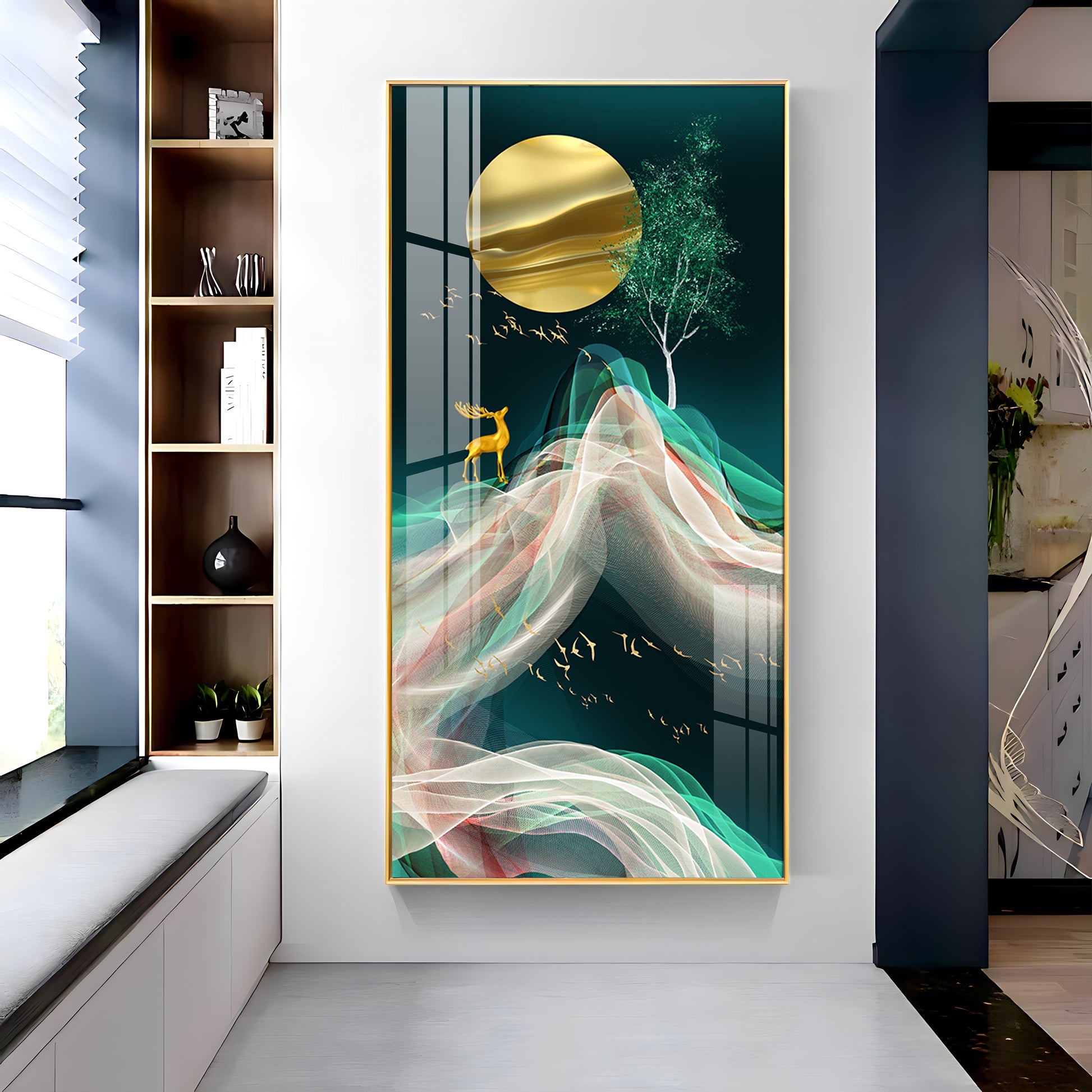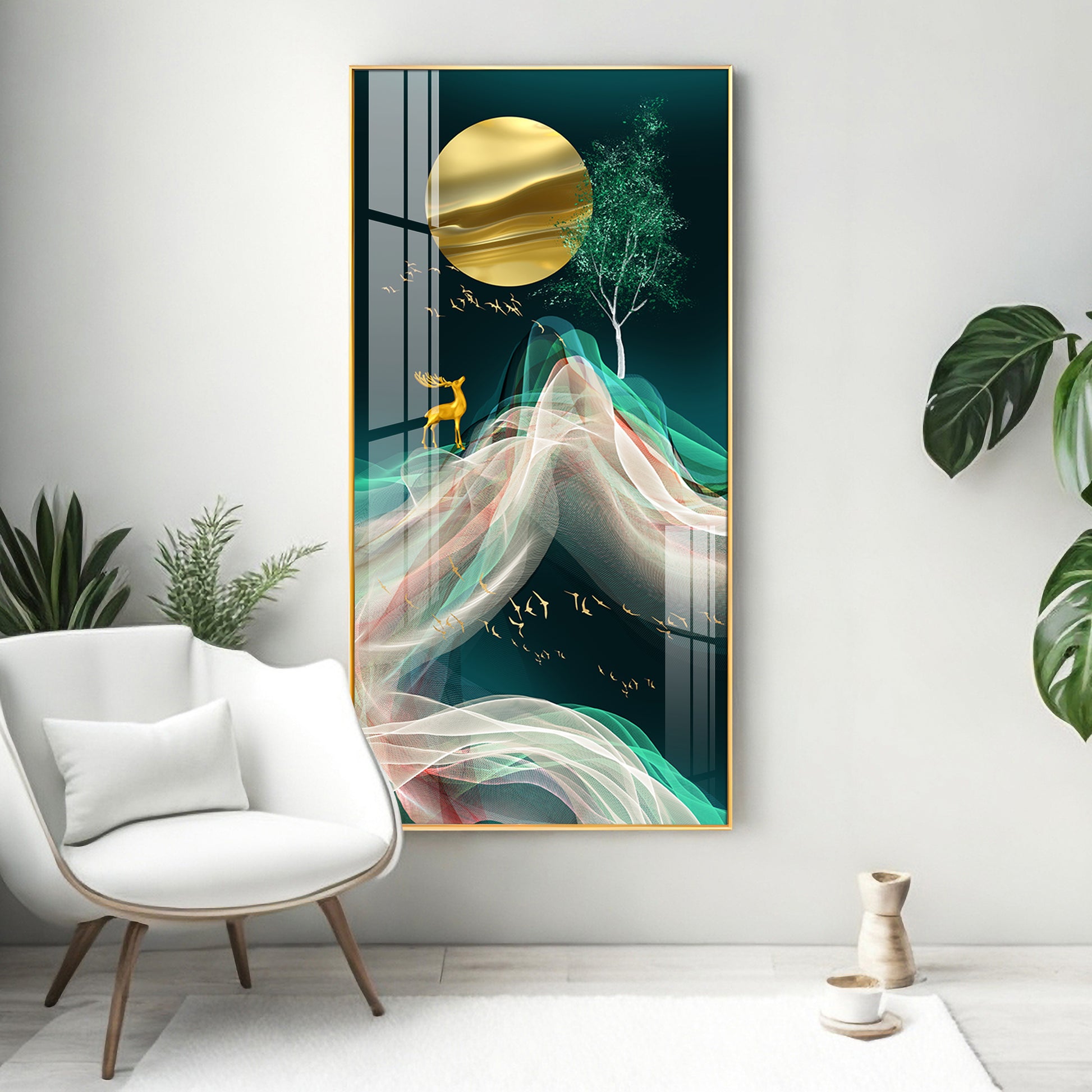 Deer with Golden Moon Glass Finish Vertical Wall Art