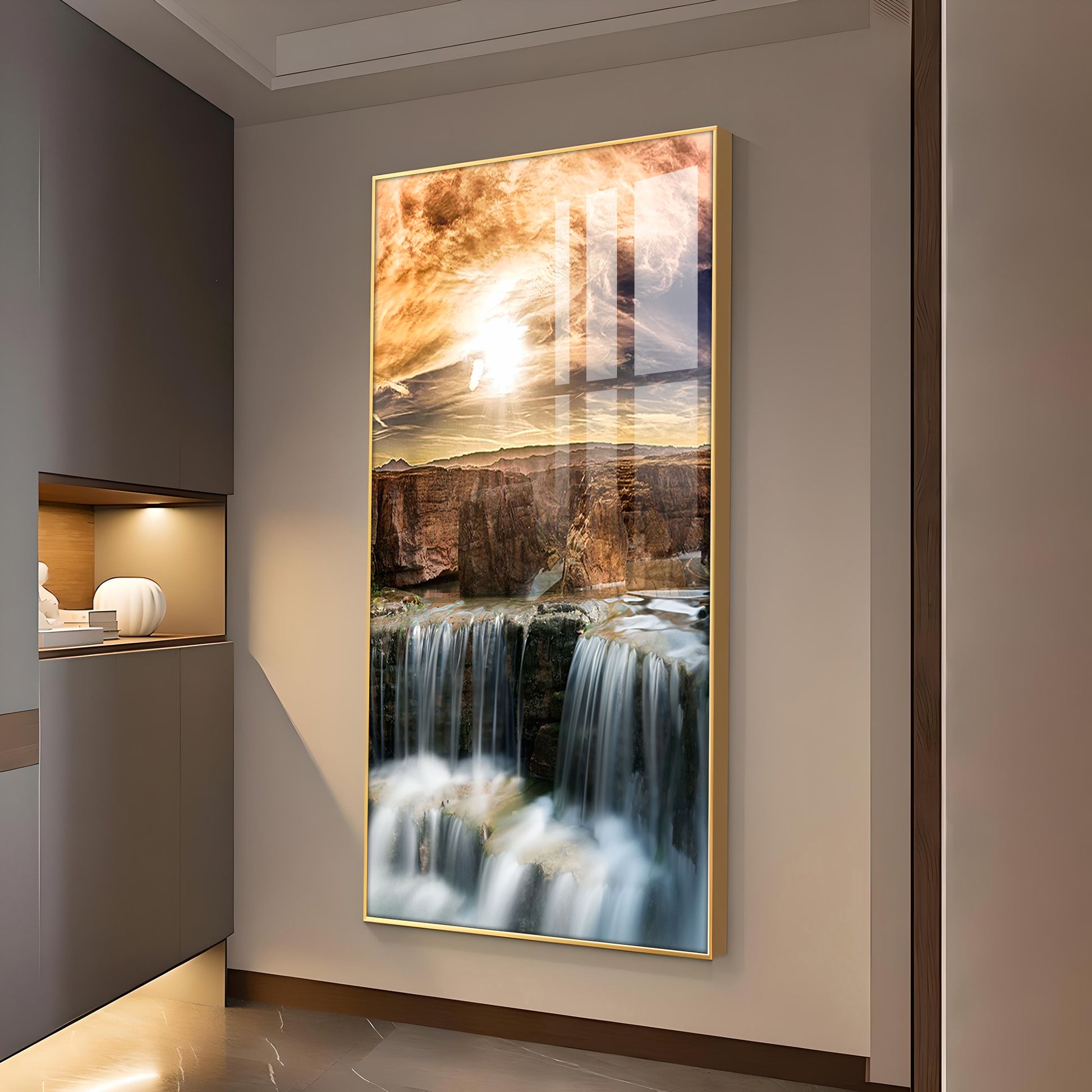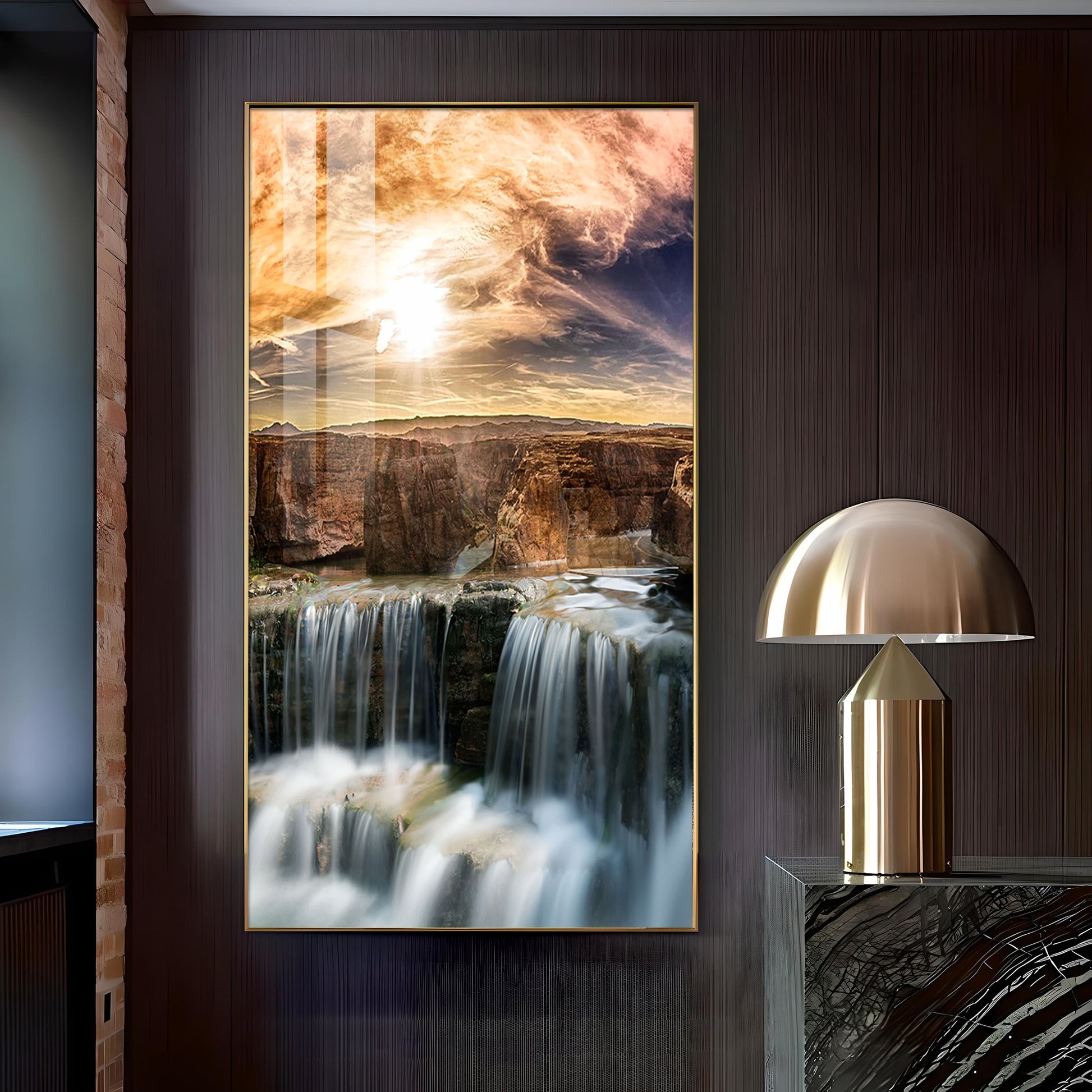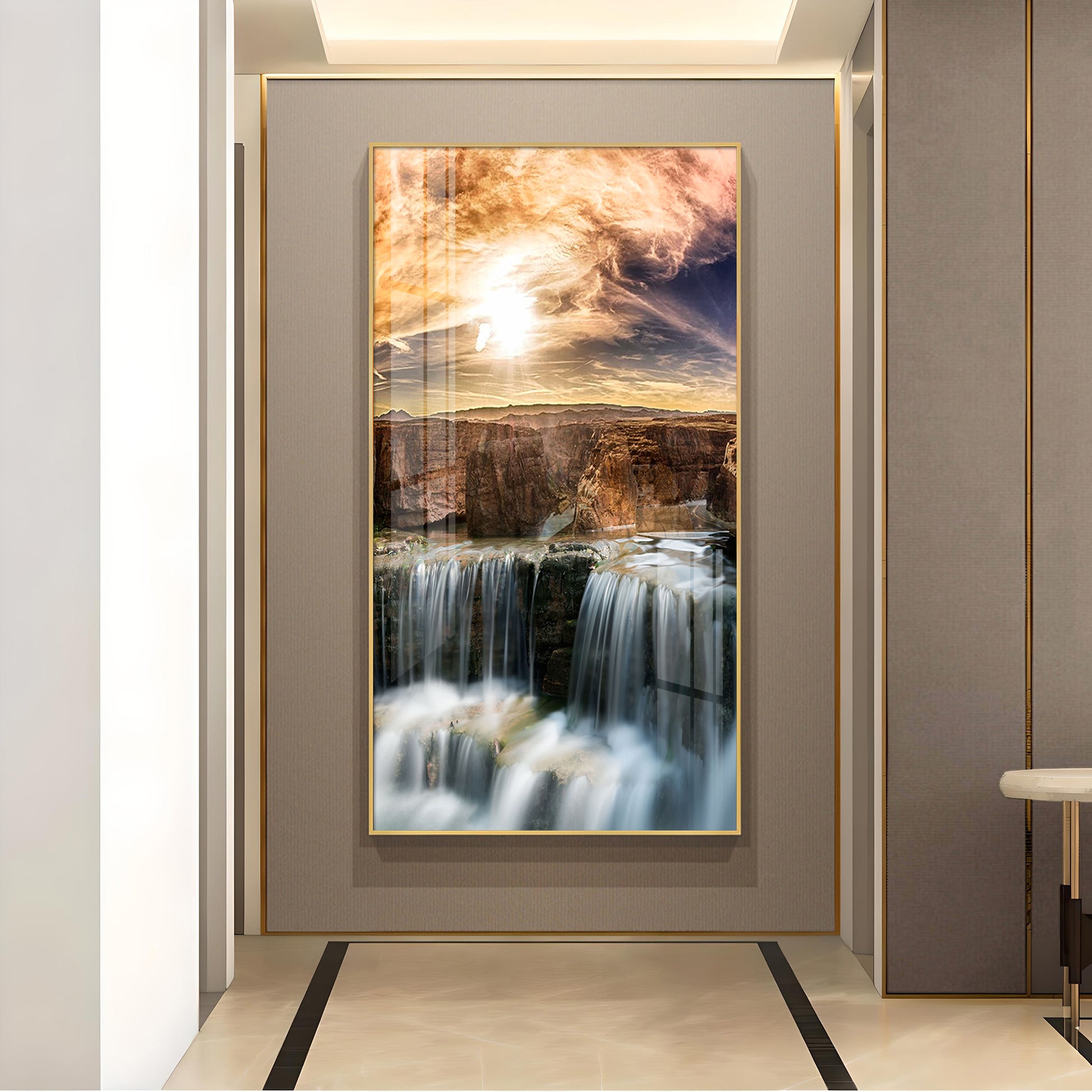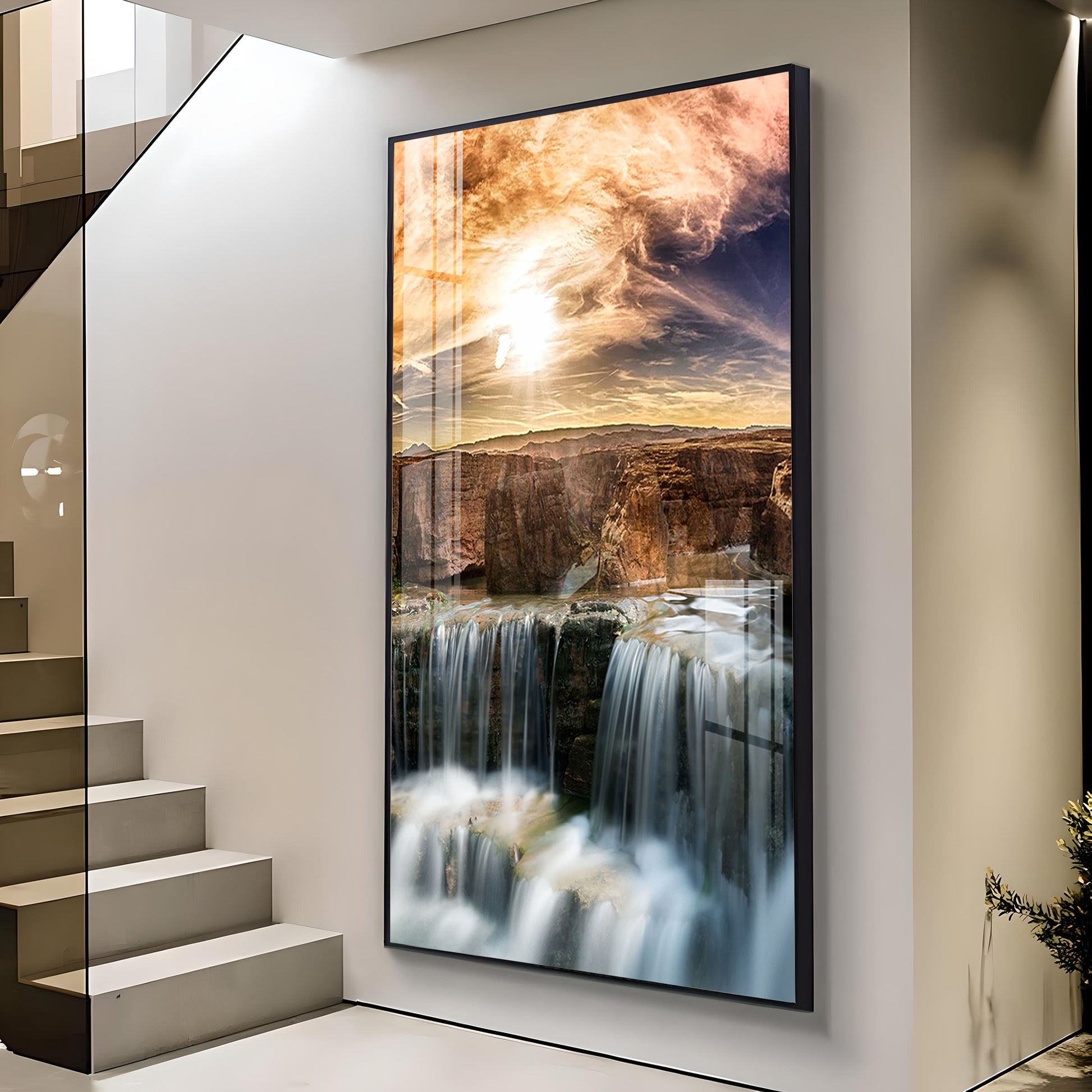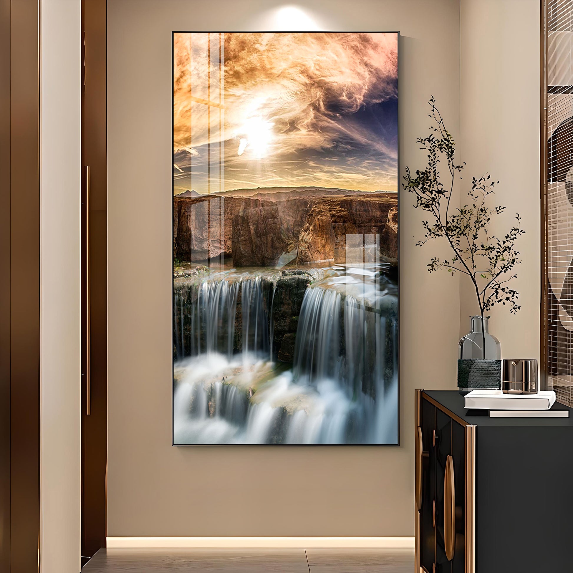 Dusk Over the Falls Glass Finish Vertical Wall Art