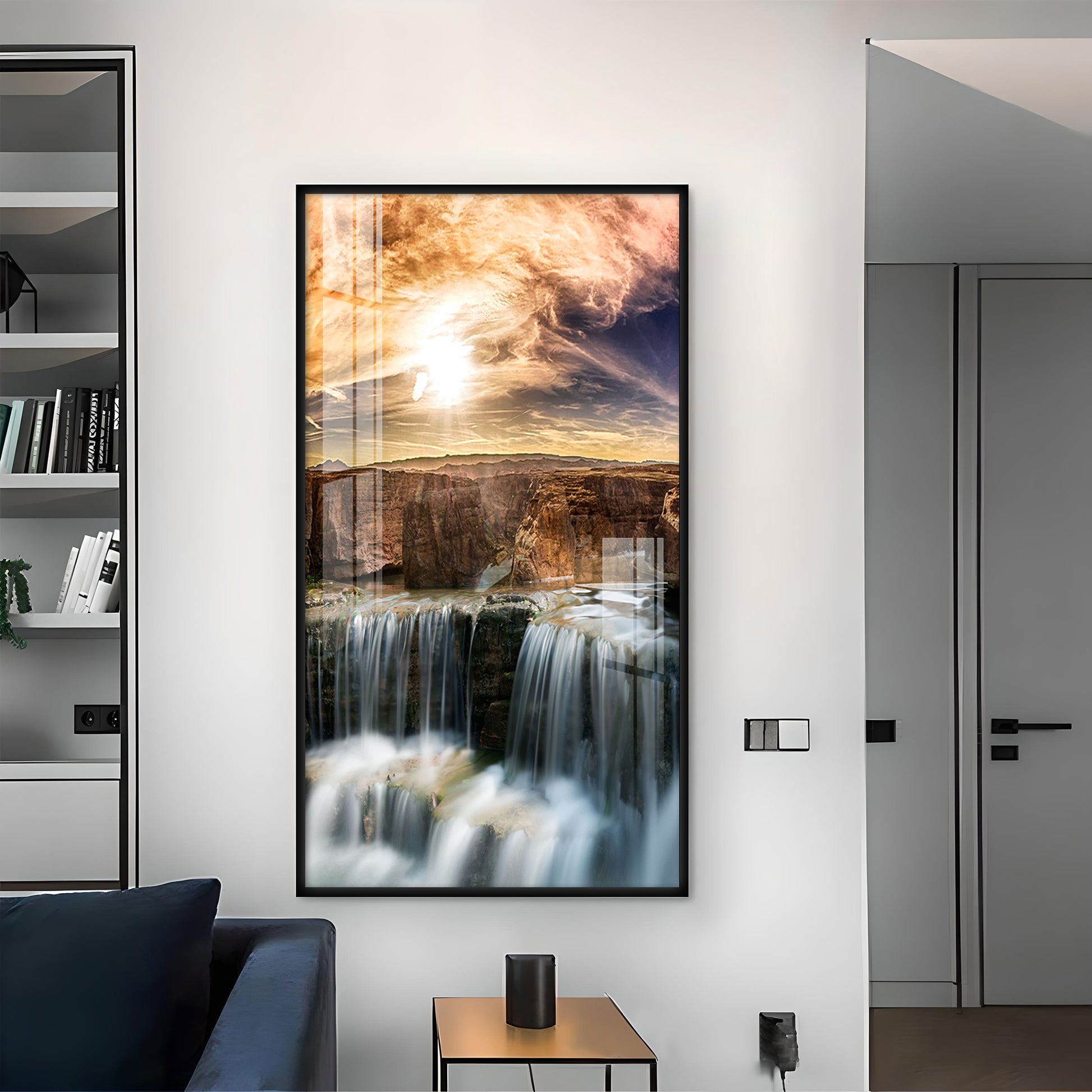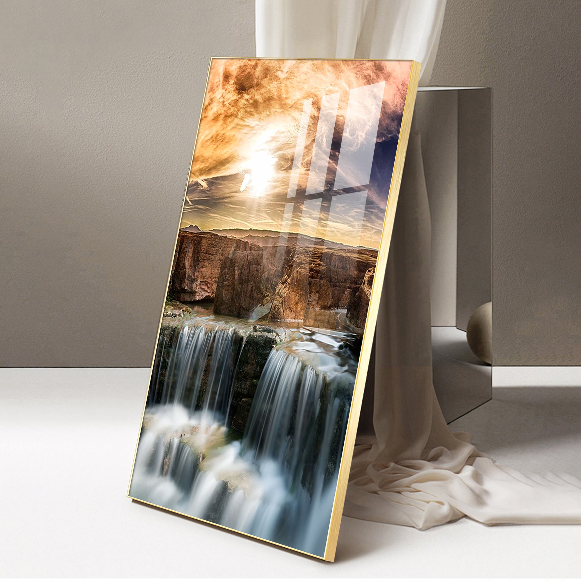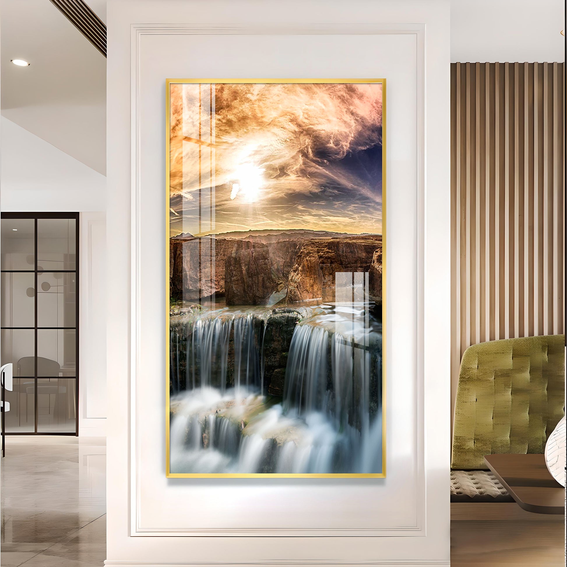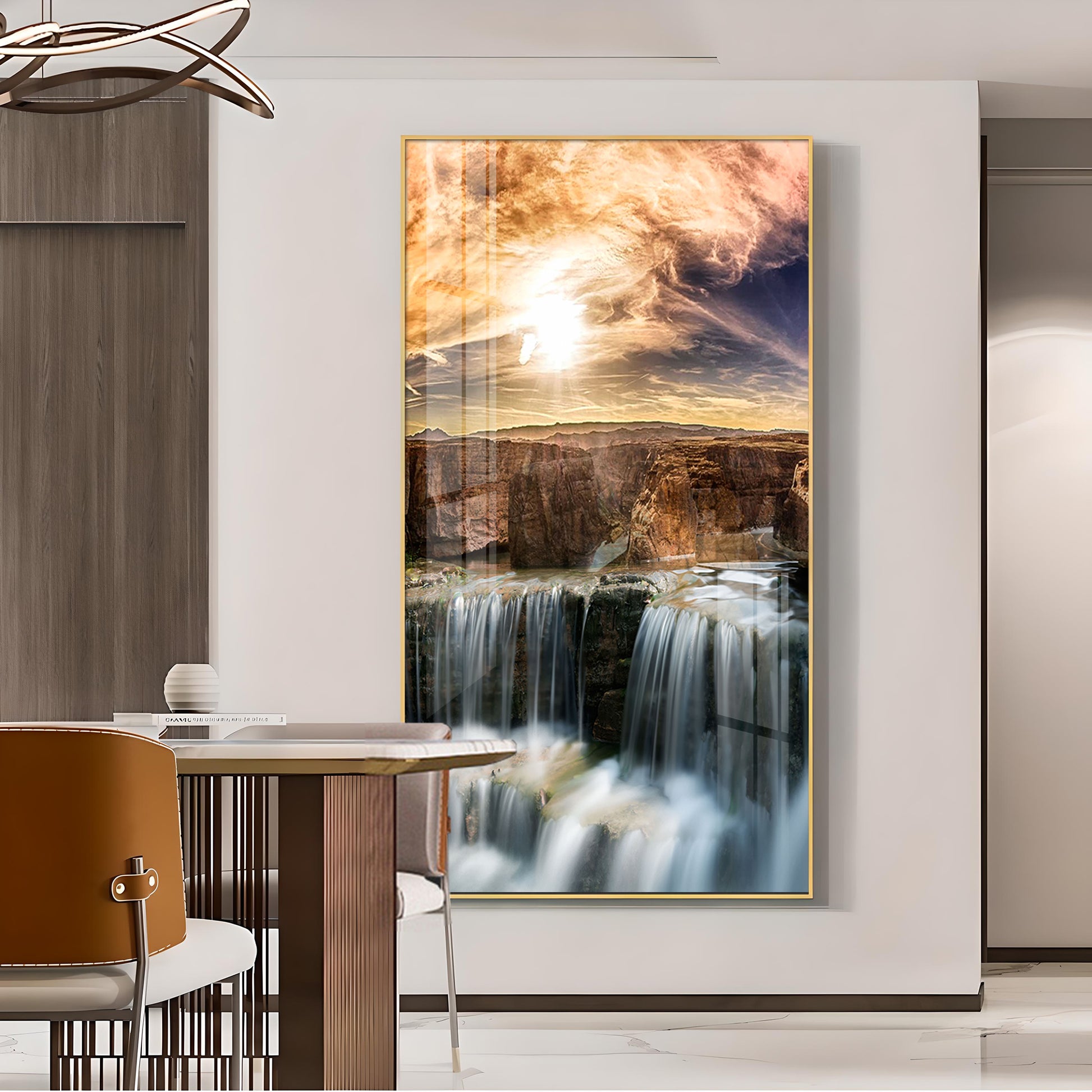 Dusk Over the Falls Glass Finish Vertical Wall Art