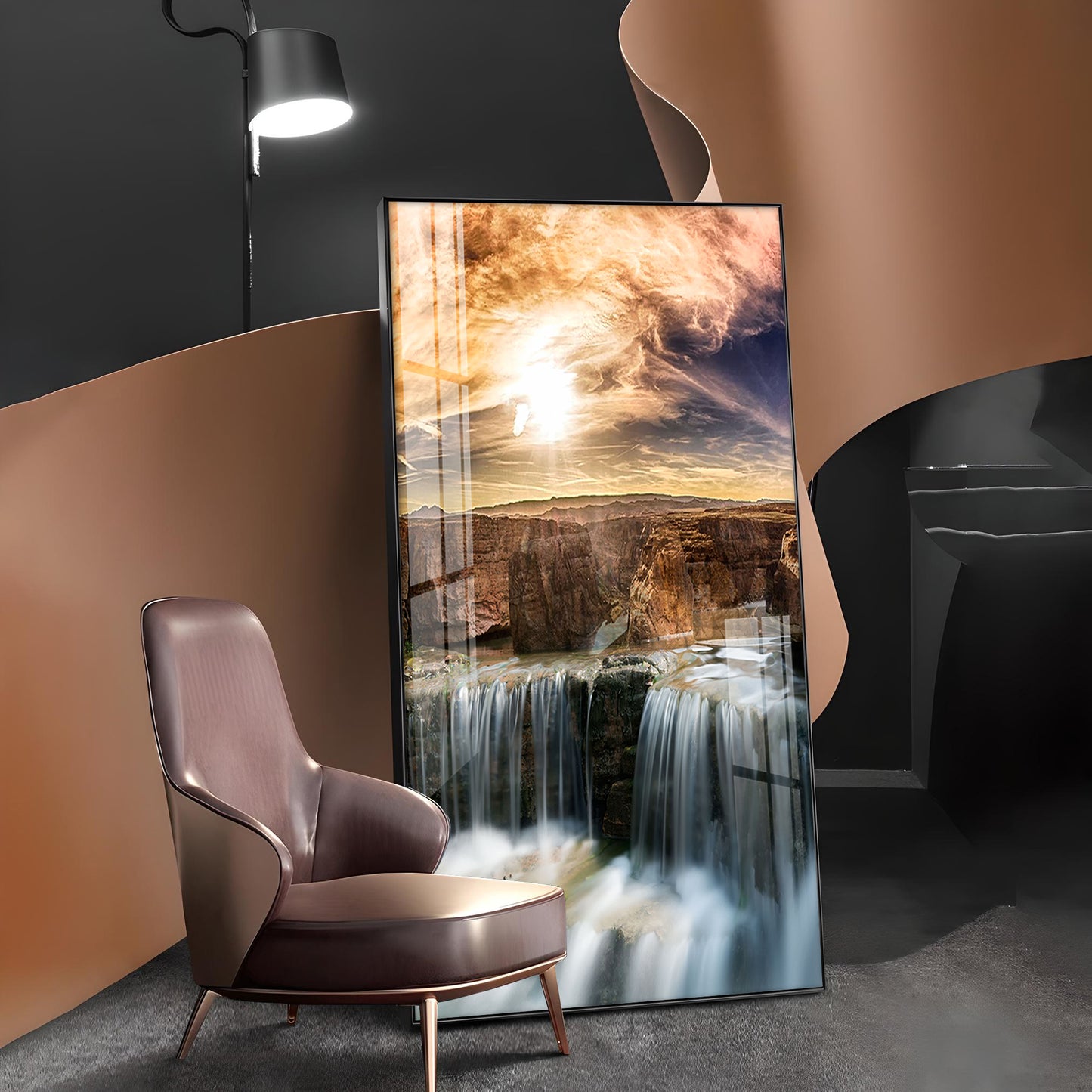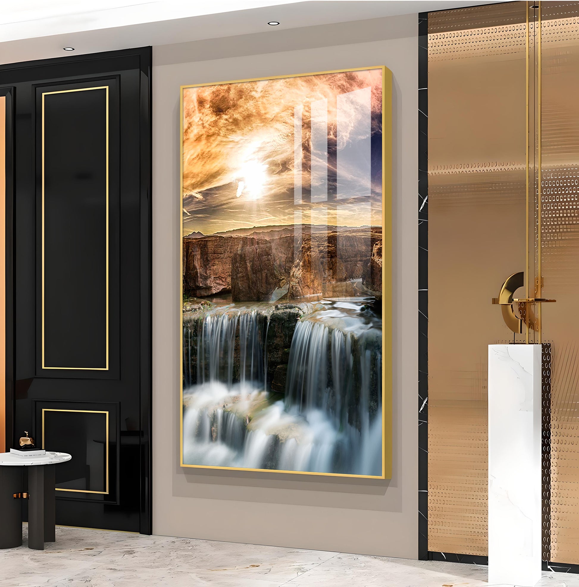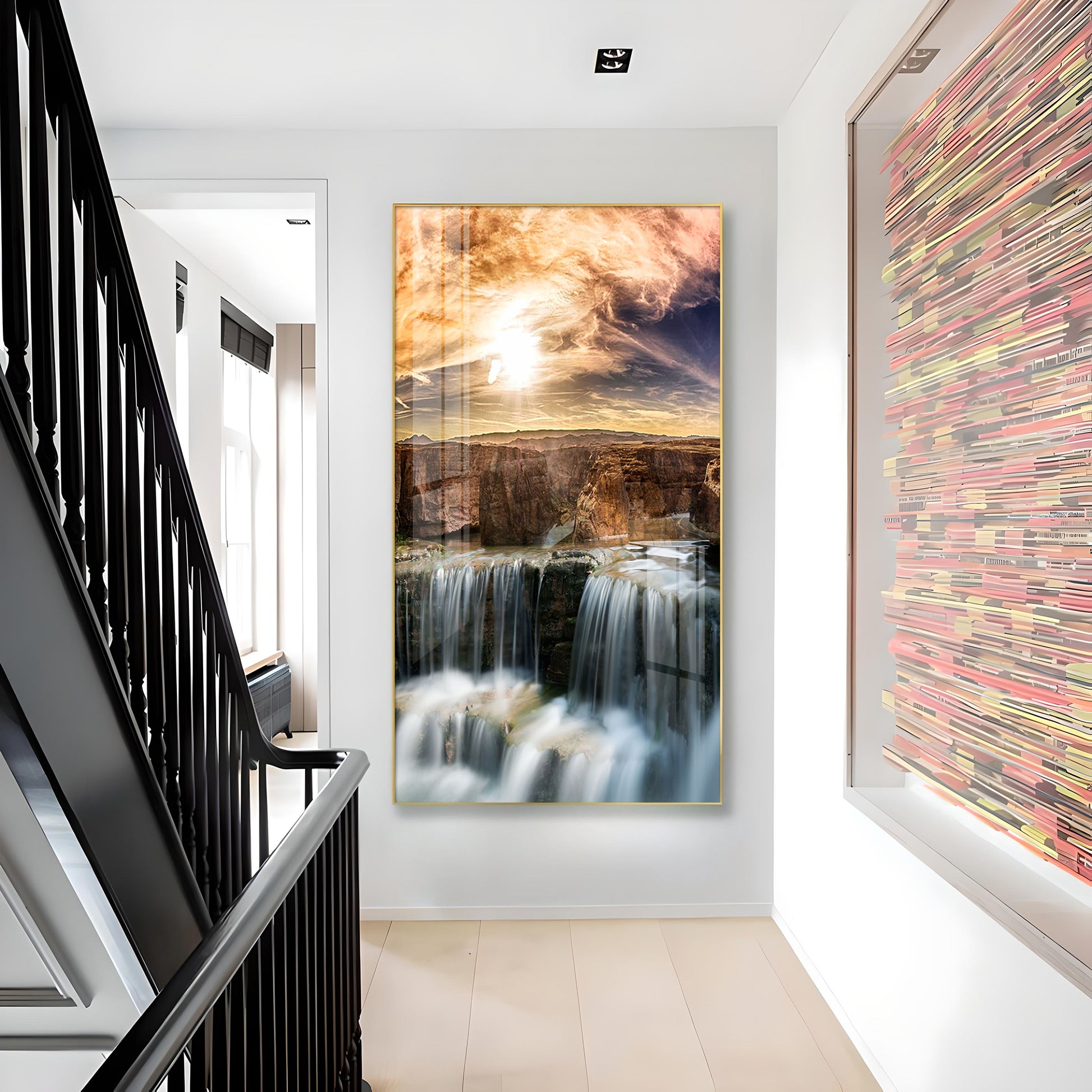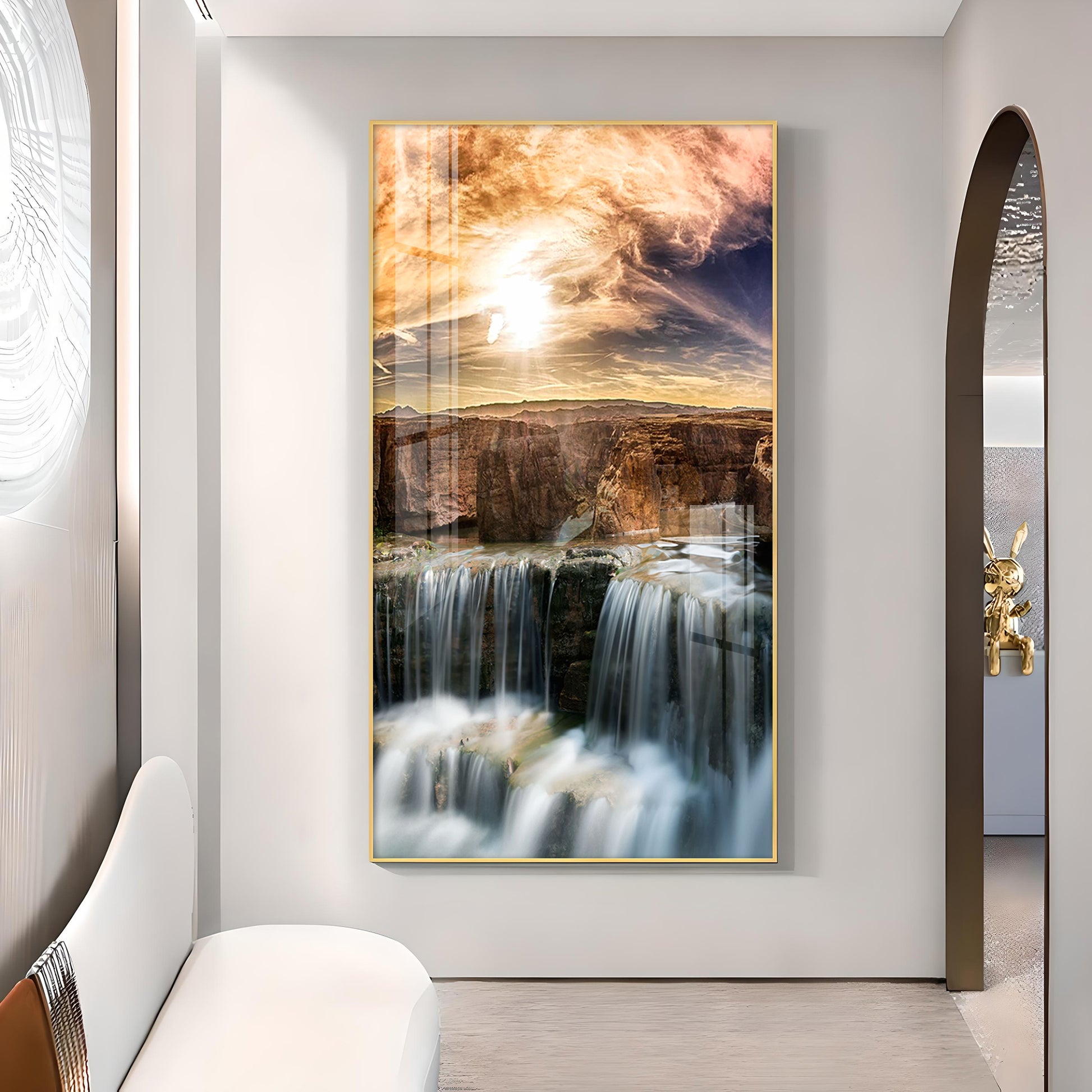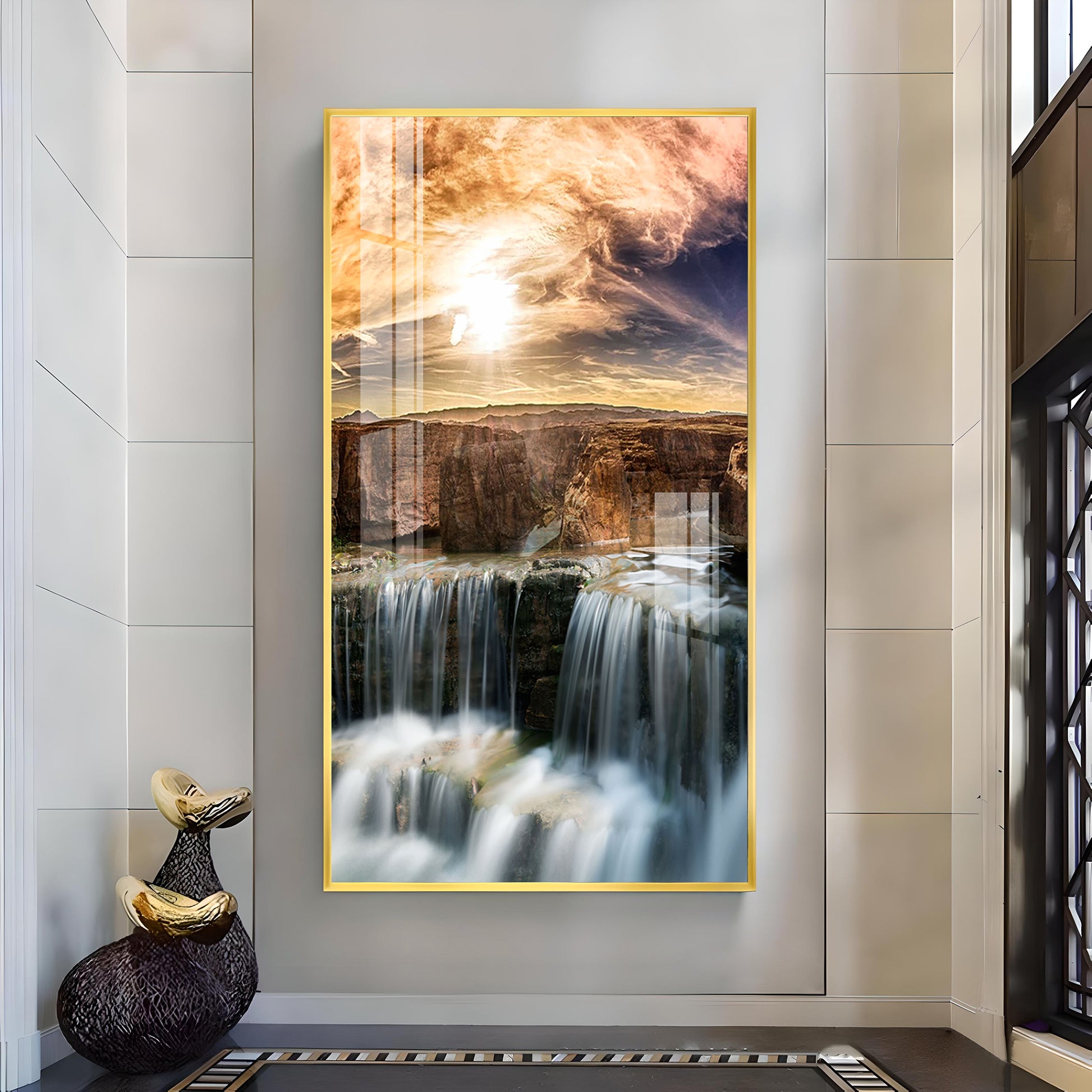Dusk Over the Falls Glass Finish Vertical Wall Art
