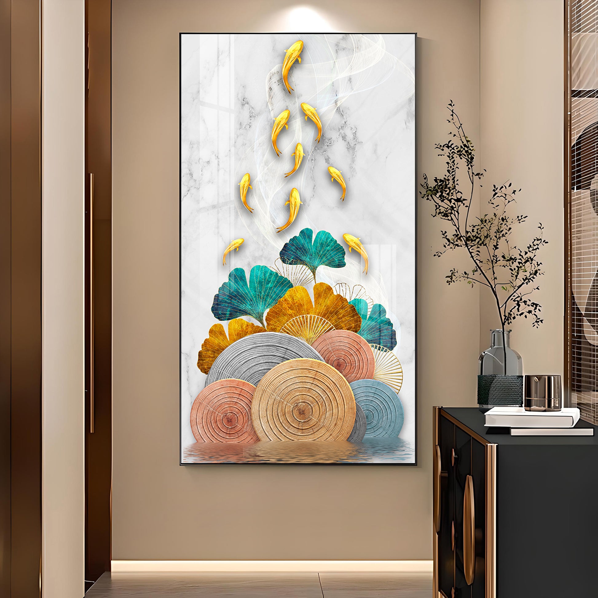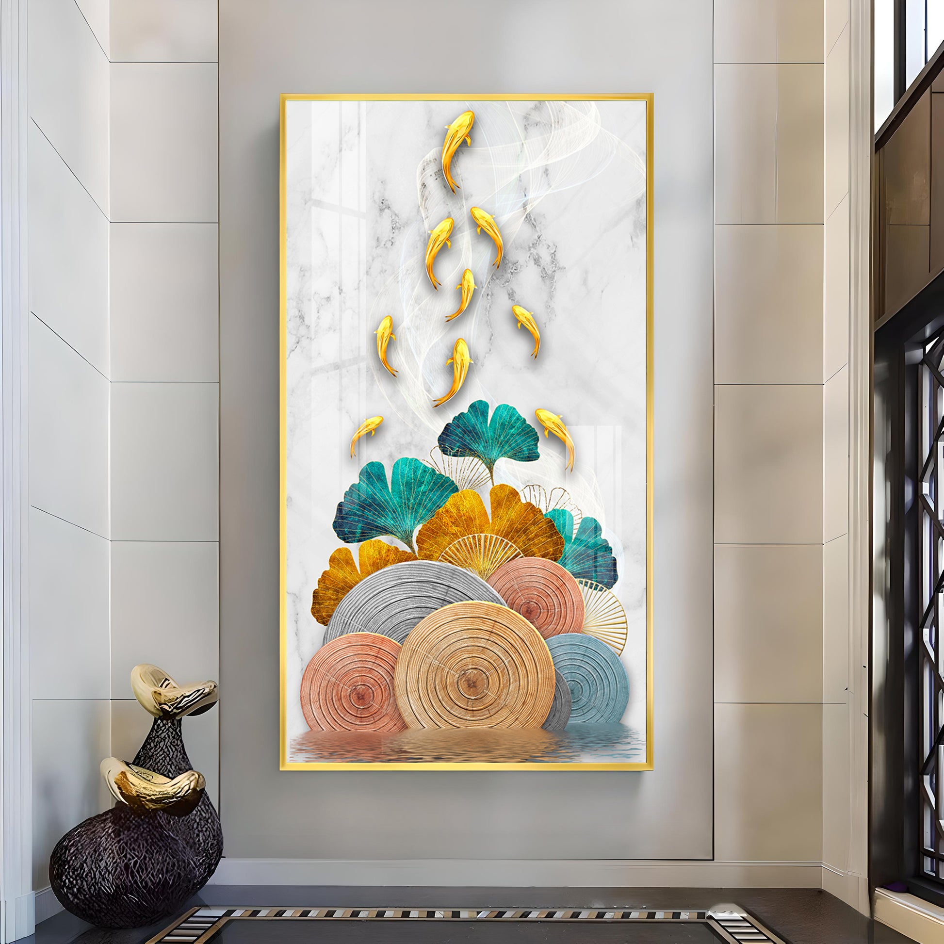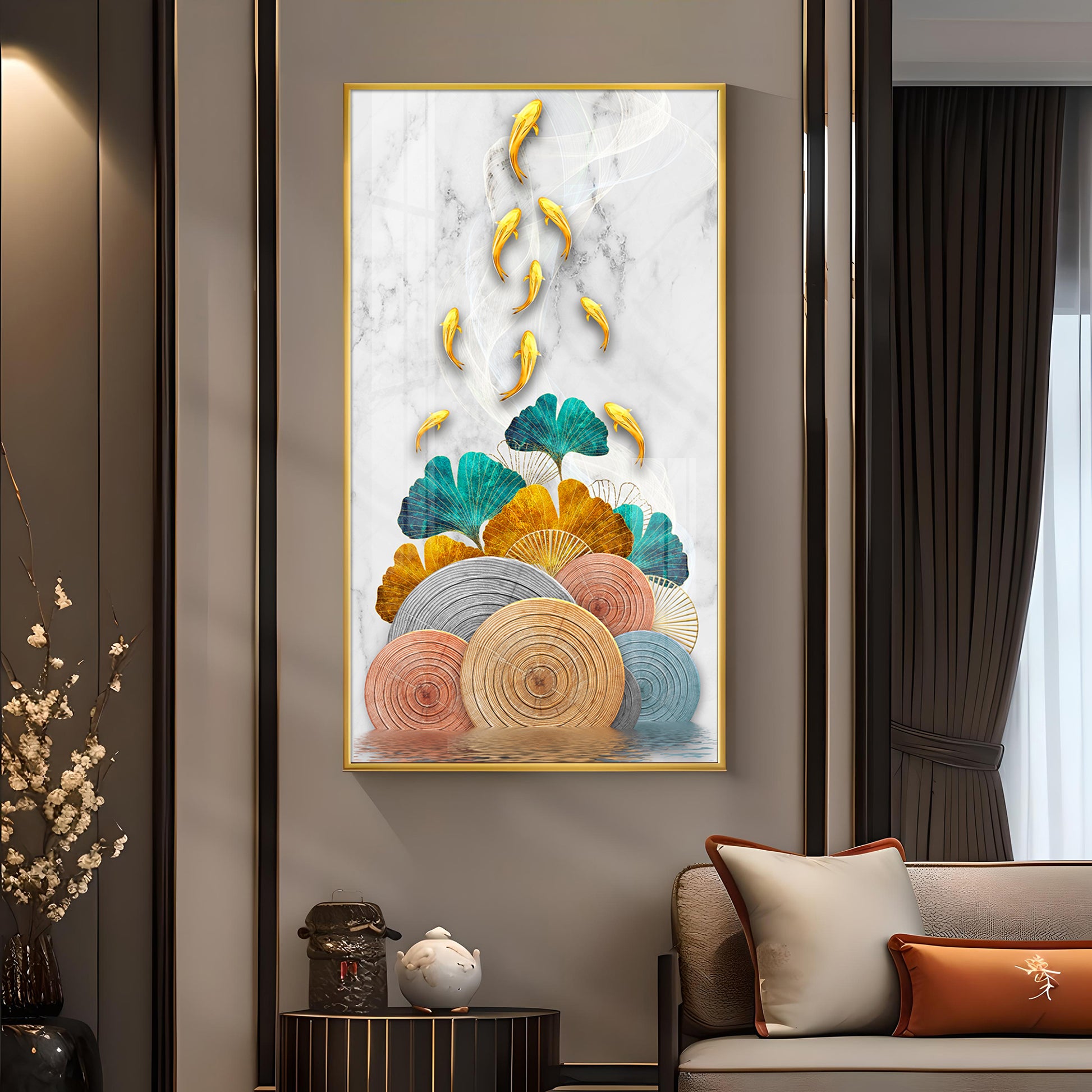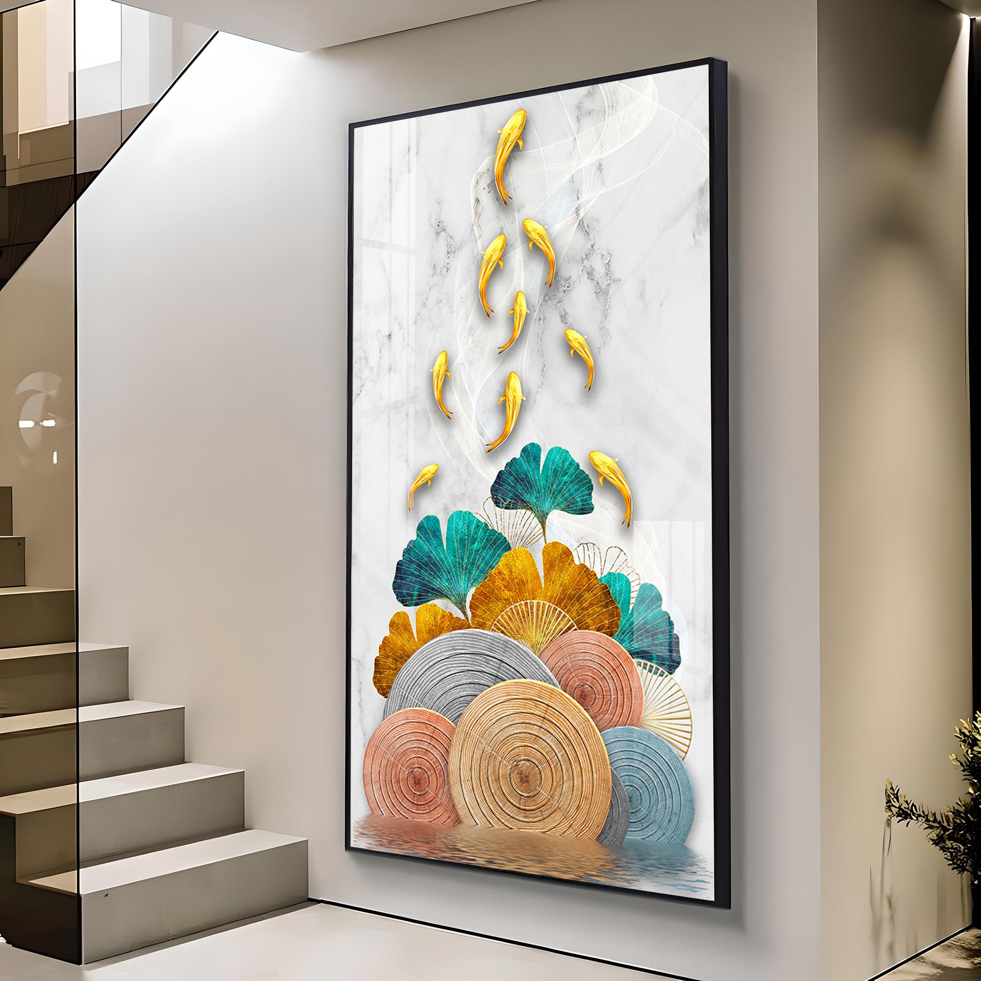 Floral Koi Bliss Artistry Glass Finish Vertical Wall Art