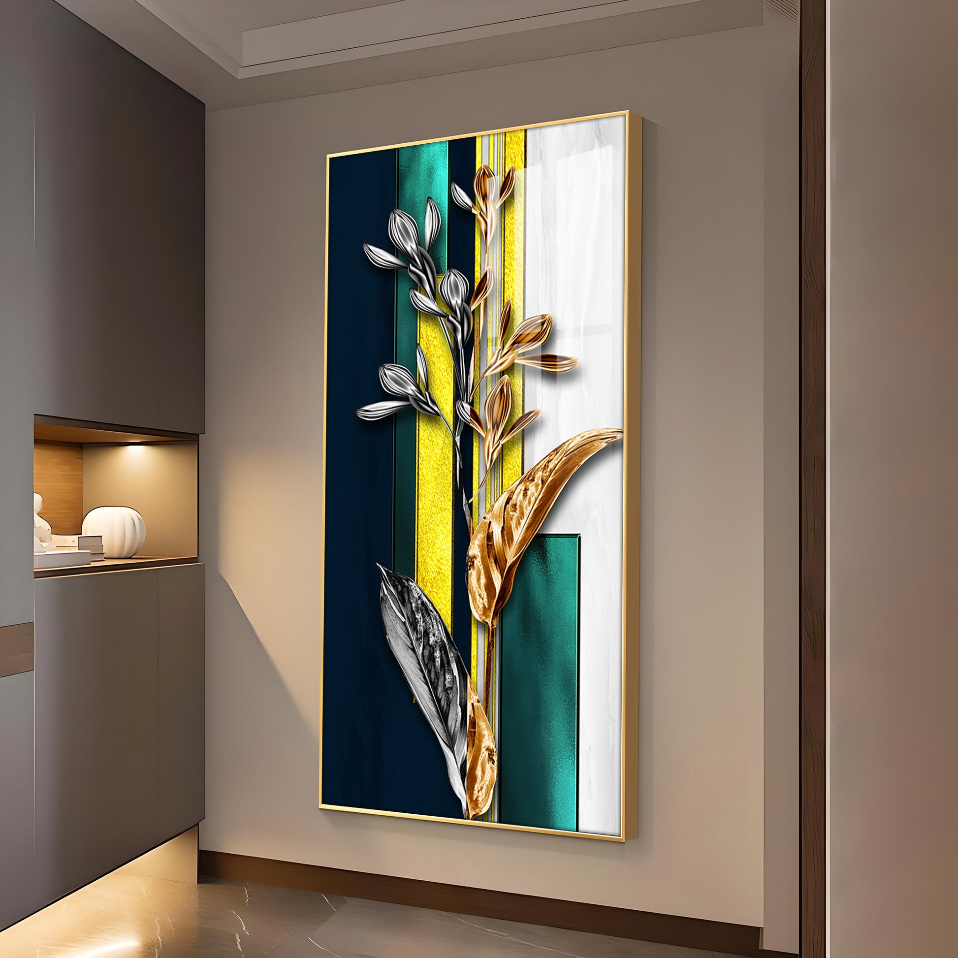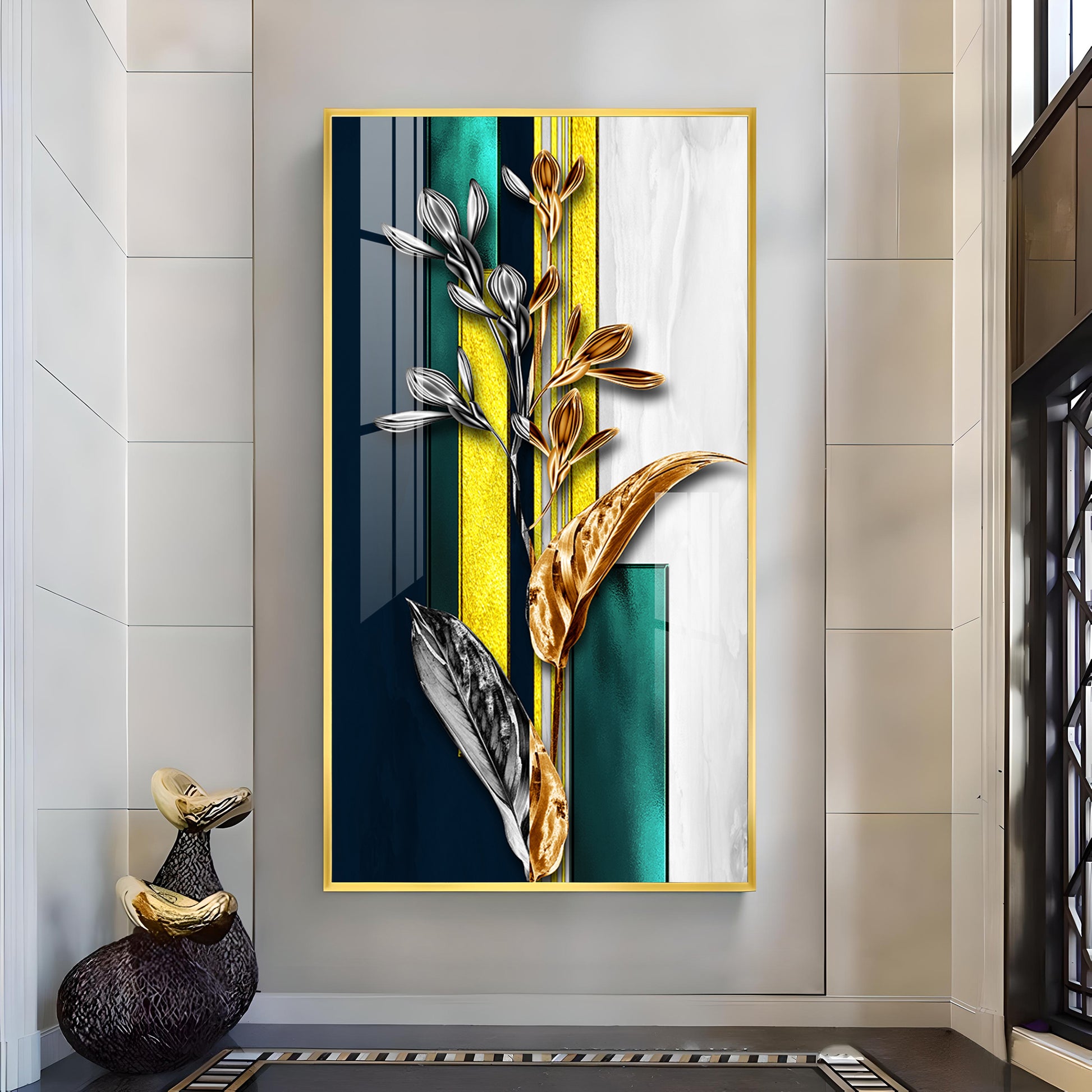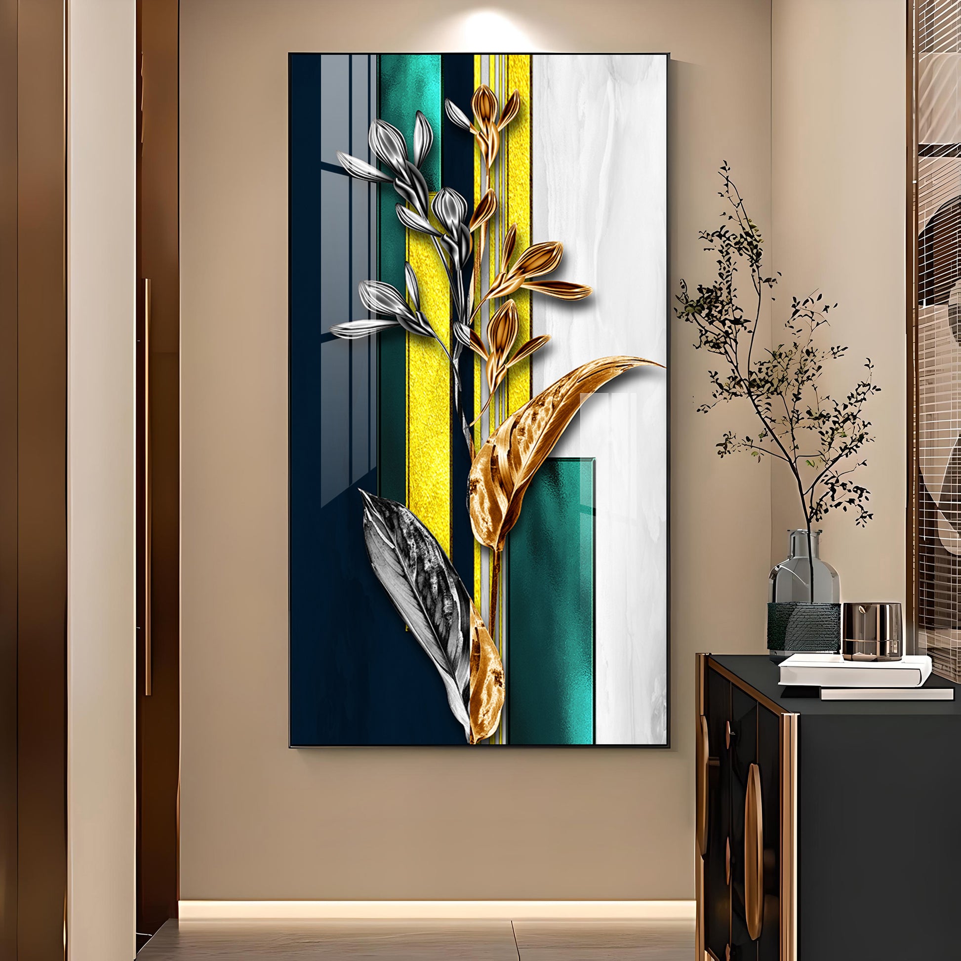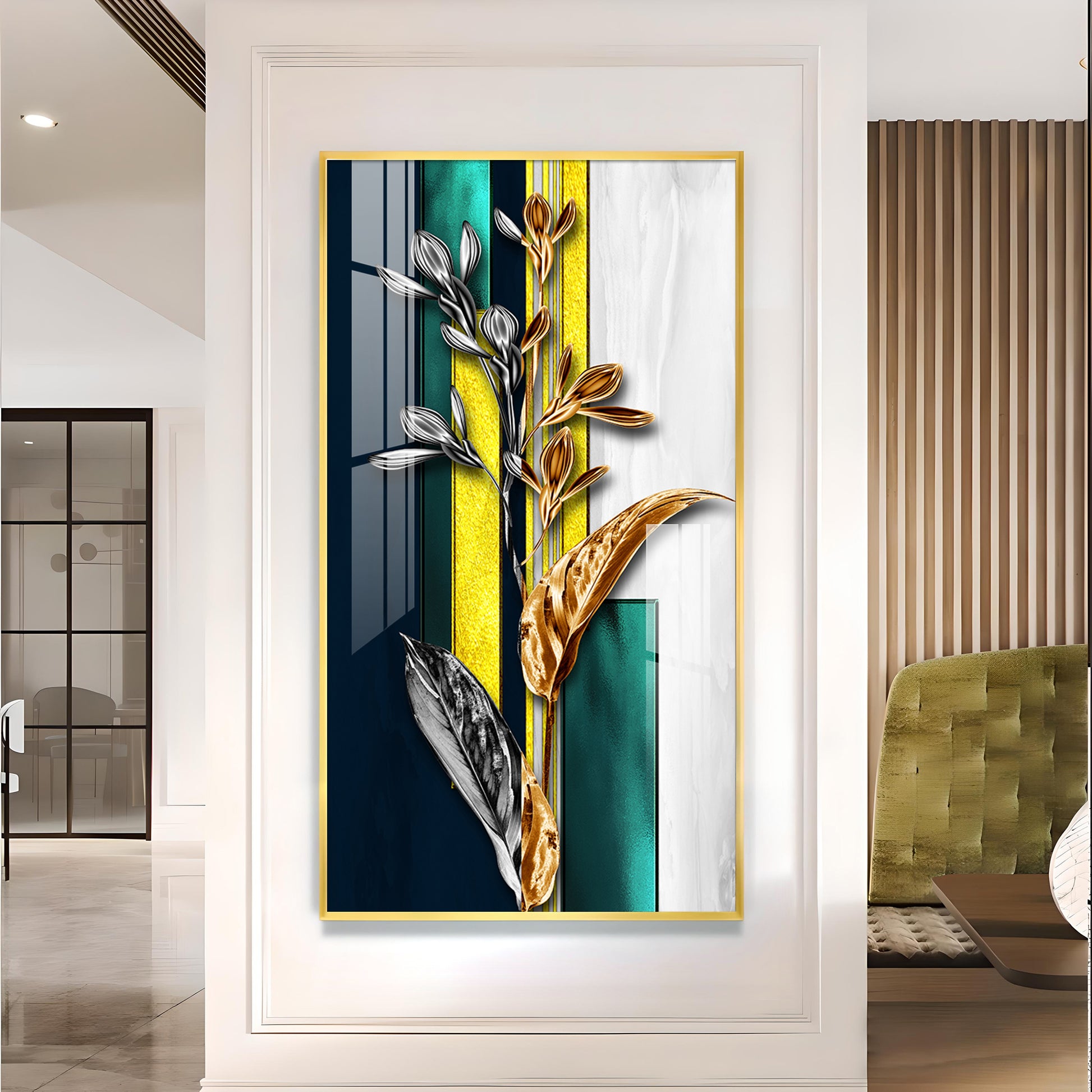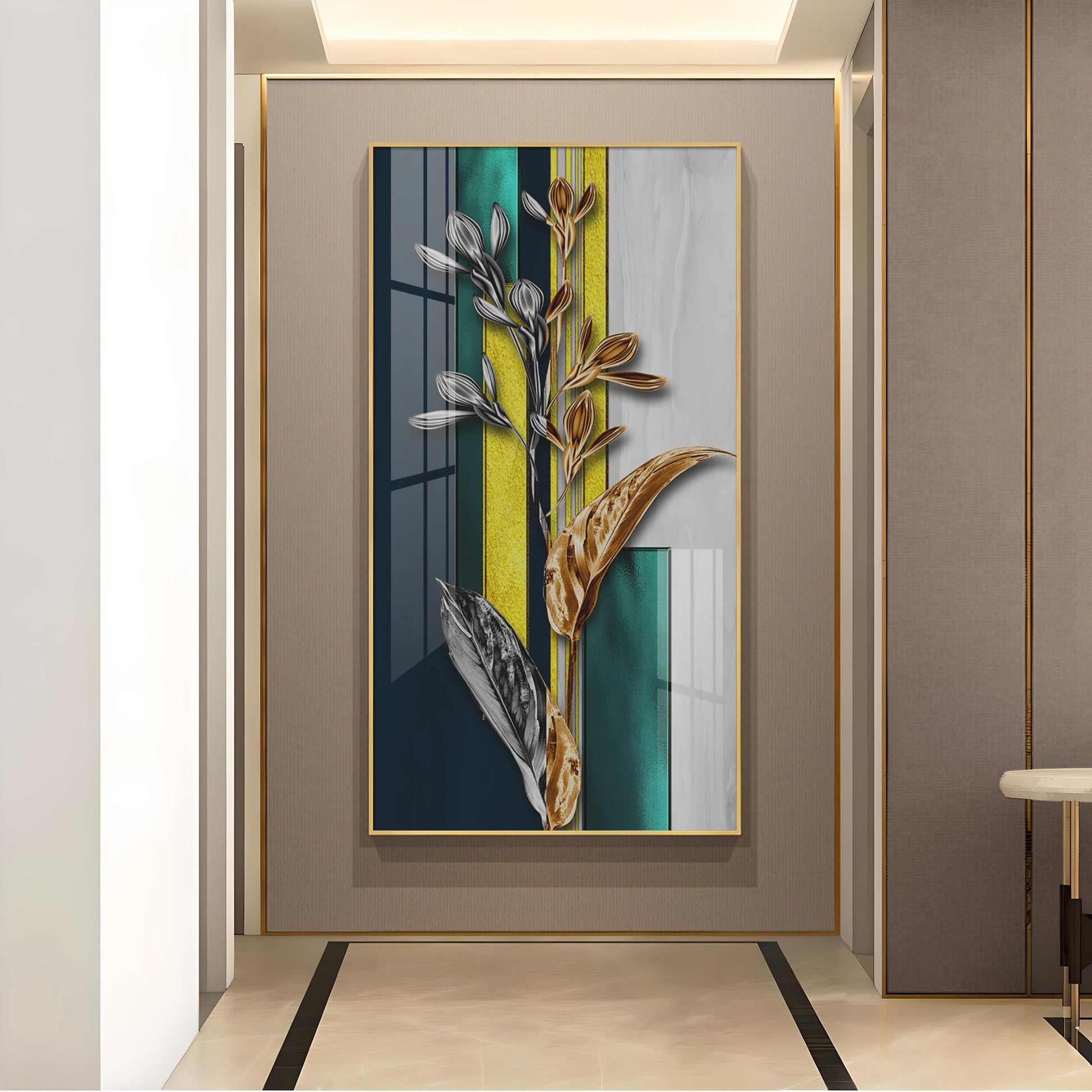 Gilded Floral Glass Finish Vertical Wall Art