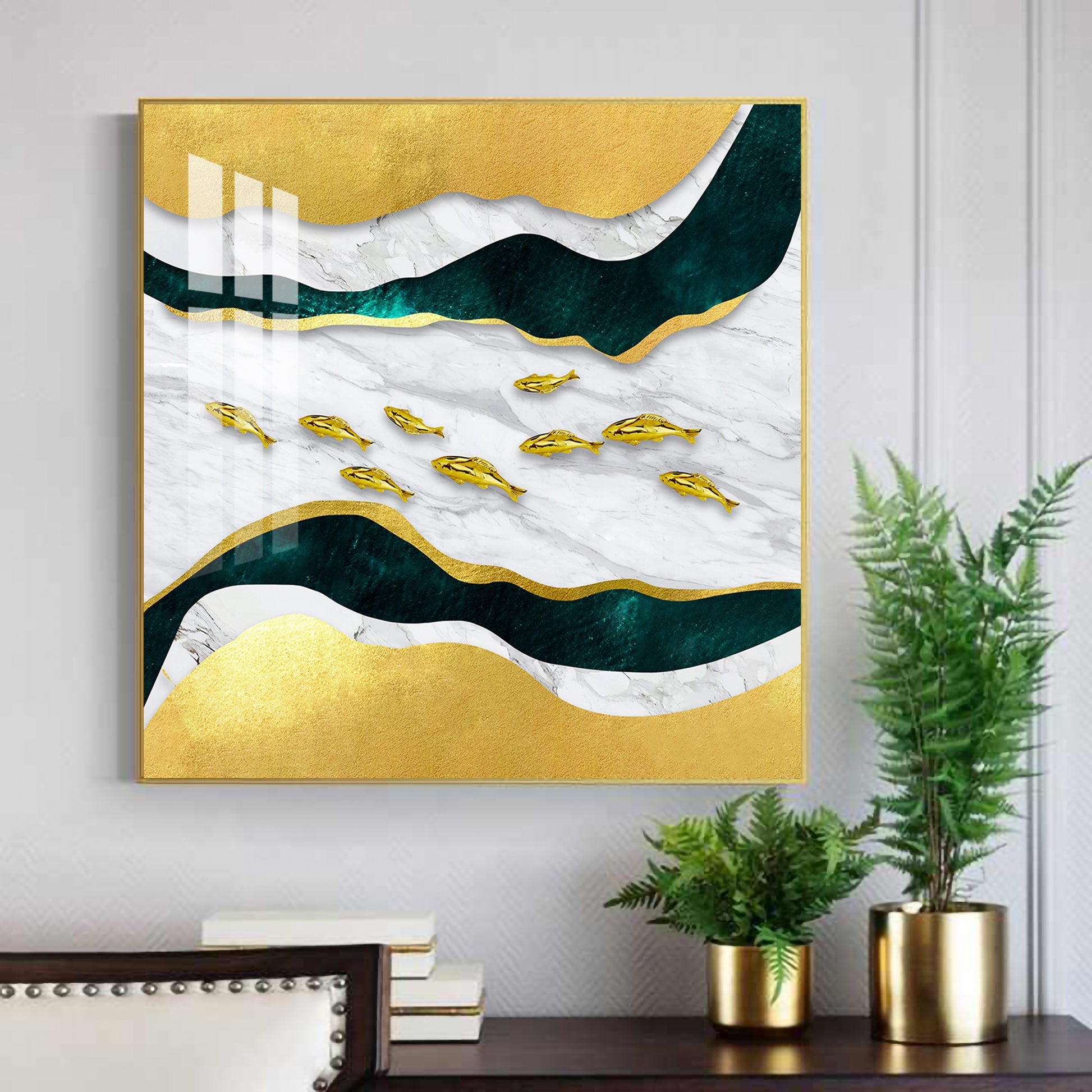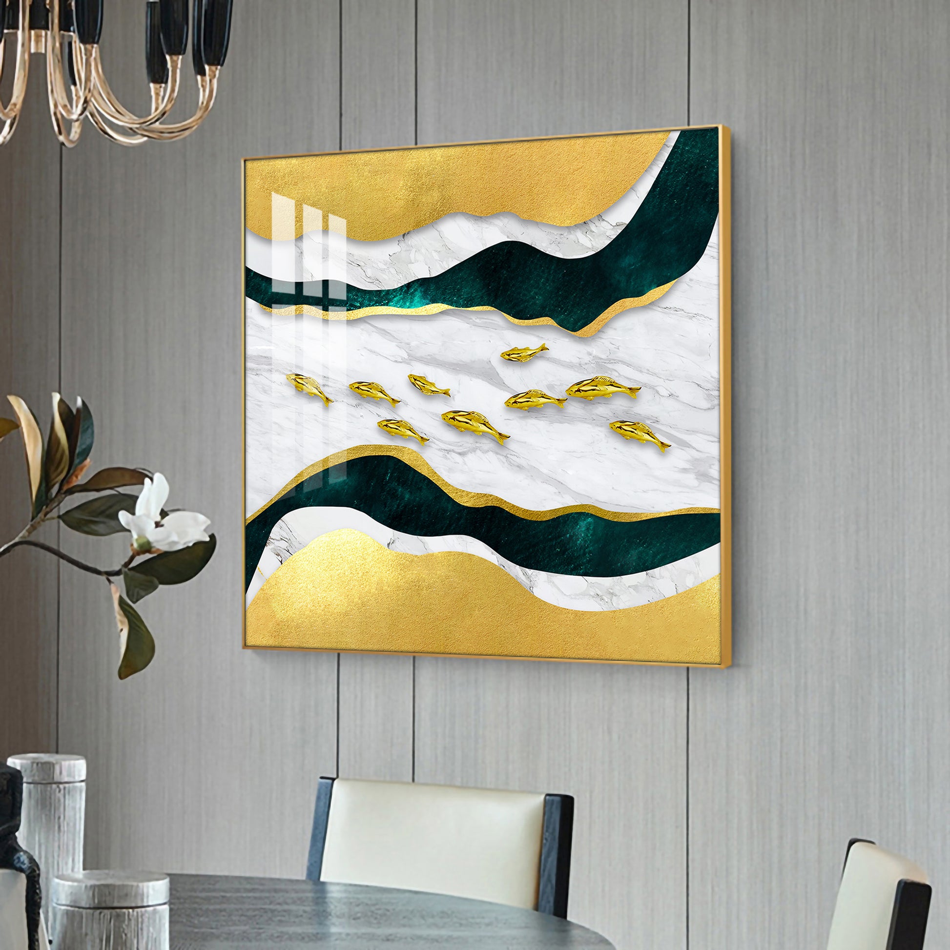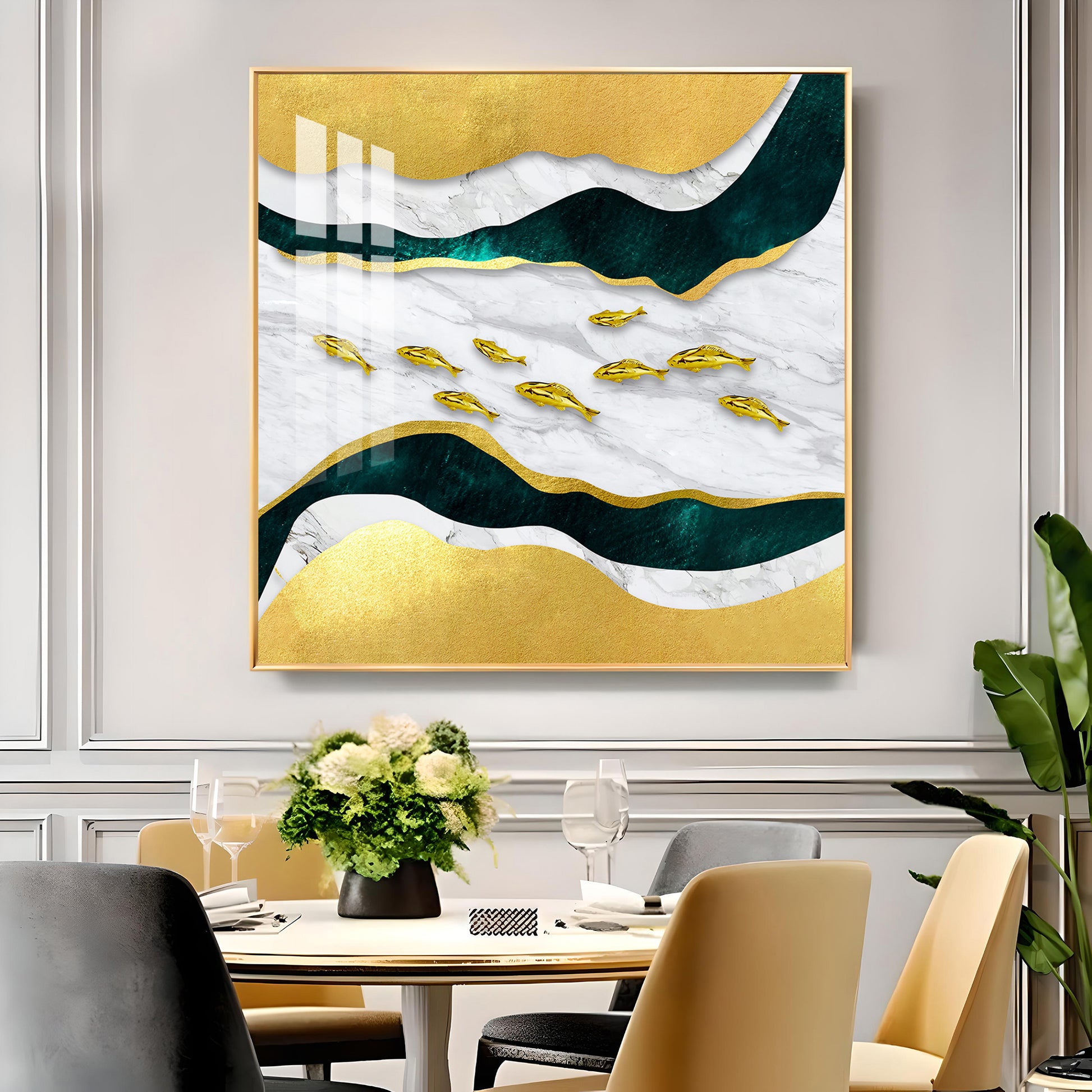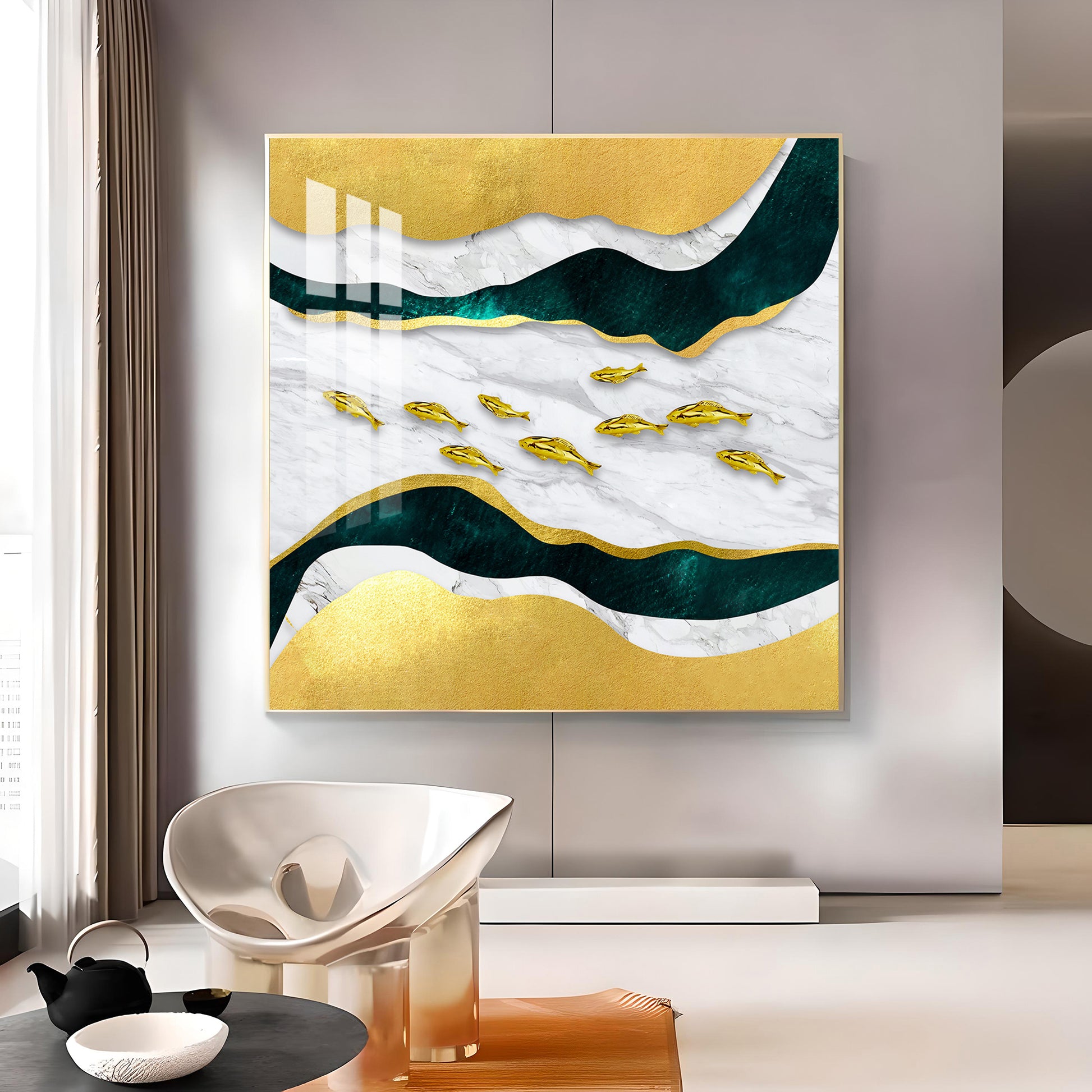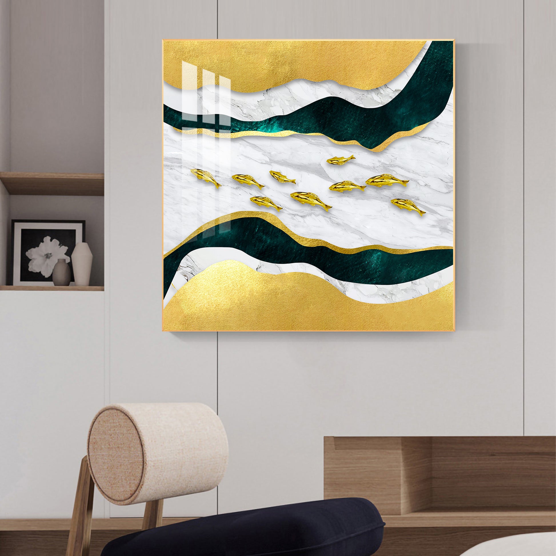 Golden Abstraction Of Fishes Glass Finish Square Wall Art