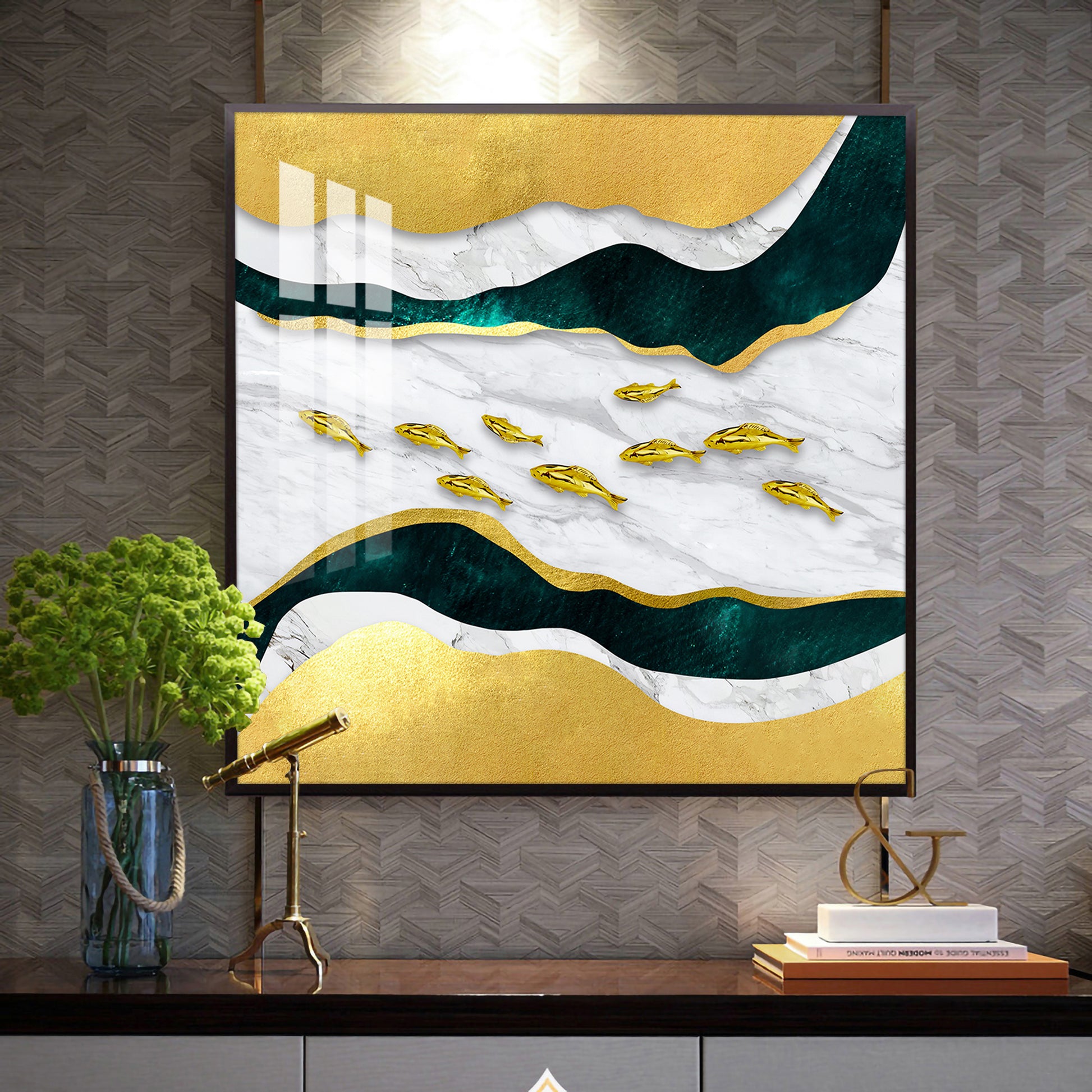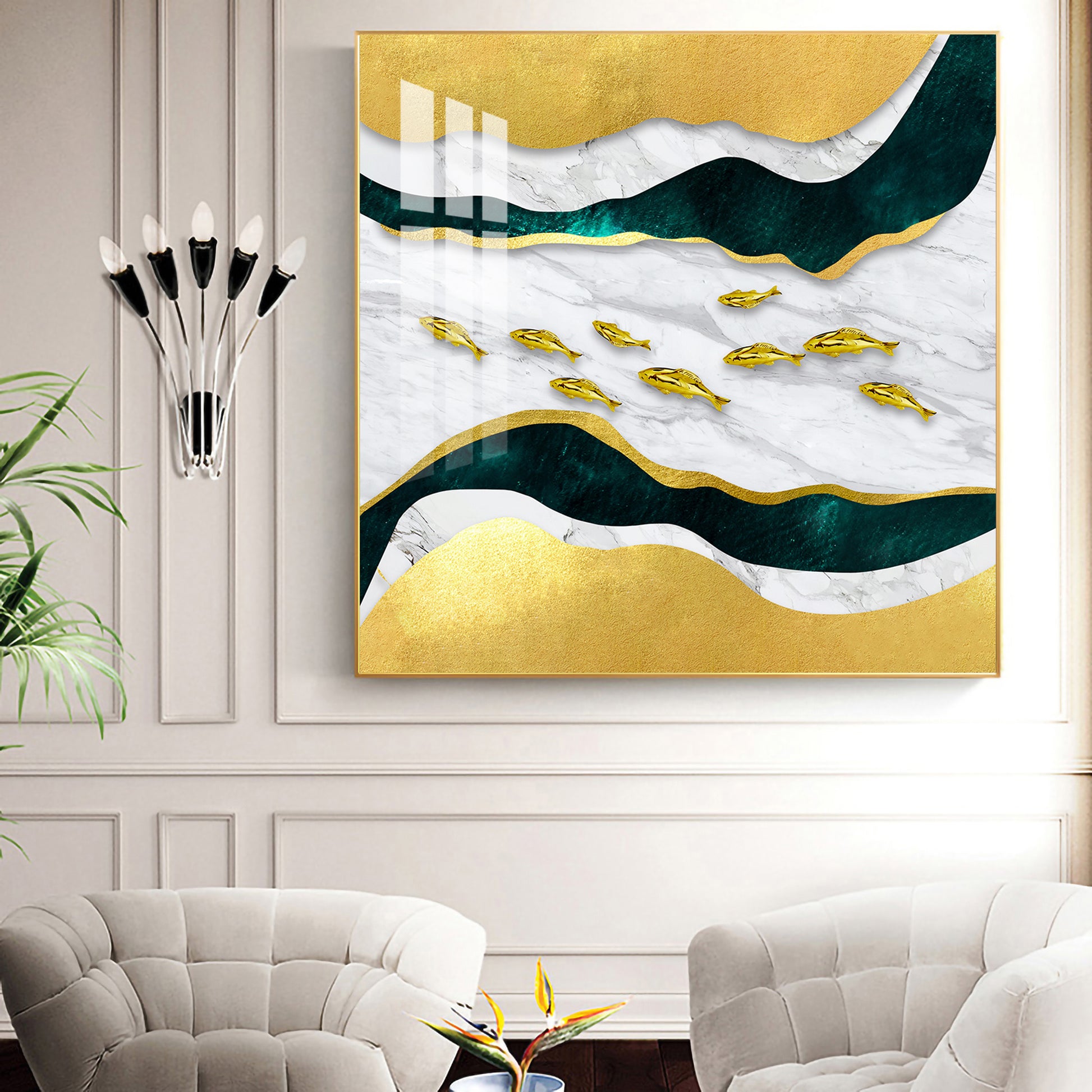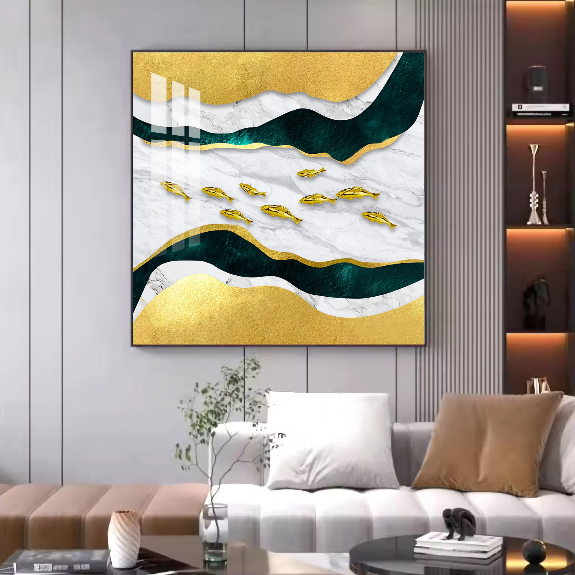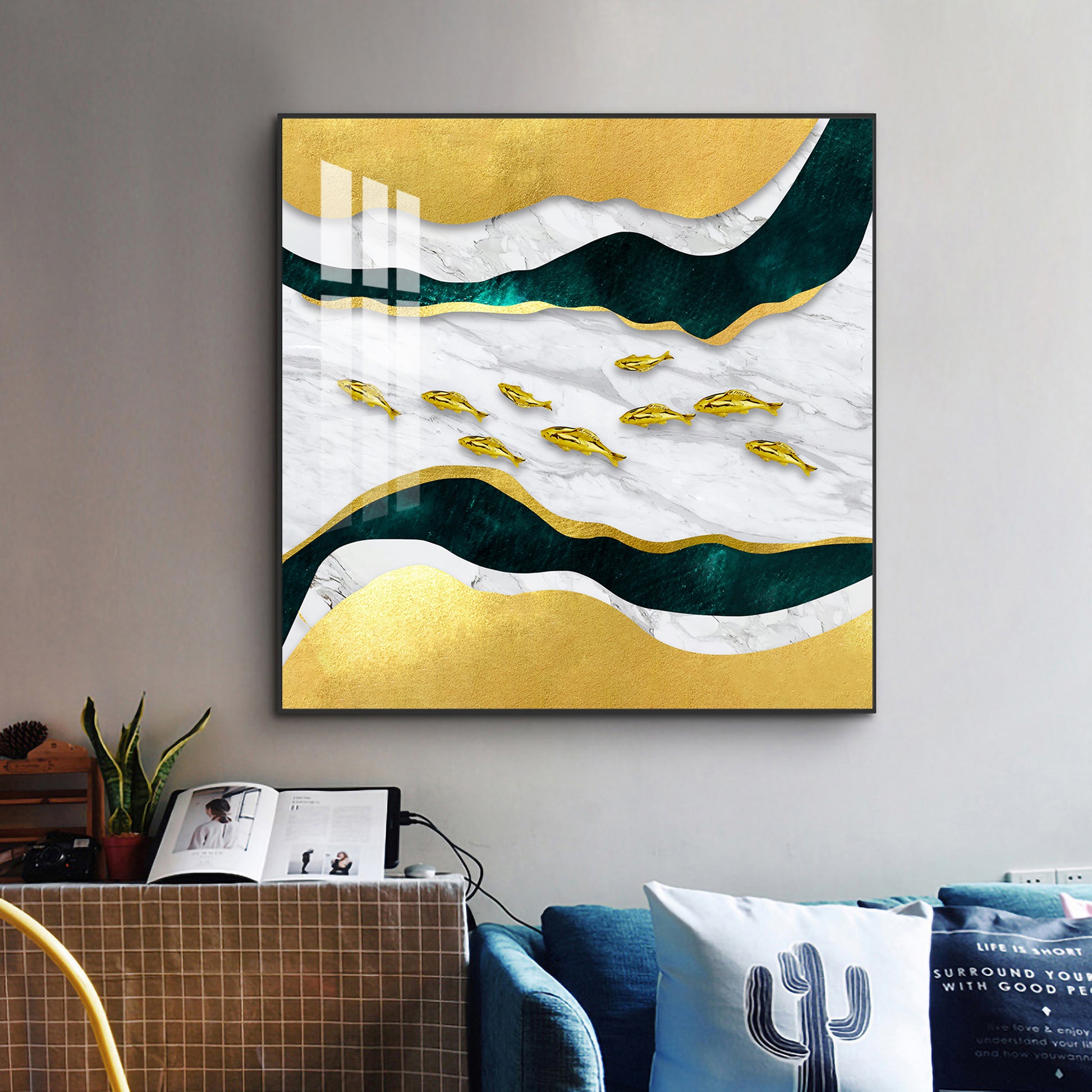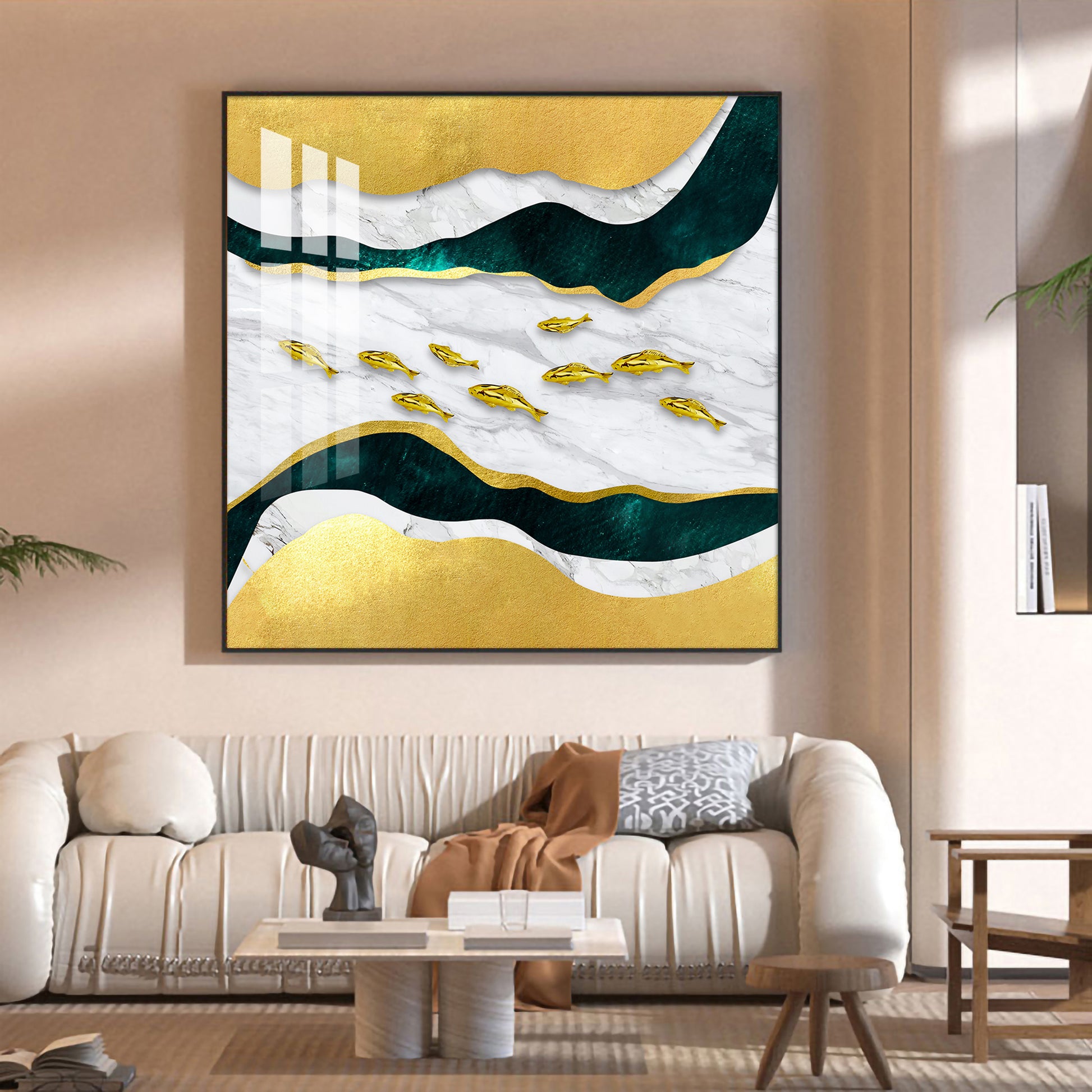 Golden Abstraction Of Fishes Glass Finish Square Wall Art