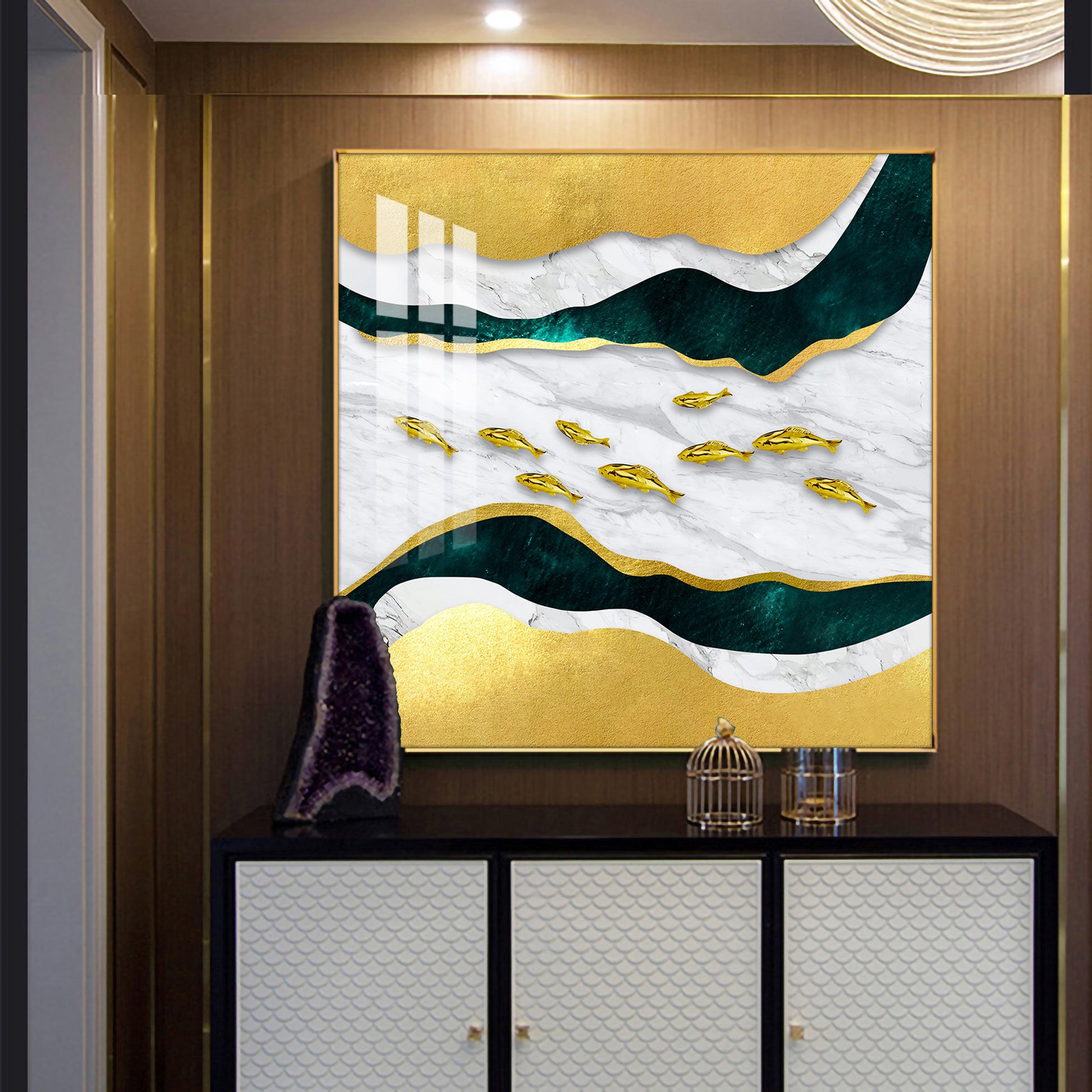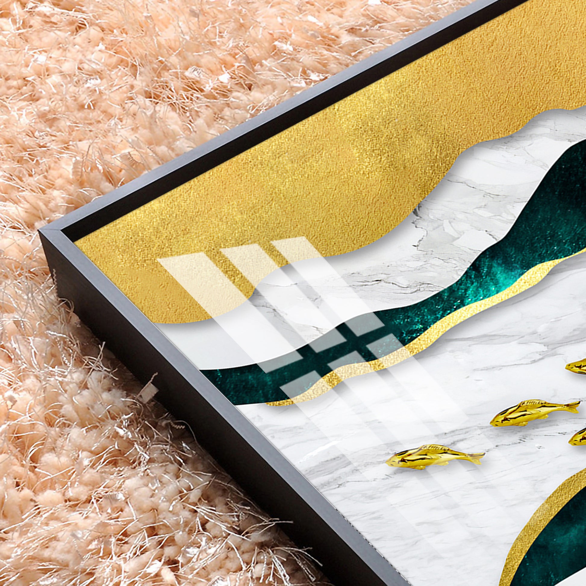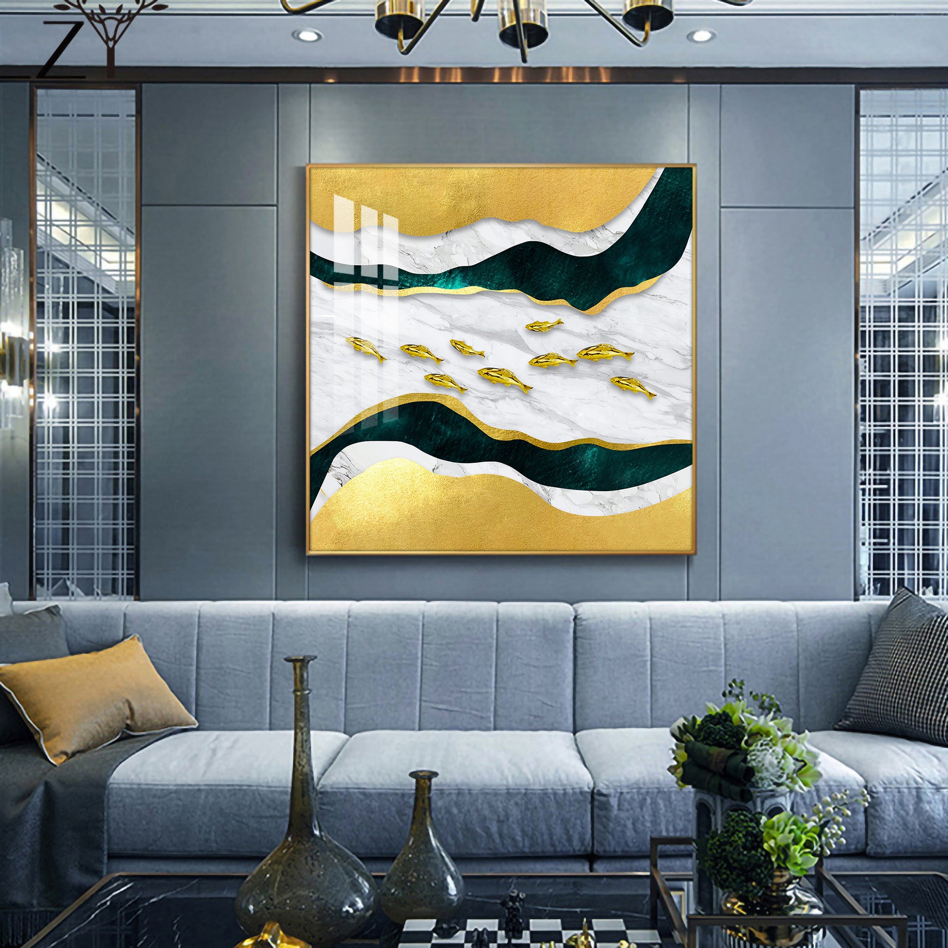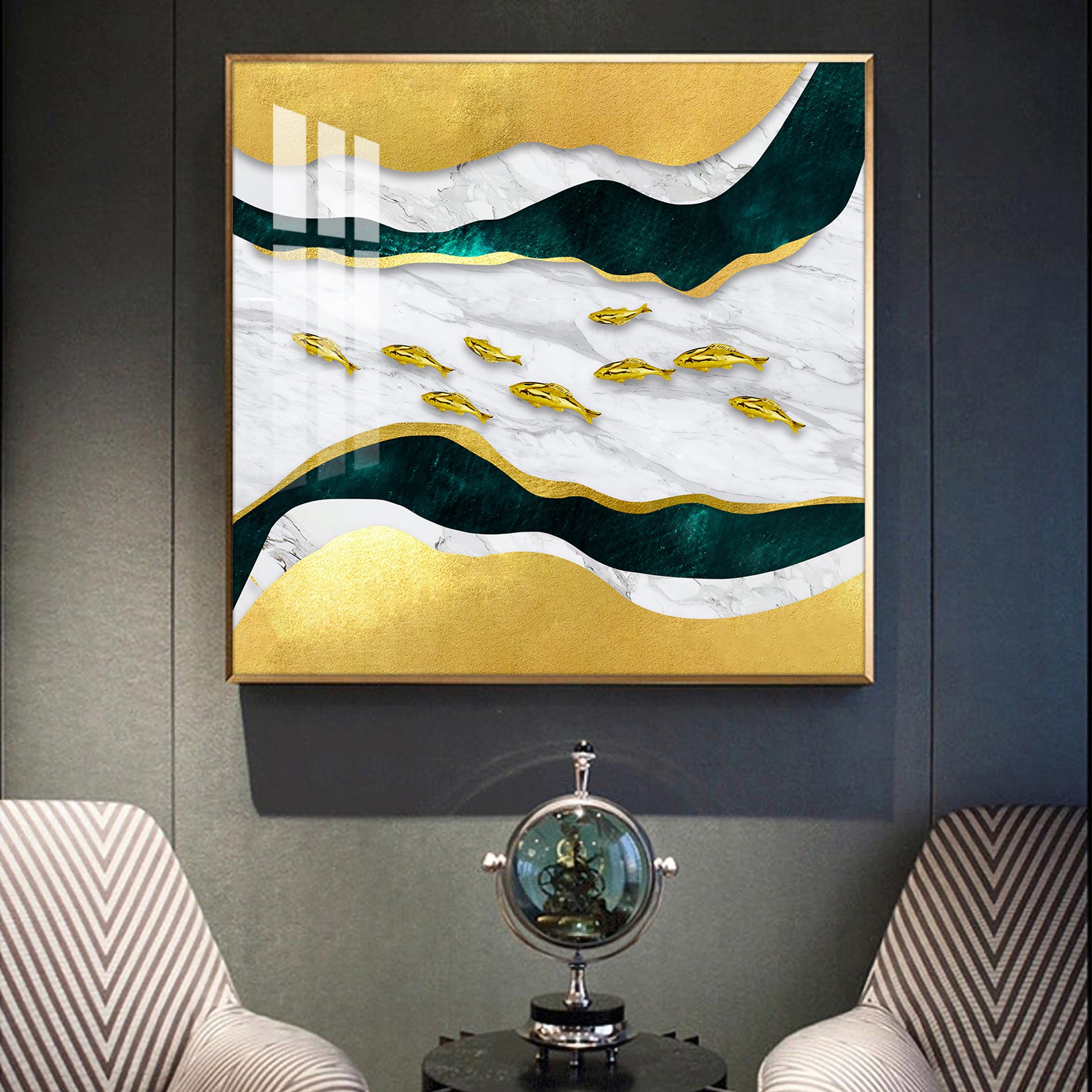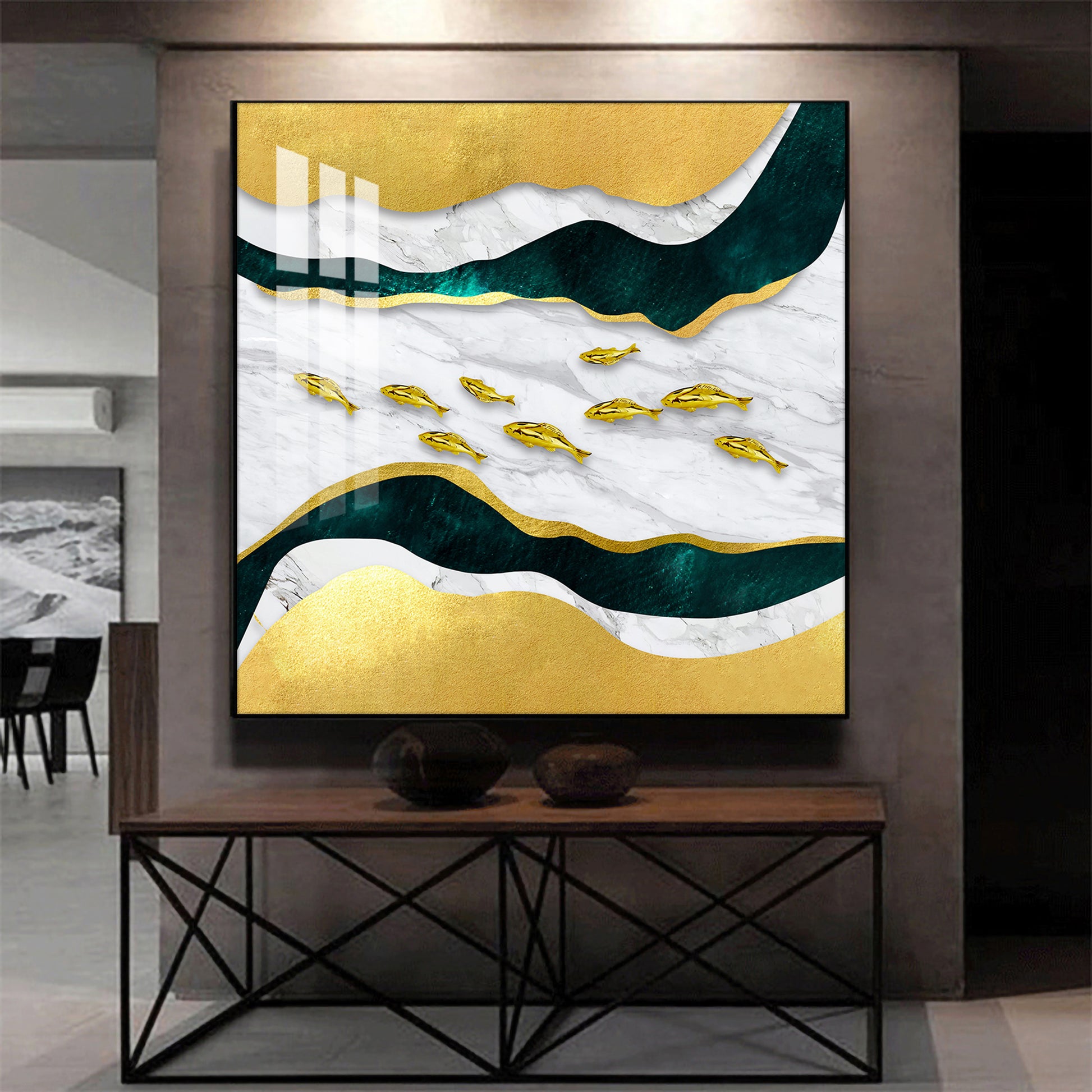 Golden Abstraction Of Fishes Glass Finish Square Wall Art