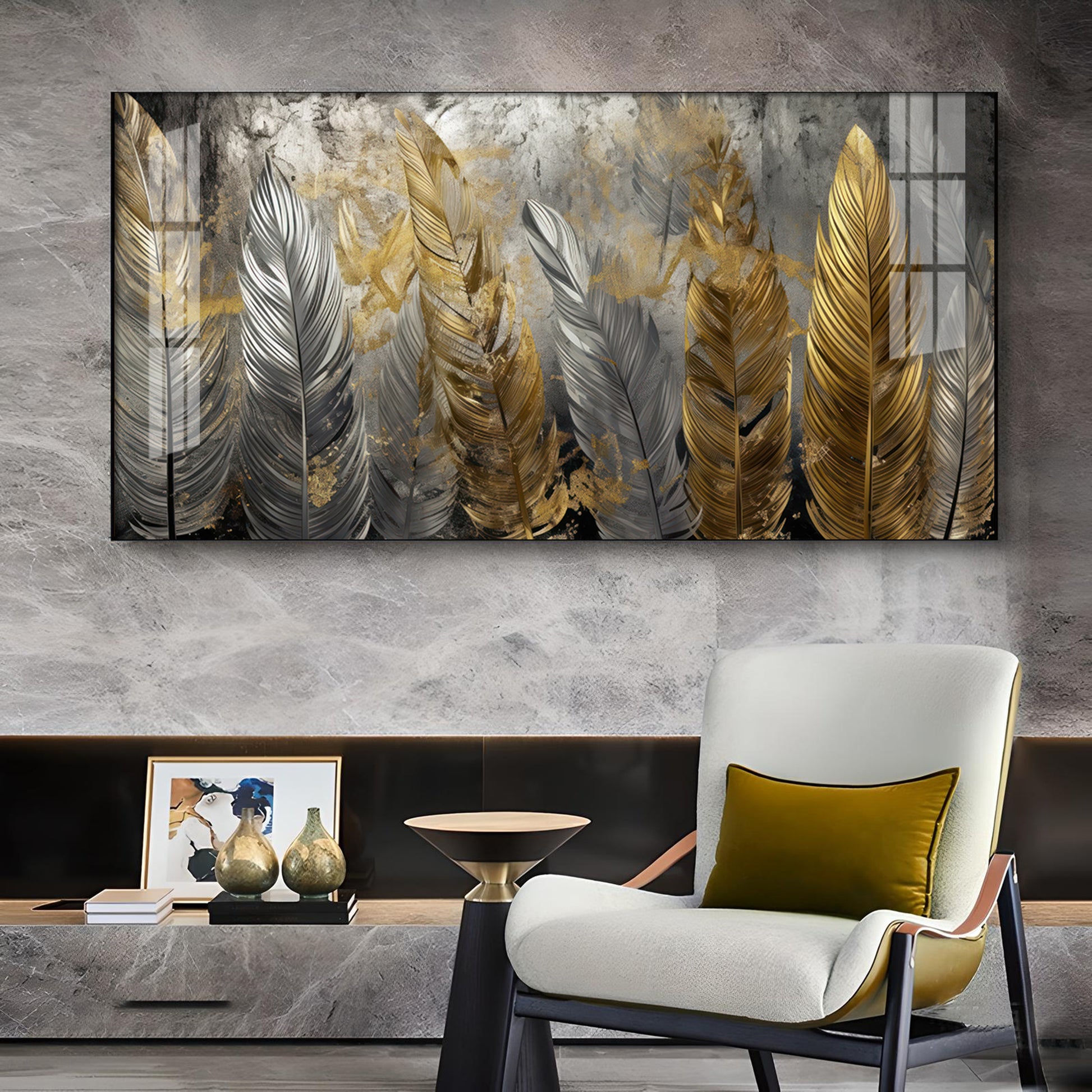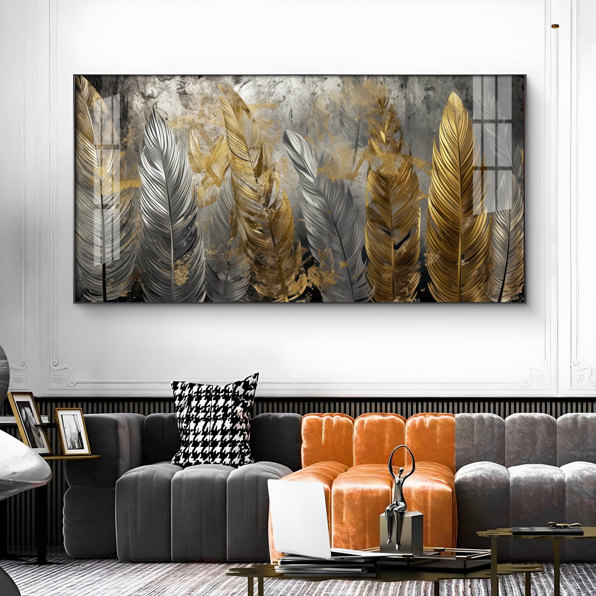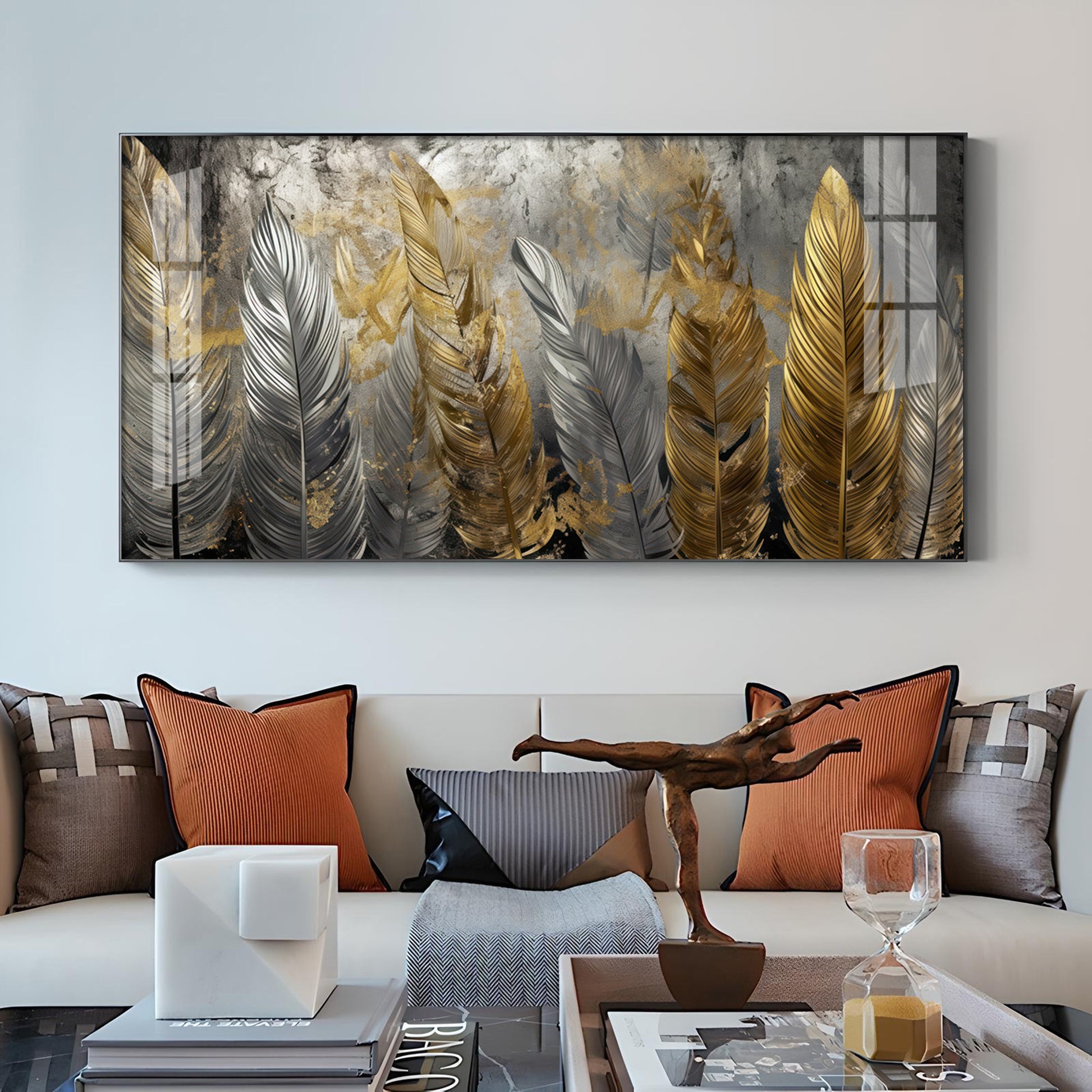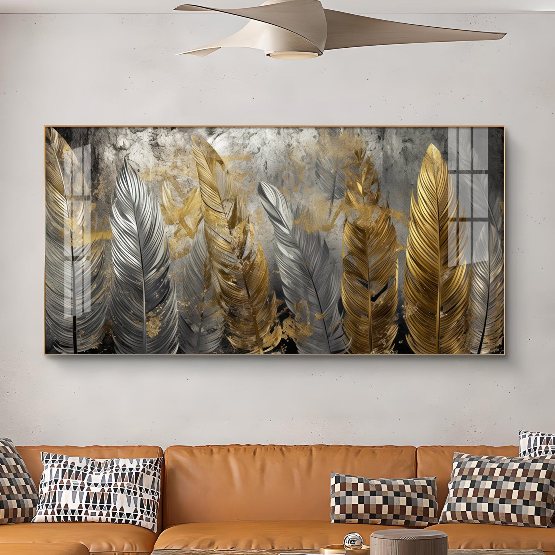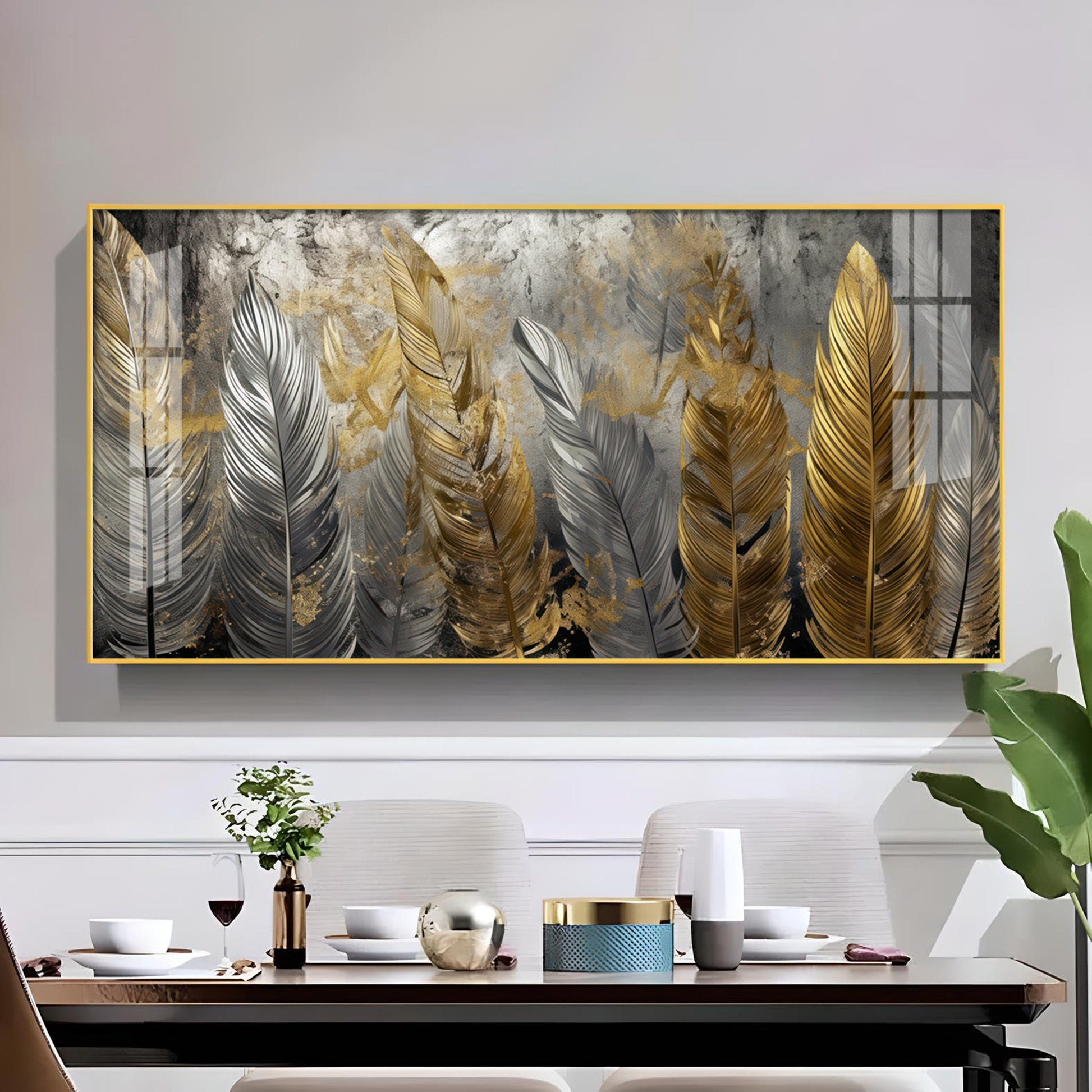 Golden And Silver Feather Glass Finish Horizontal Wall Art