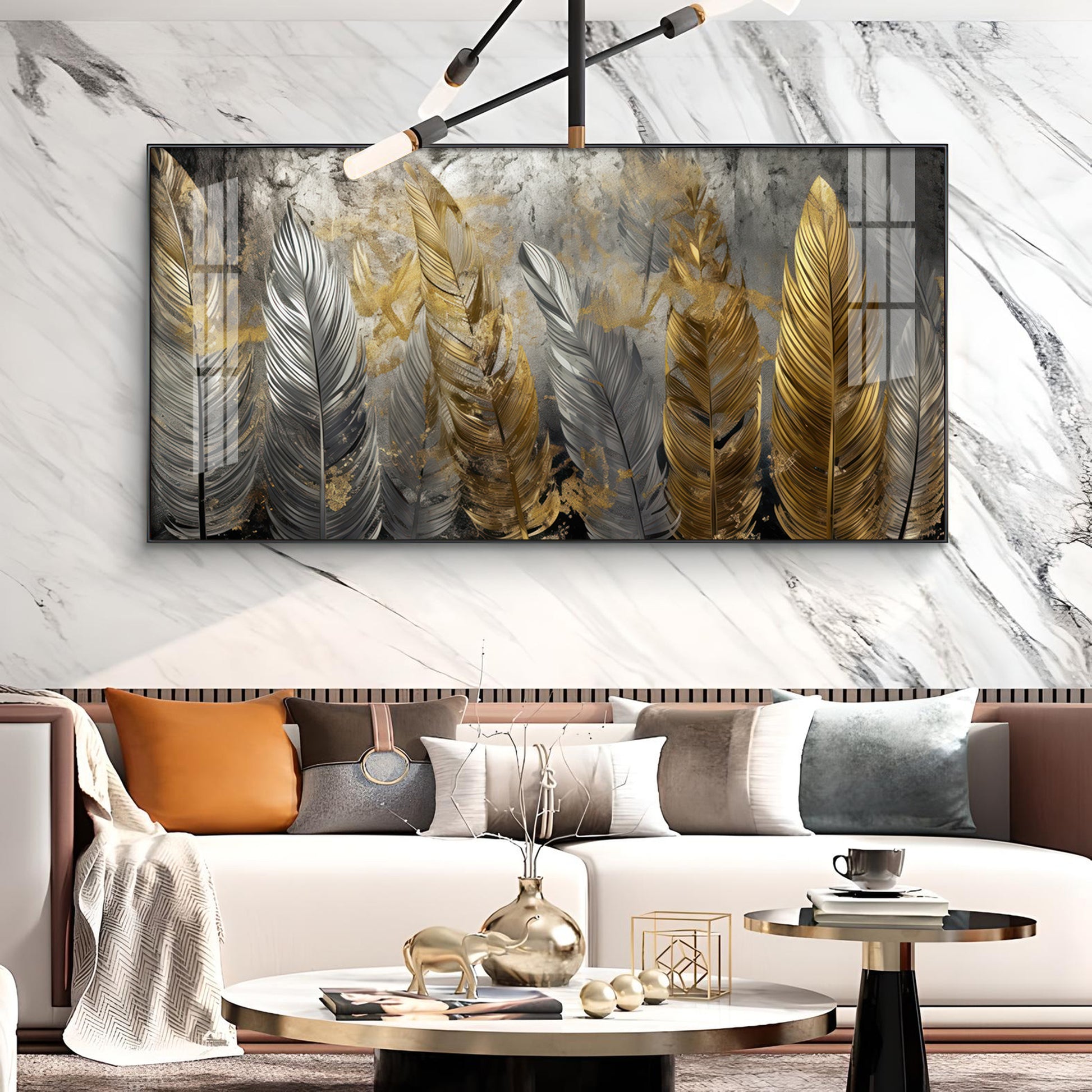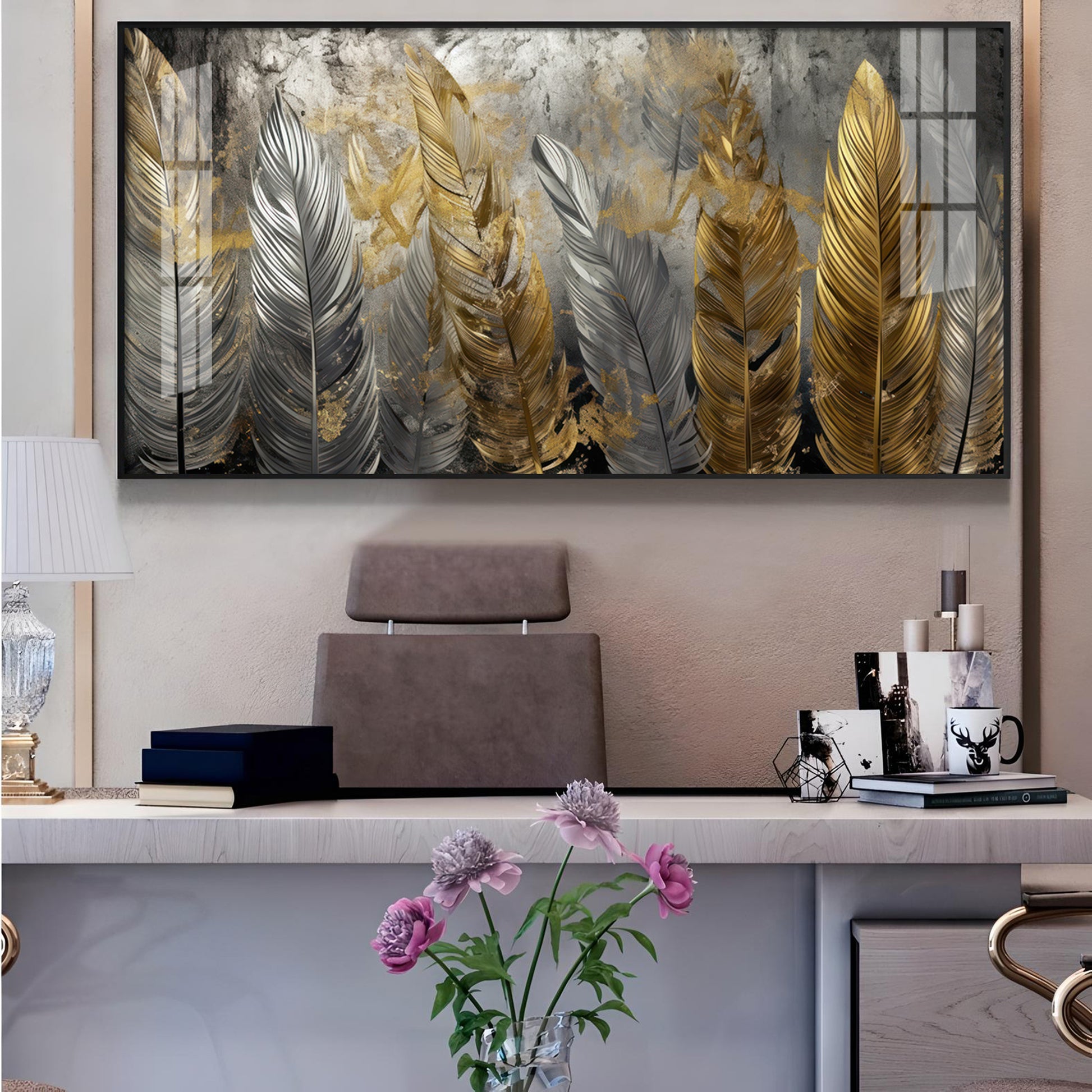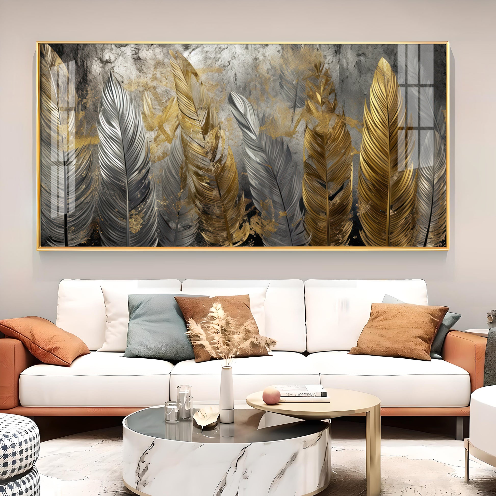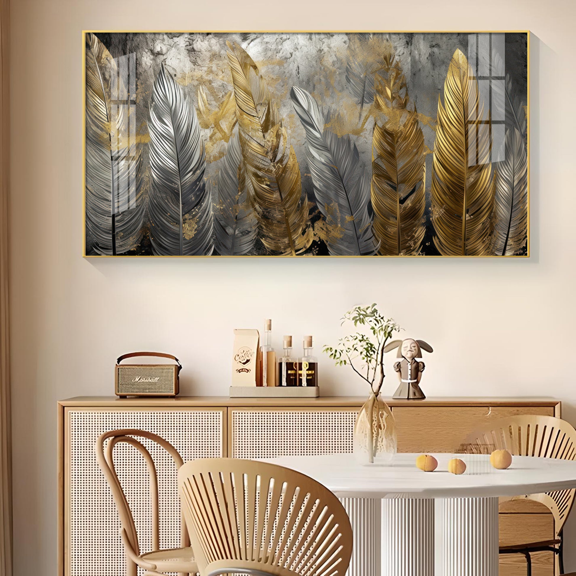 Golden And Silver Feather Glass Finish Horizontal Wall Art