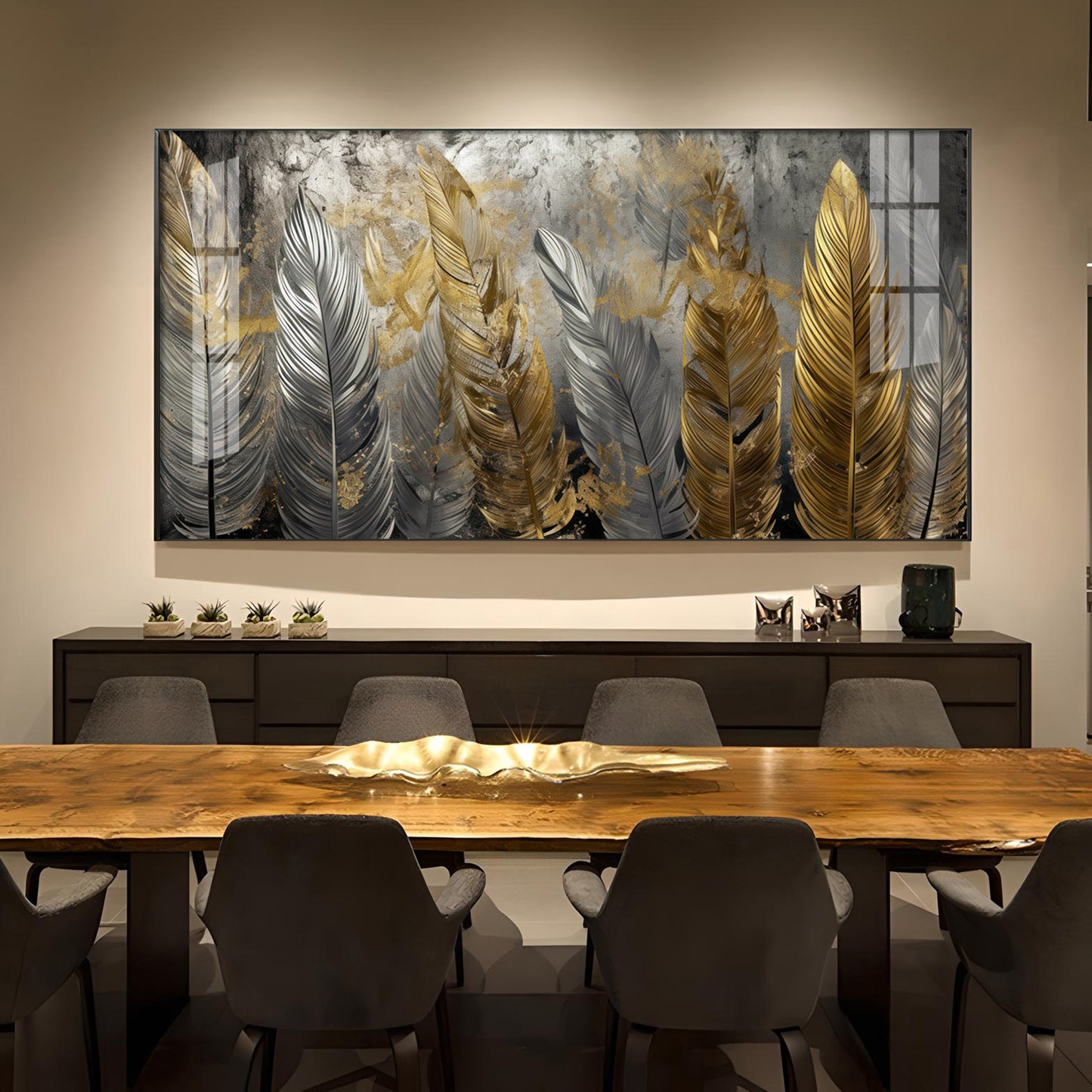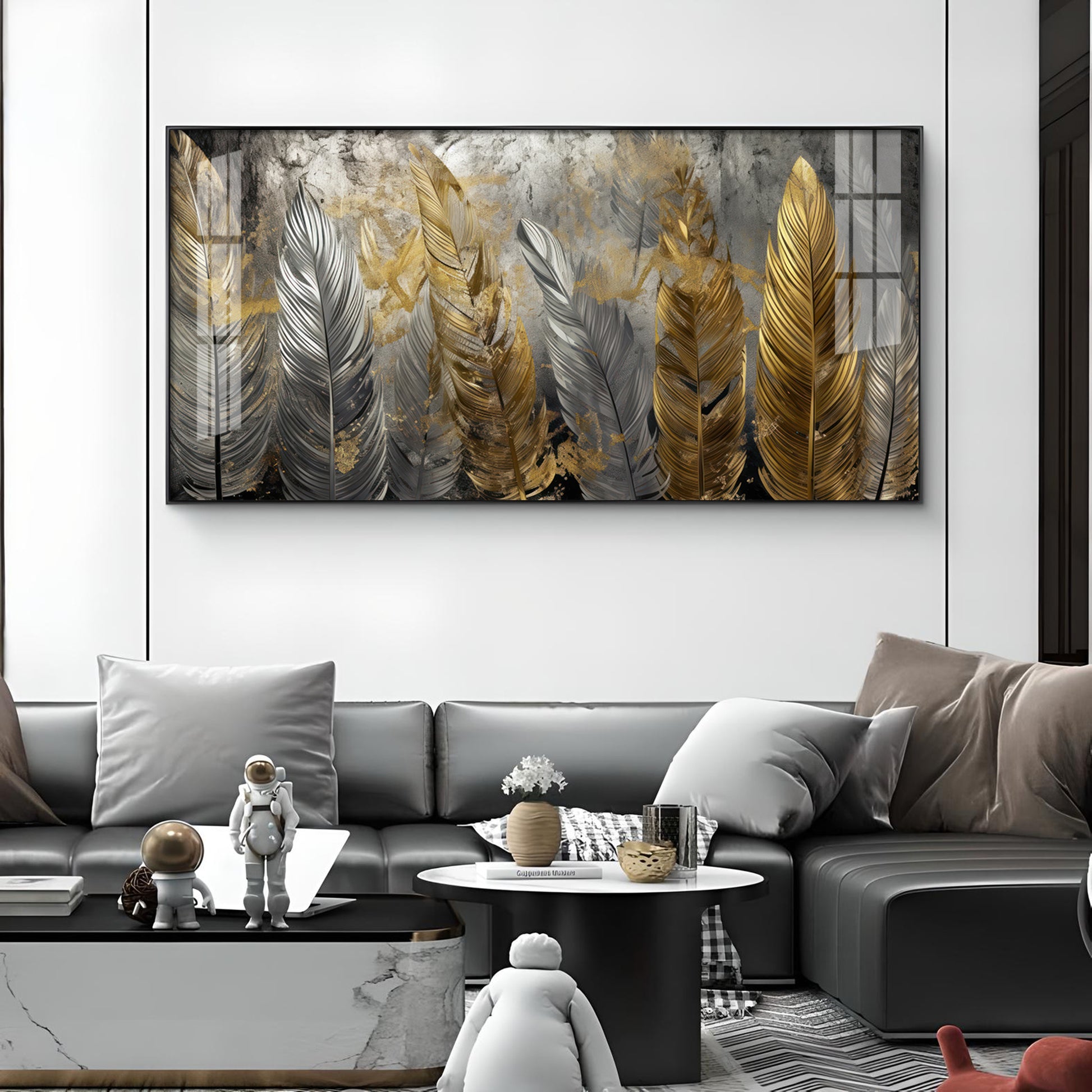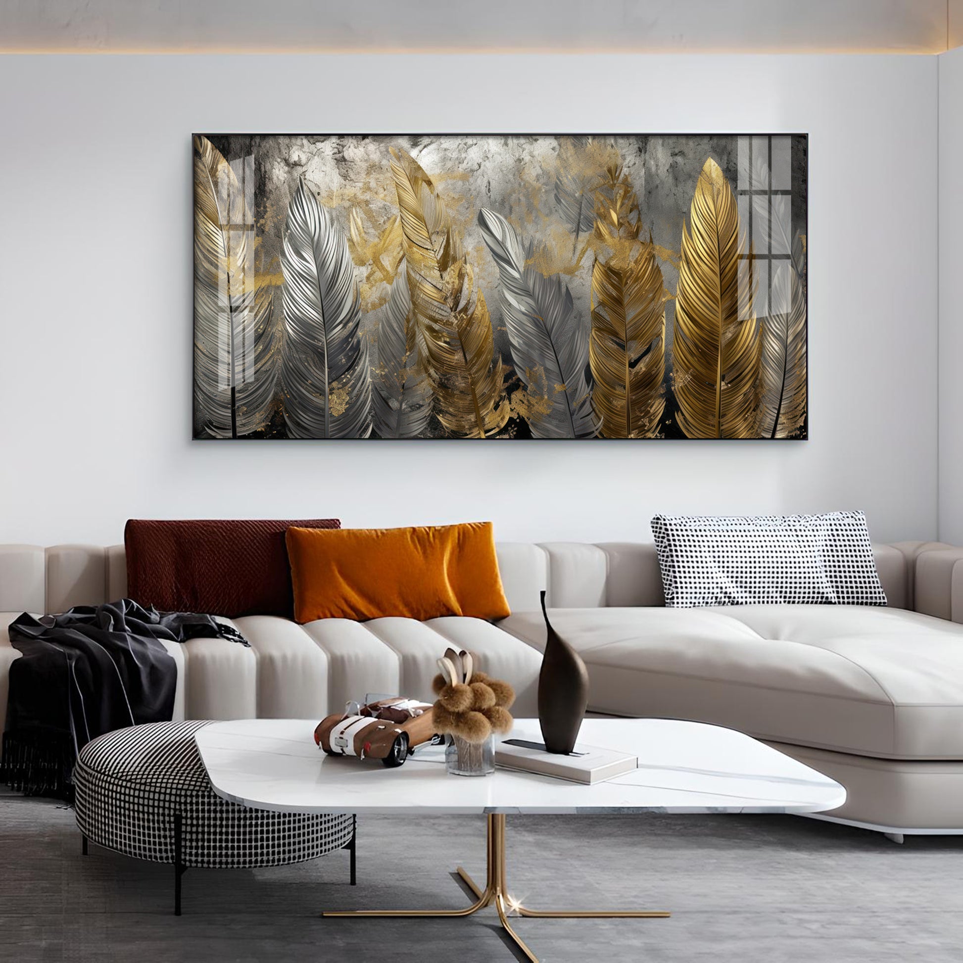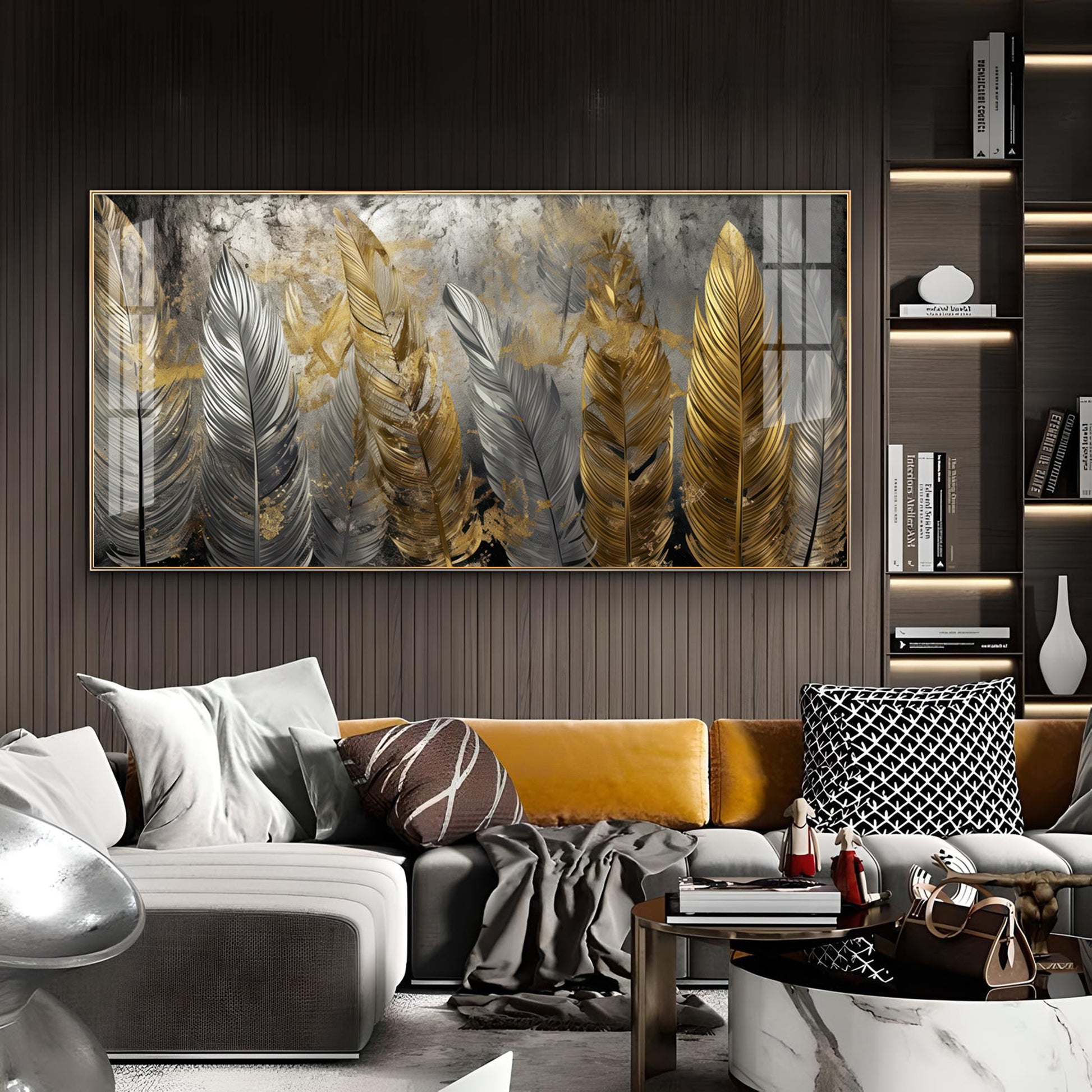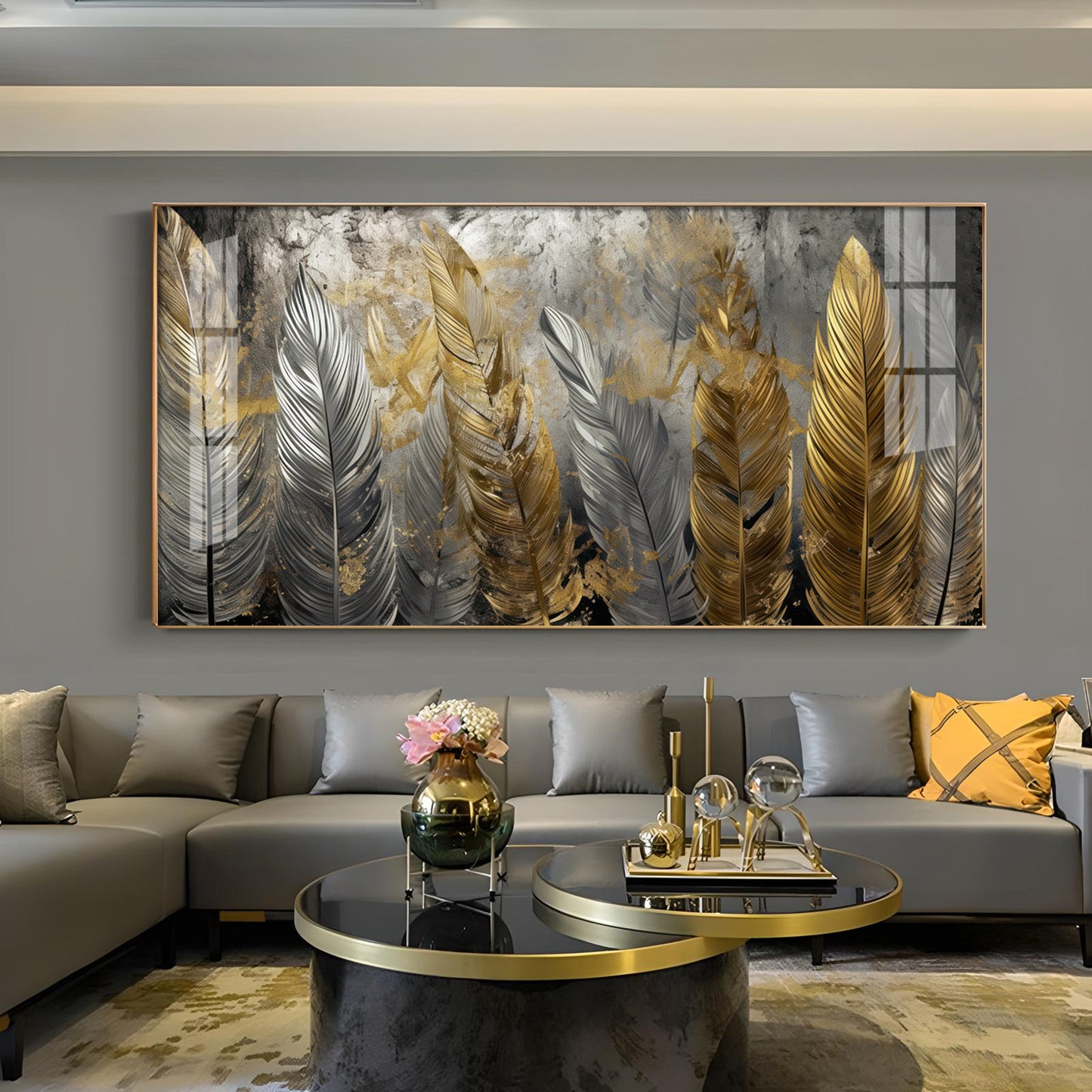 Golden And Silver Feather Glass Finish Horizontal Wall Art