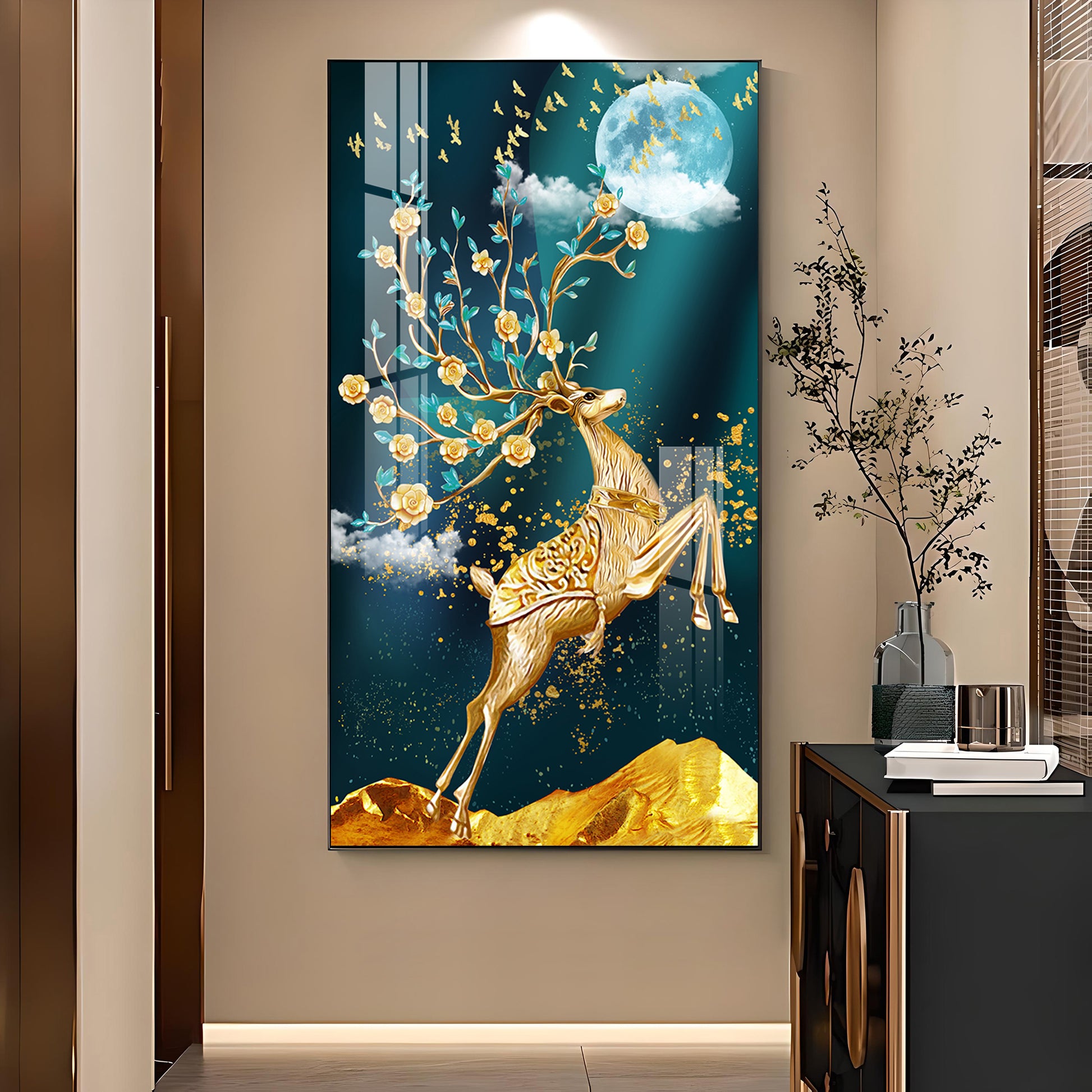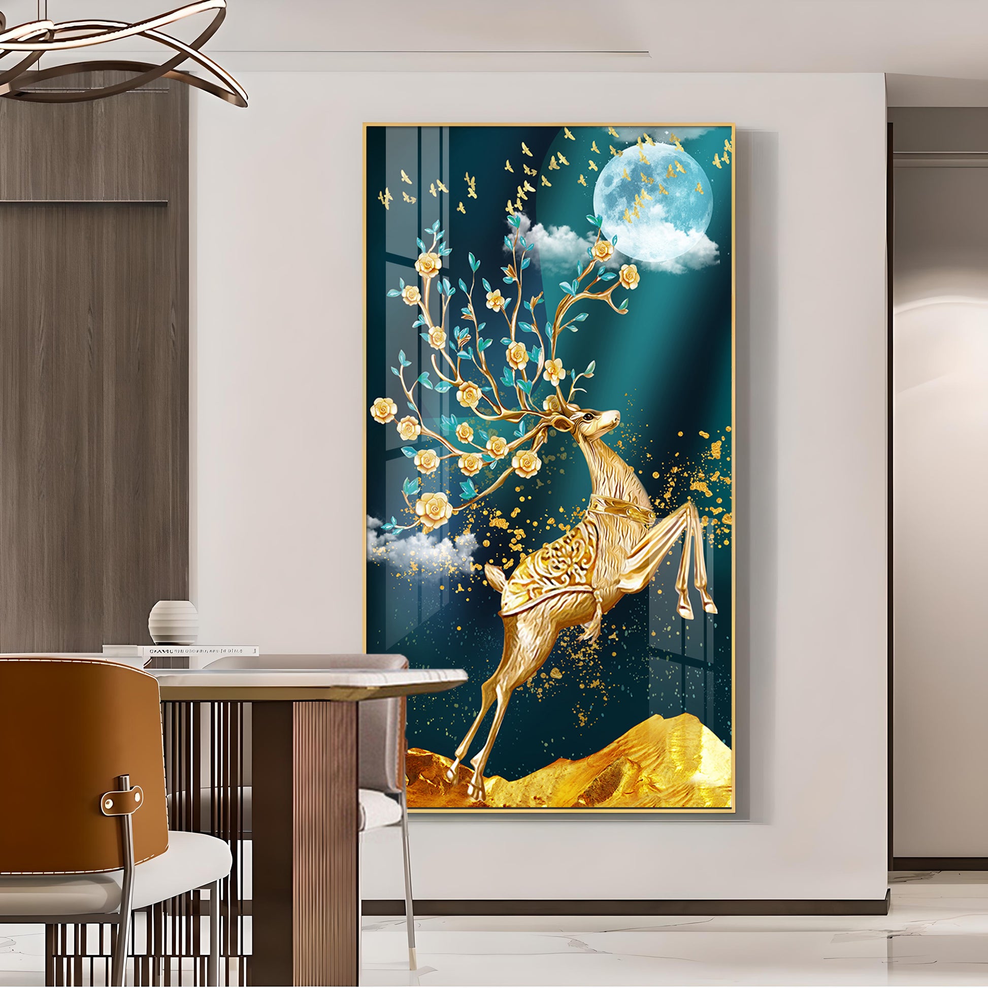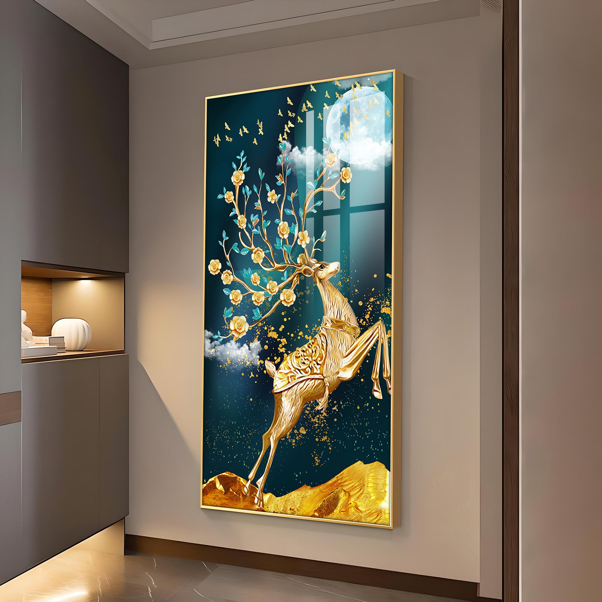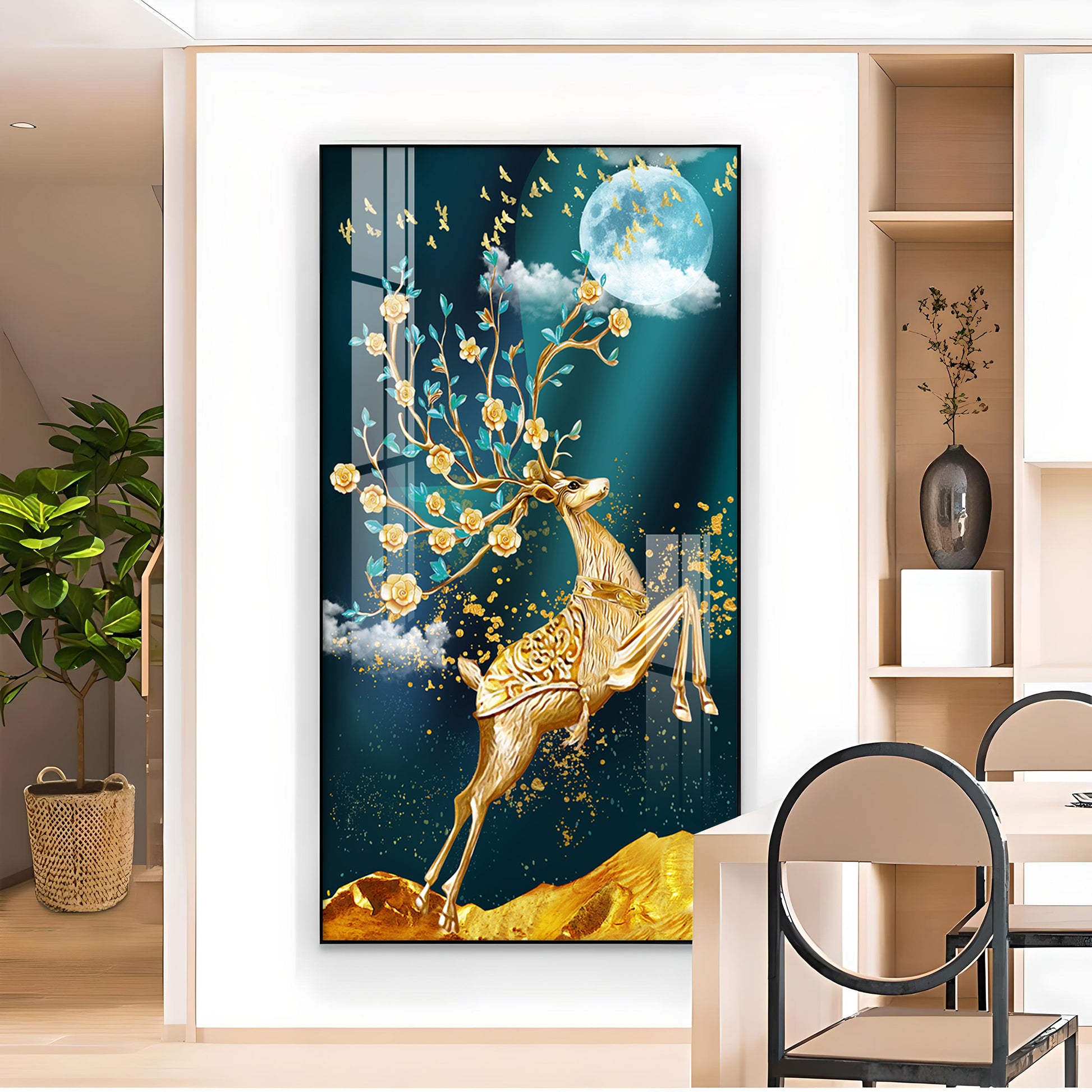 Golden Antlers and Blossoms Glass Finish Vertical Wall Art