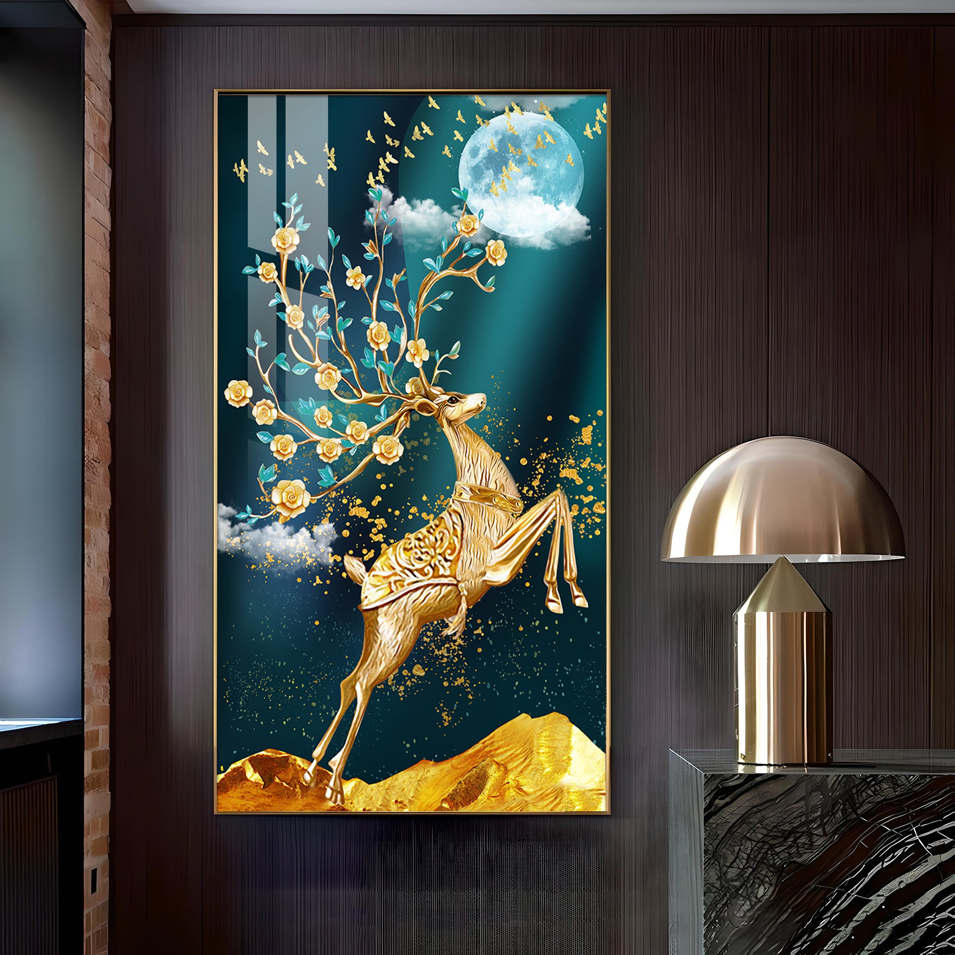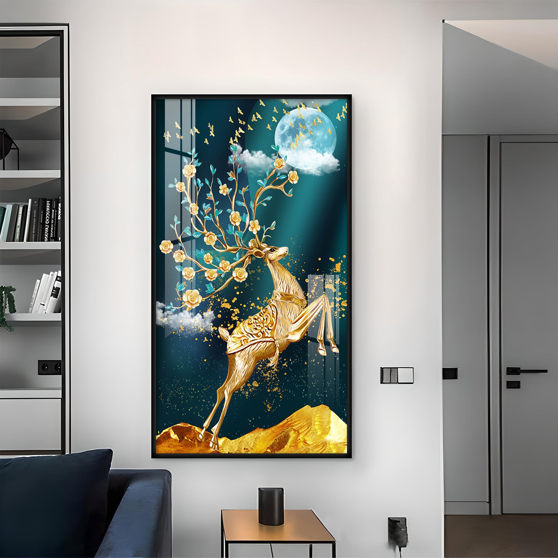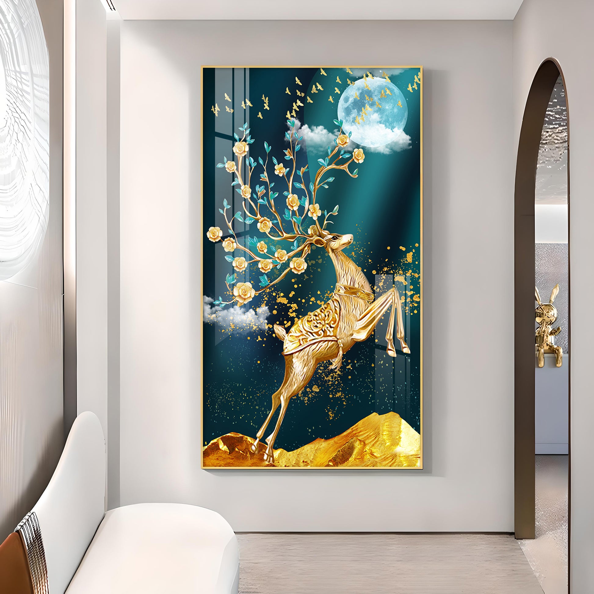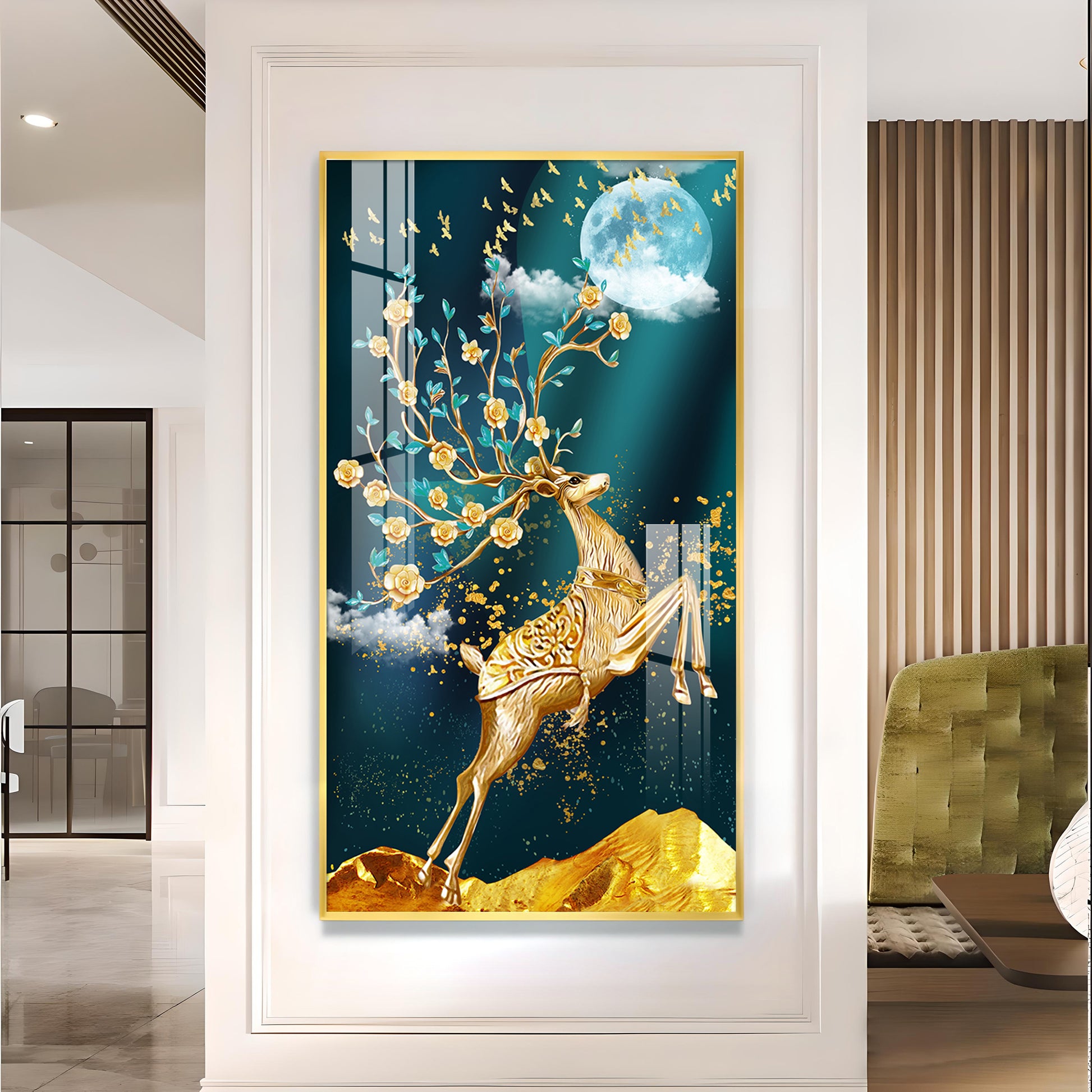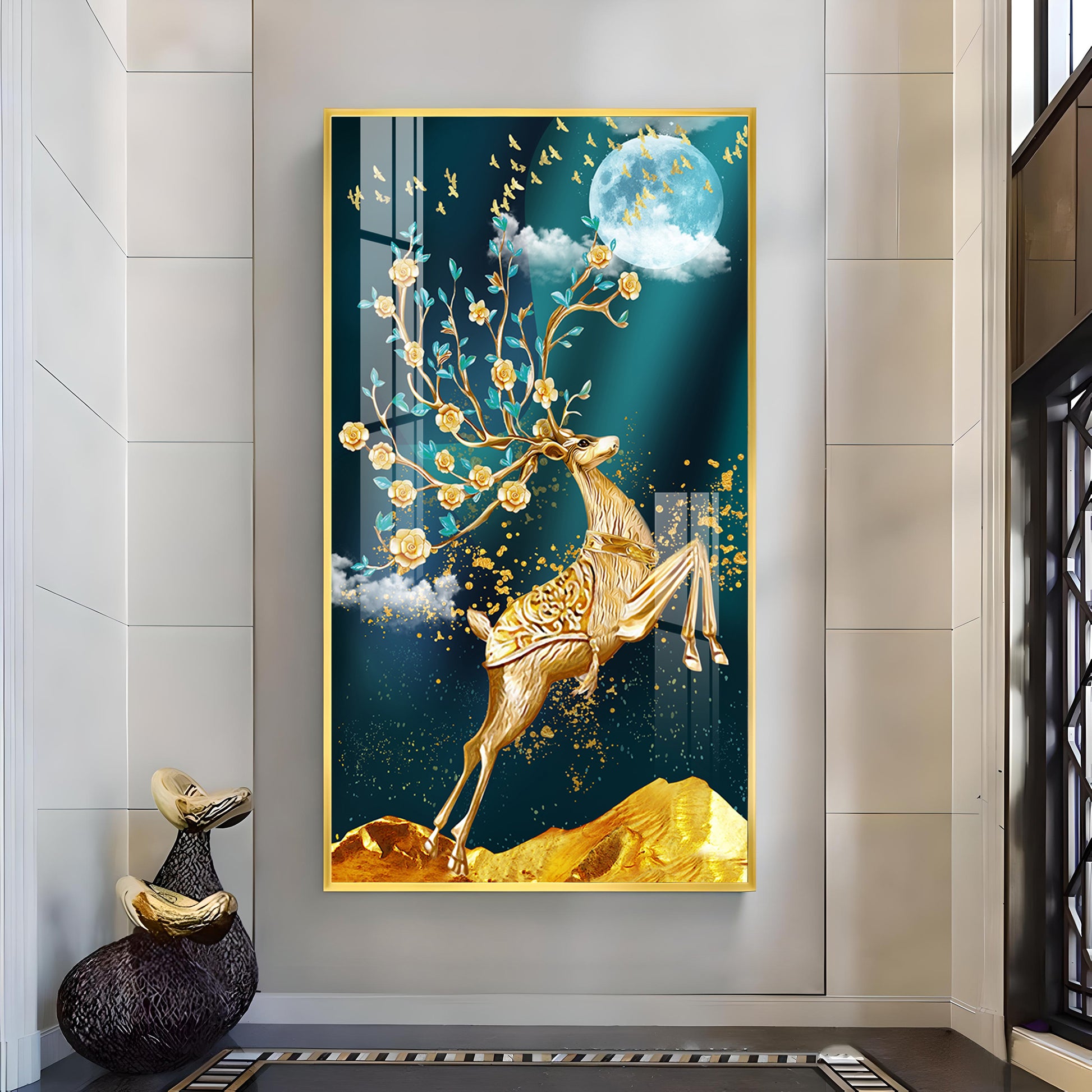 Golden Antlers and Blossoms Glass Finish Vertical Wall Art