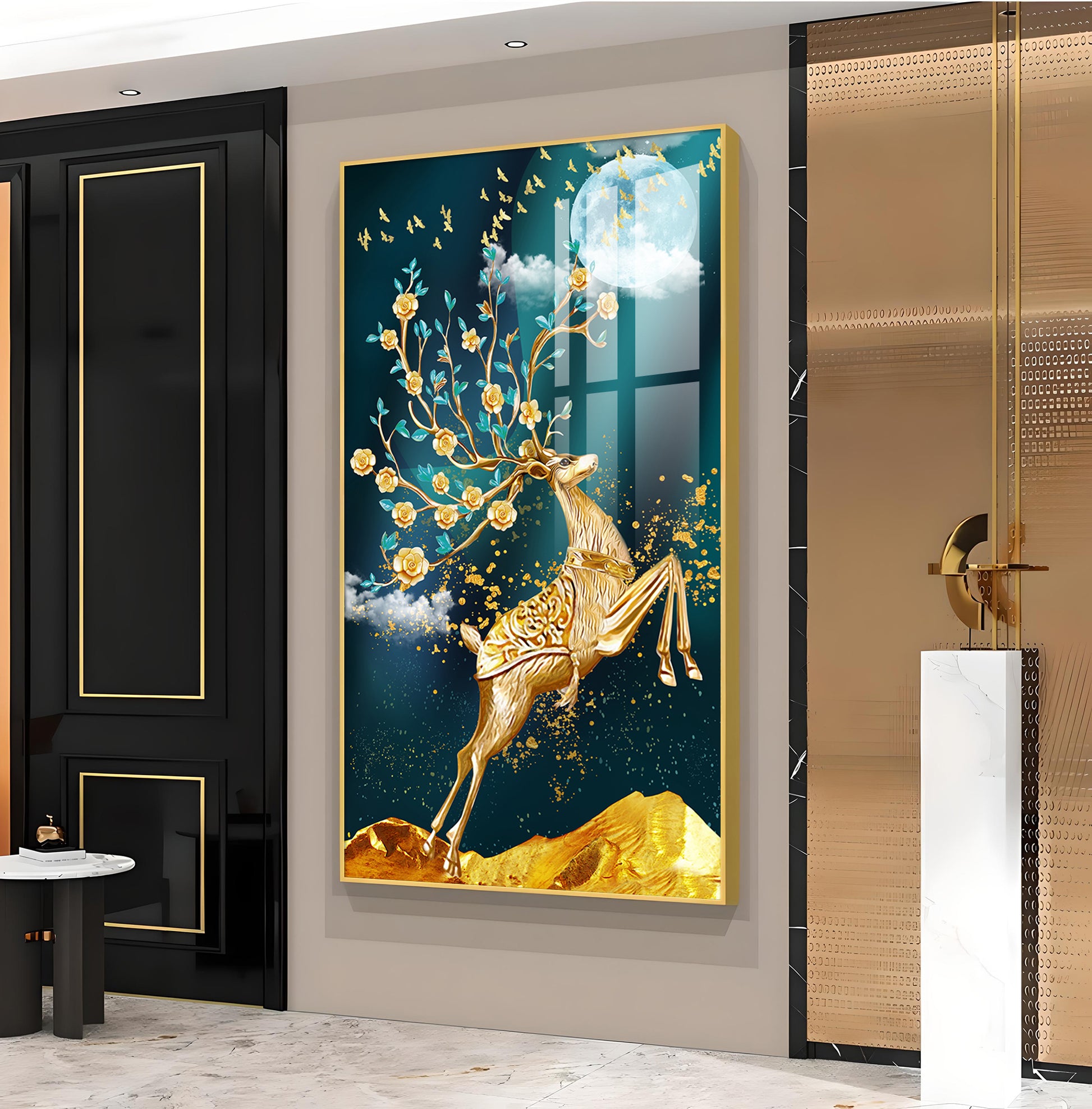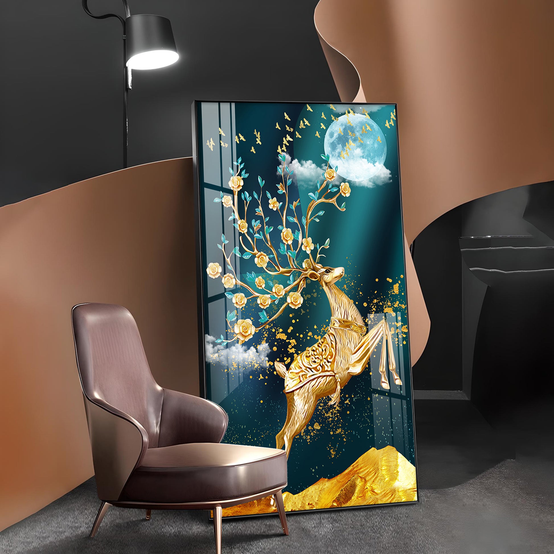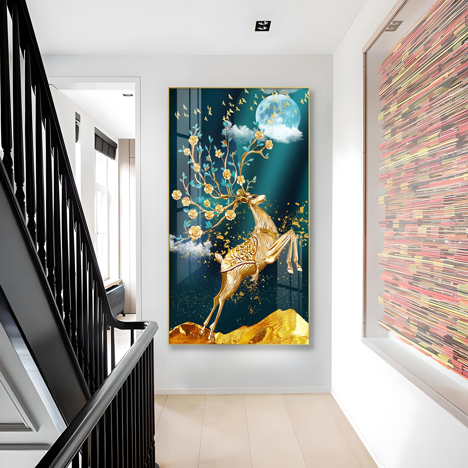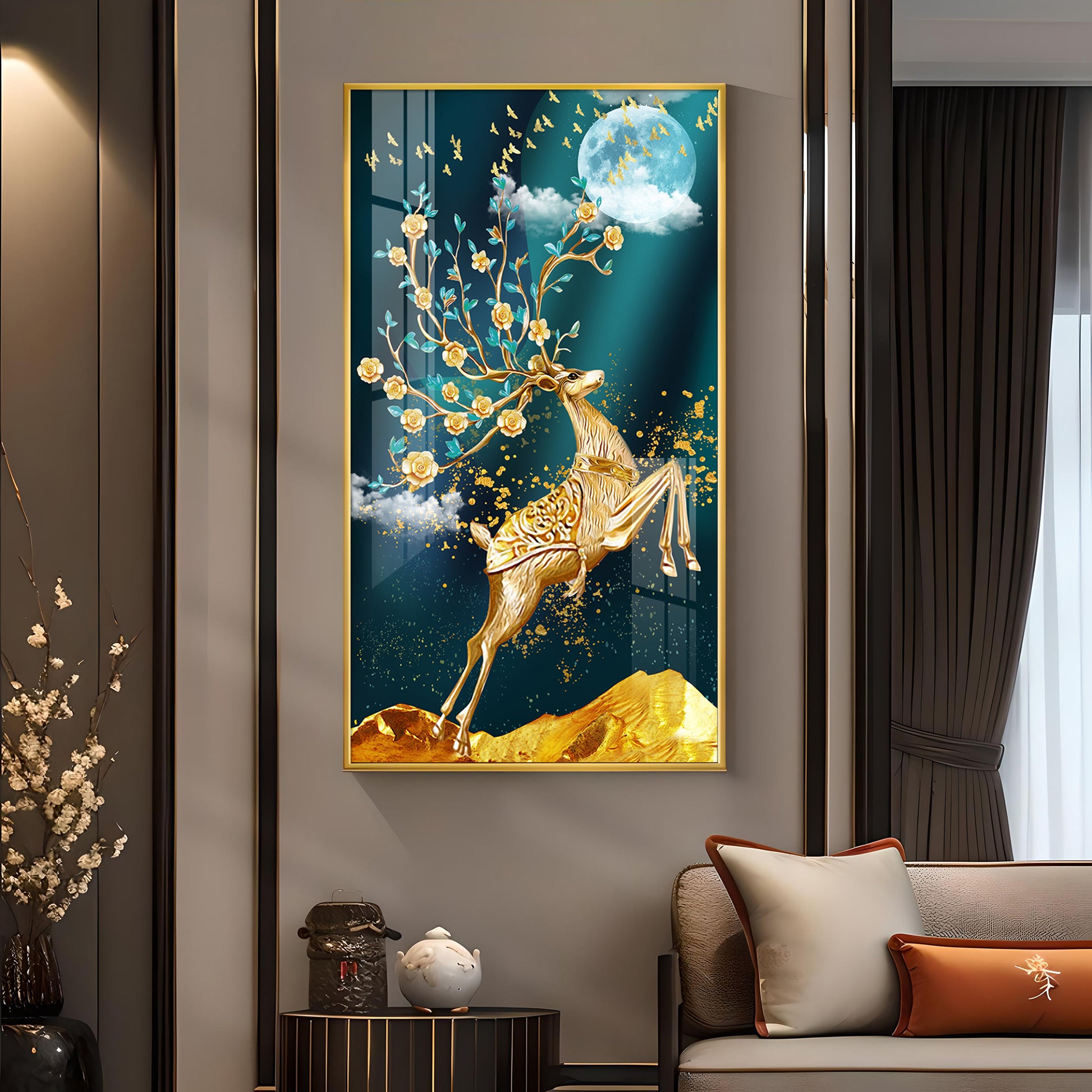 Golden Antlers and Blossoms Glass Finish Vertical Wall Art