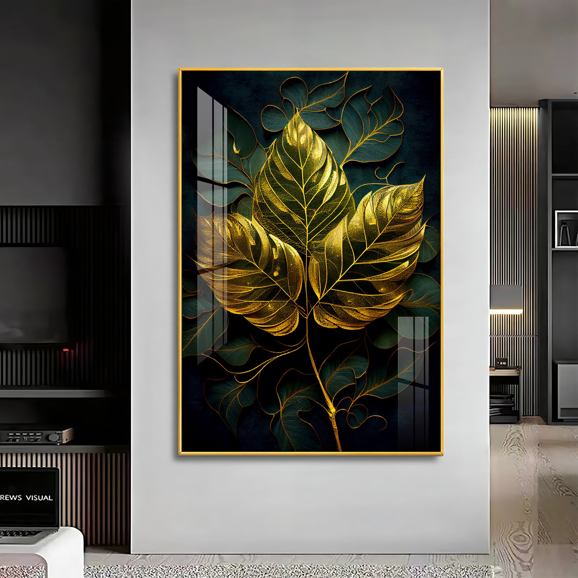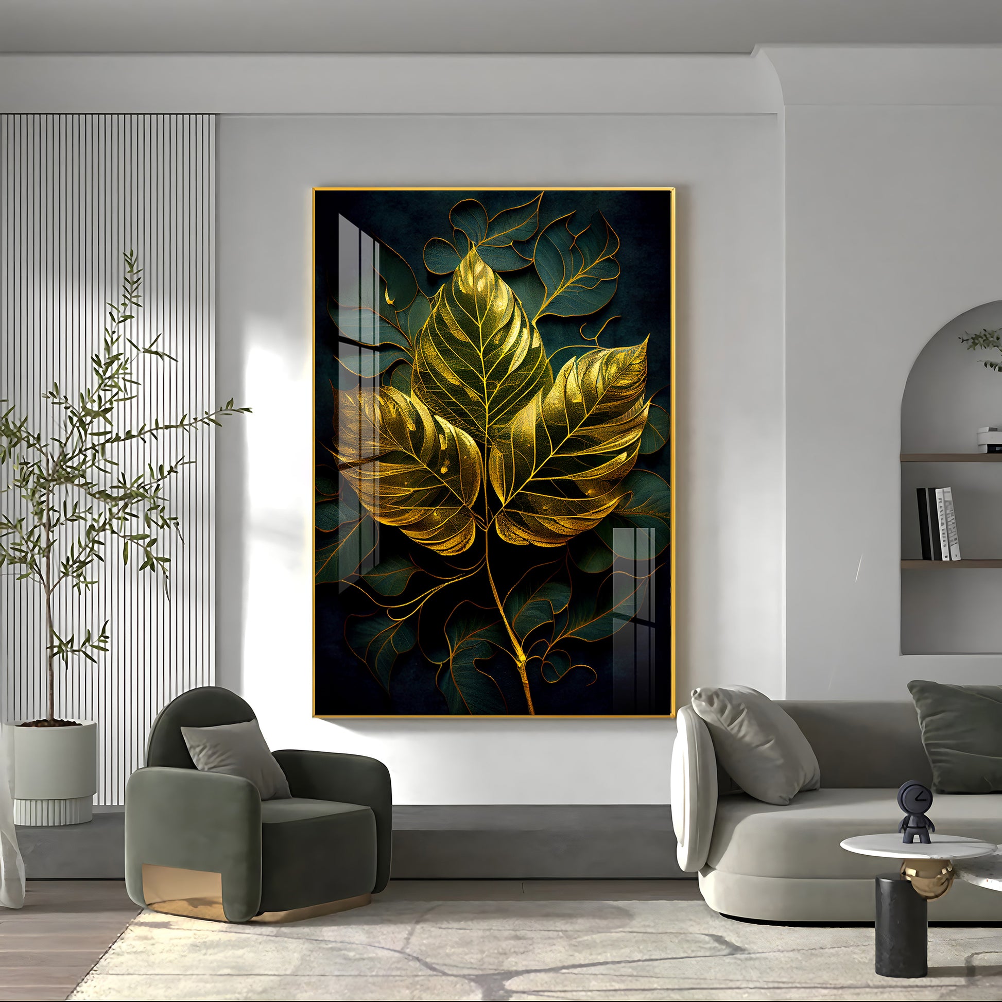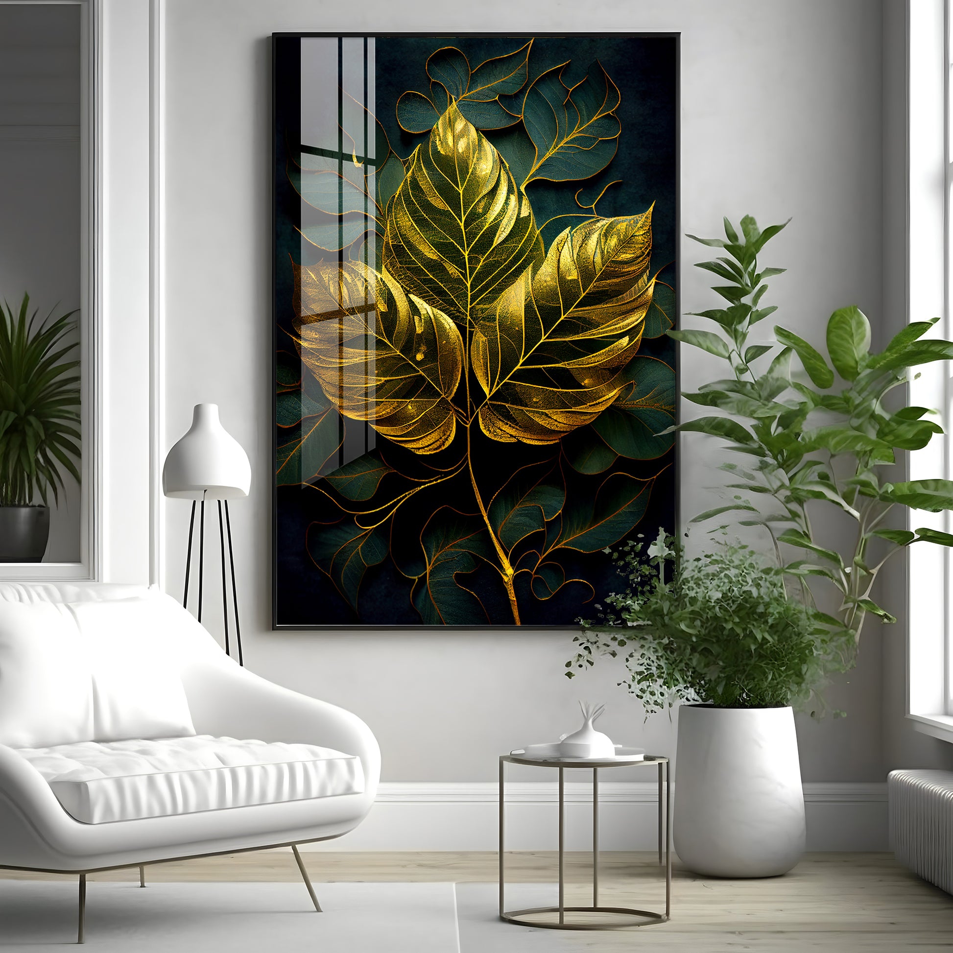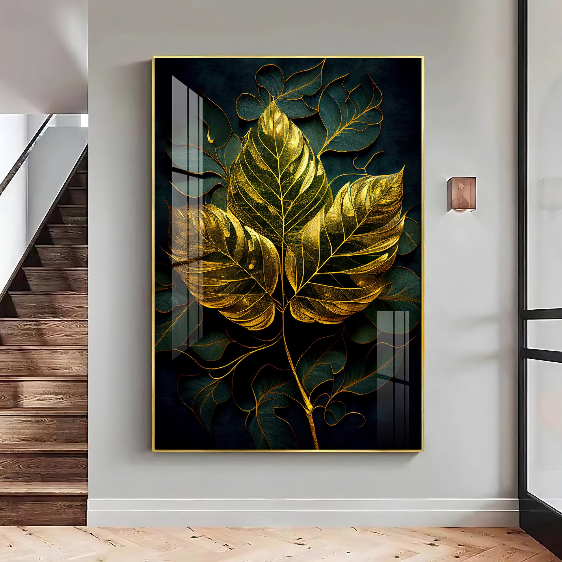 Golden Aura Leaf Glass Finish Vertical Wall Art