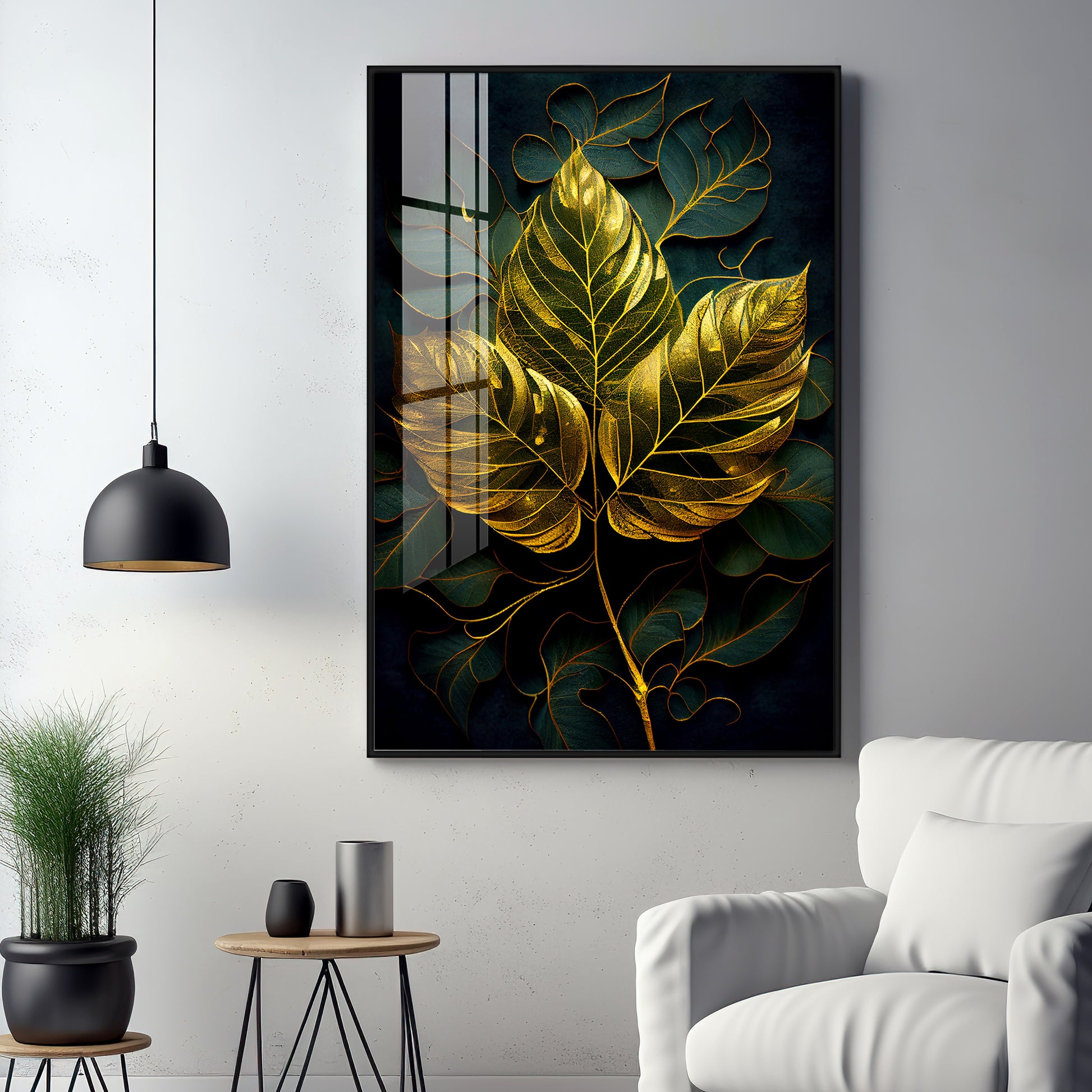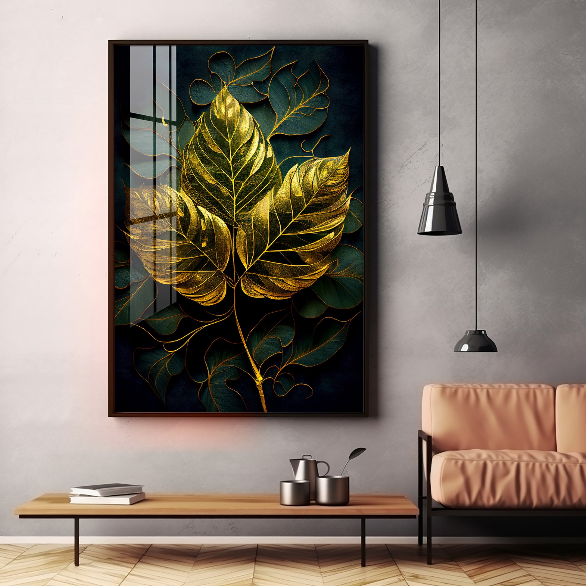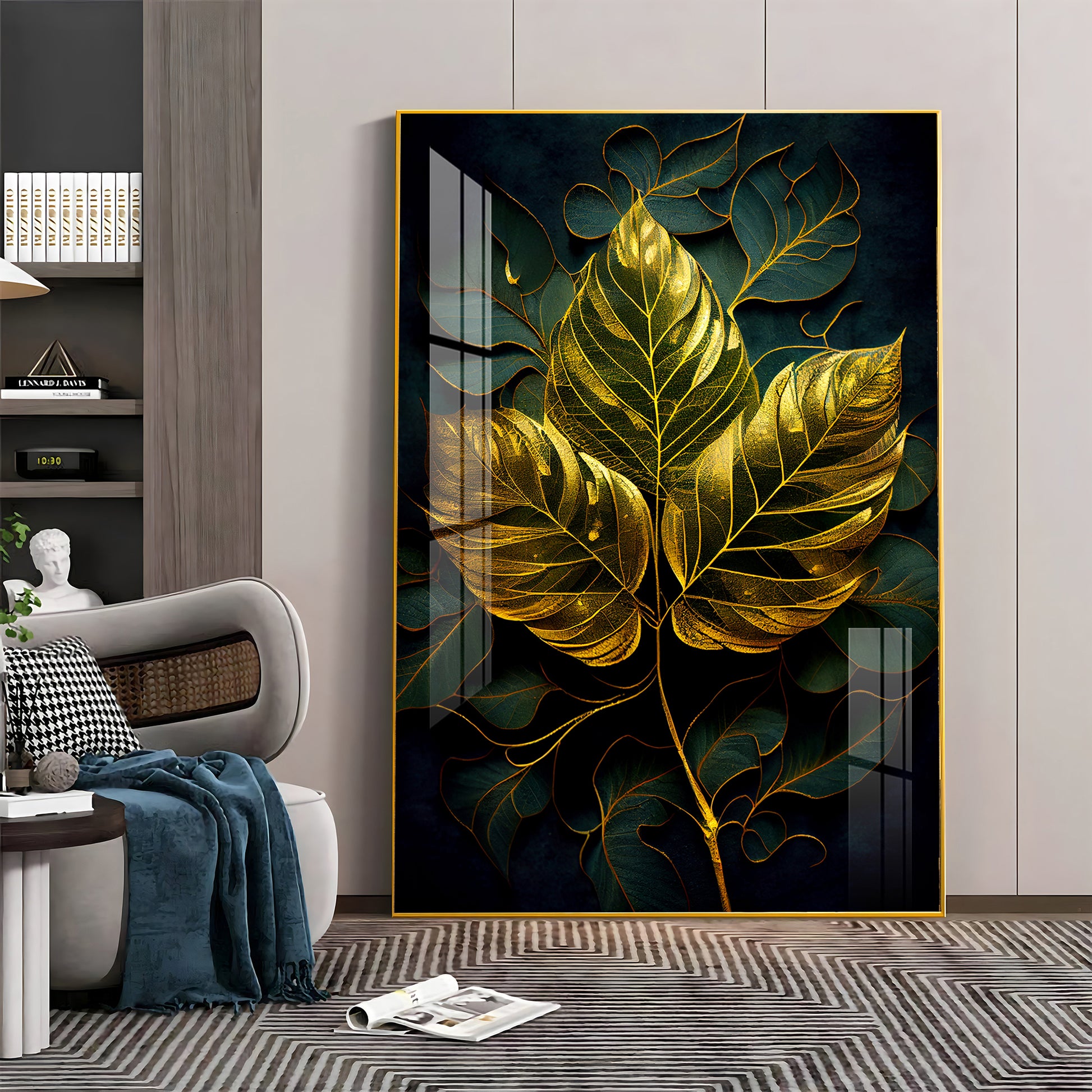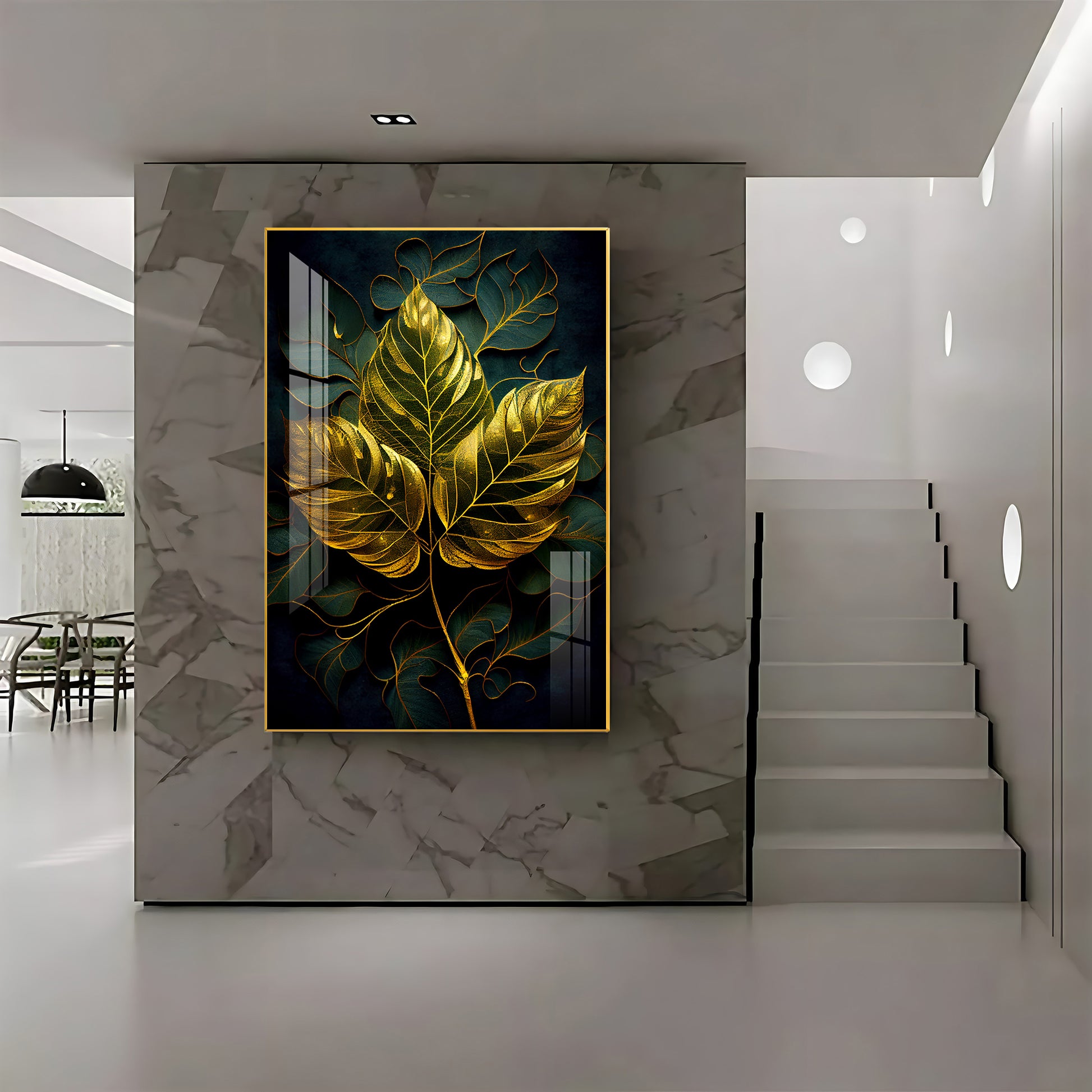 Golden Aura Leaf Glass Finish Vertical Wall Art