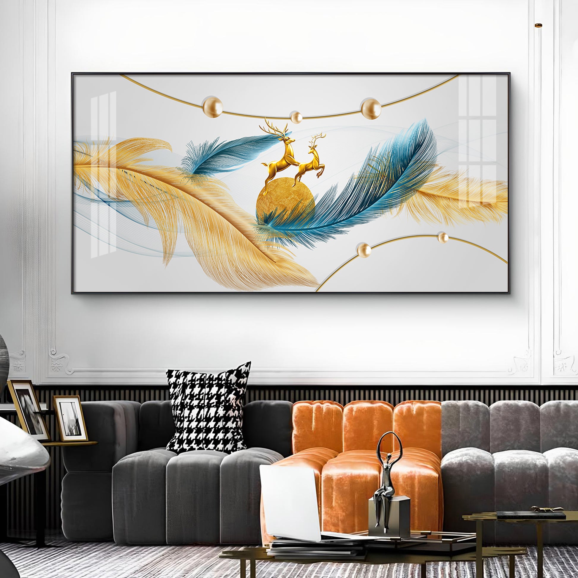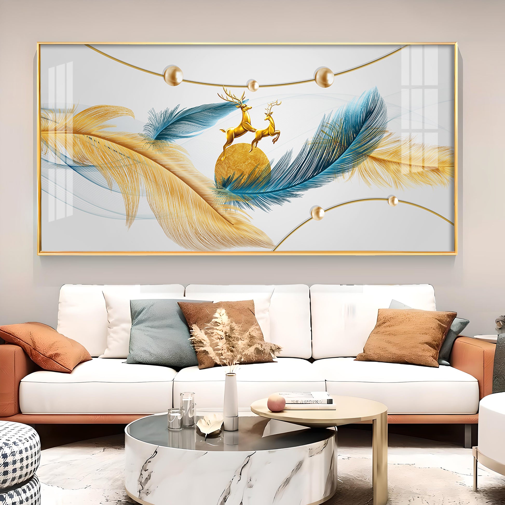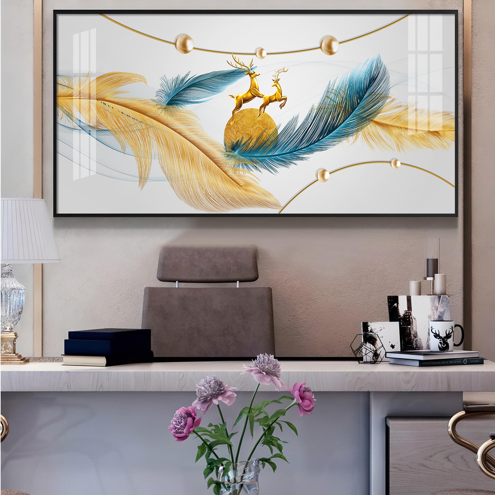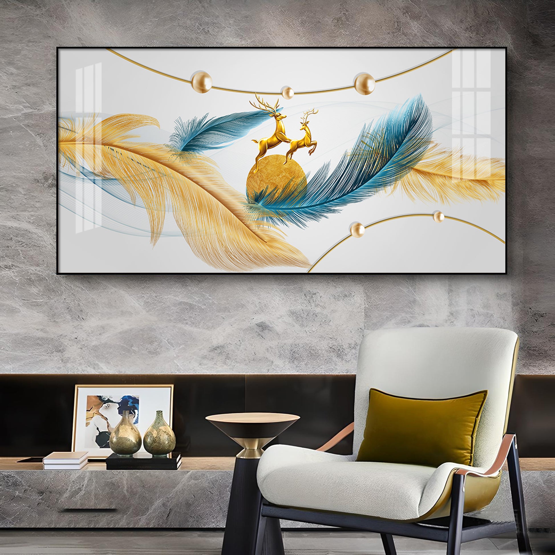 Golden Blue Feathers Glass Finish Horizontal Wall Art