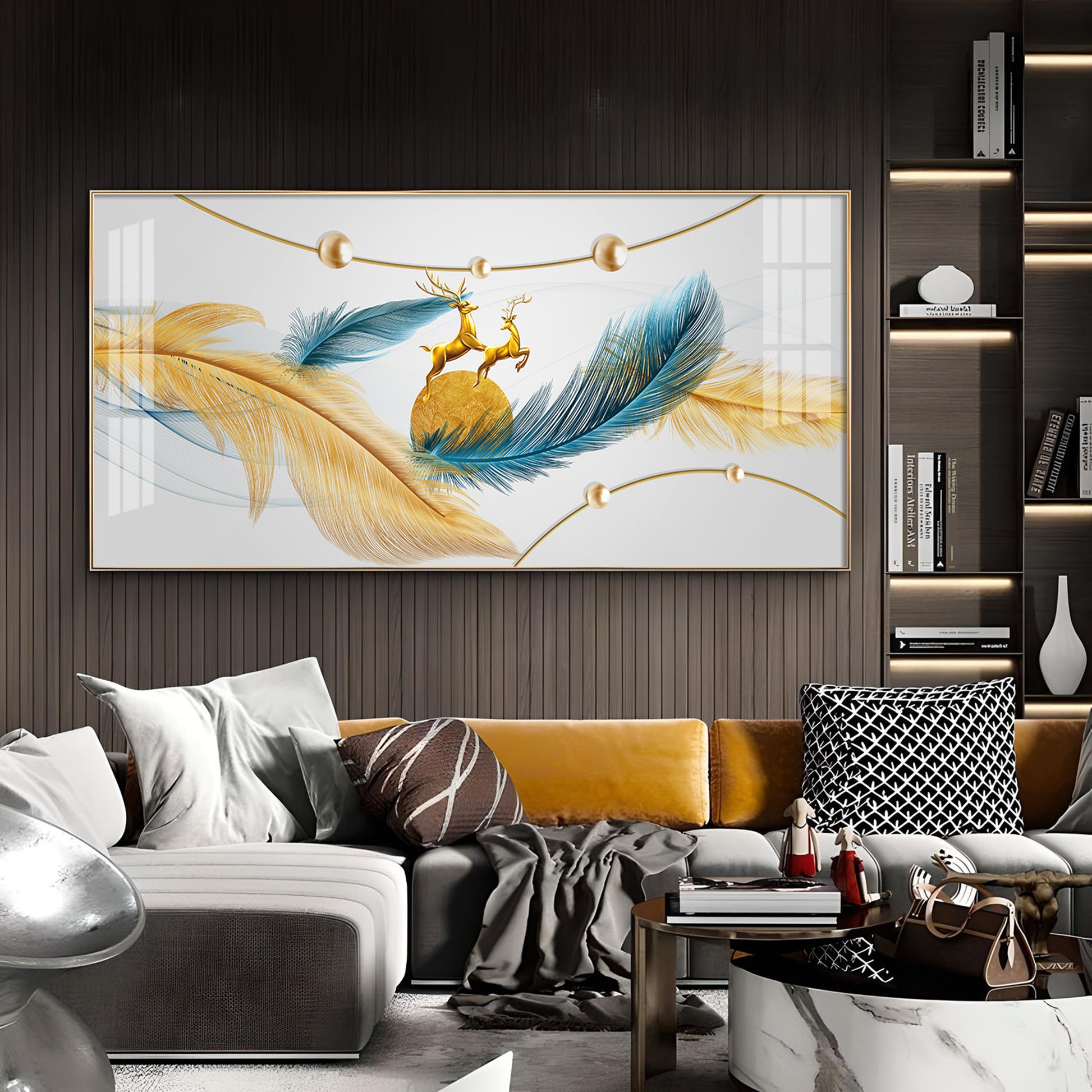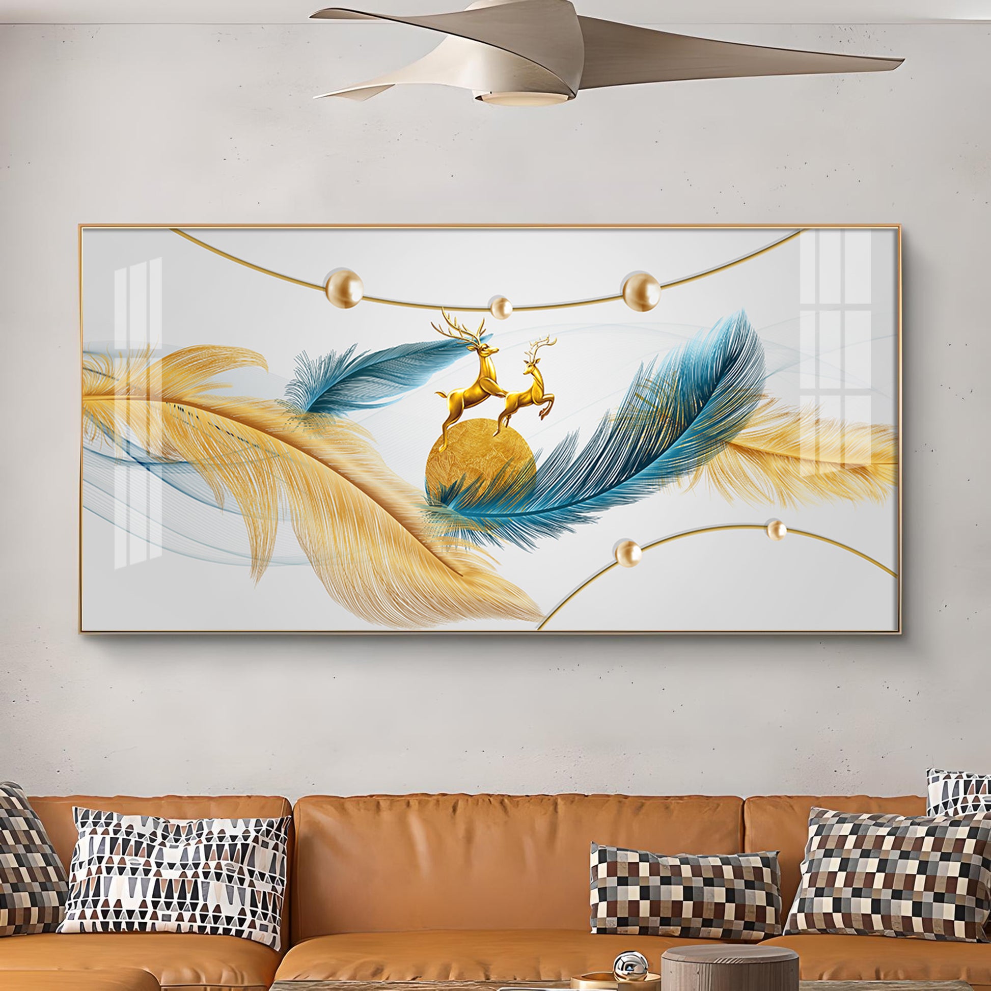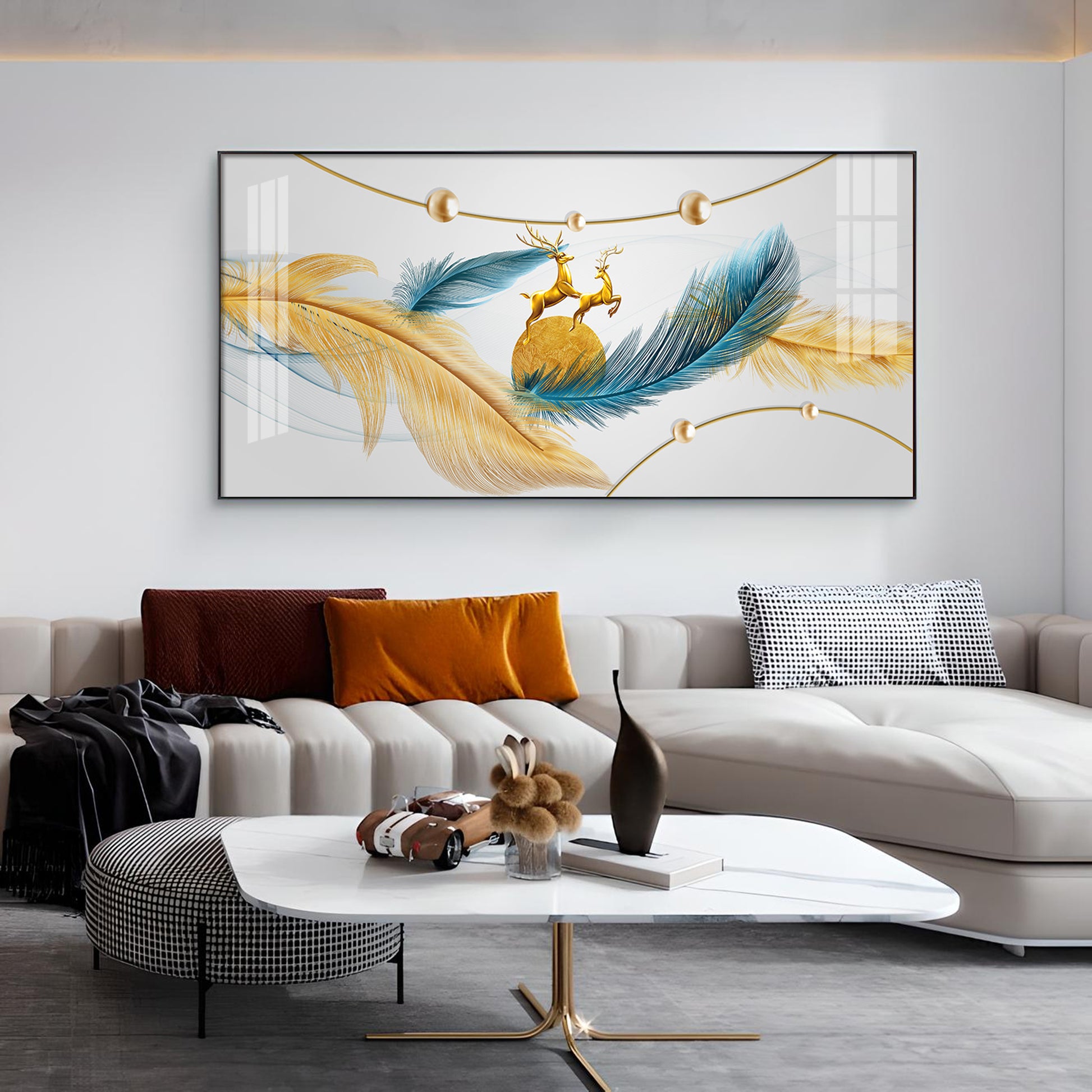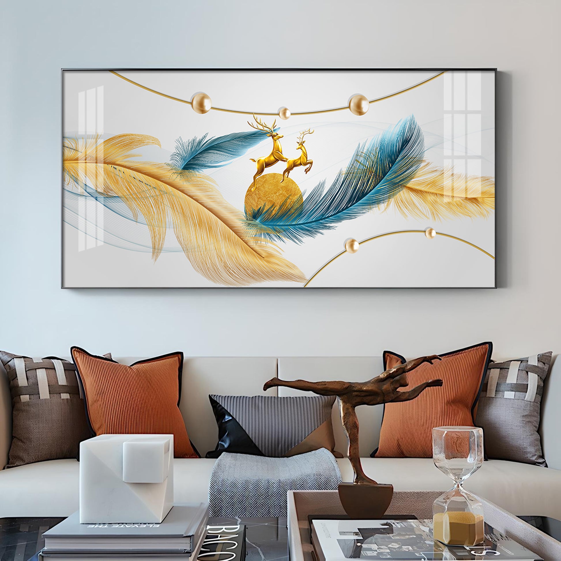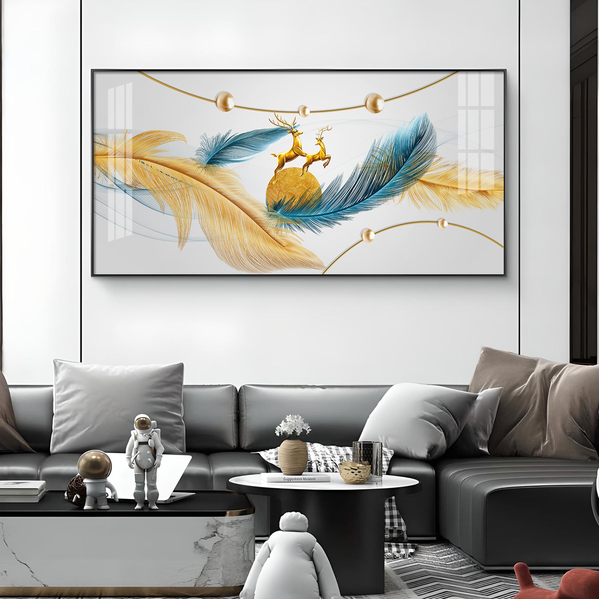 Golden Blue Feathers Glass Finish Horizontal Wall Art