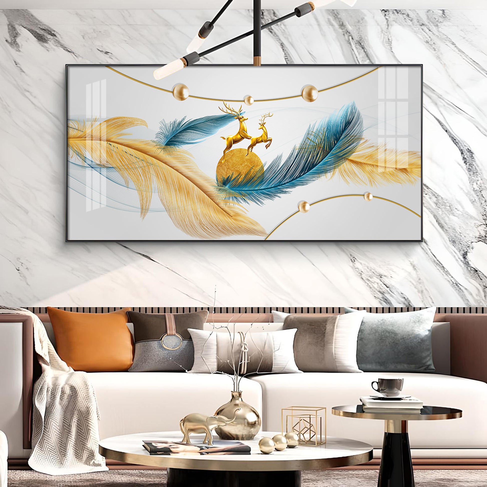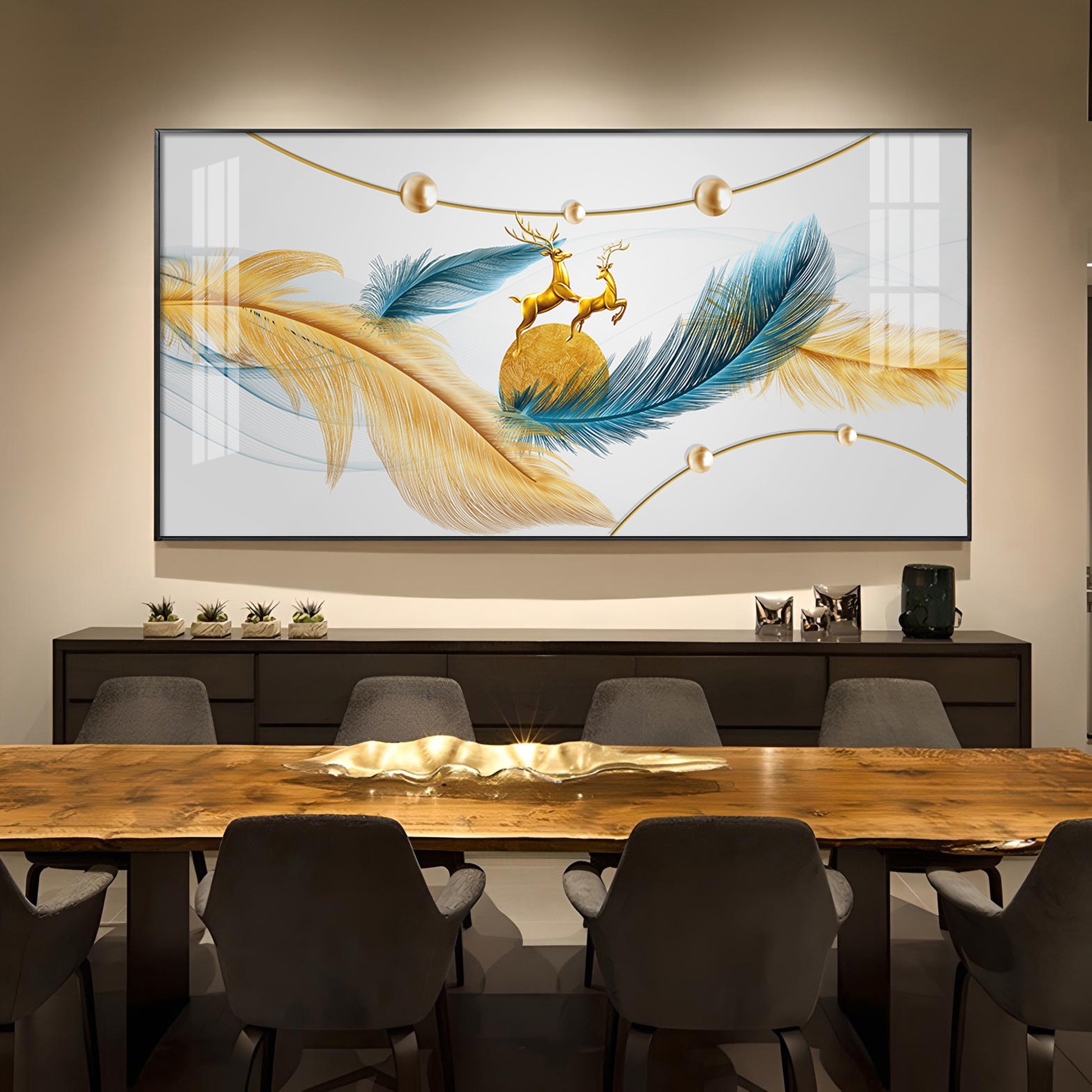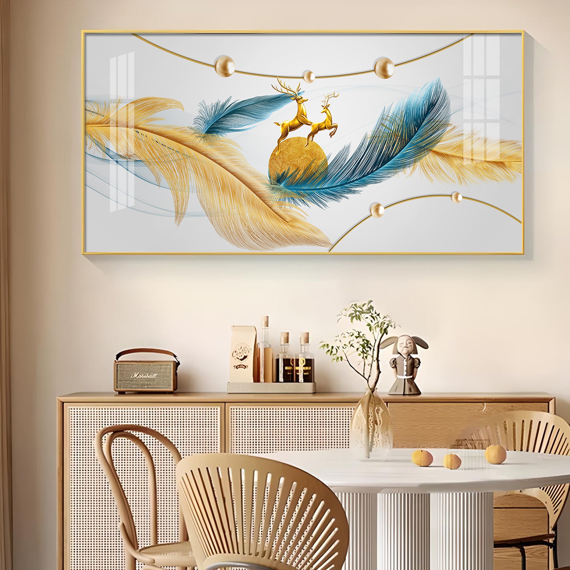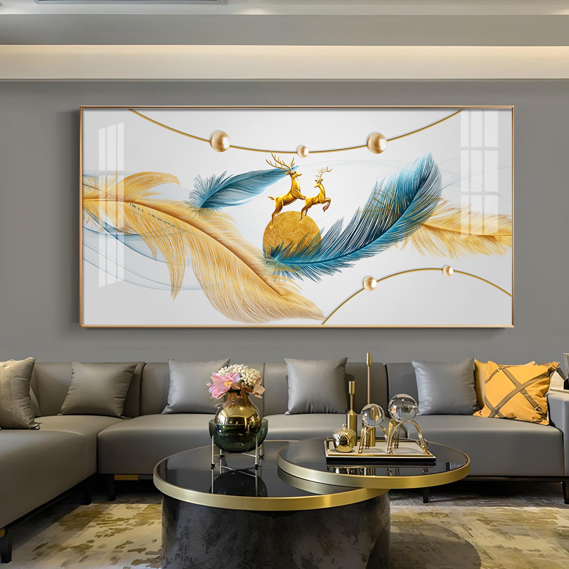Golden Blue Feathers Glass Finish Horizontal Wall Art