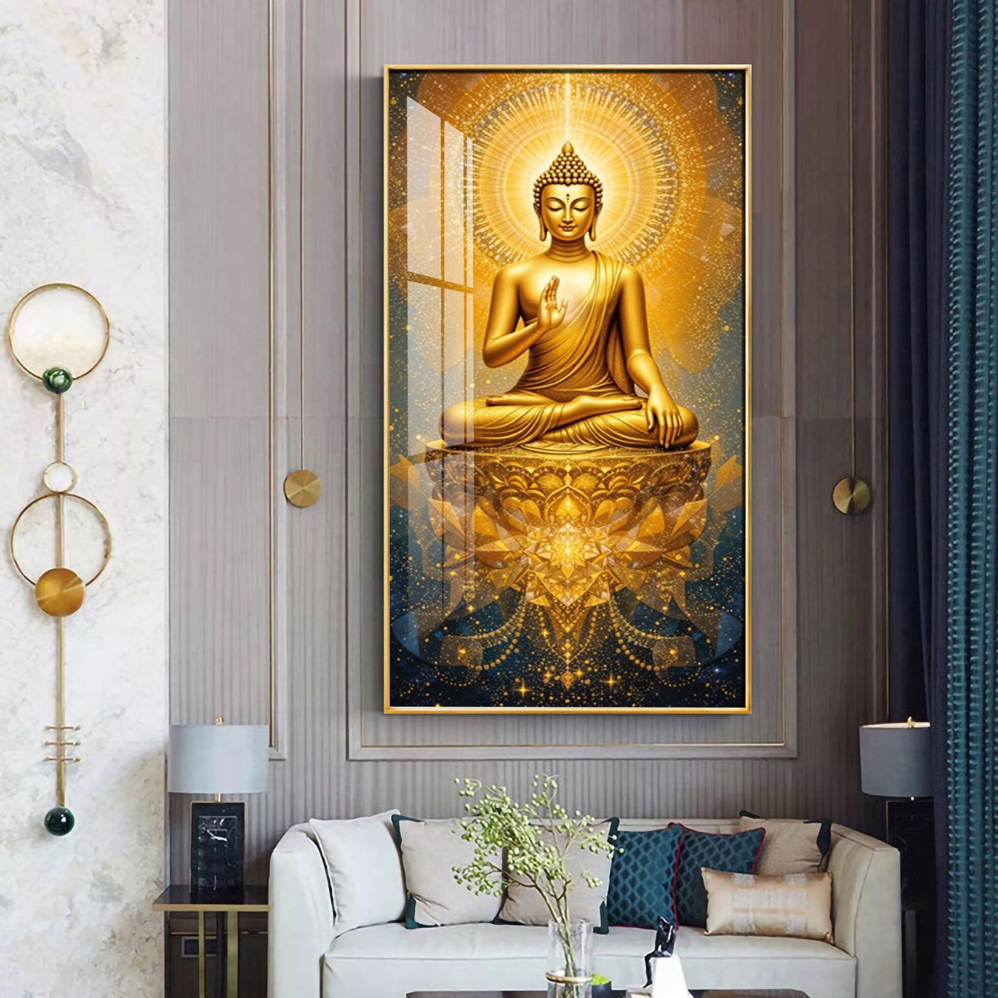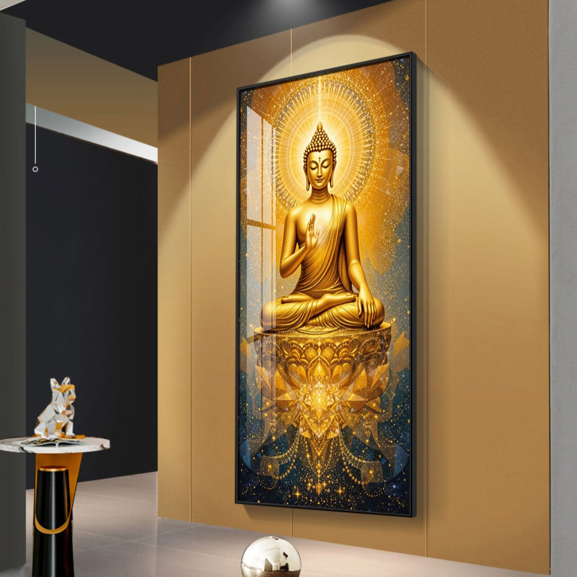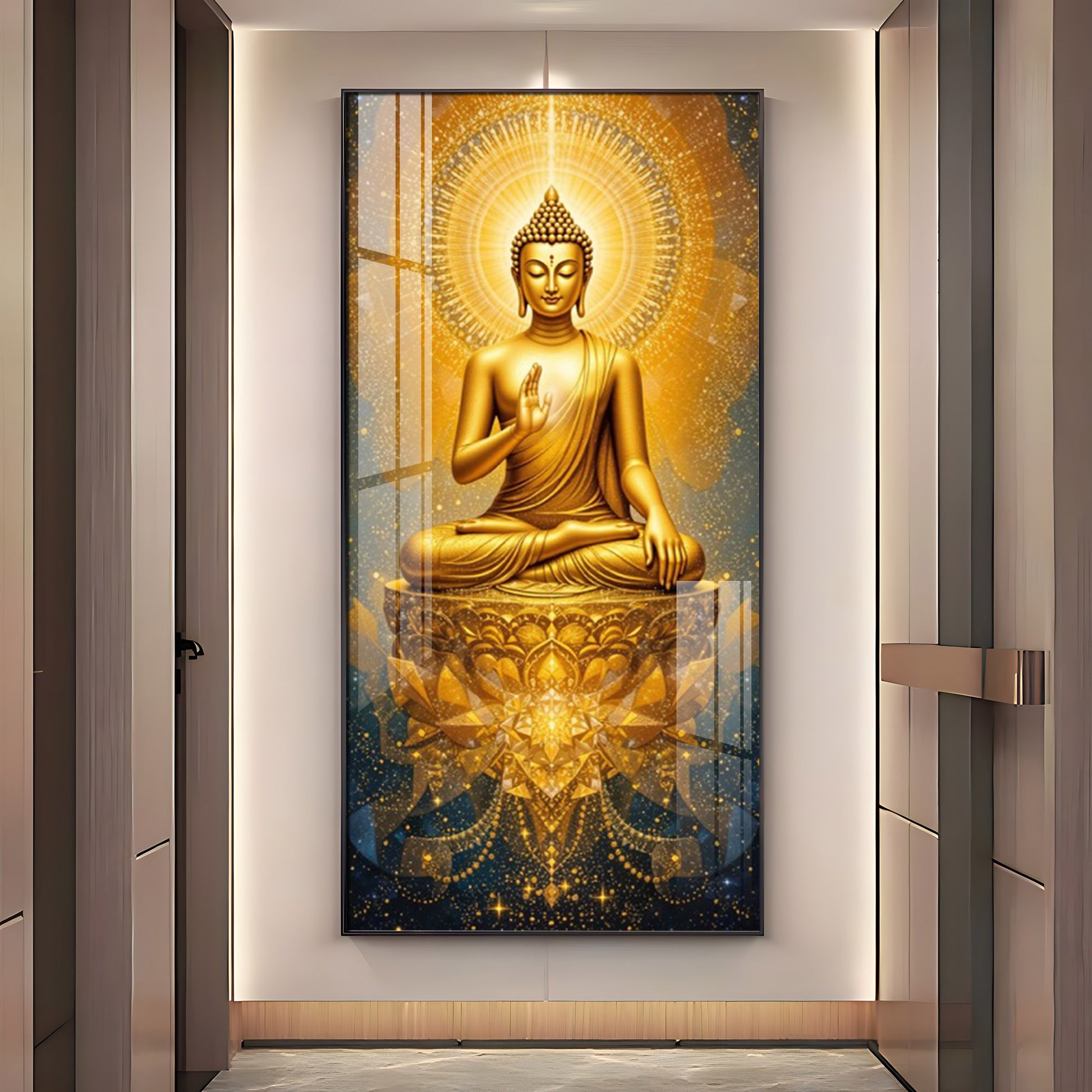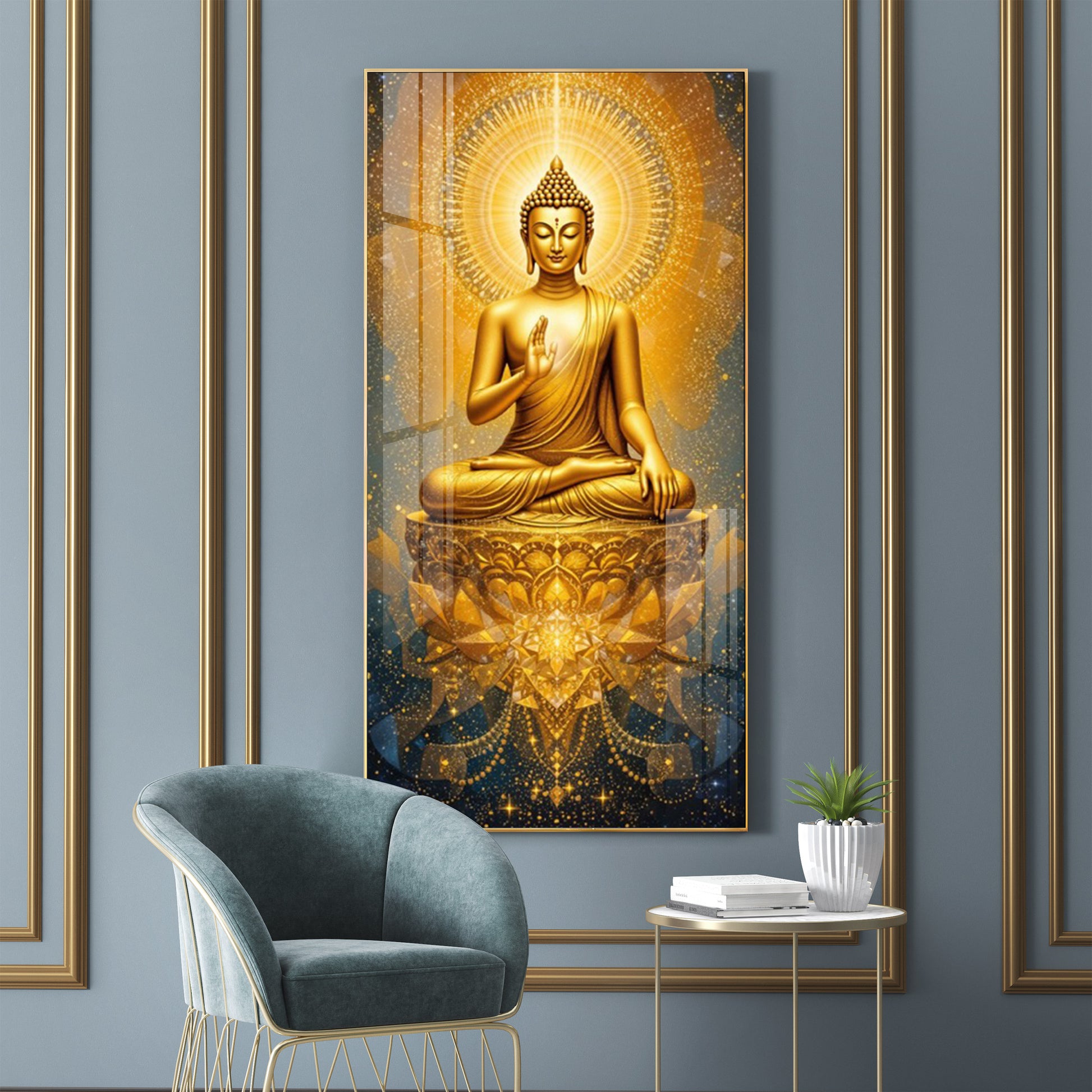 Golden Buddha's Aura Glass Finish Vertical Wall Art