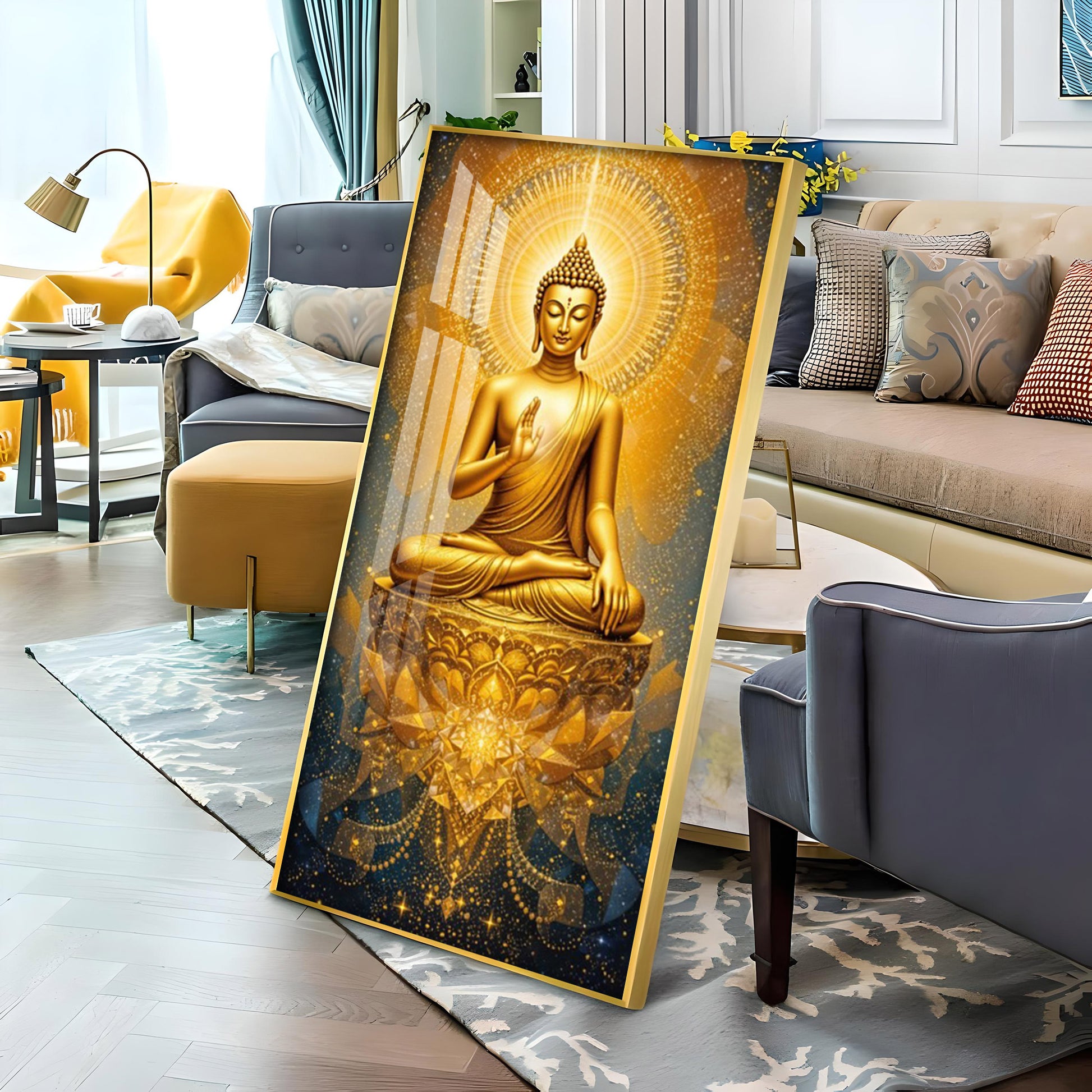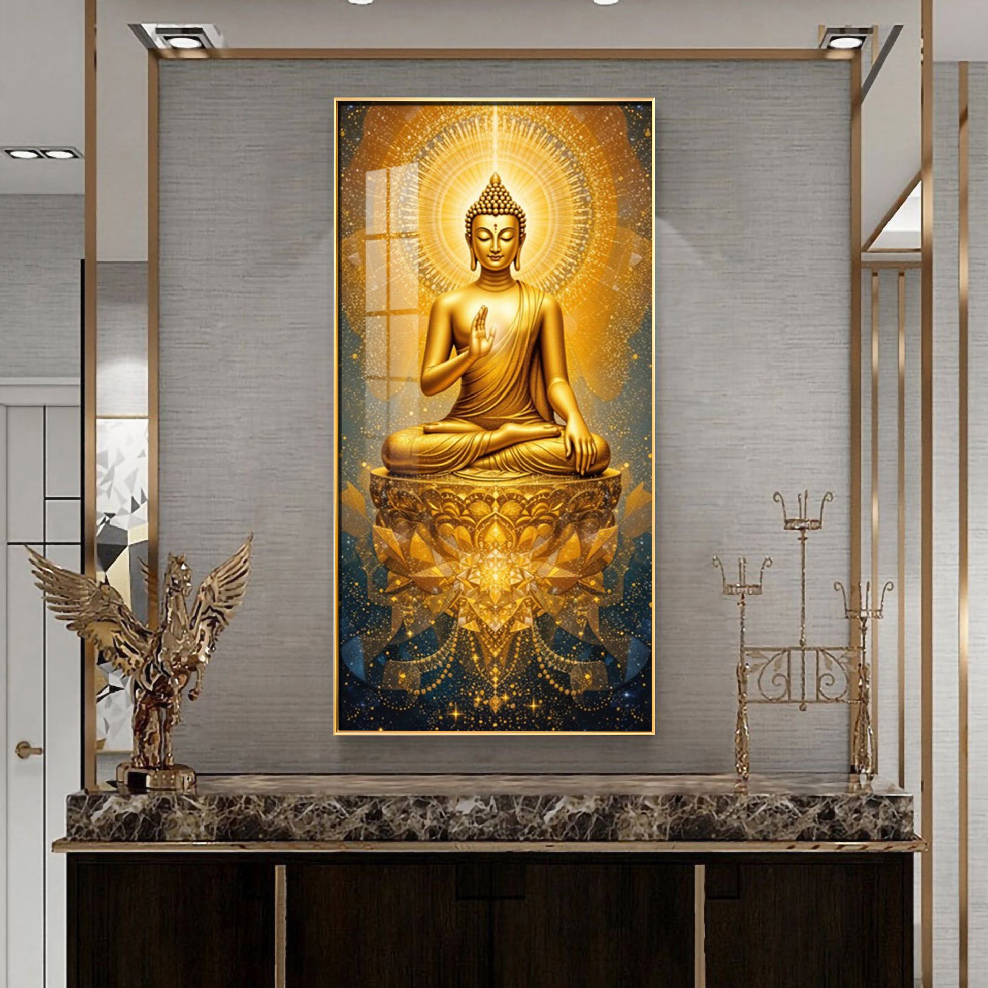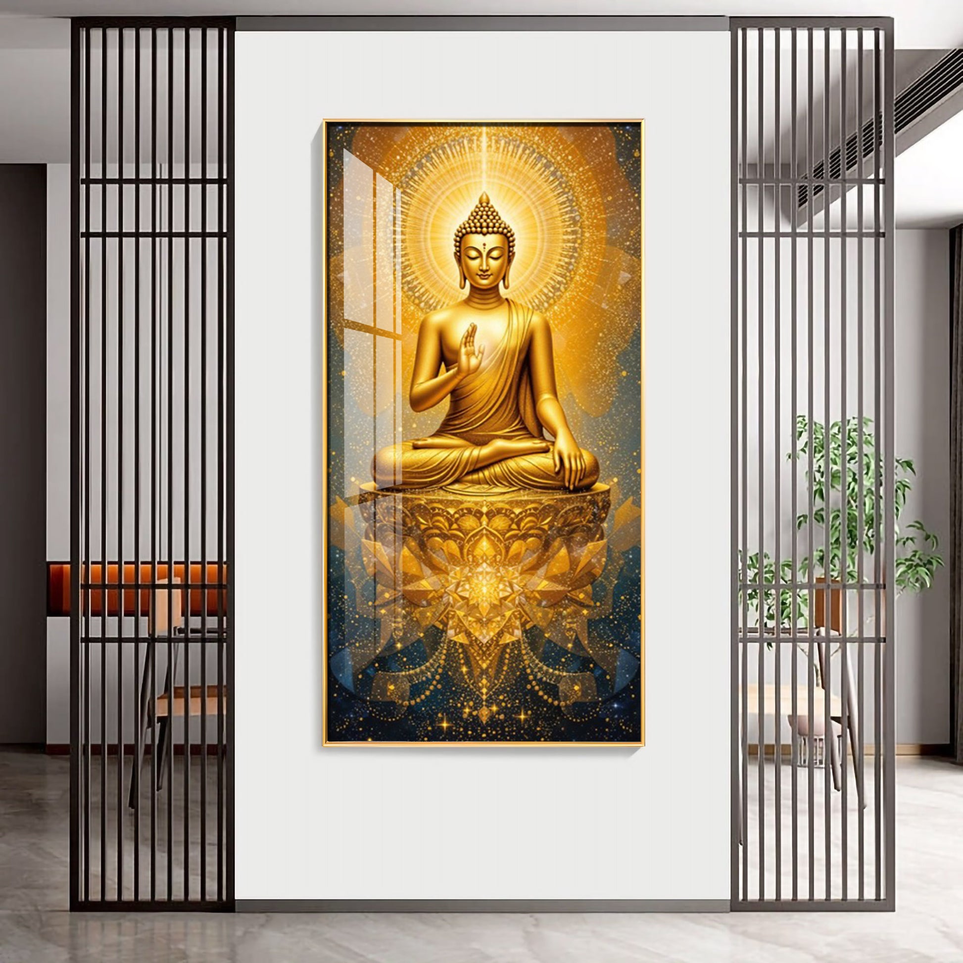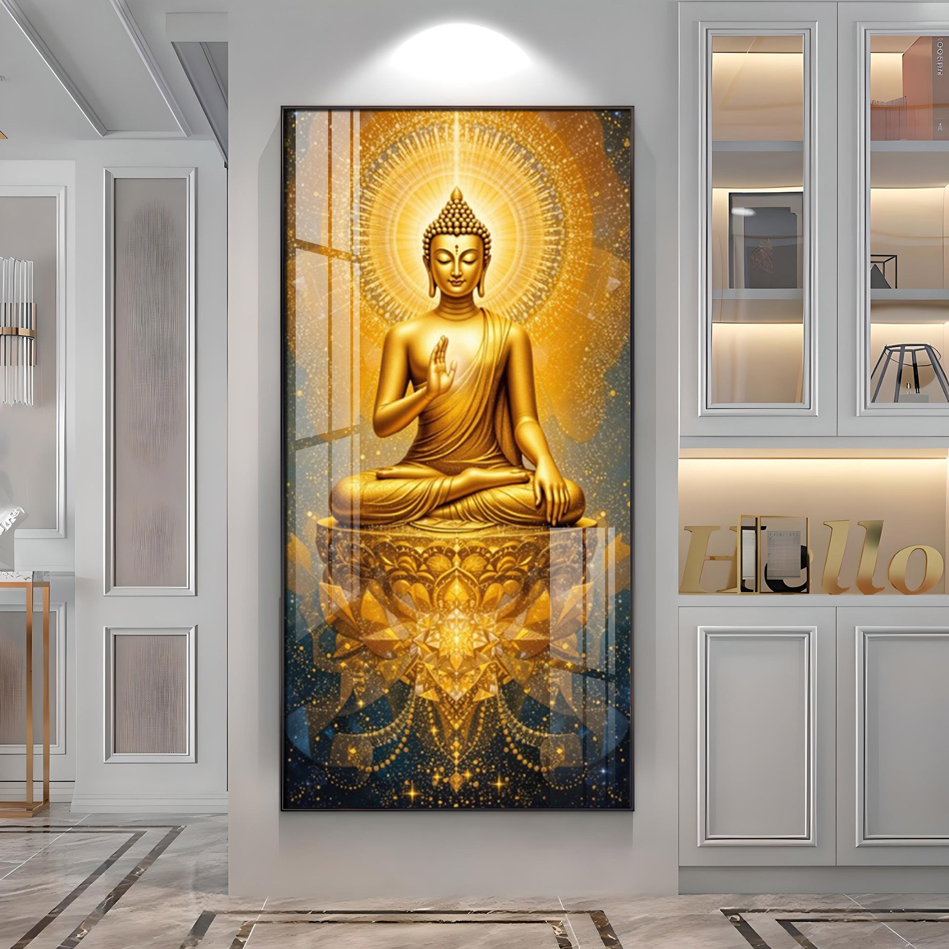 Golden Buddha's Aura Glass Finish Vertical Wall Art