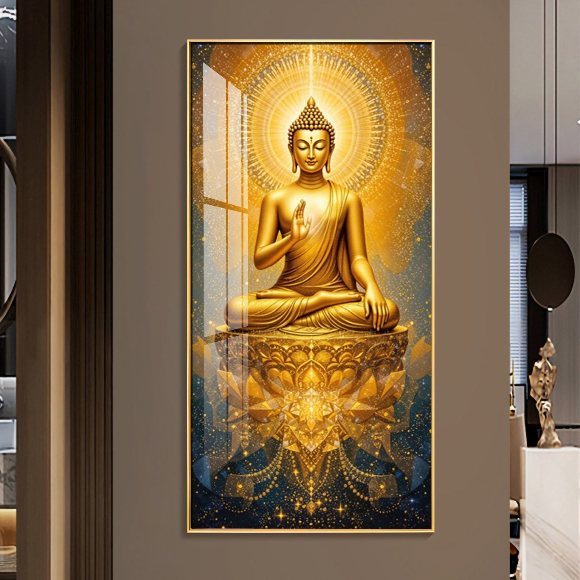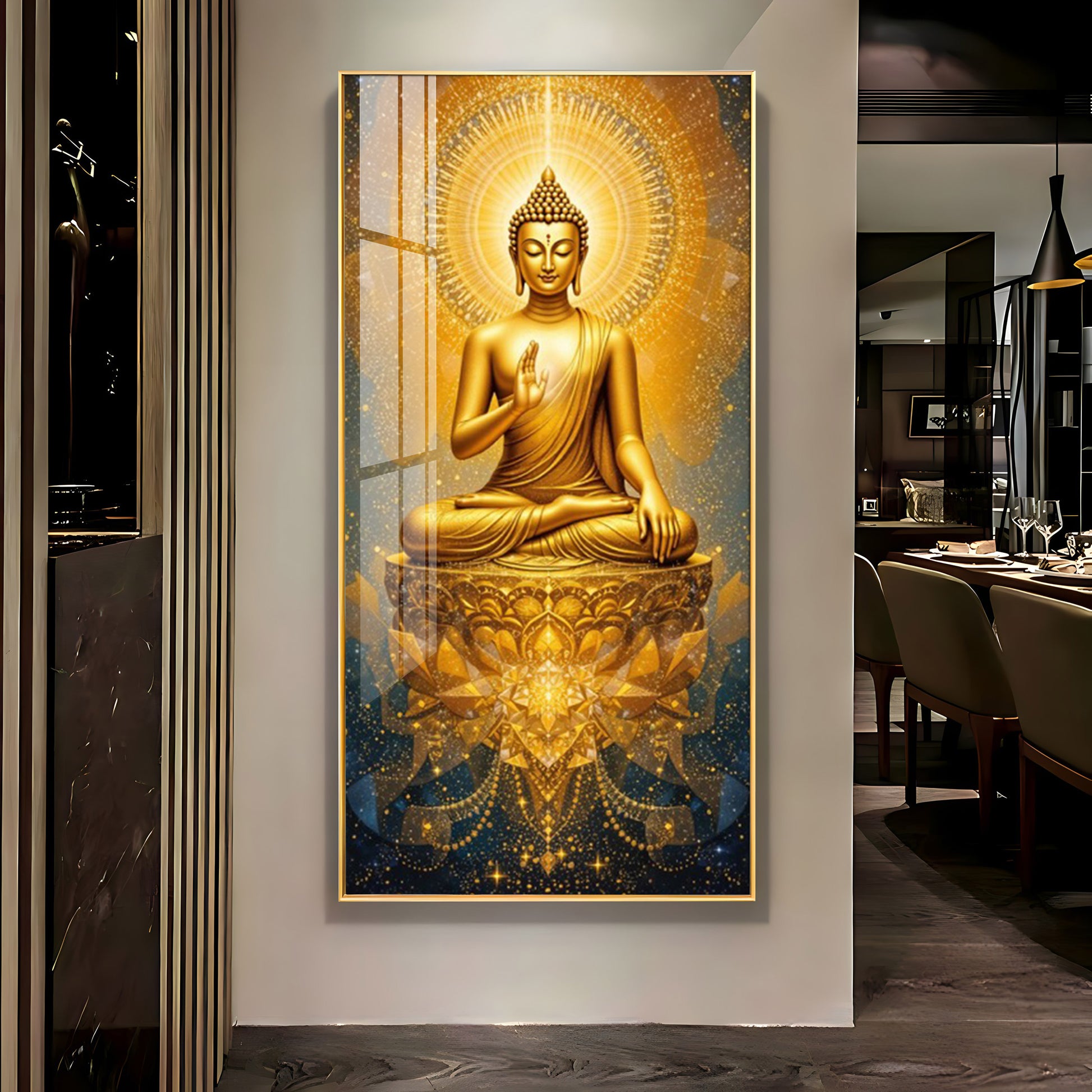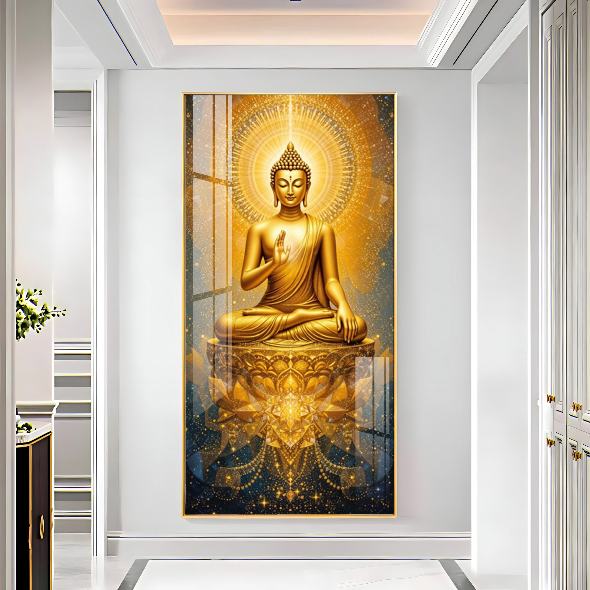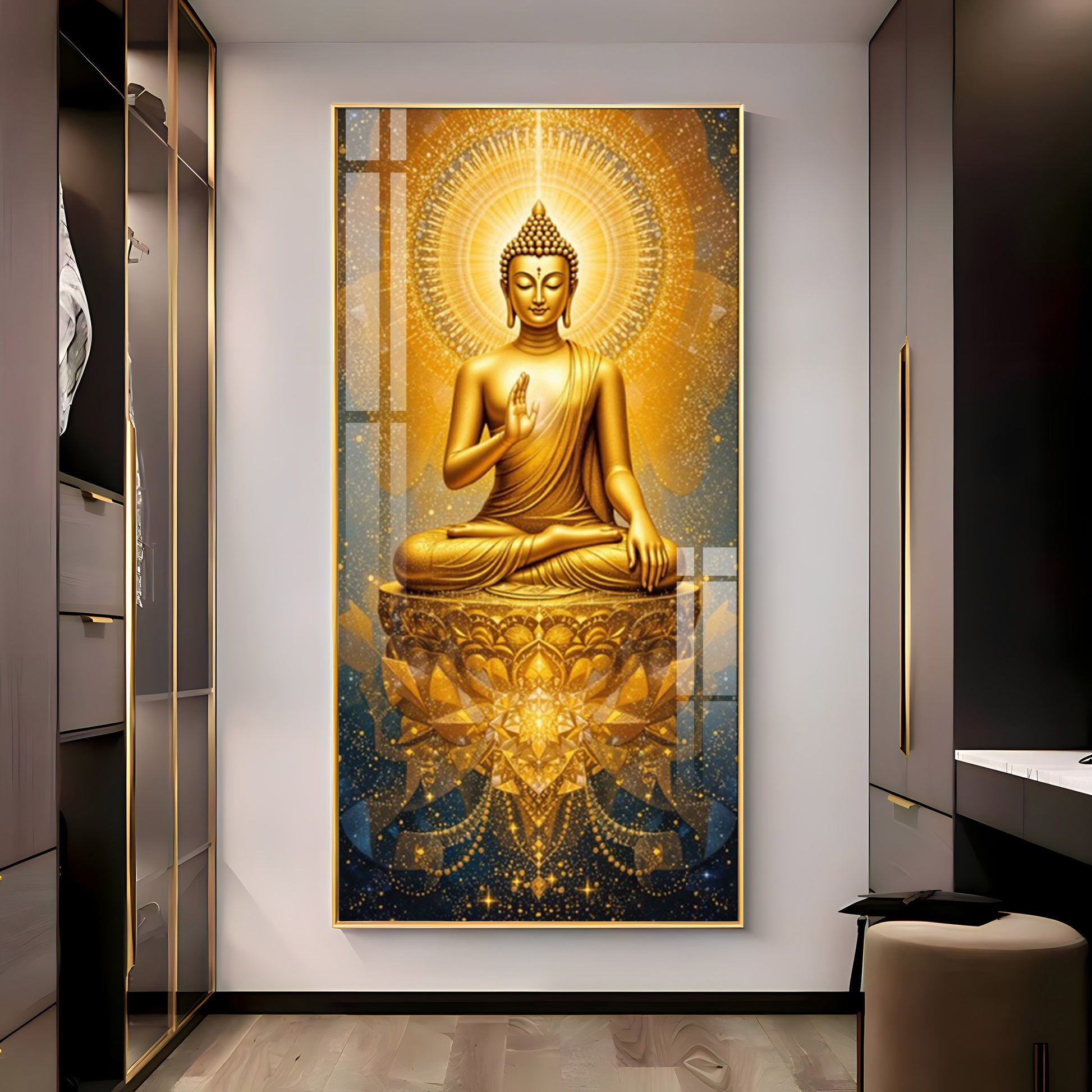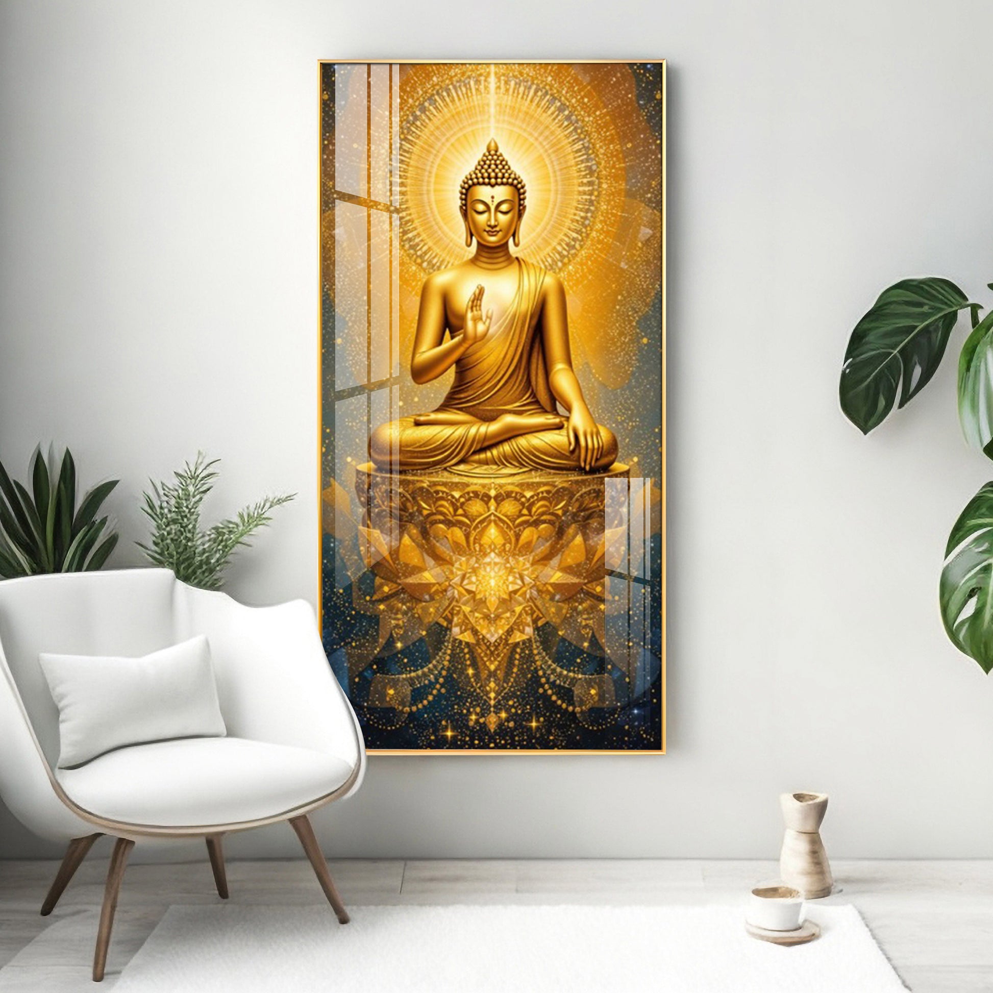 Golden Buddha's Aura Glass Finish Vertical Wall Art