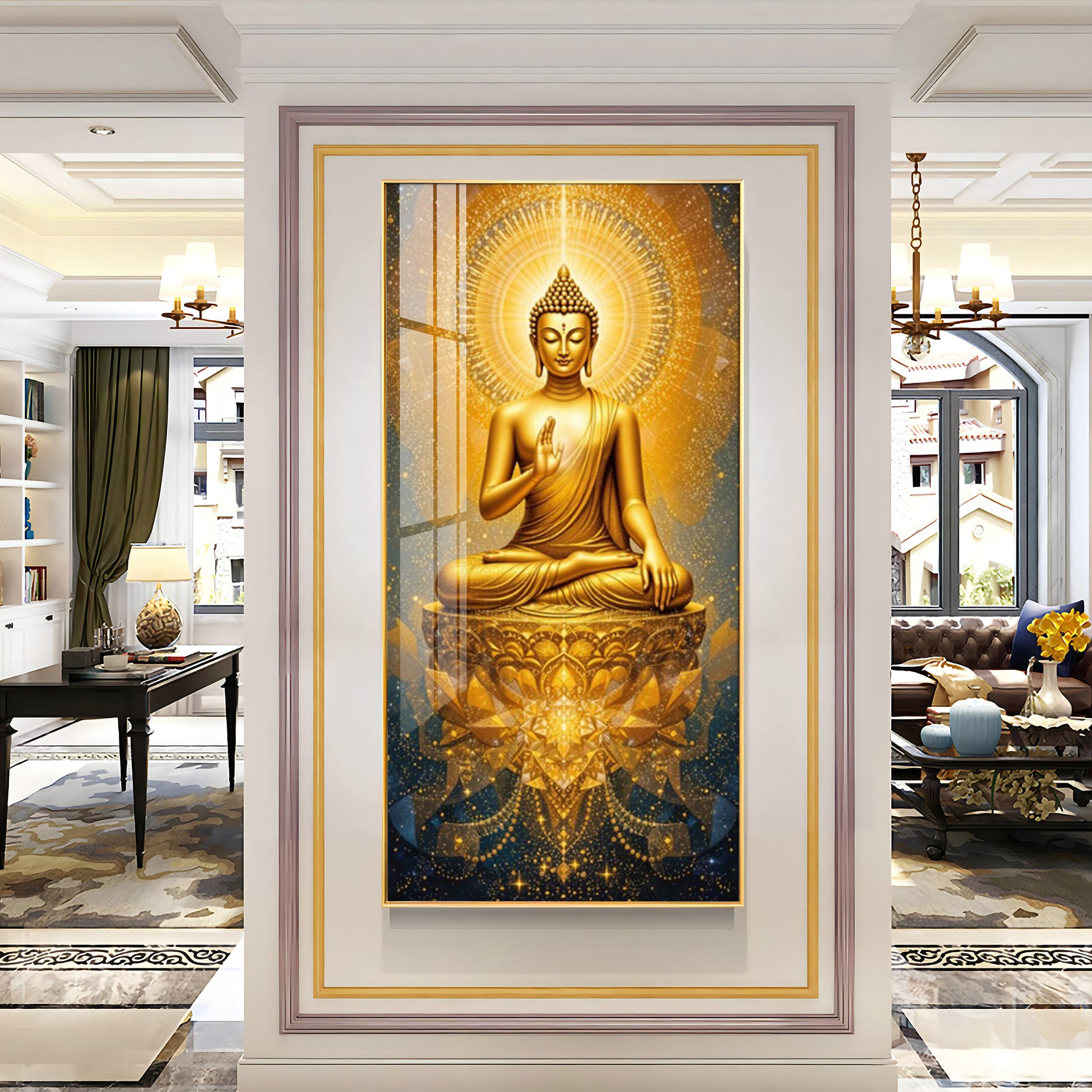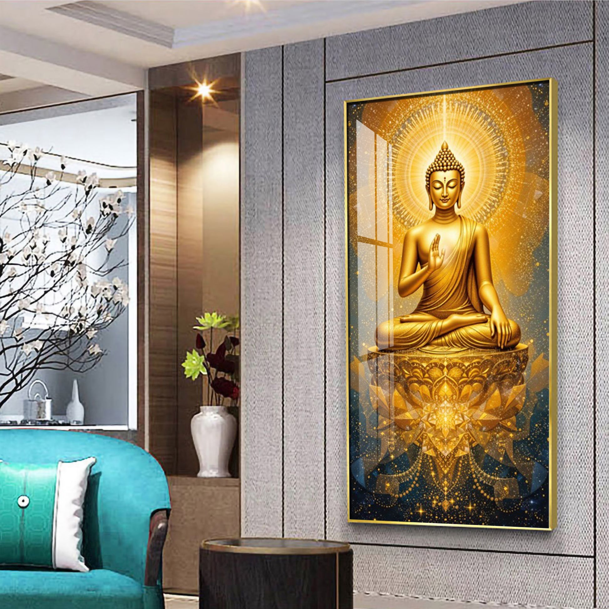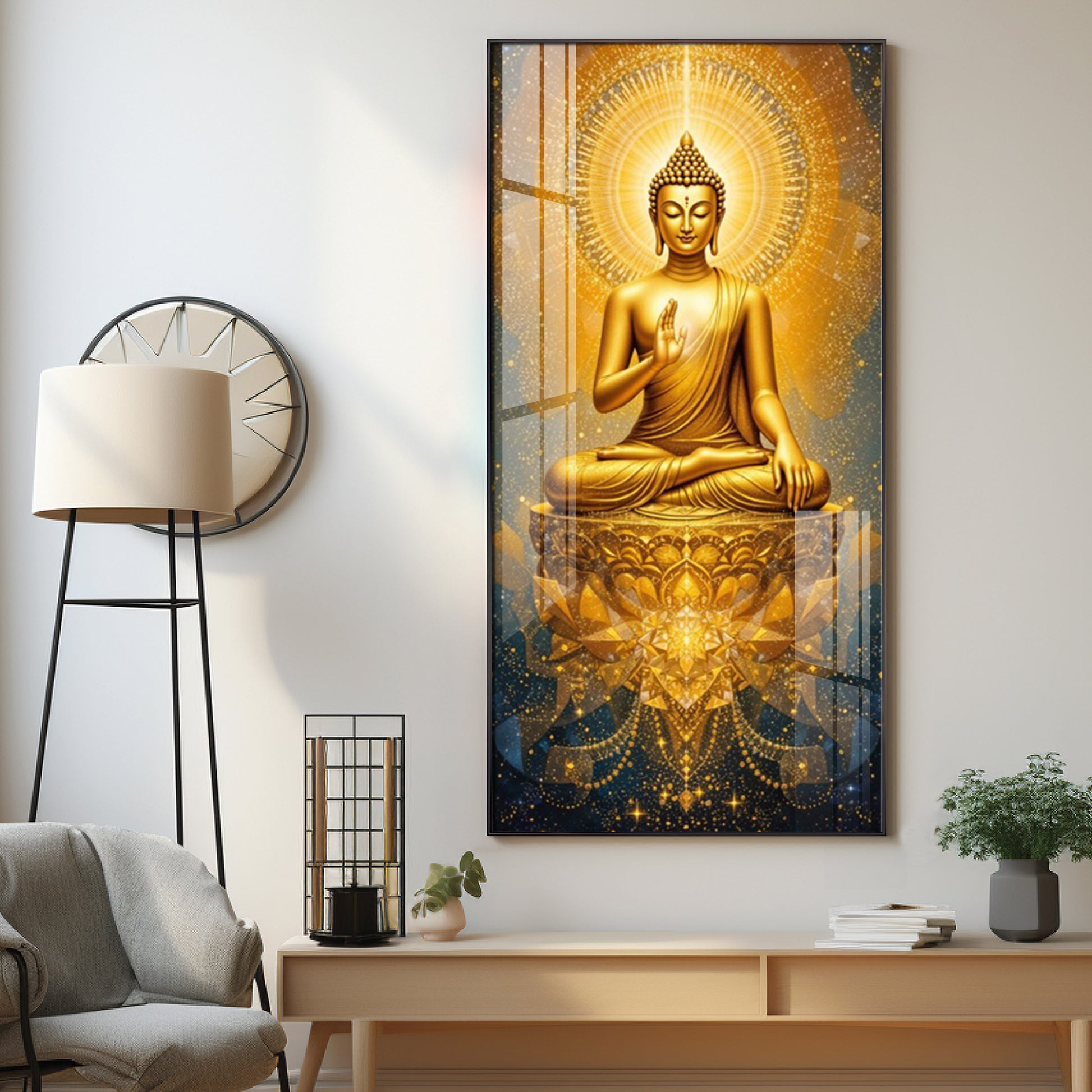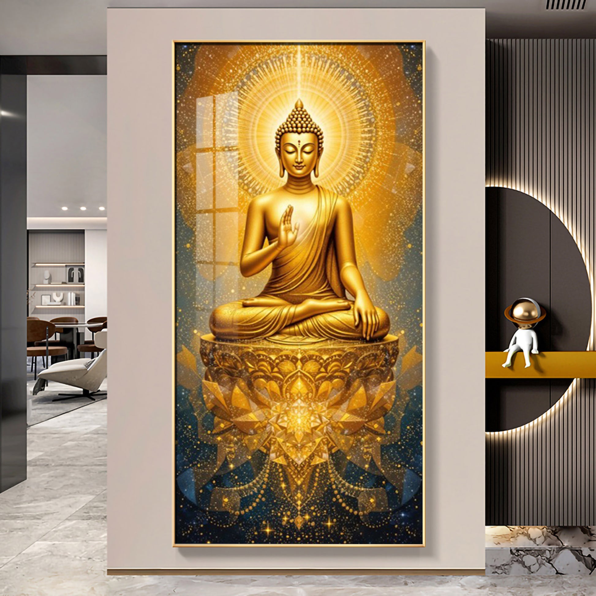 Golden Buddha's Aura Glass Finish Vertical Wall Art