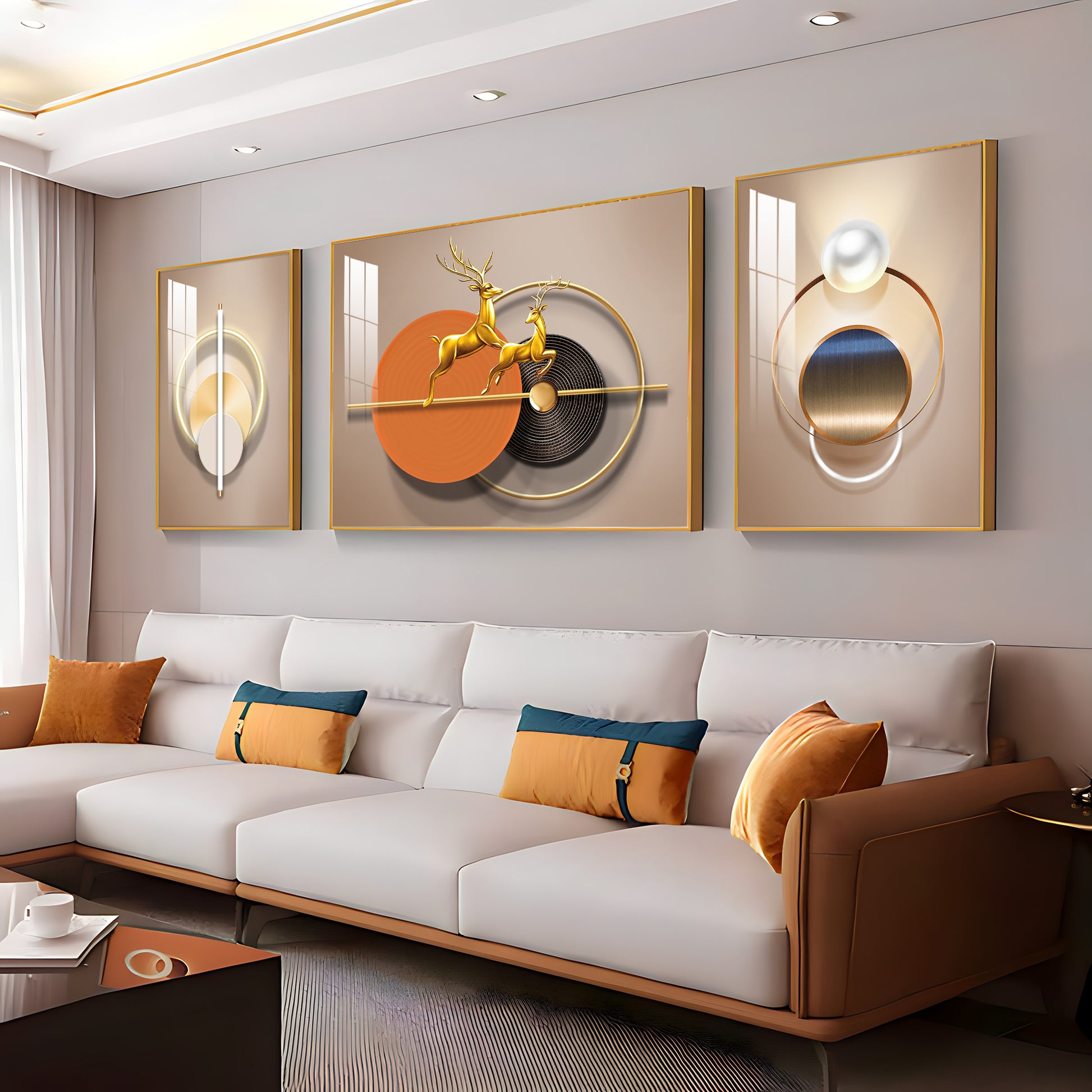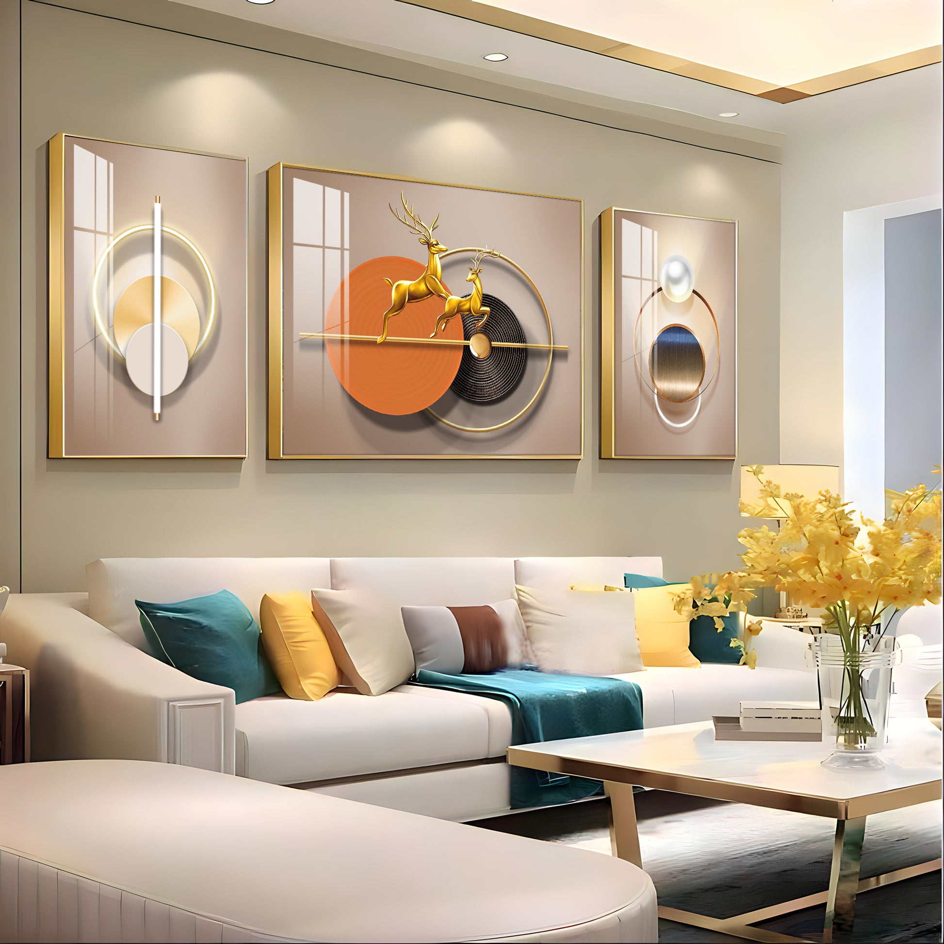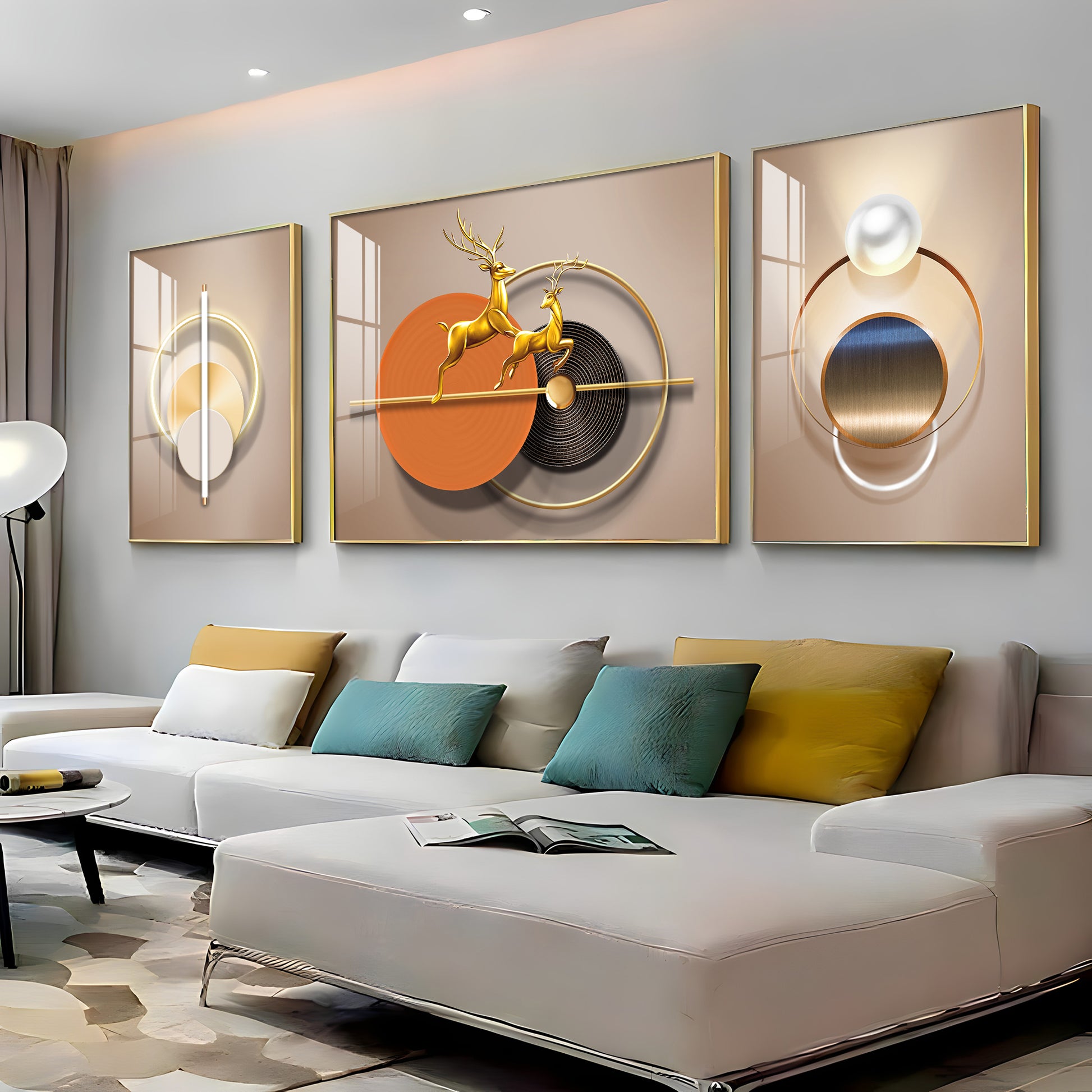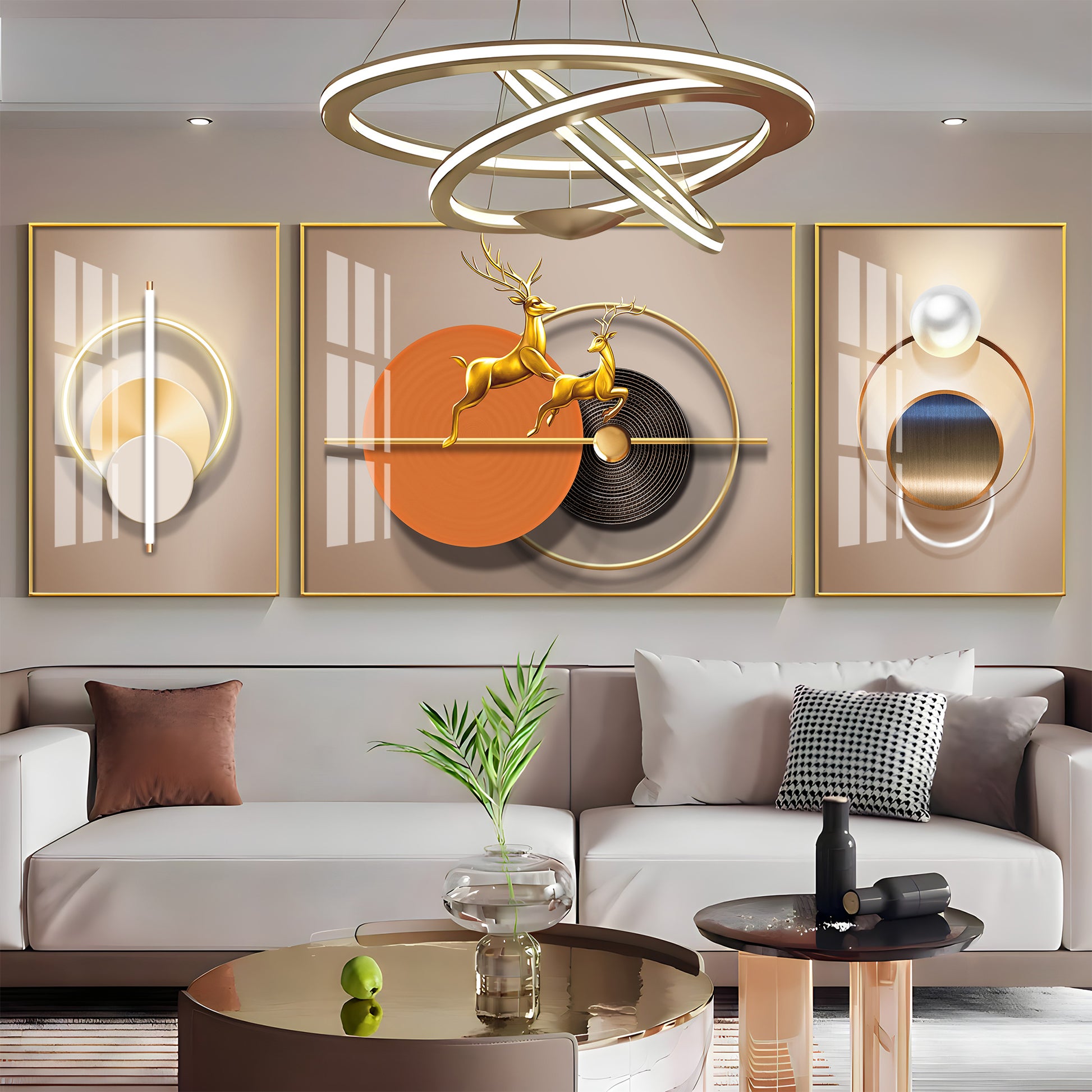 Golden Dancing Deer Glass Finish Wall Art (Set Of 3)