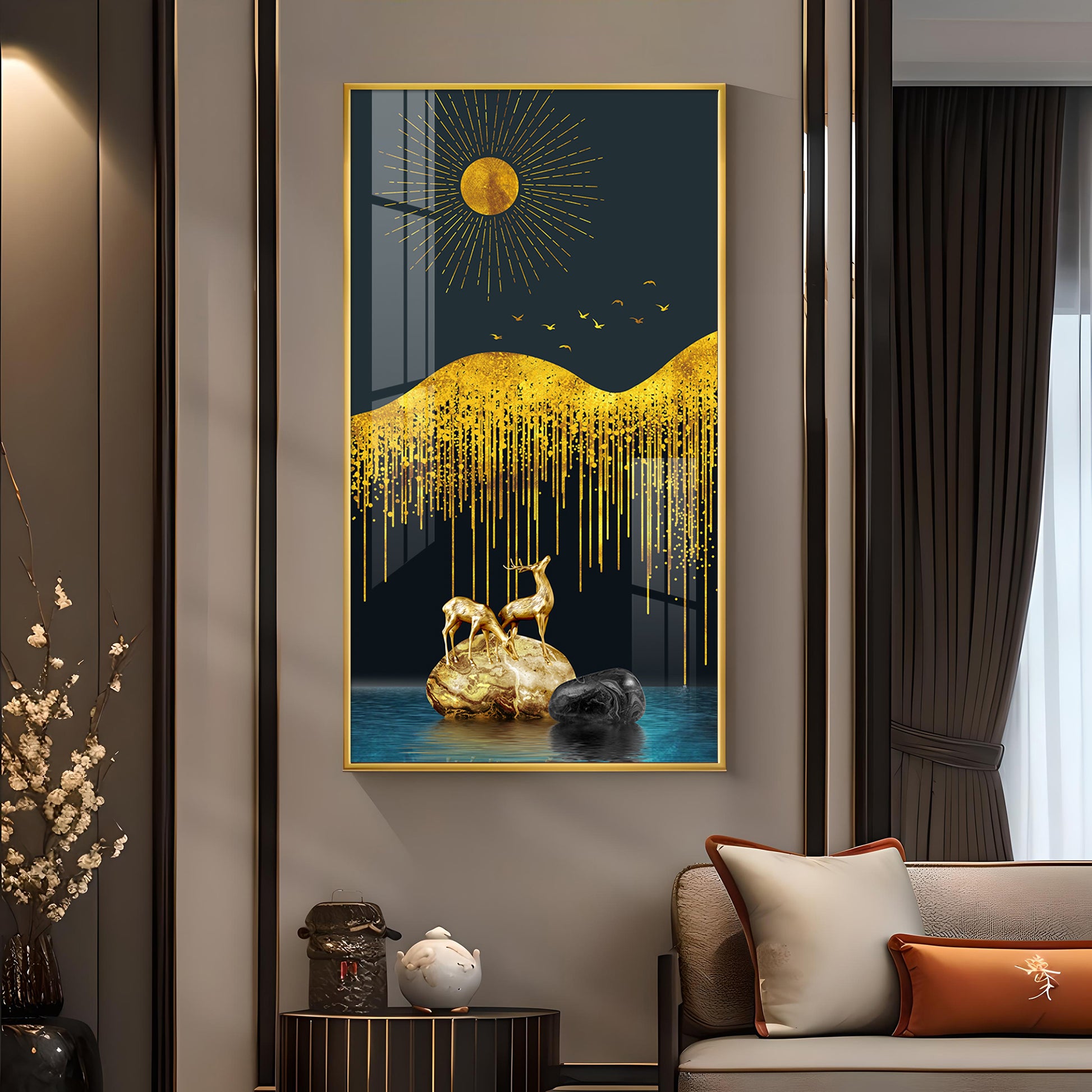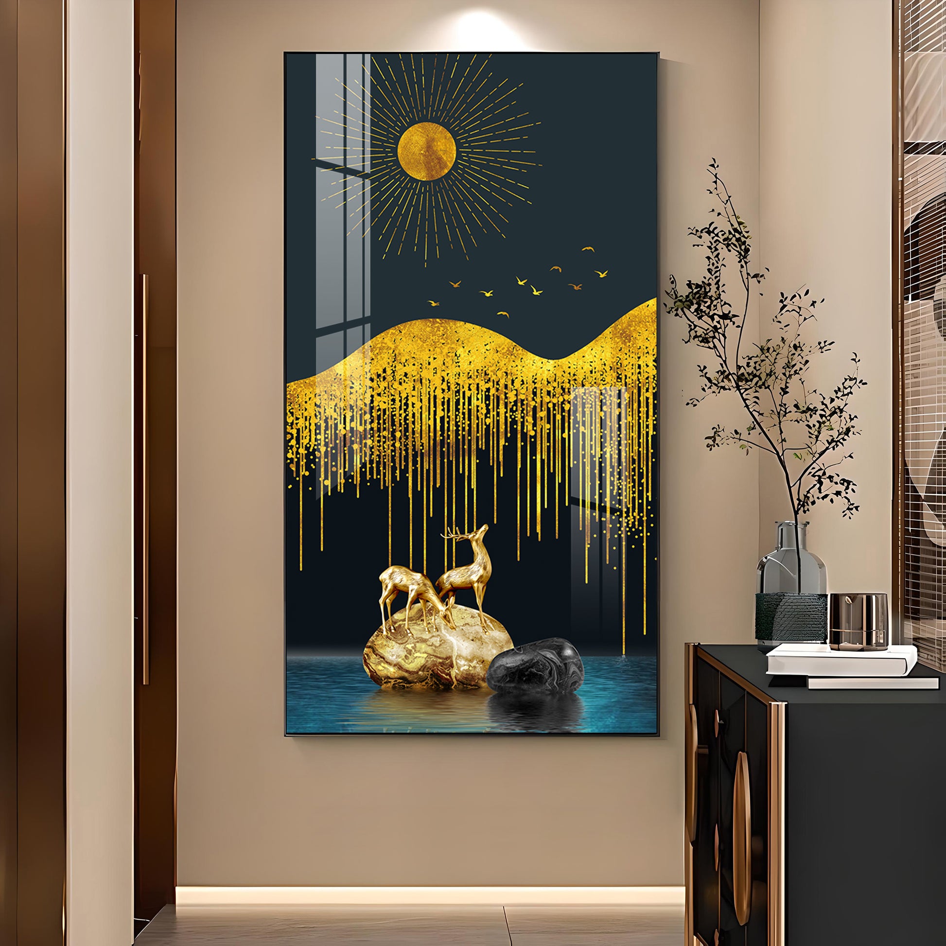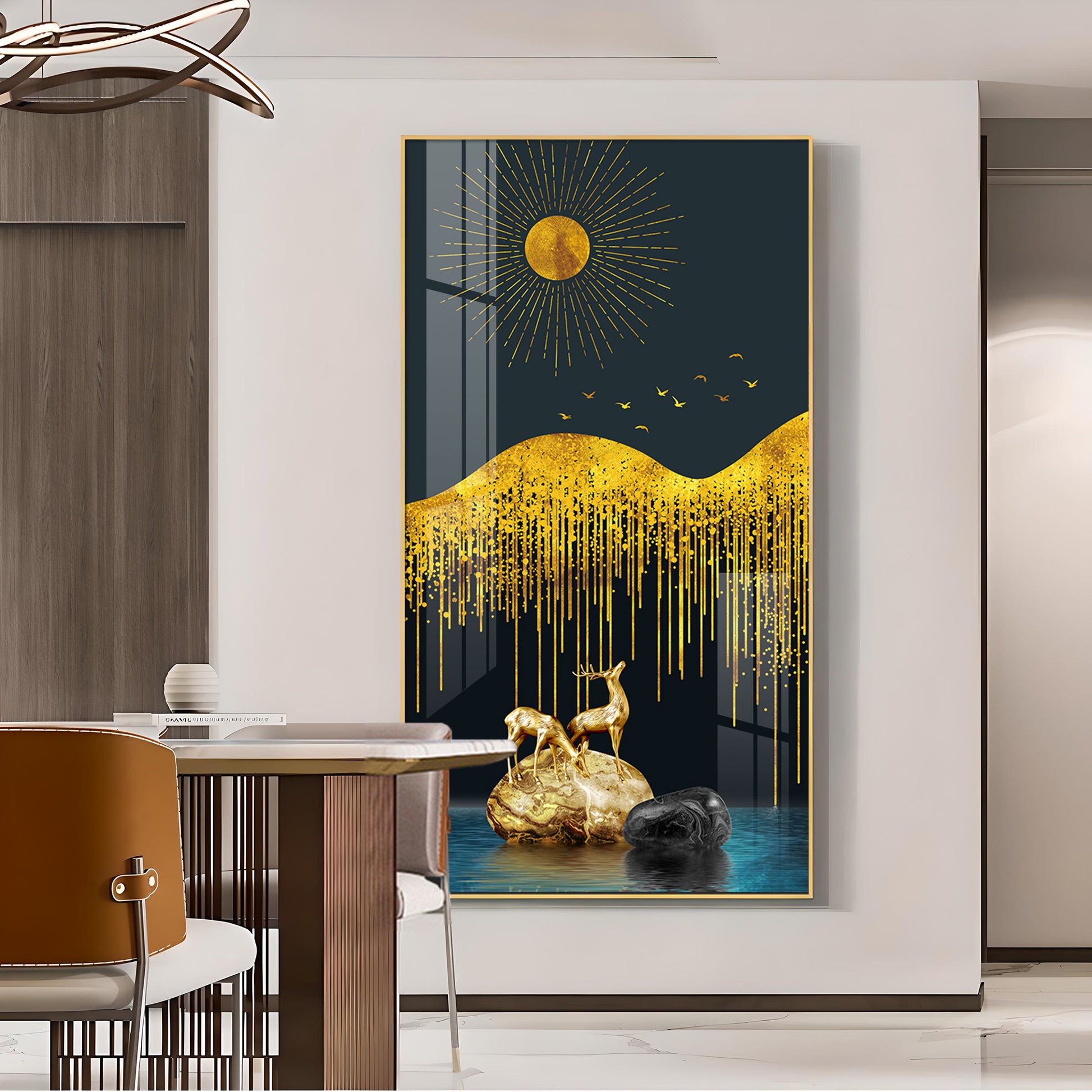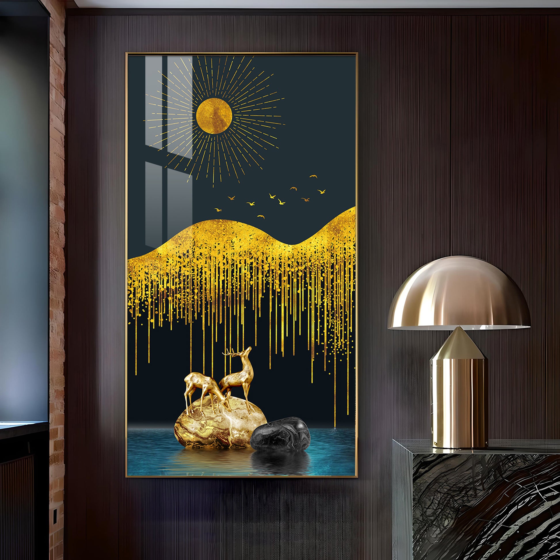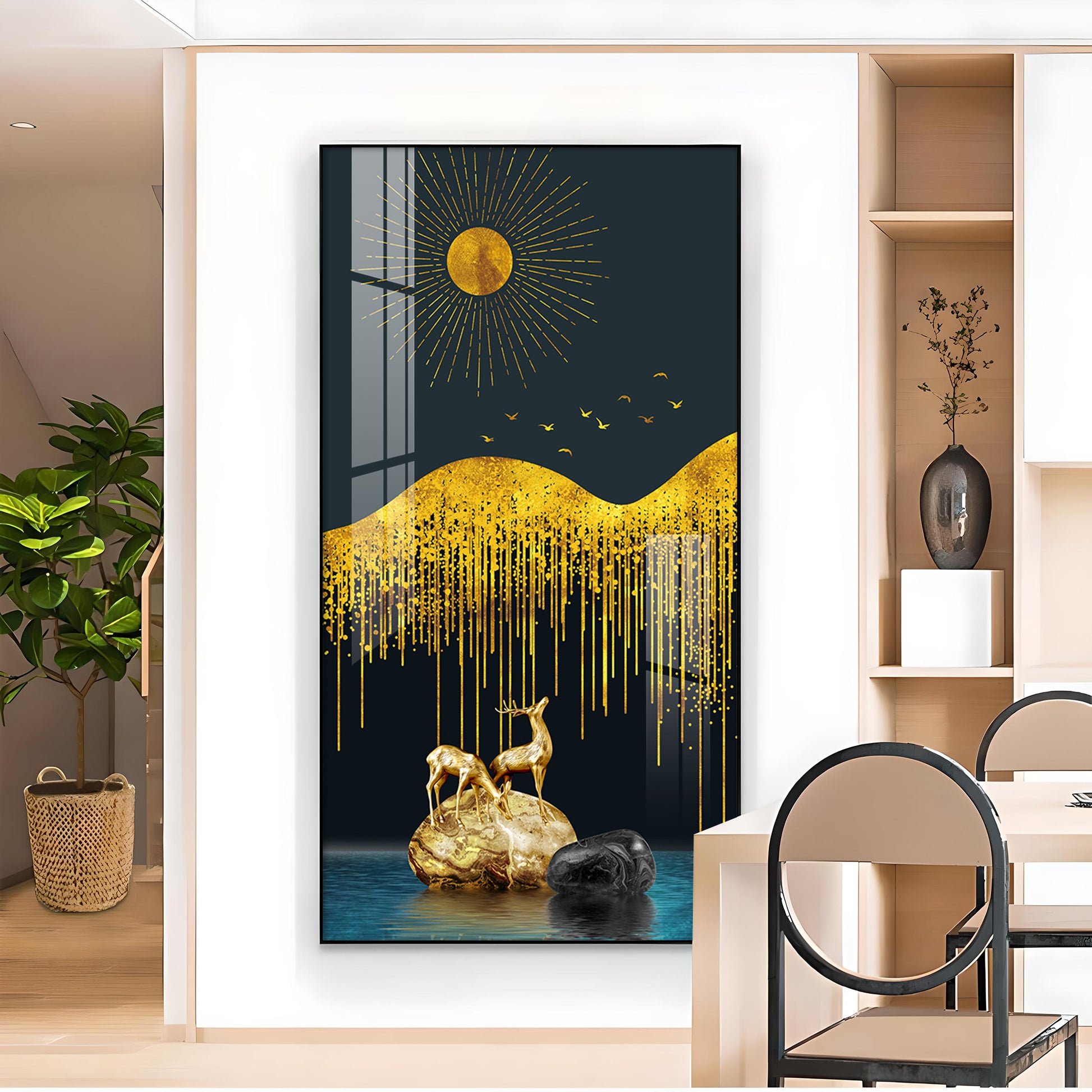 Golden Deer Essence Glass Finish Vertical Wall Art