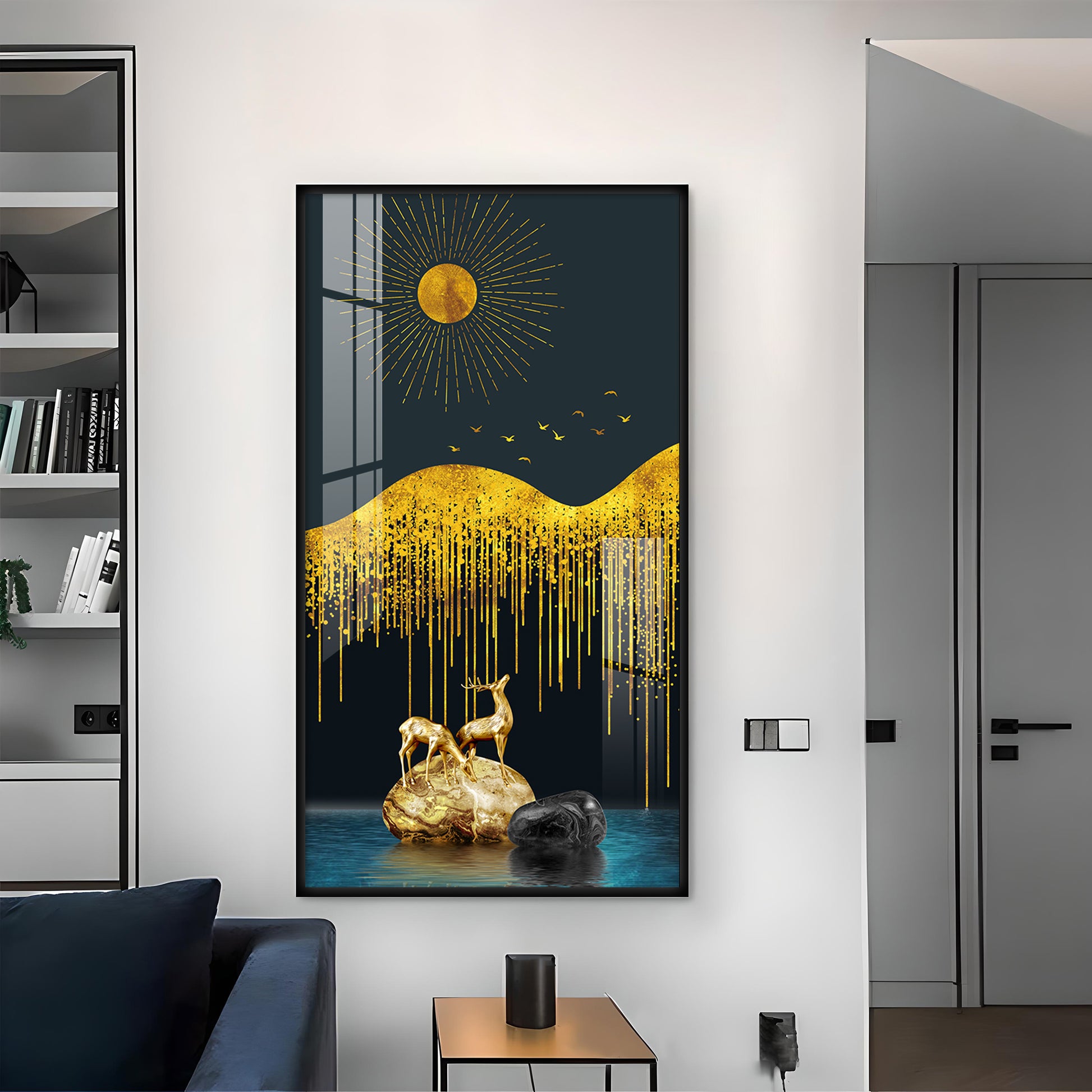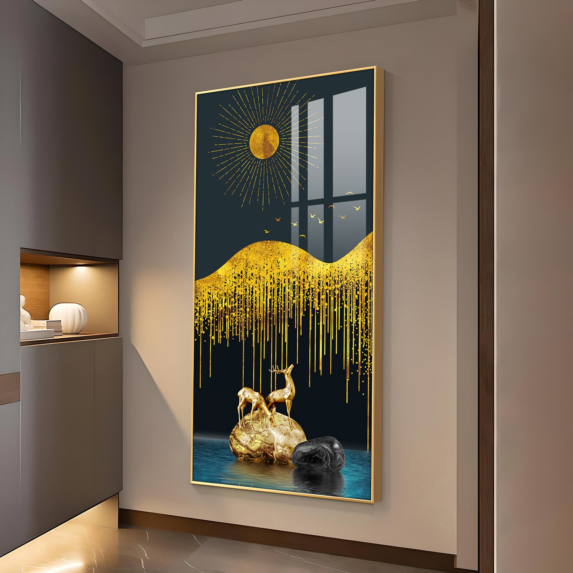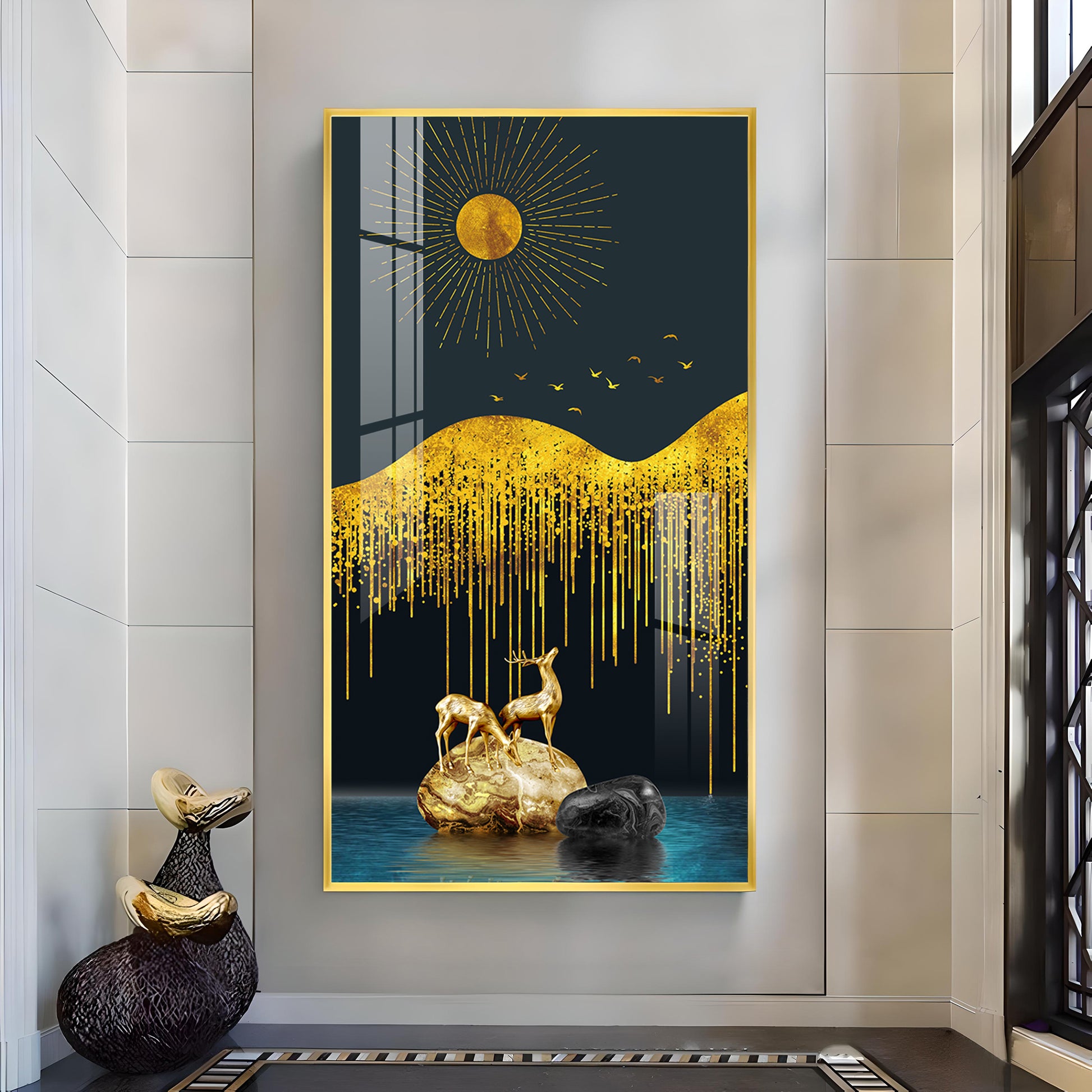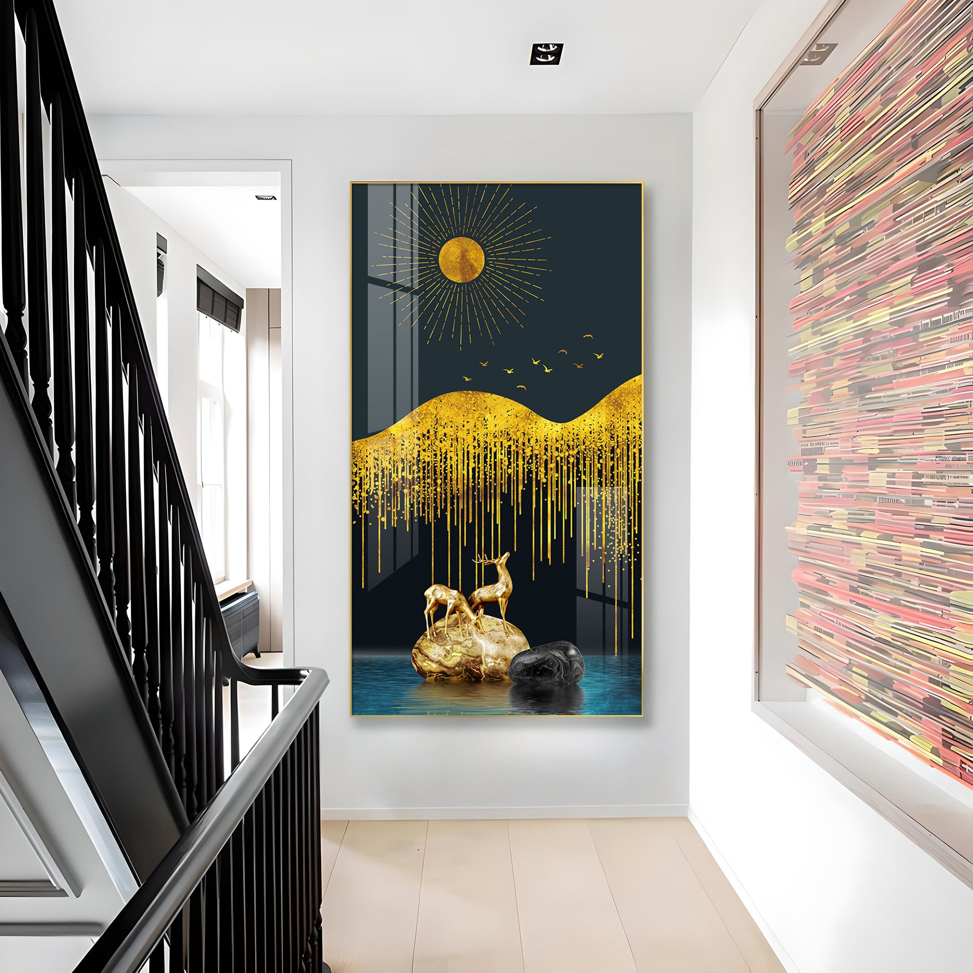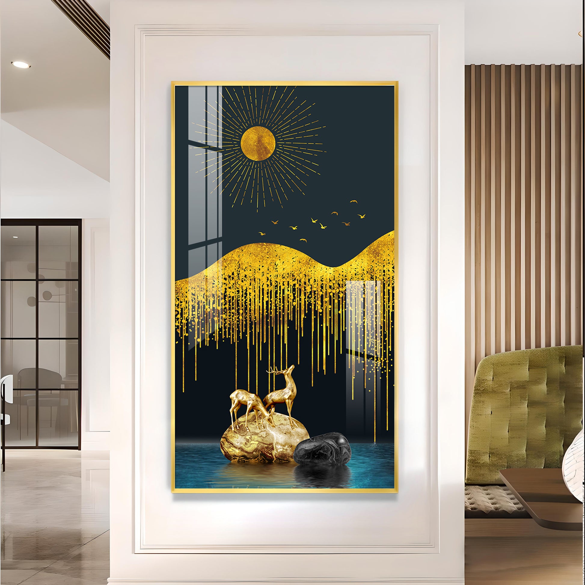 Golden Deer Essence Glass Finish Vertical Wall Art