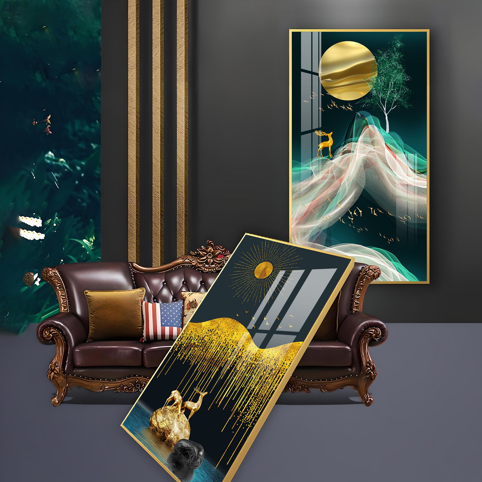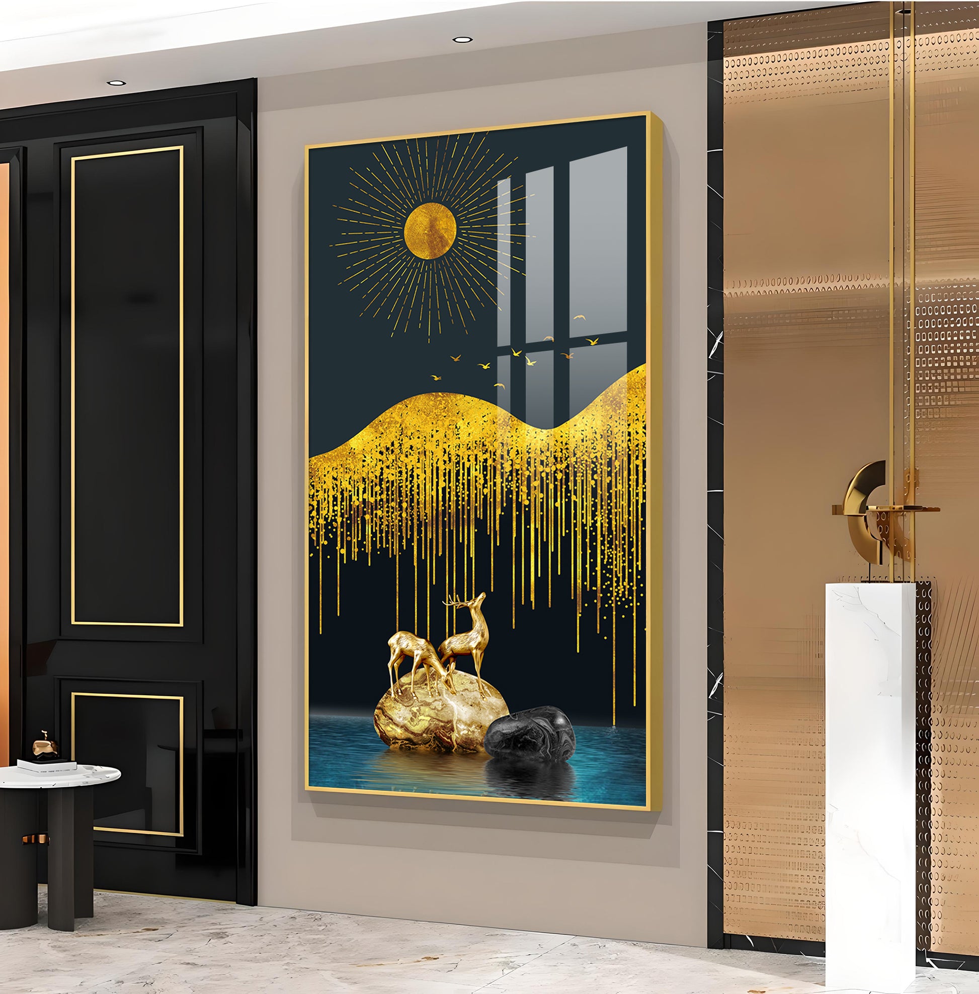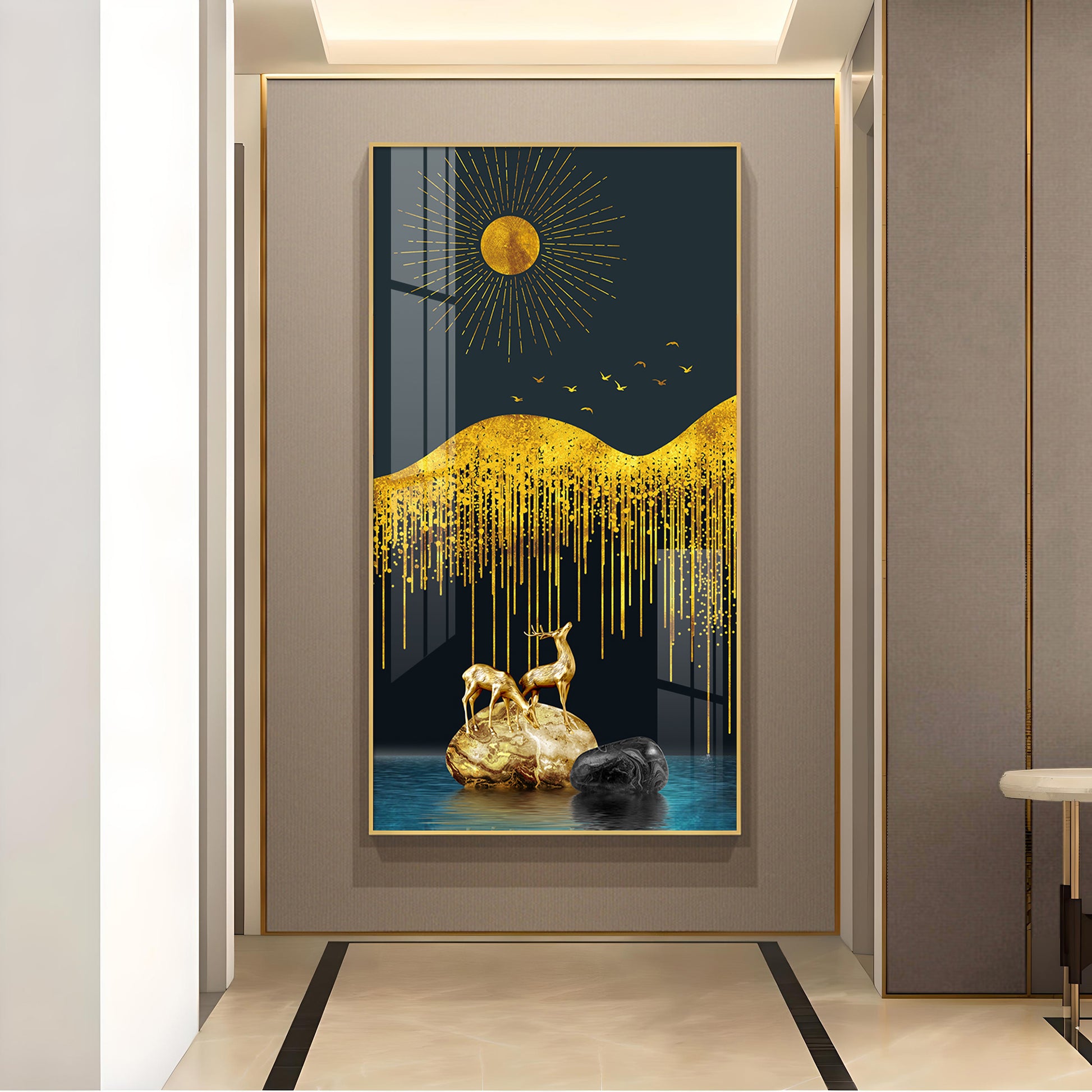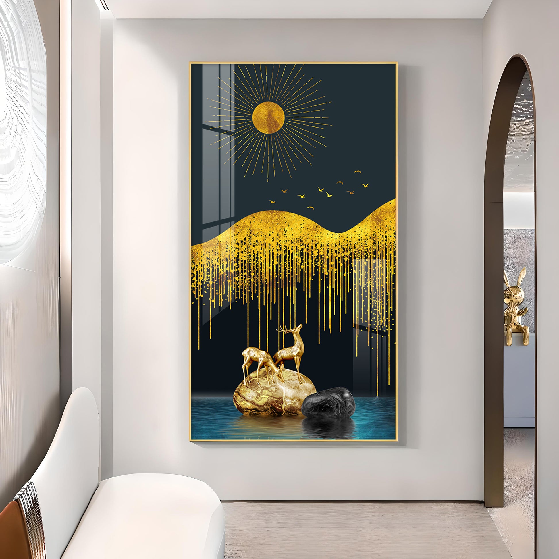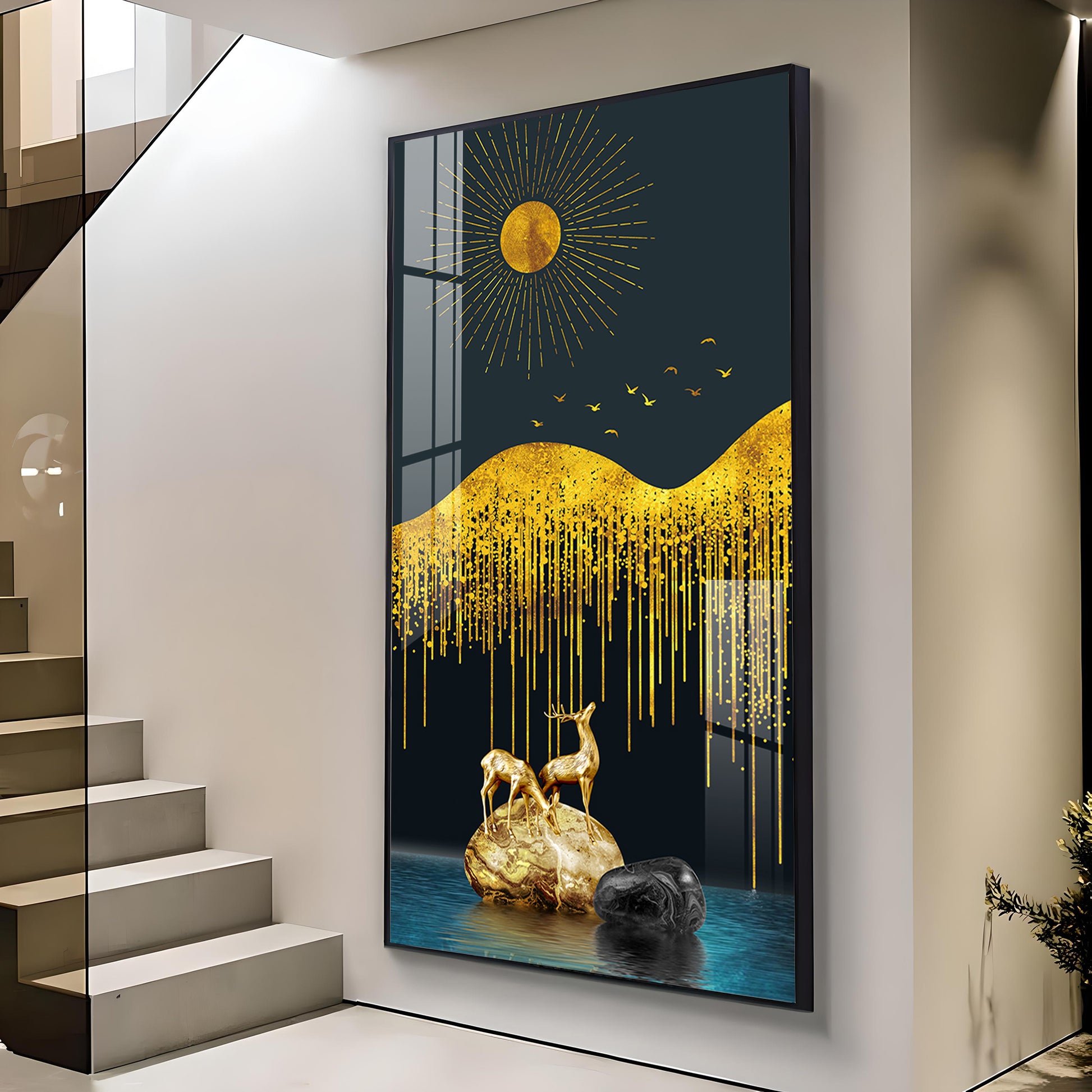 Golden Deer Essence Glass Finish Vertical Wall Art