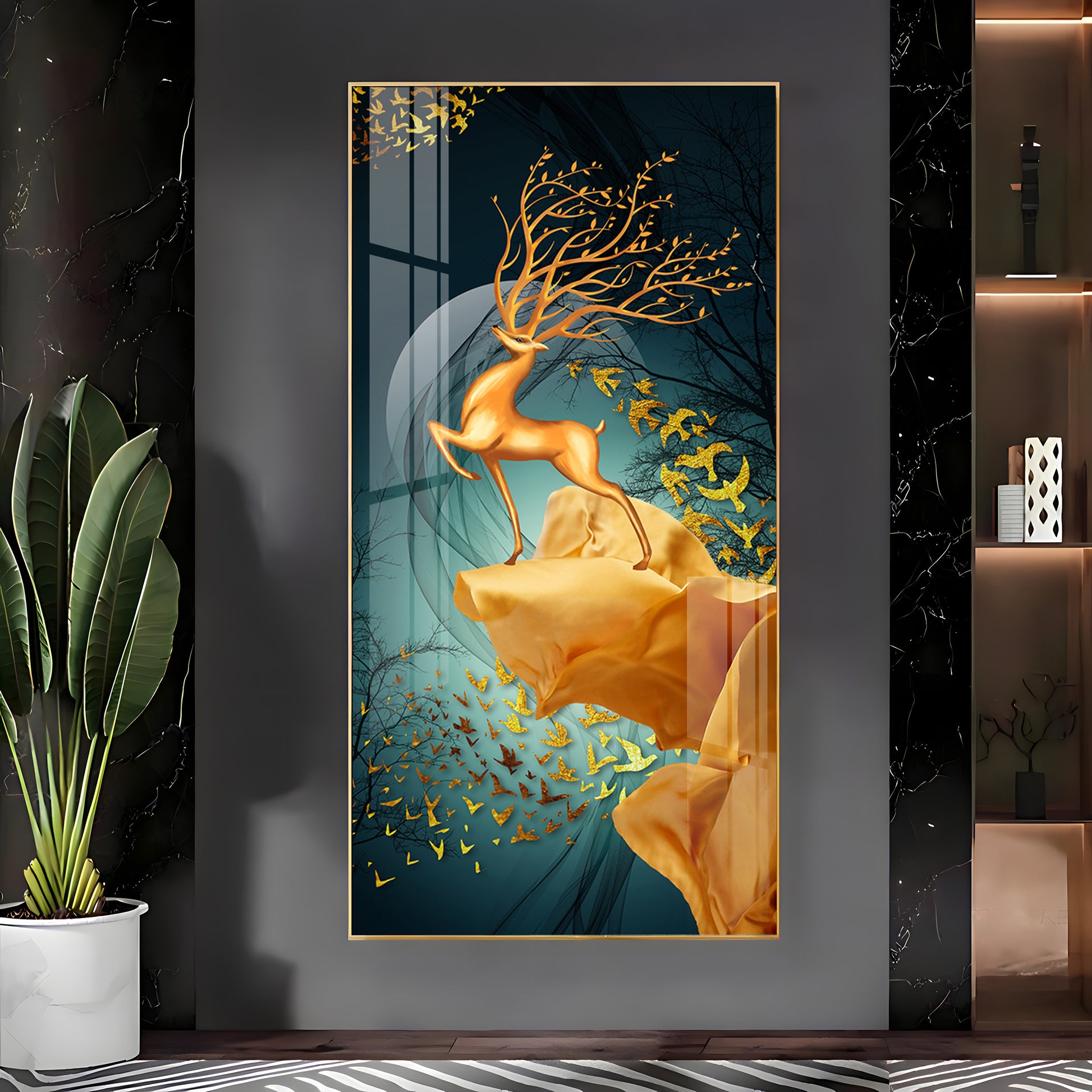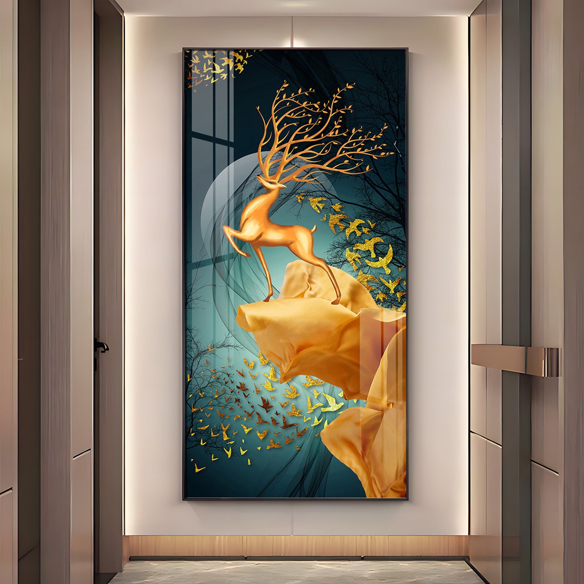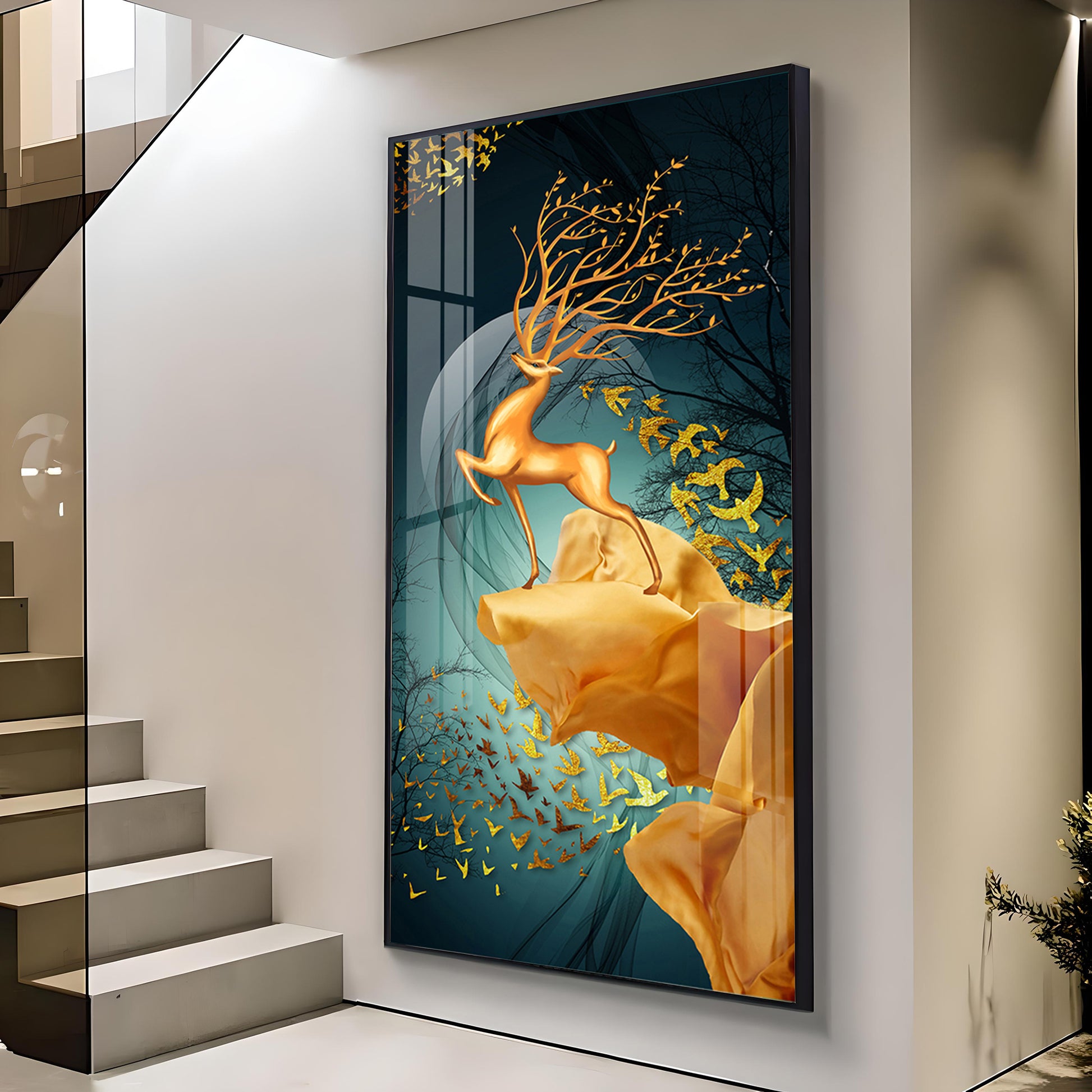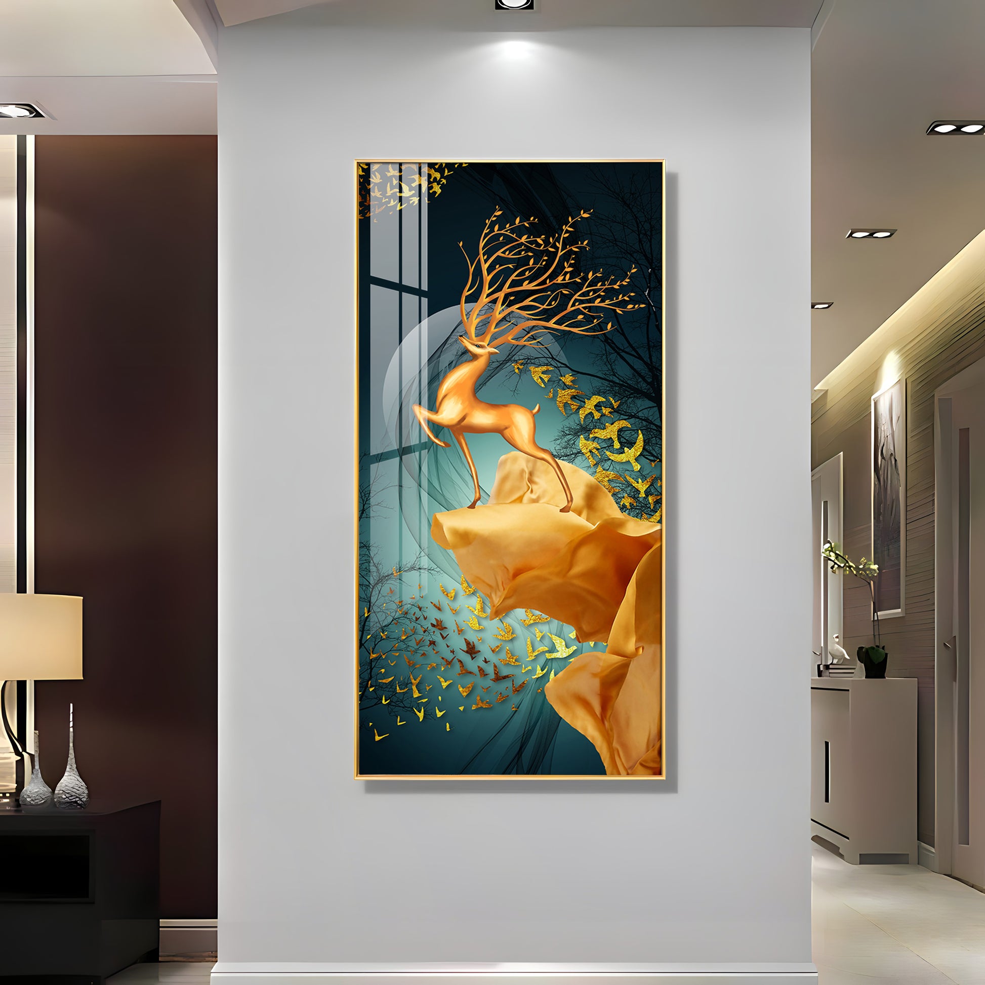 Golden Deer Jumping Glass Finish Vertical Wall Art