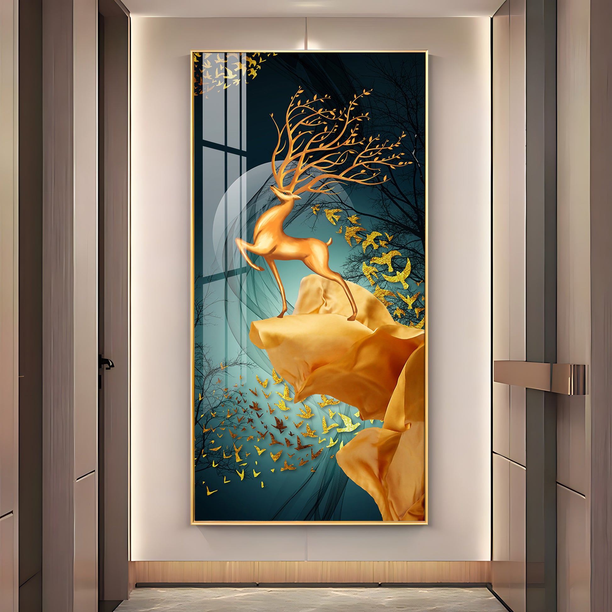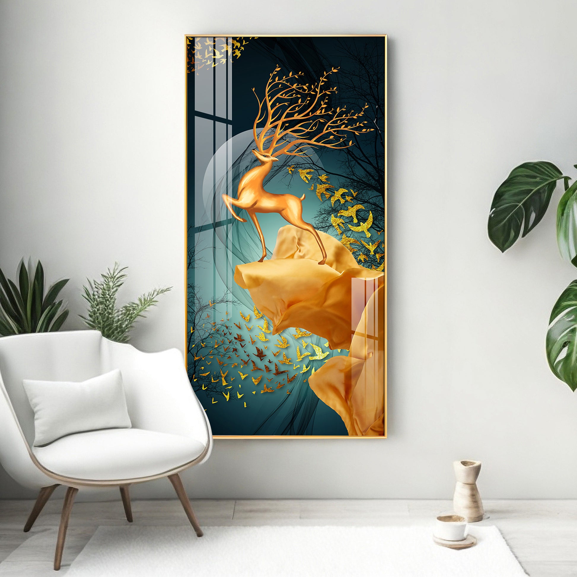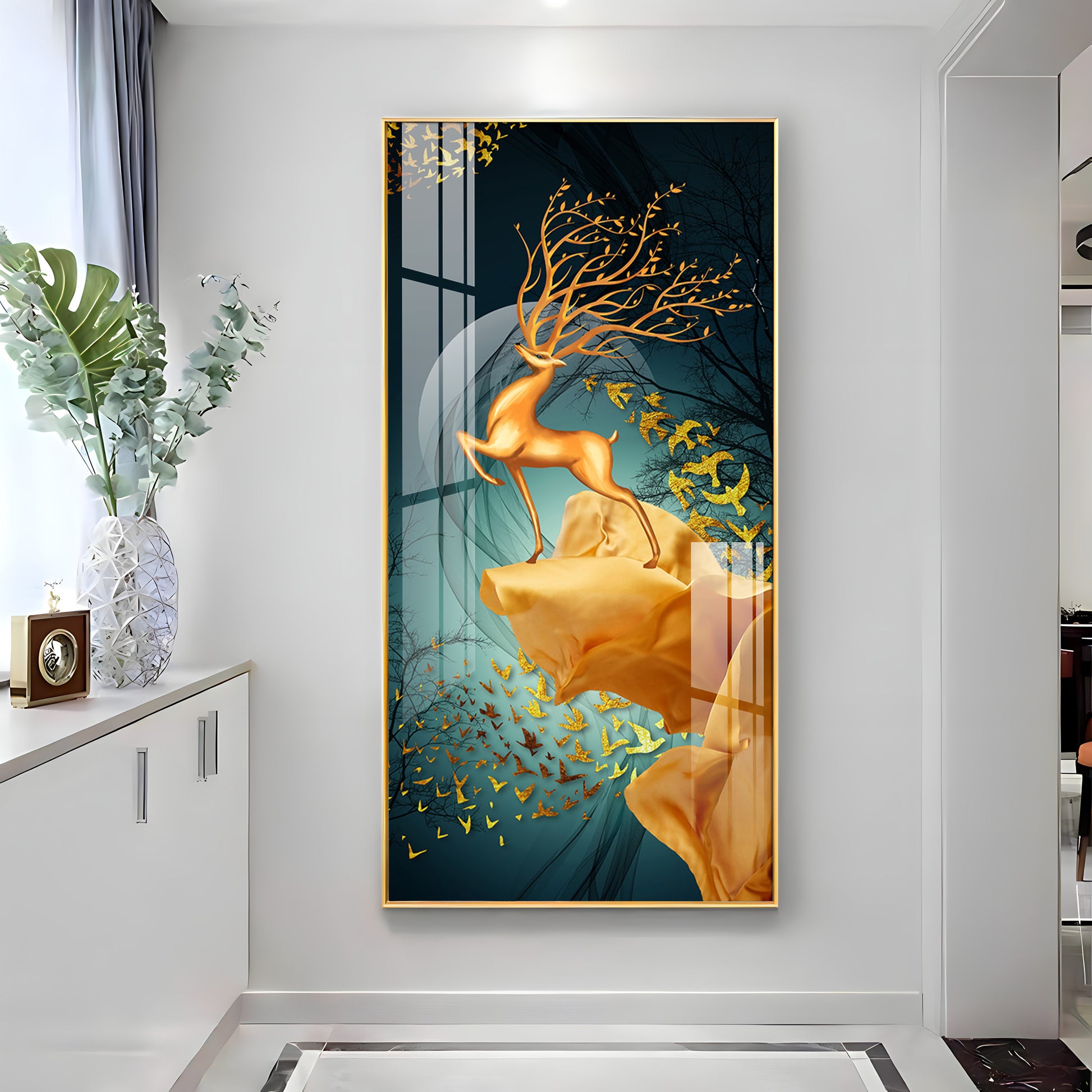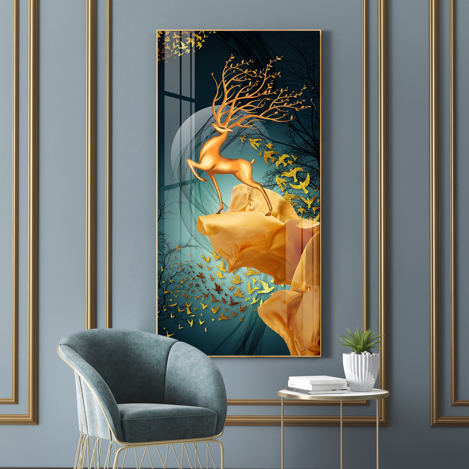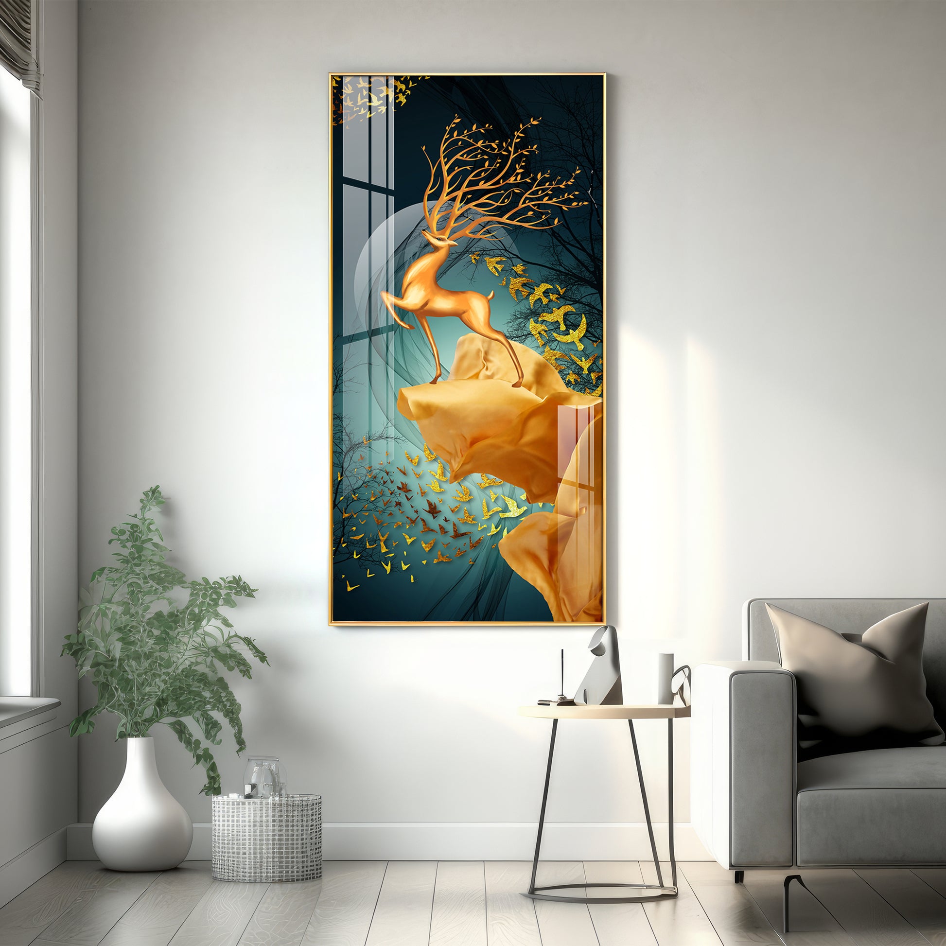 Golden Deer Jumping Glass Finish Vertical Wall Art
