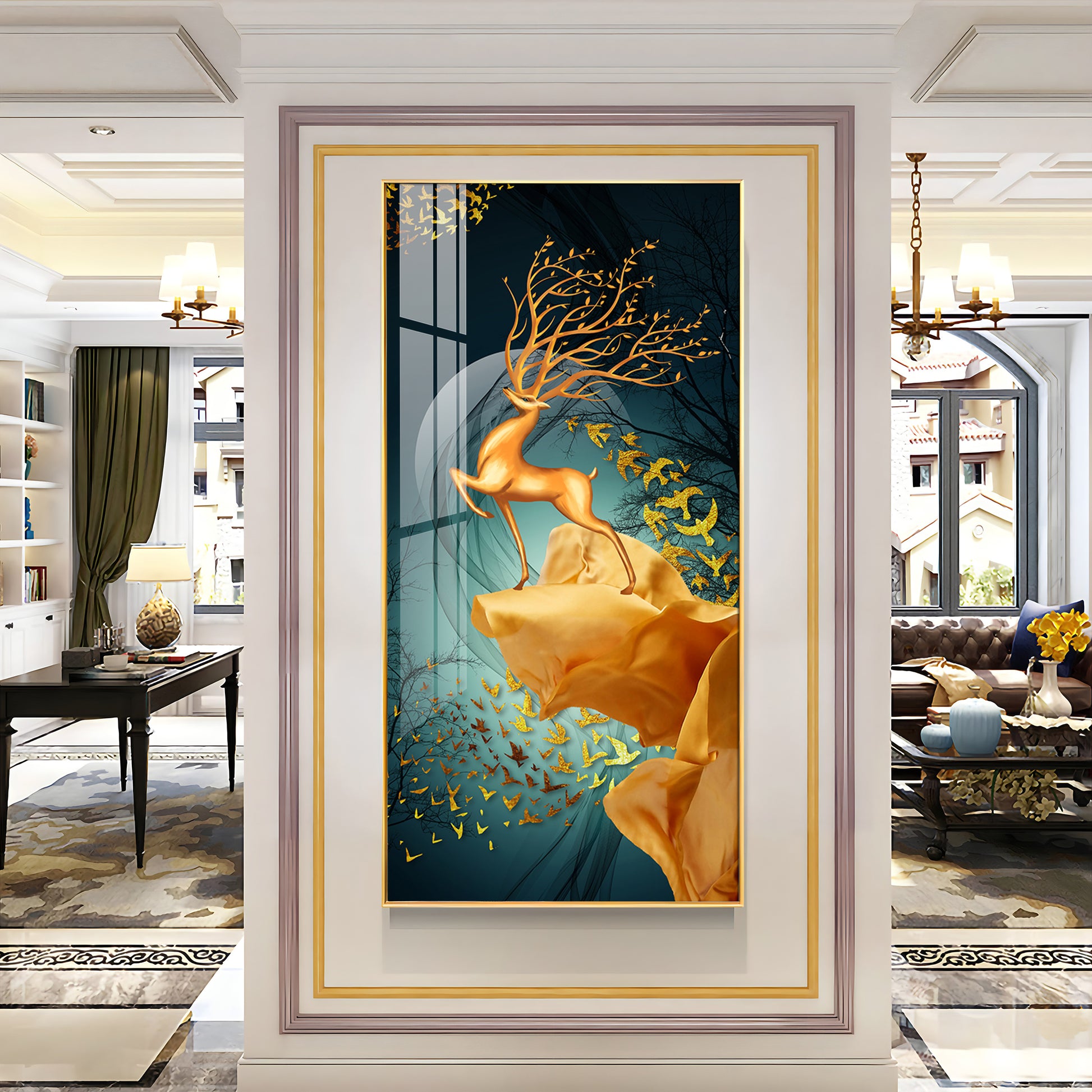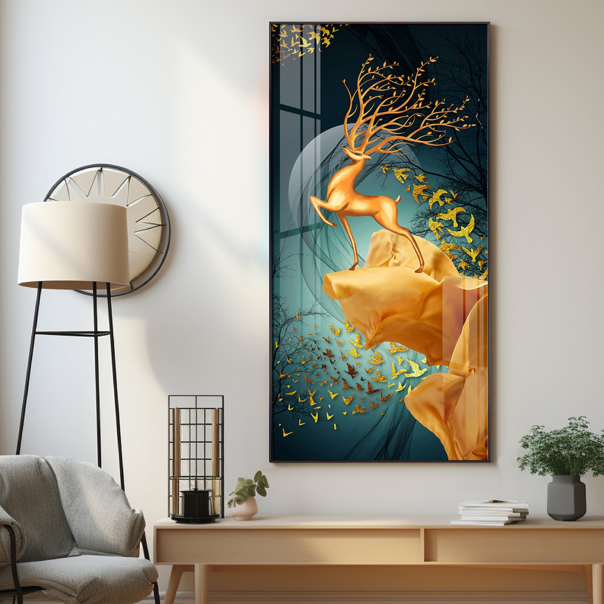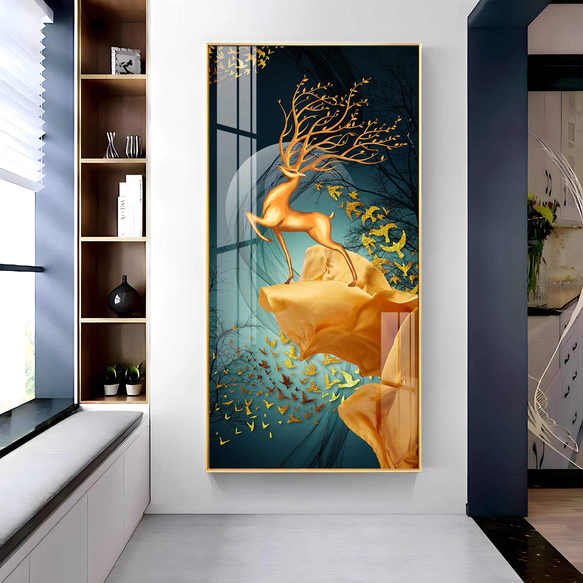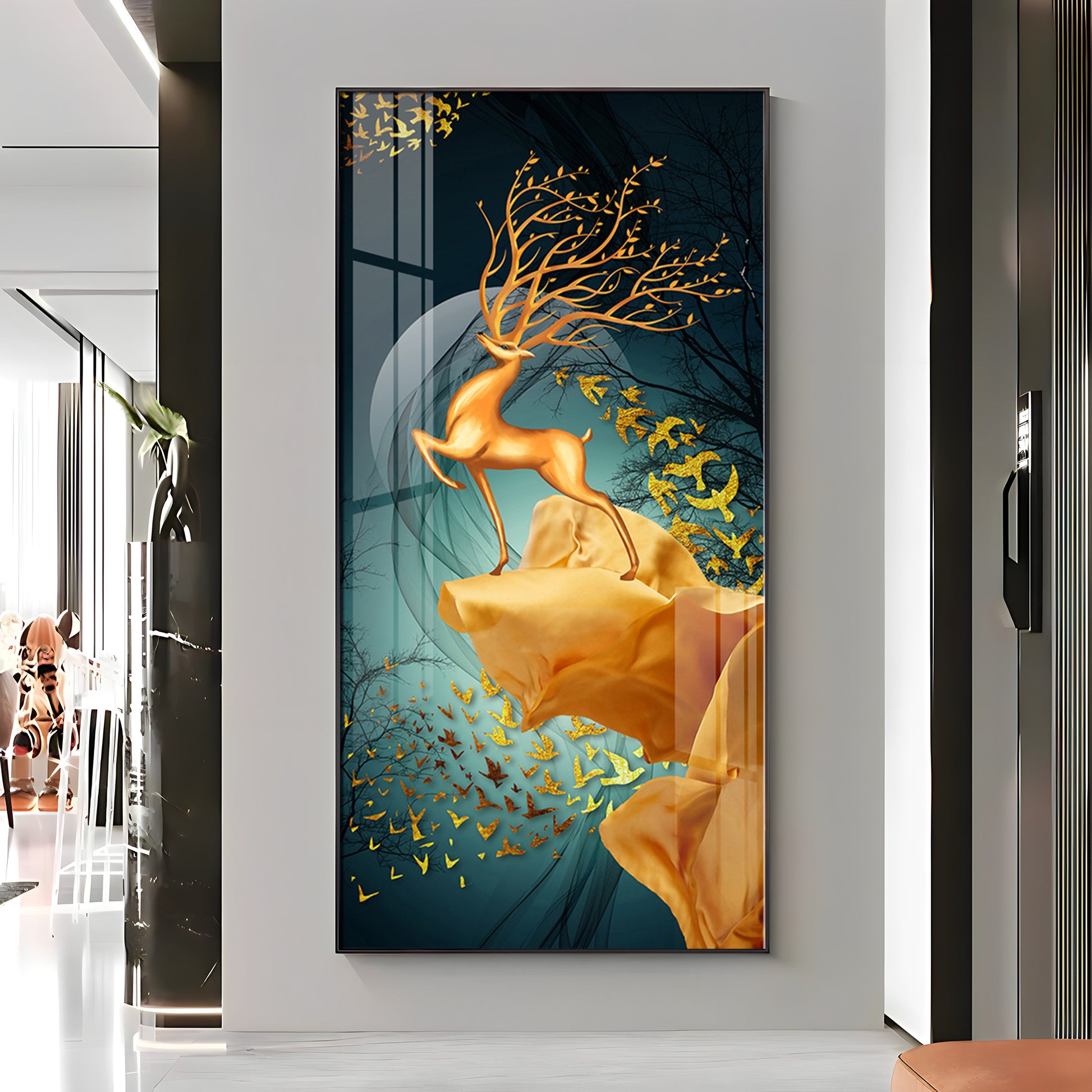 Golden Deer Jumping Glass Finish Vertical Wall Art