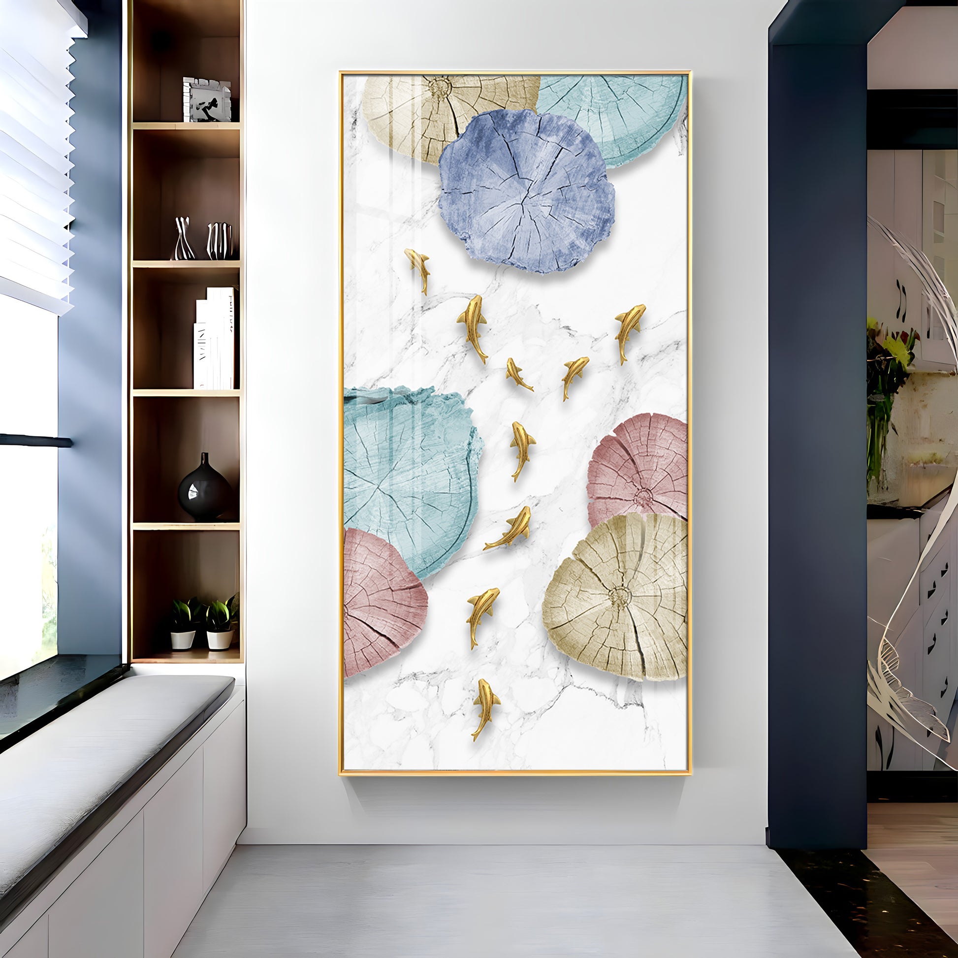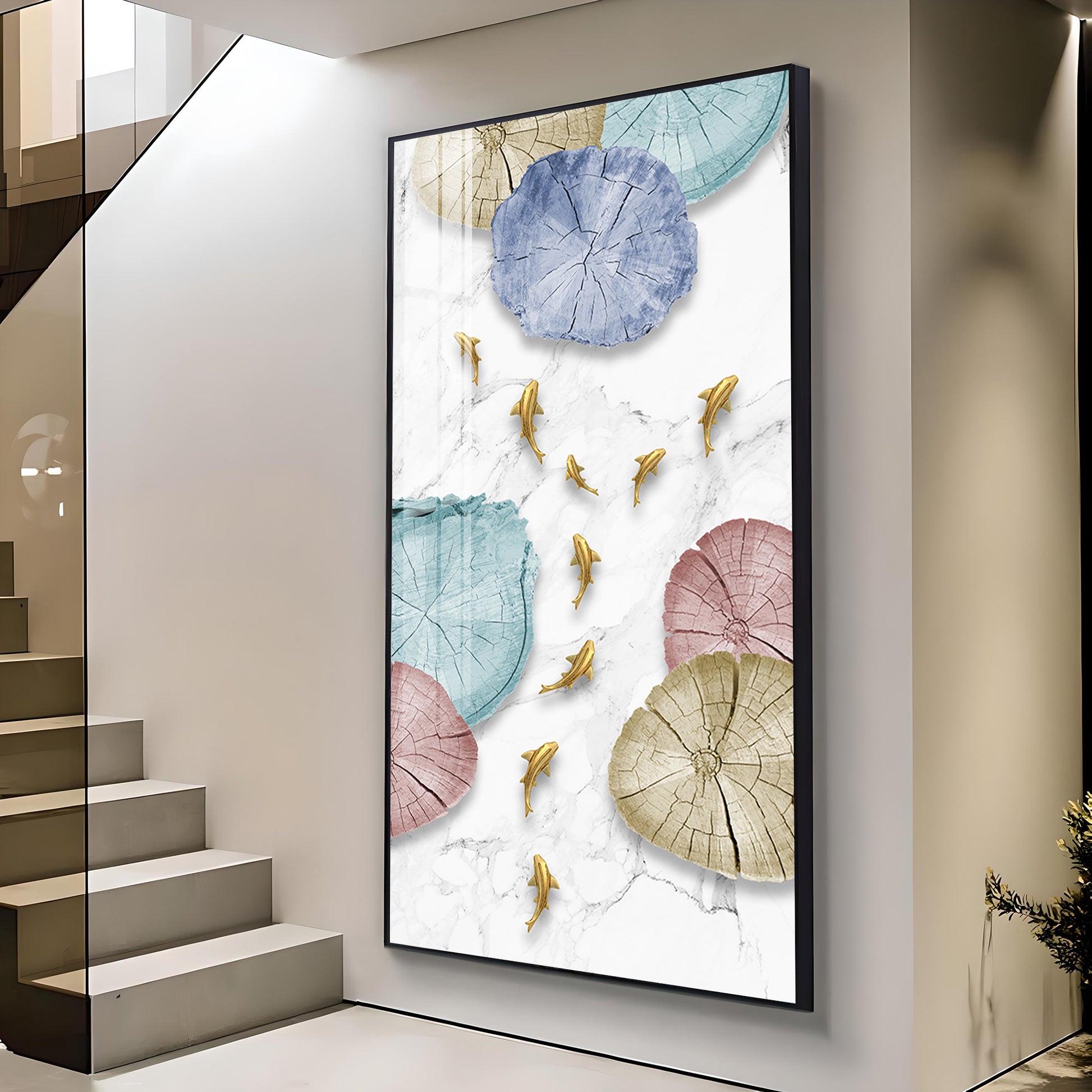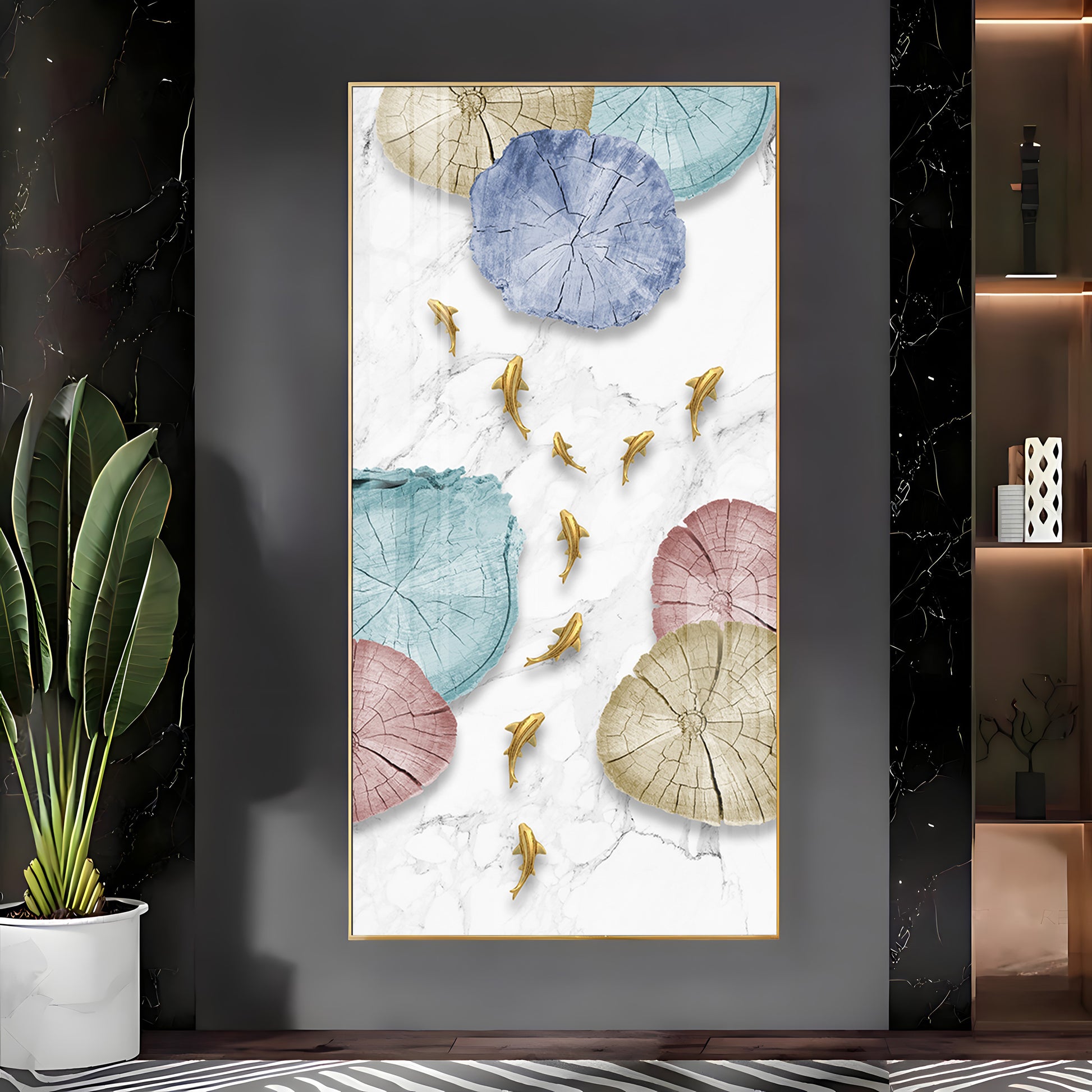 Golden Fish Umbrella Mosaic Glass Finish Vertical Wall Art