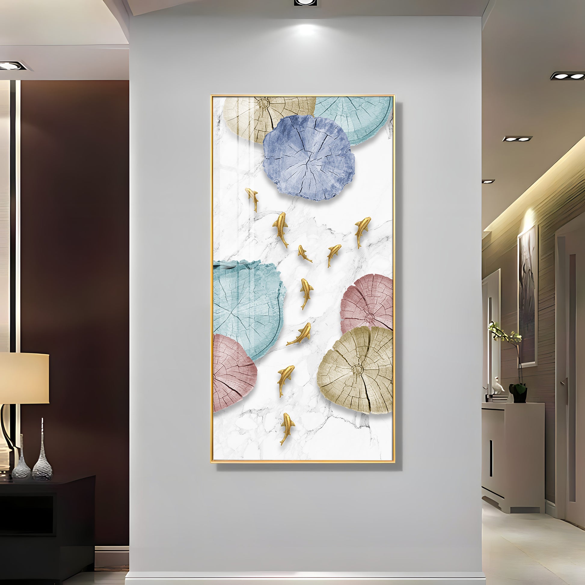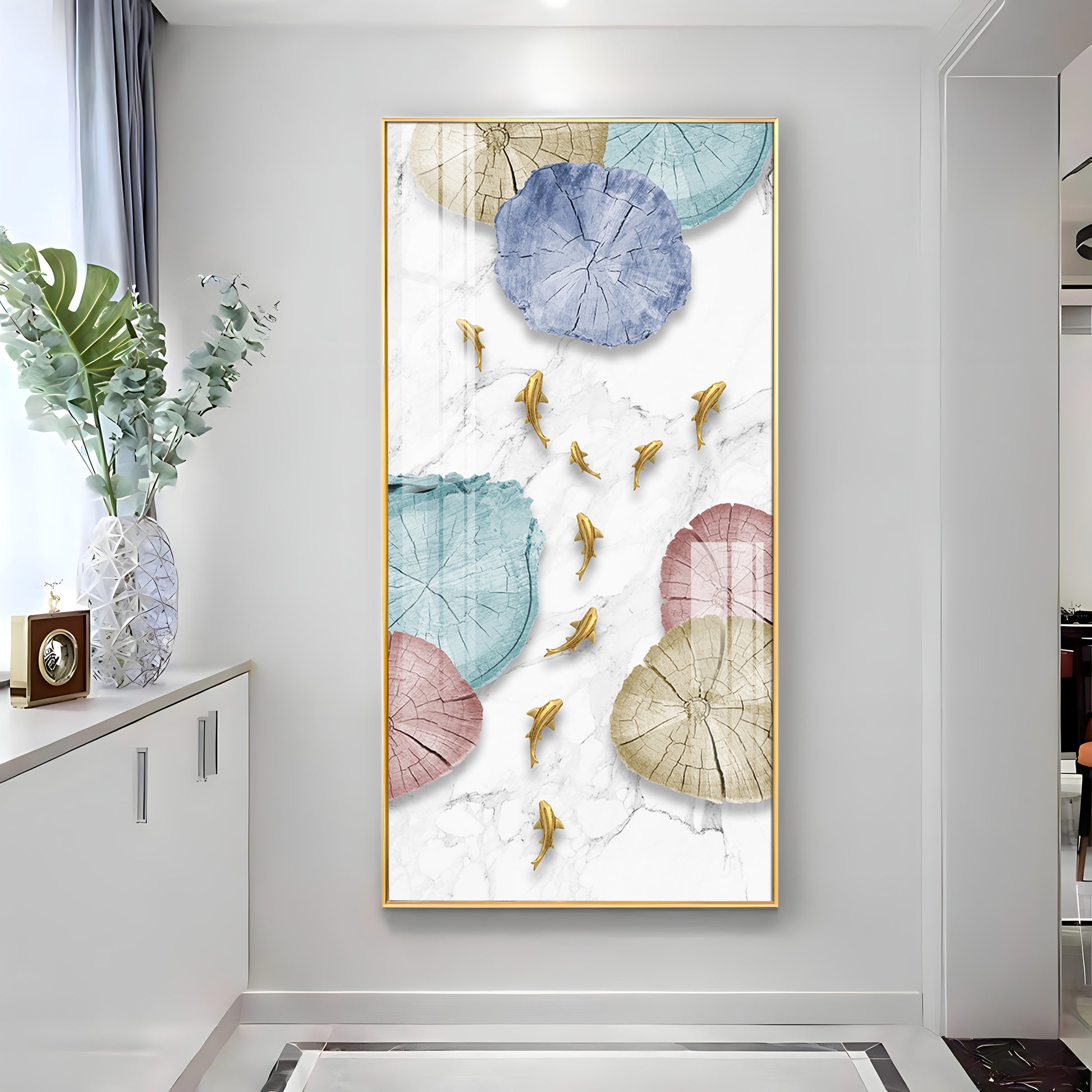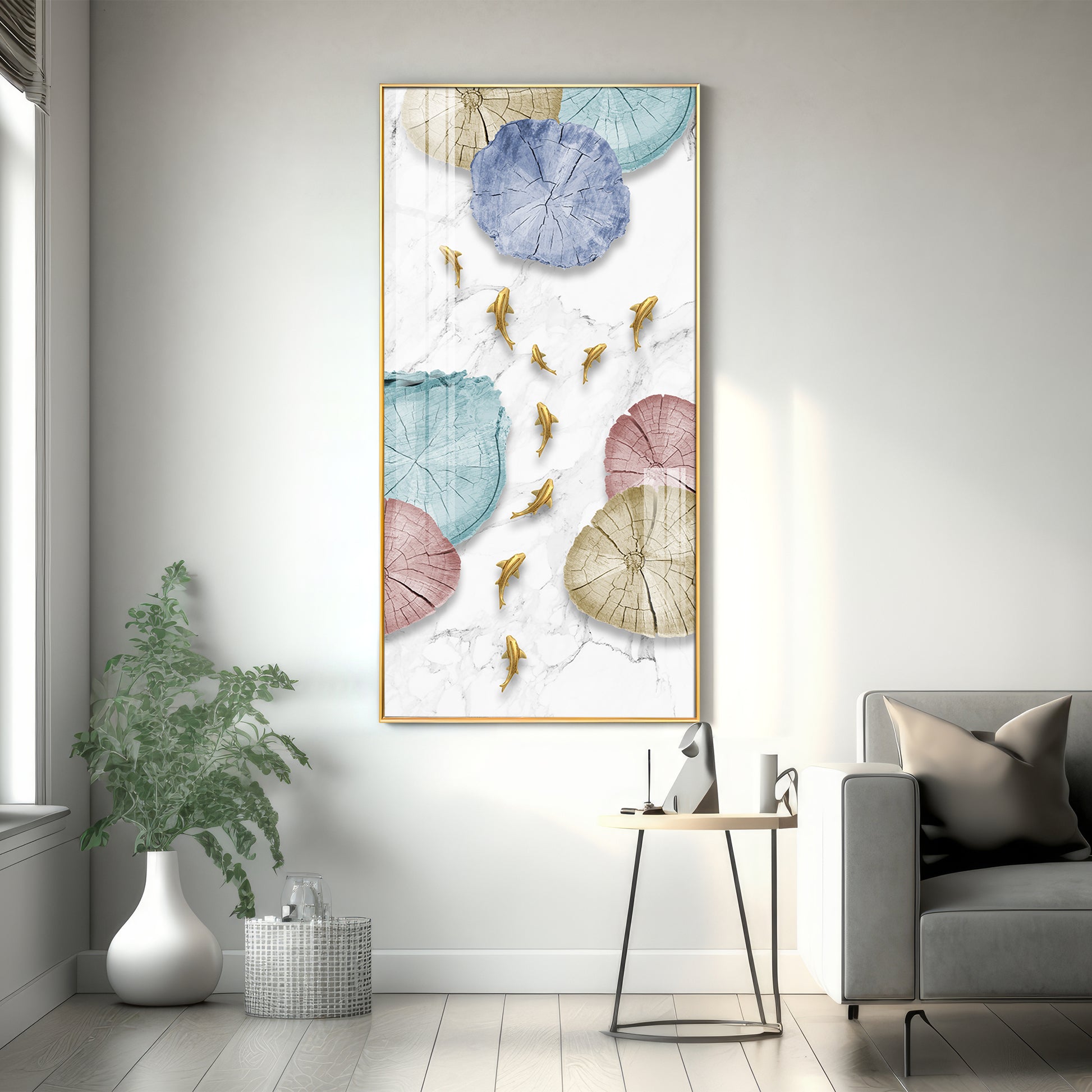 Golden Fish Umbrella Mosaic Glass Finish Vertical Wall Art