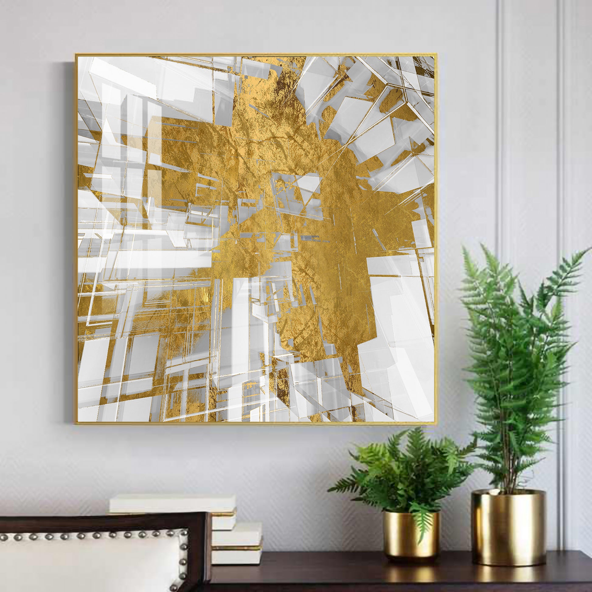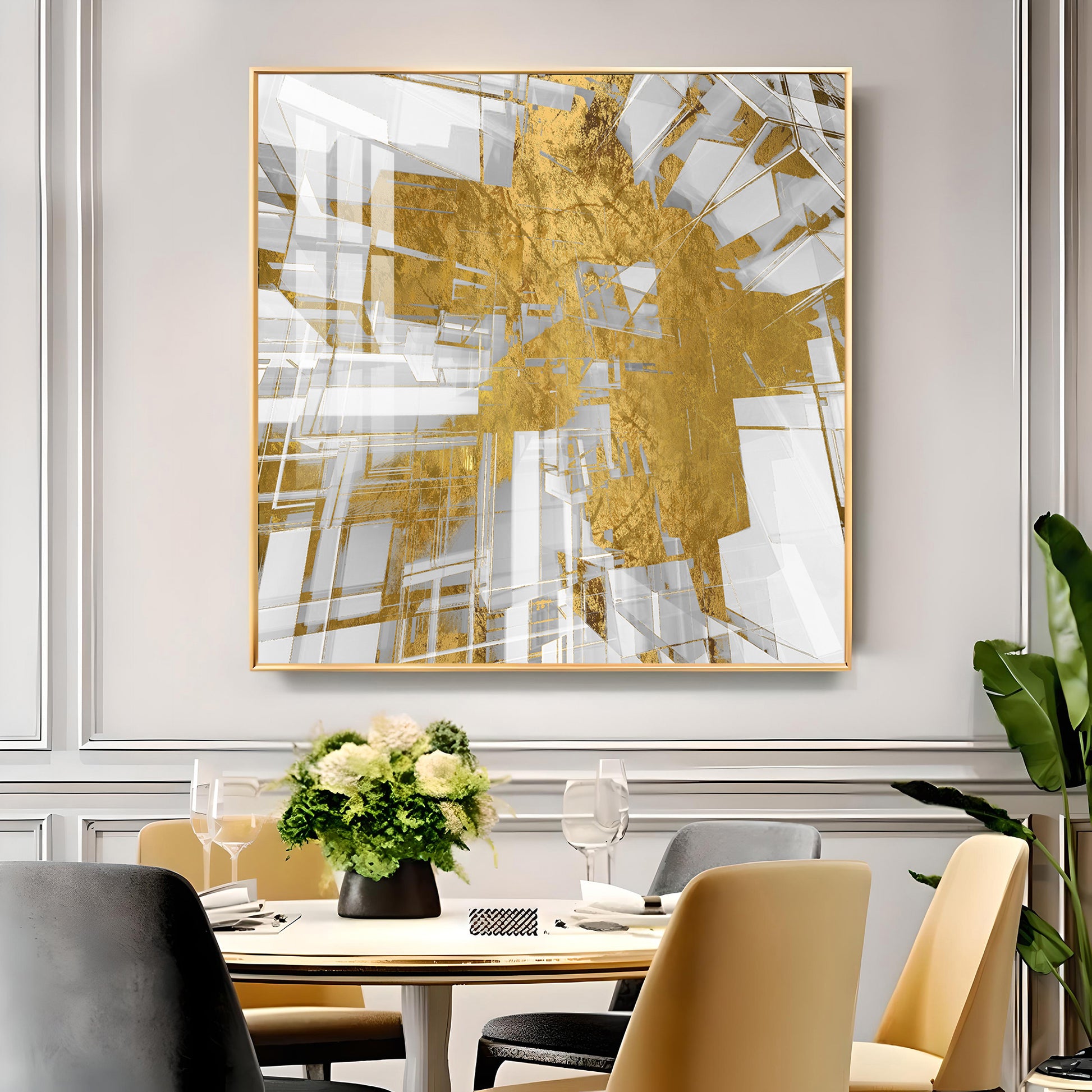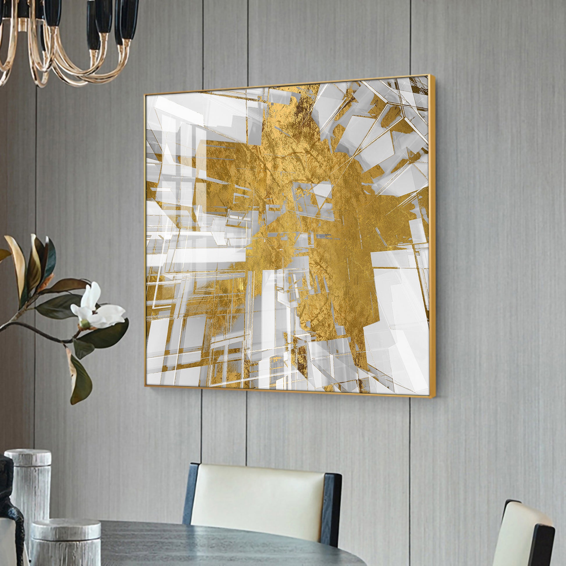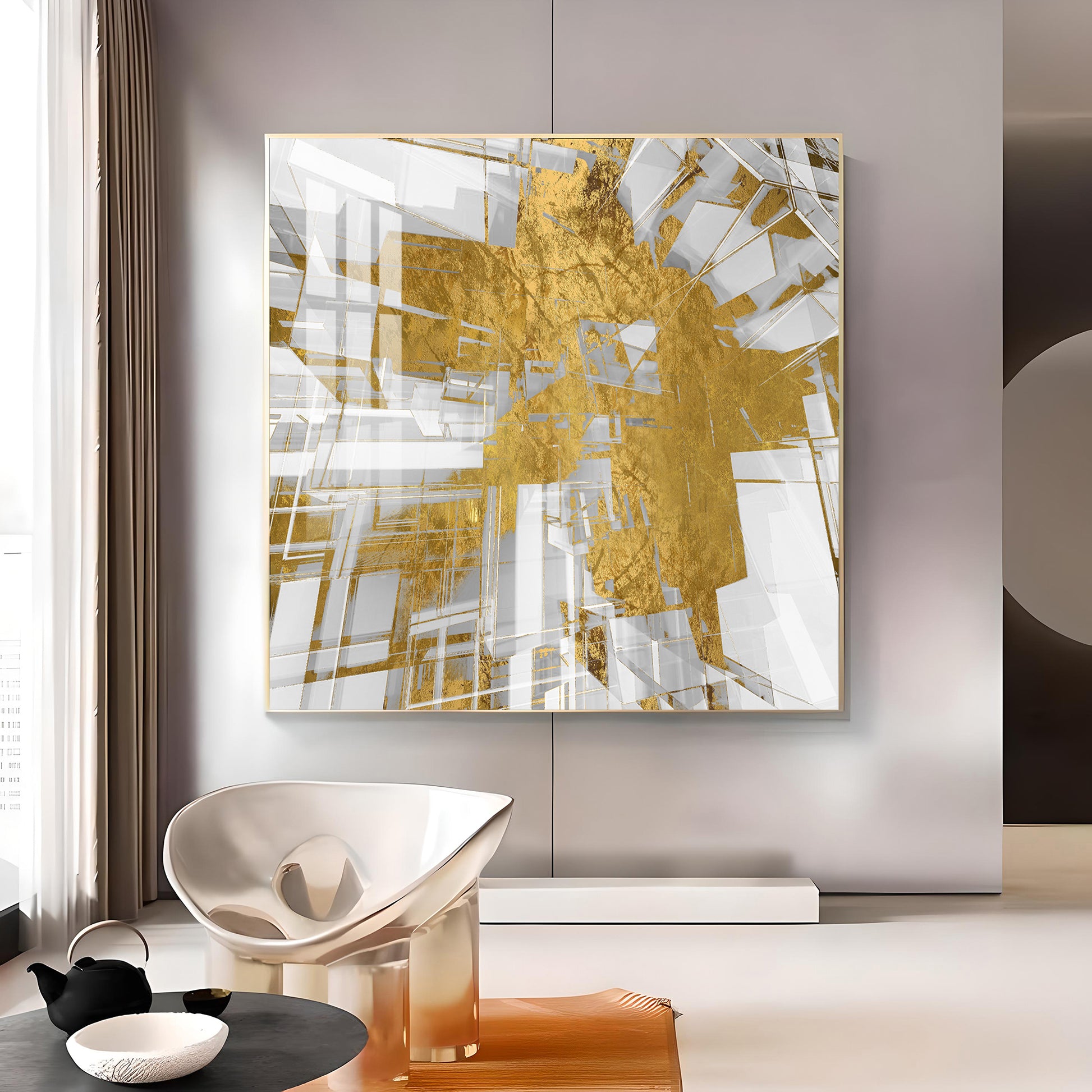 Symphony in Gold and White Glass Finish Square Wall Art