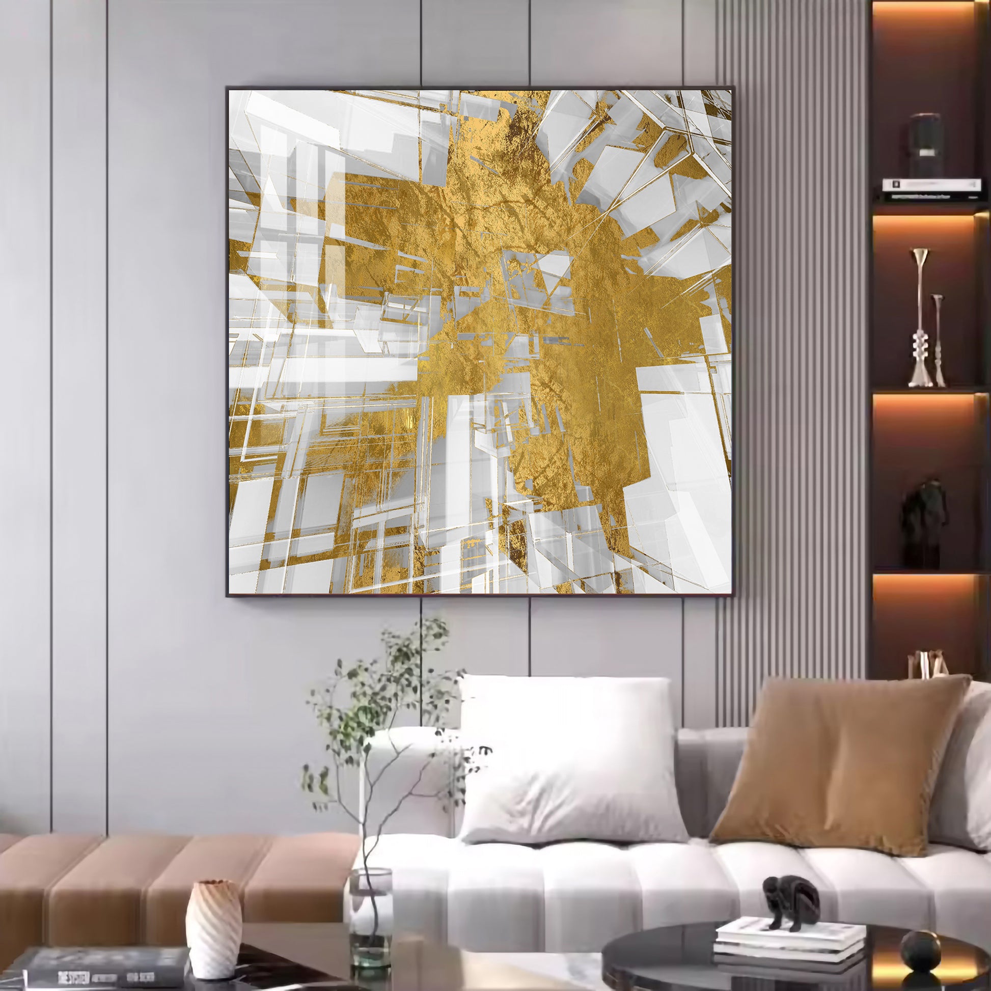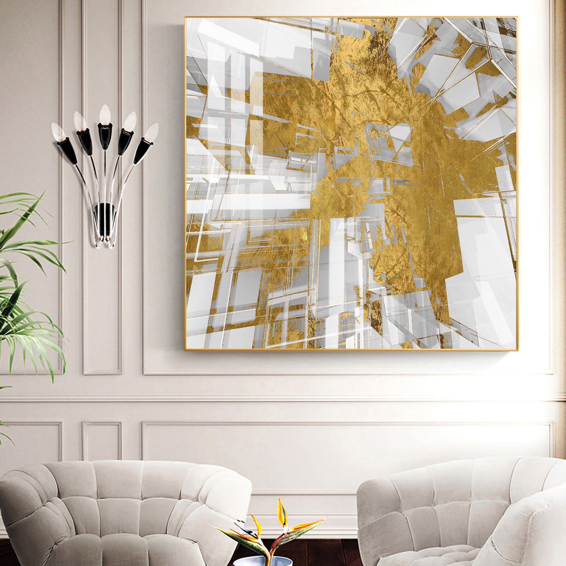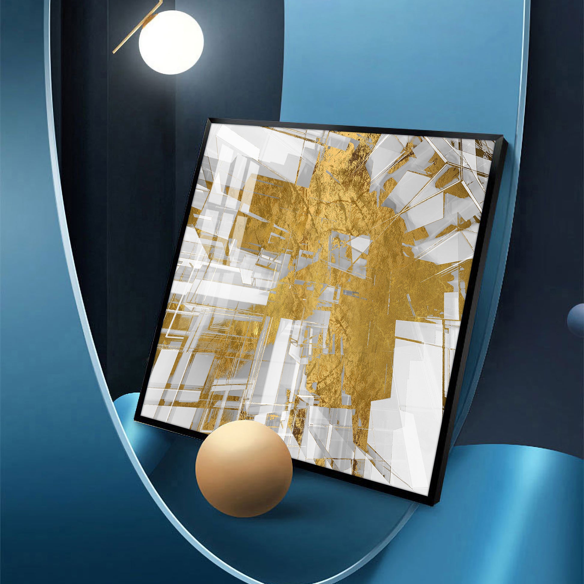 Symphony in Gold and White Glass Finish Square Wall Art