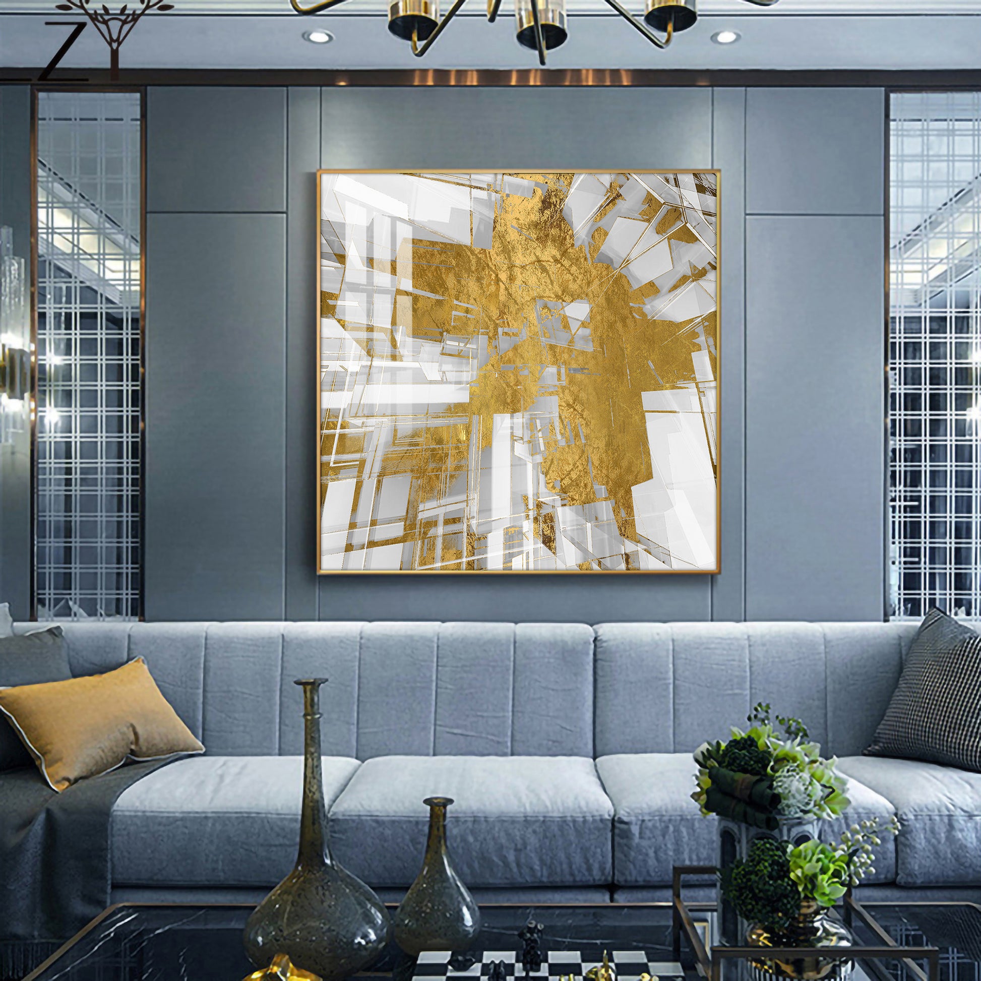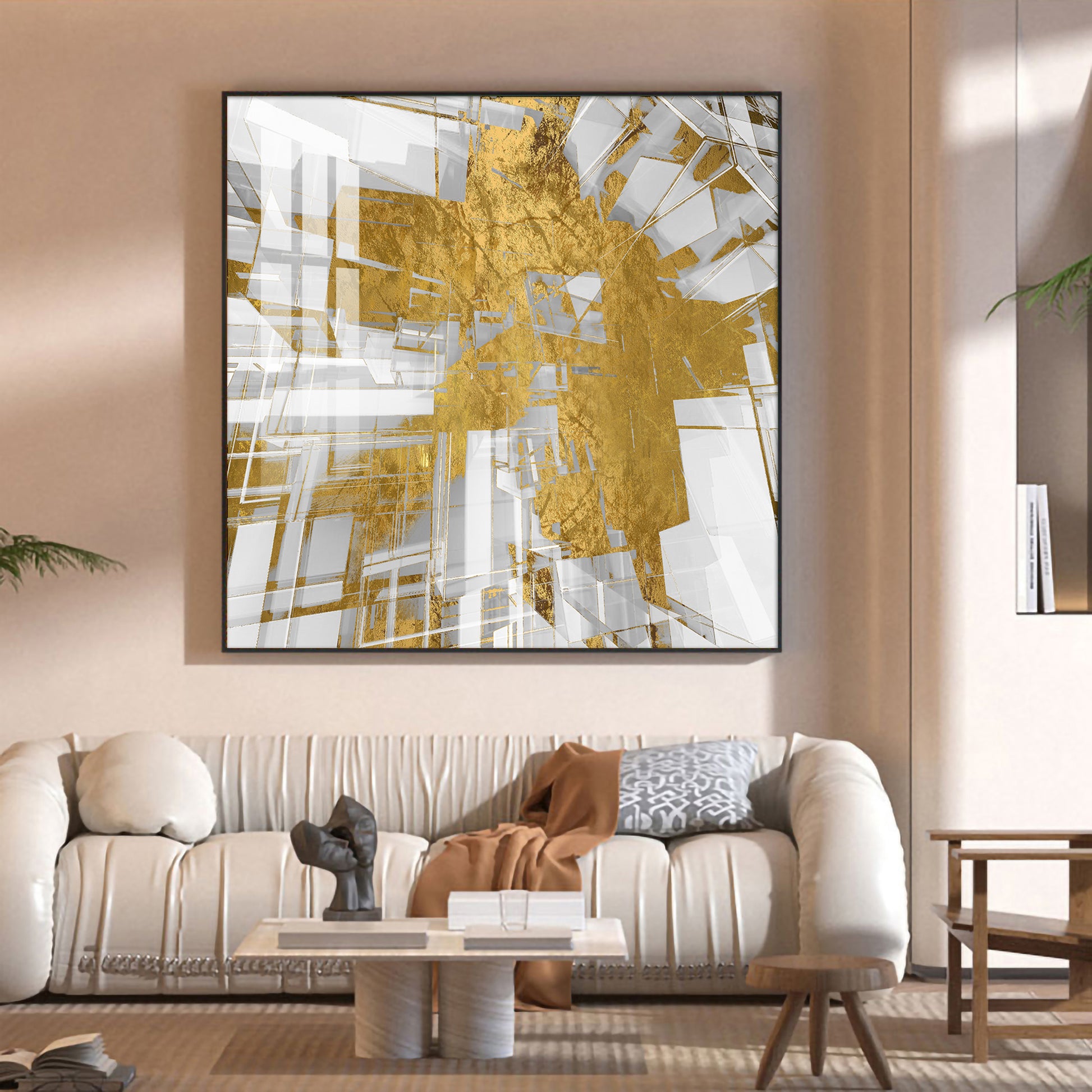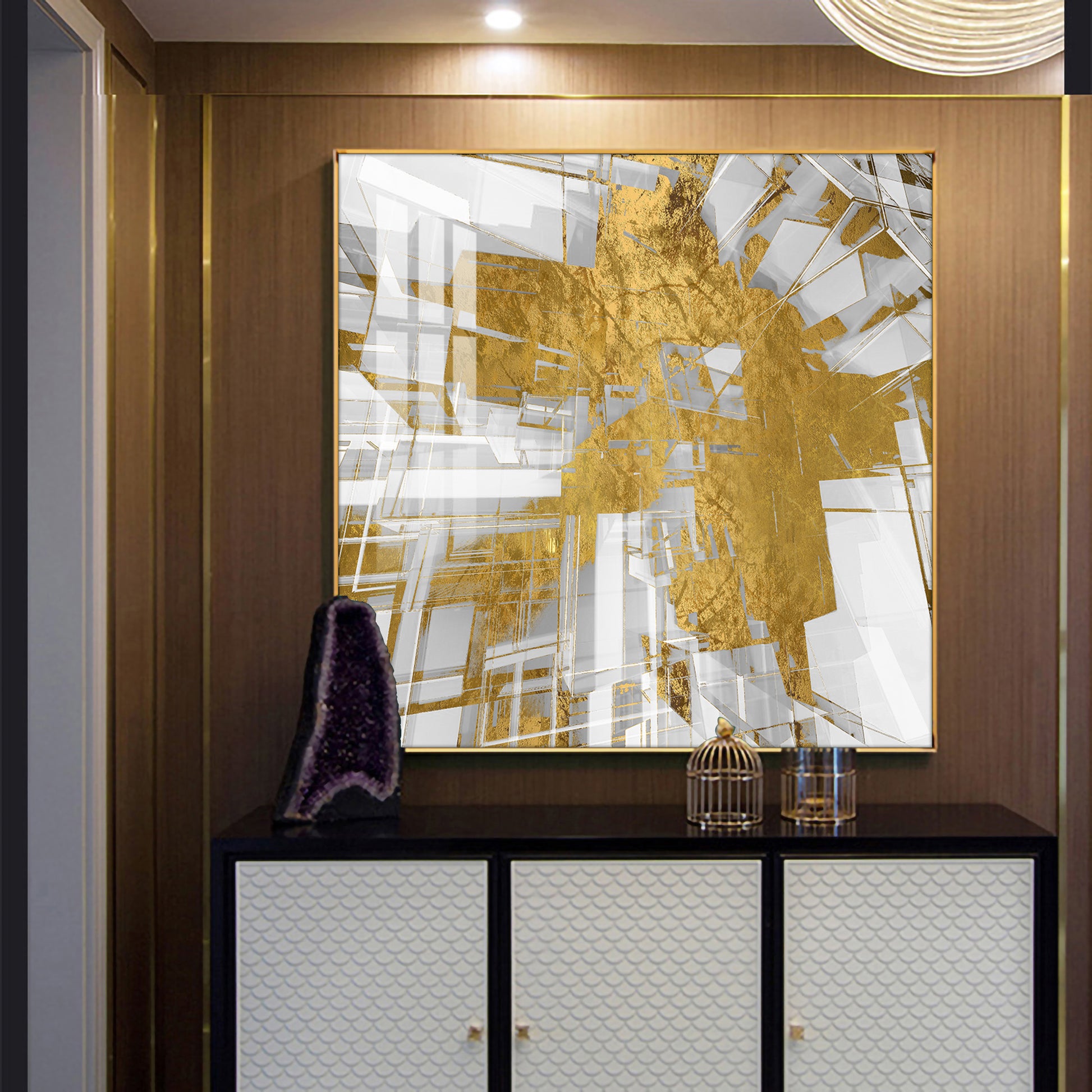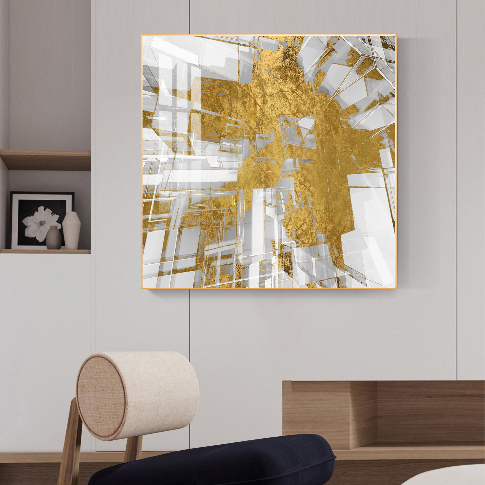 Symphony in Gold and White Glass Finish Square Wall Art