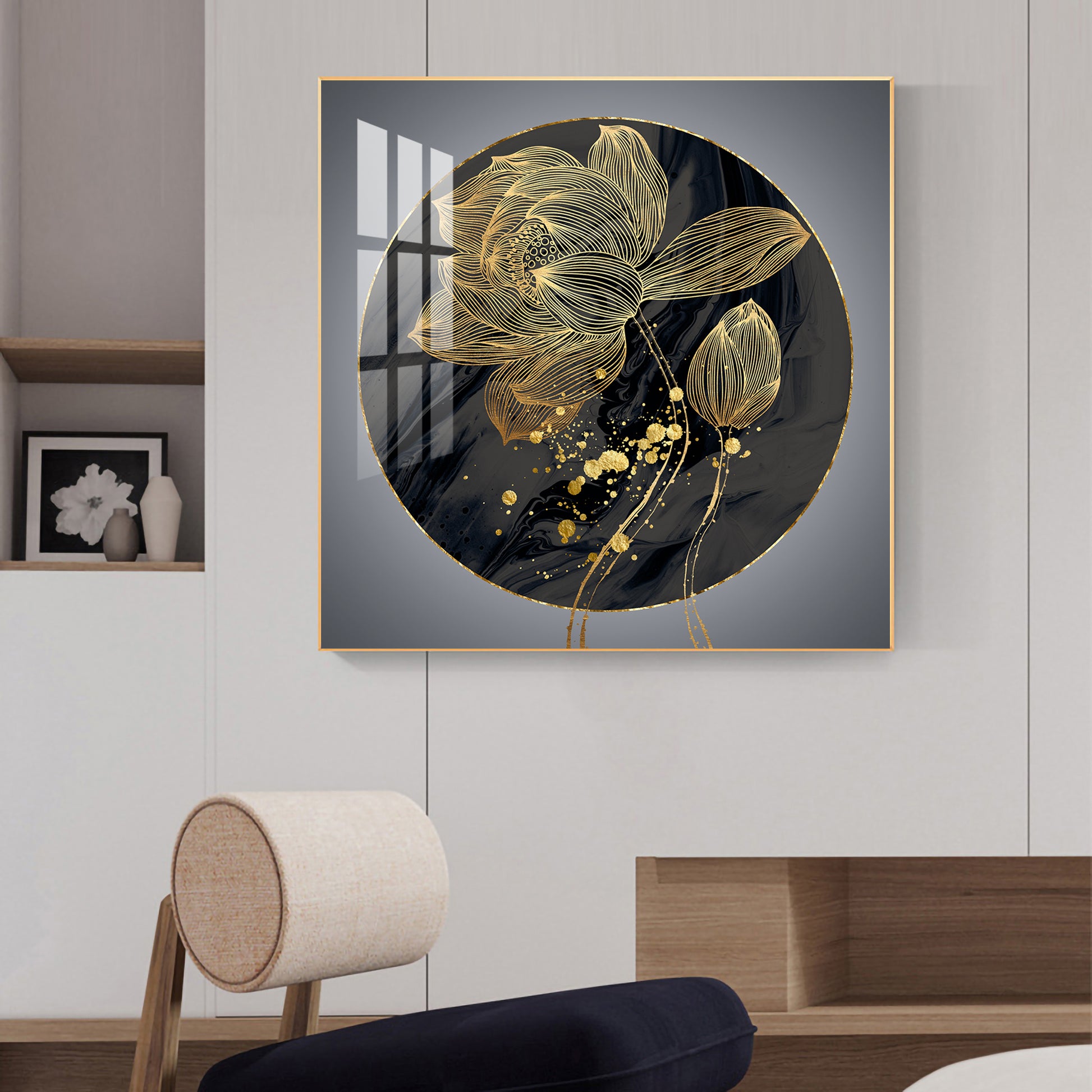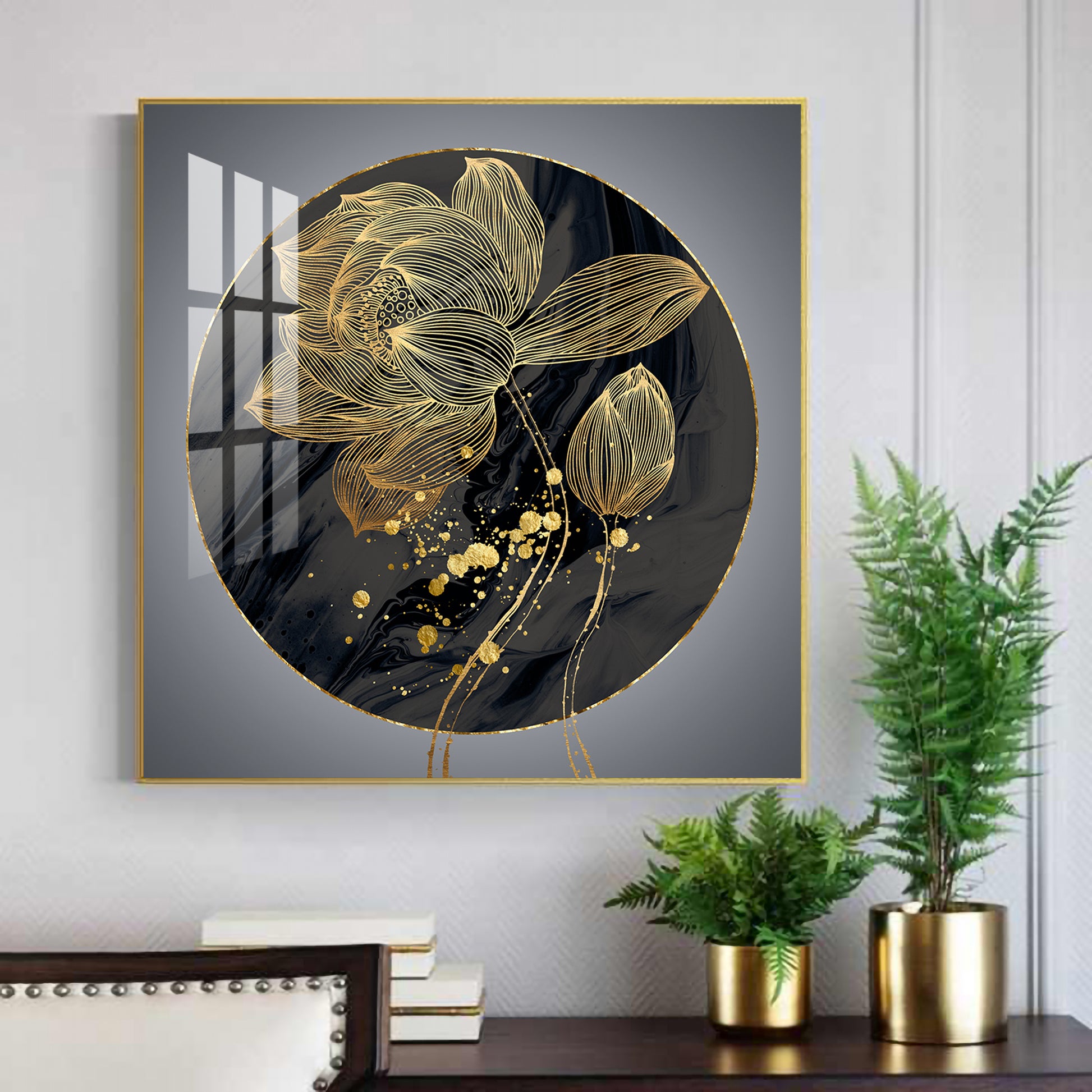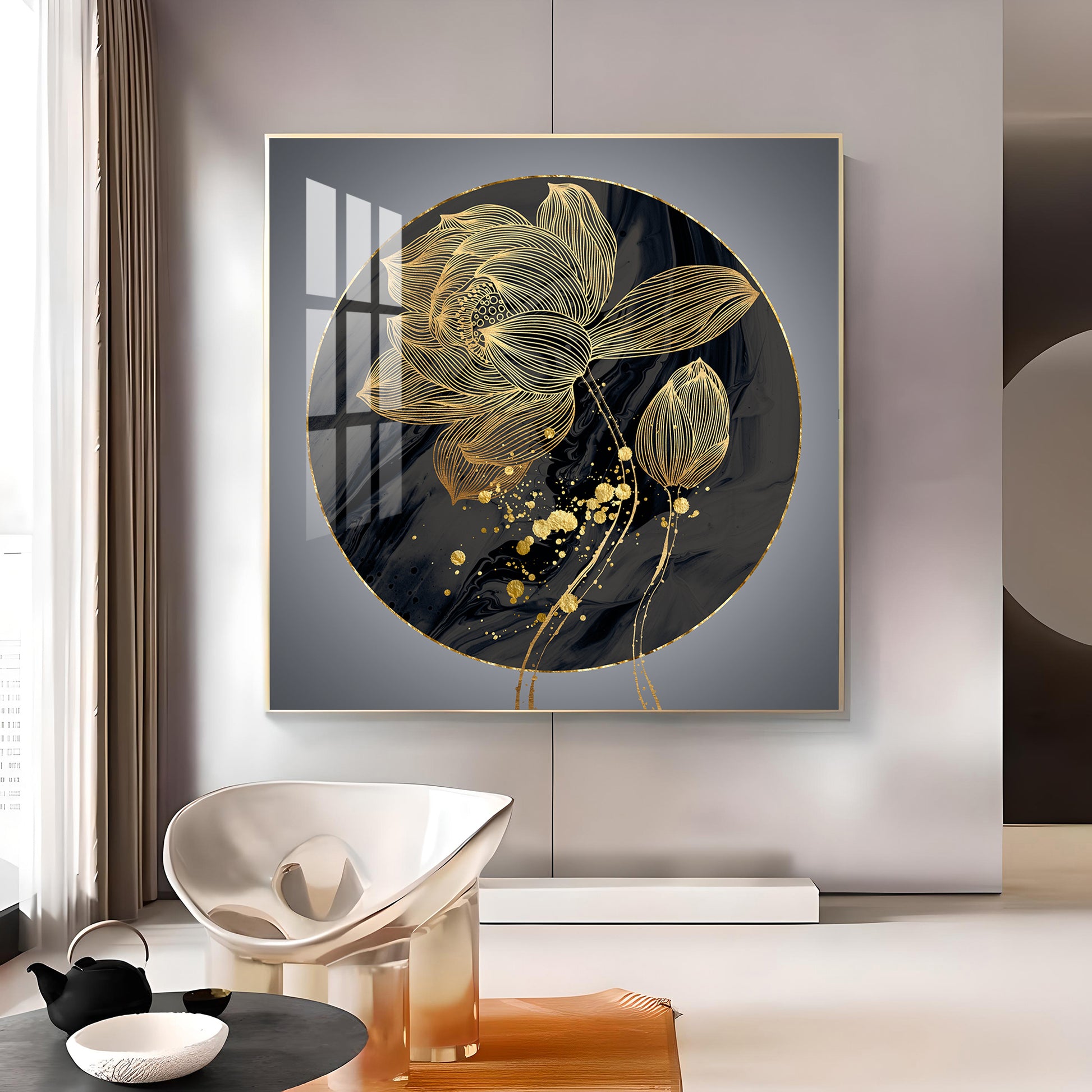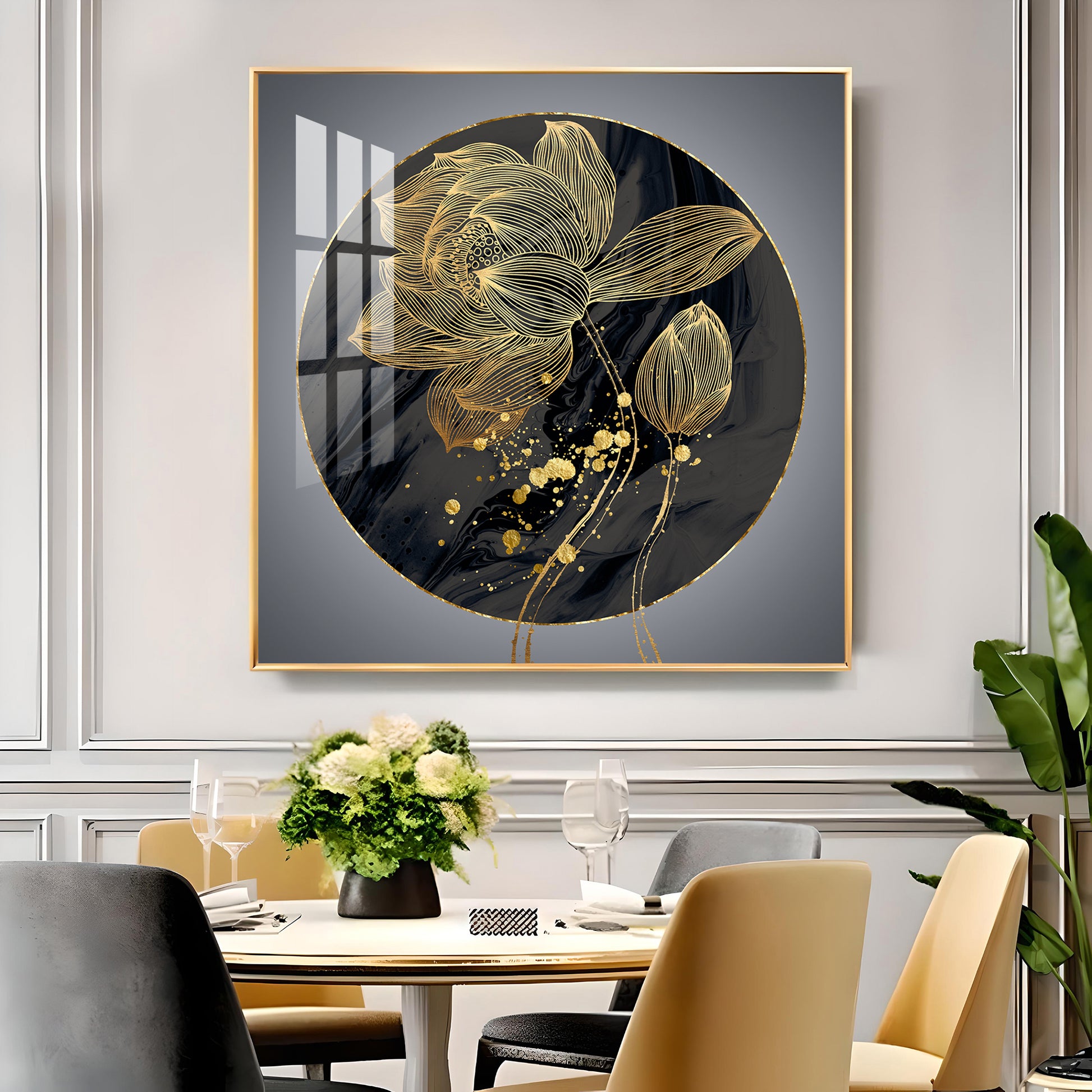 Golden Petal Grandeur Glass Finish Square Wall Art