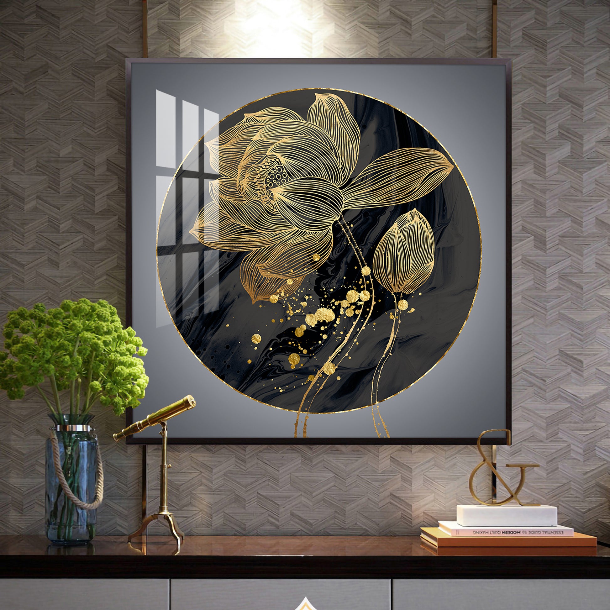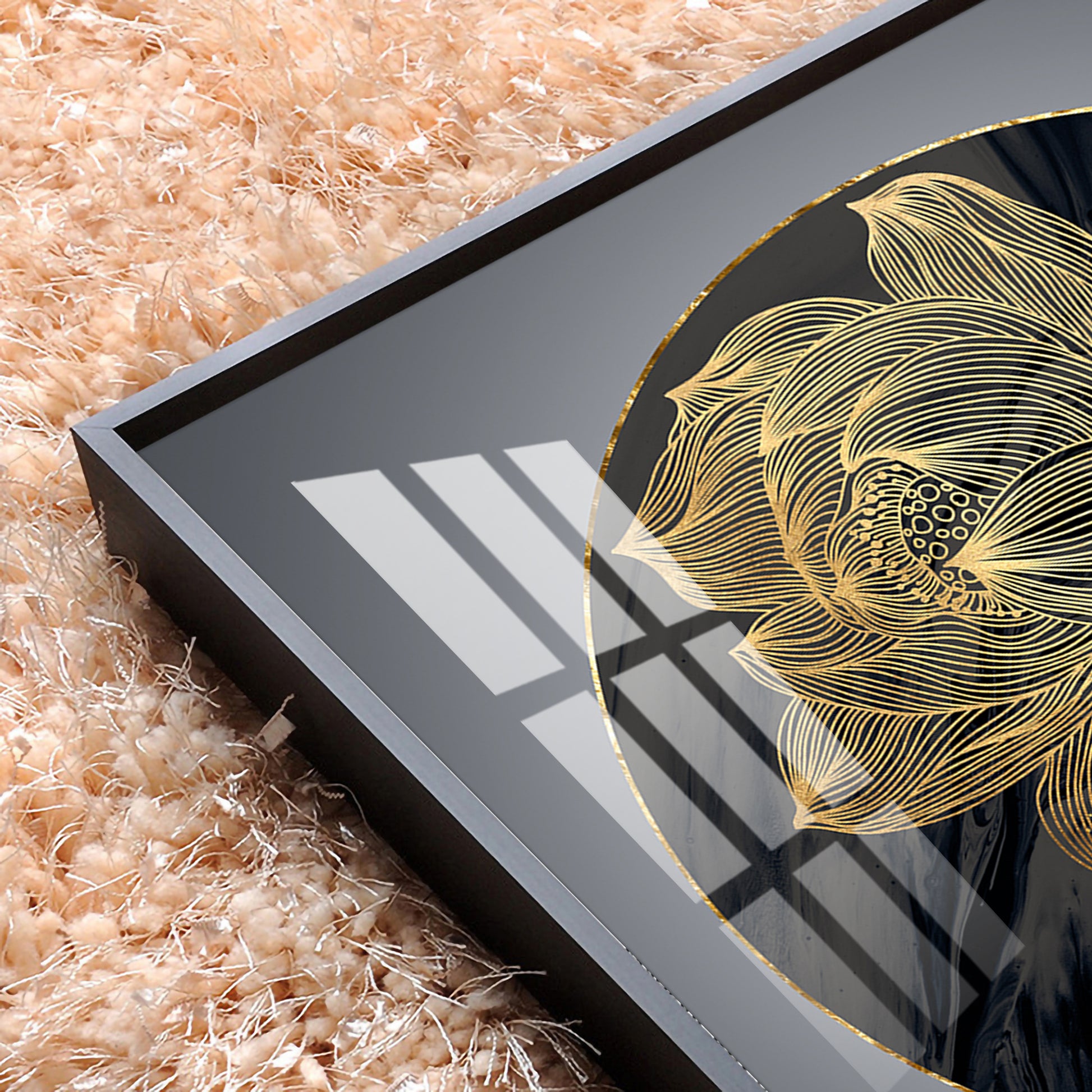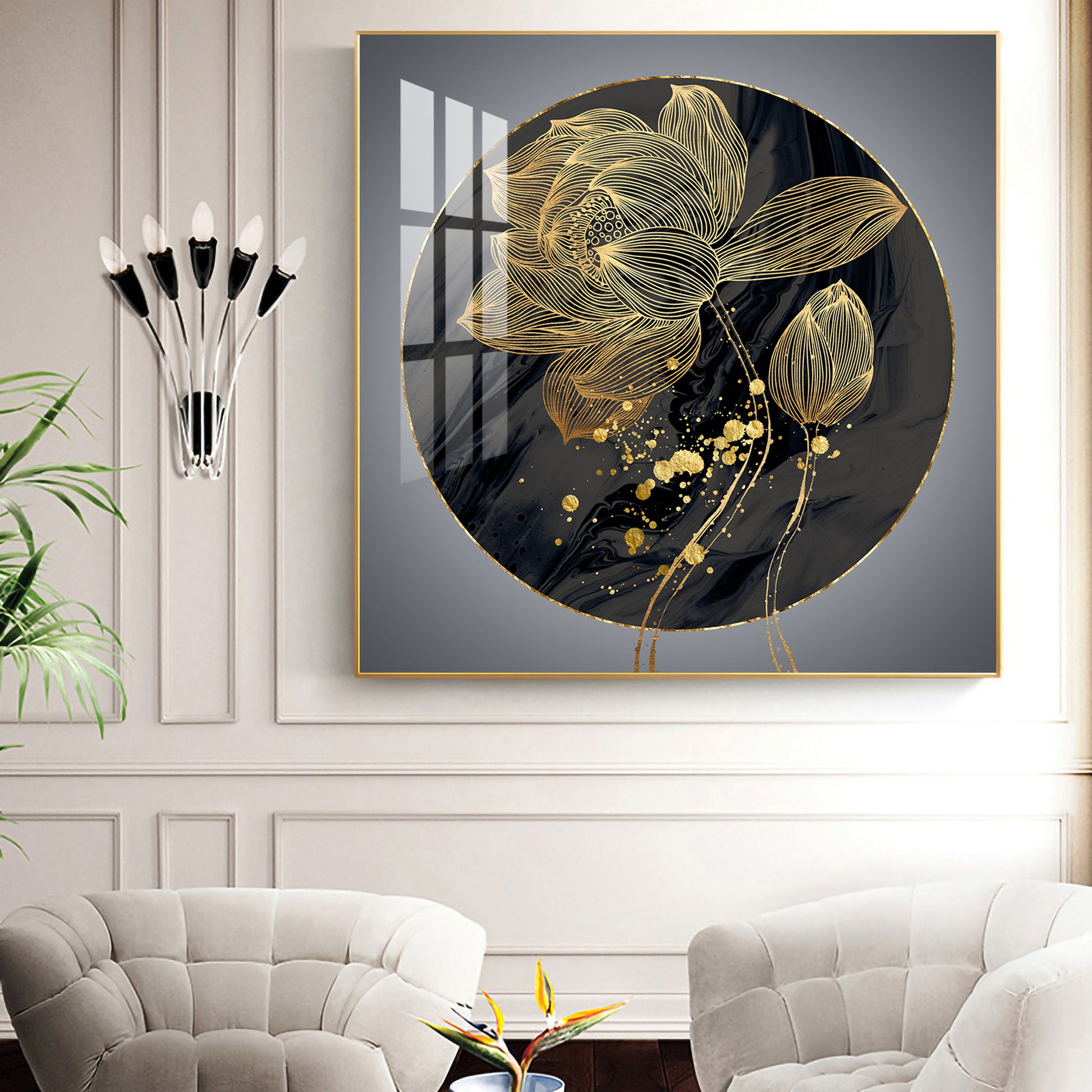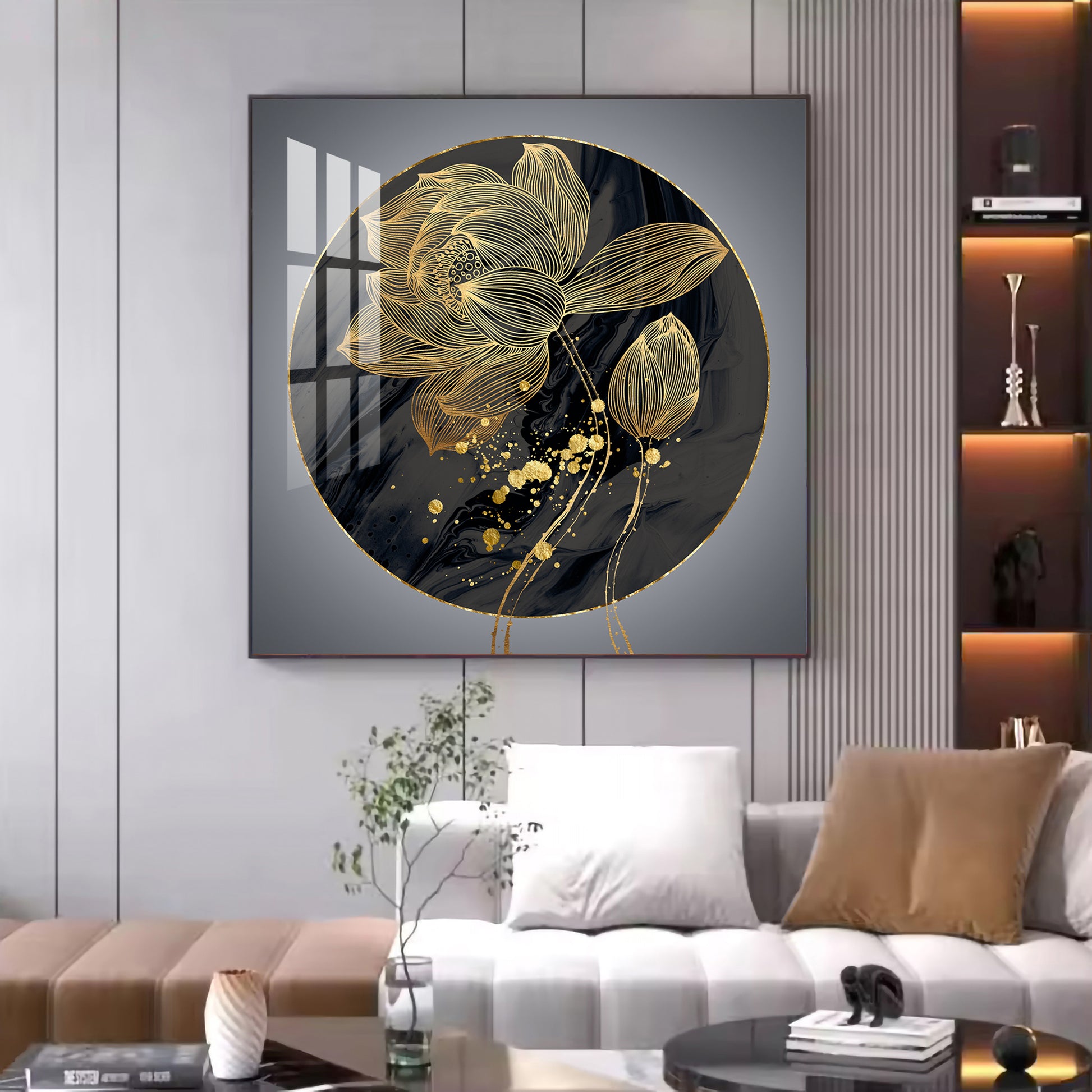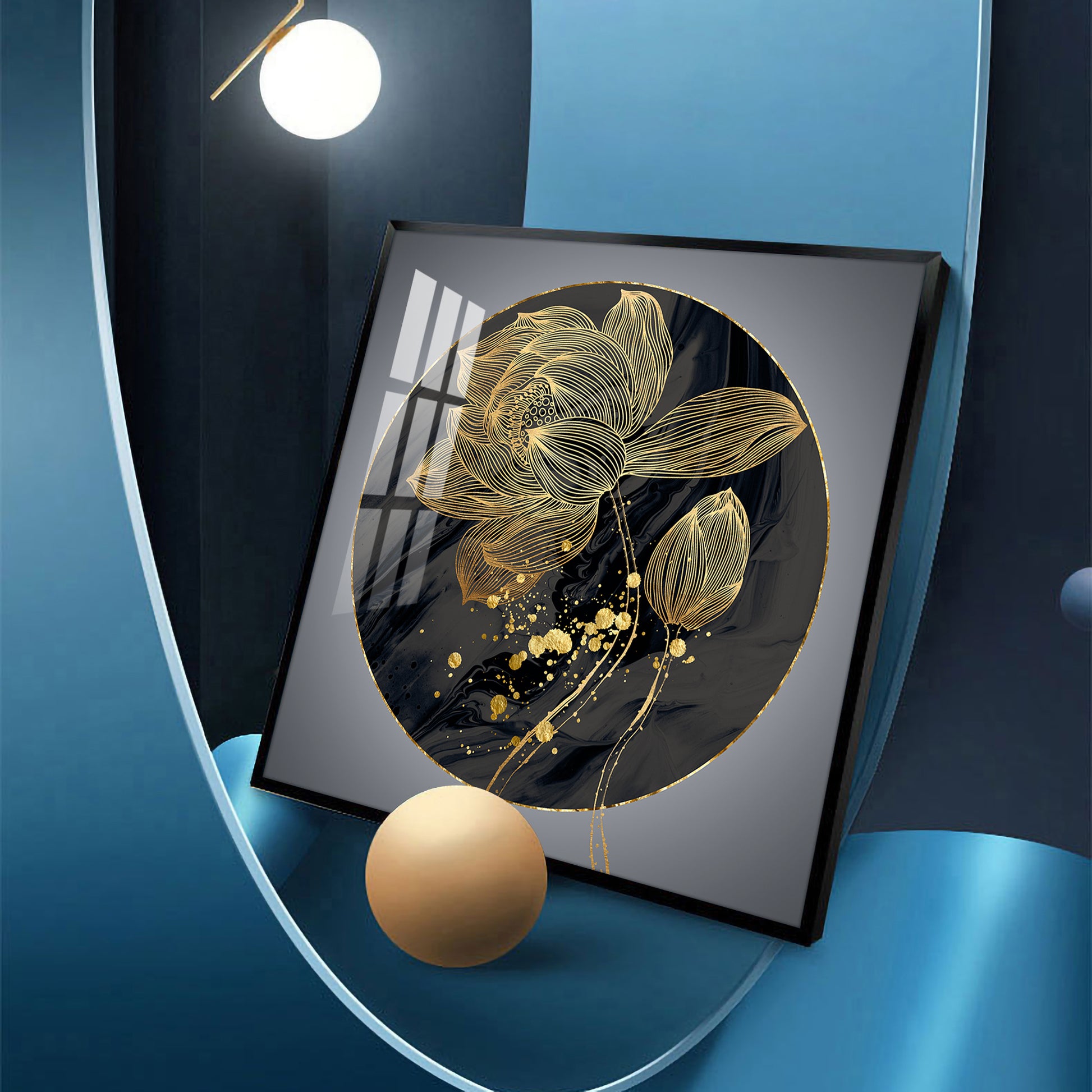 Golden Petal Grandeur Glass Finish Square Wall Art