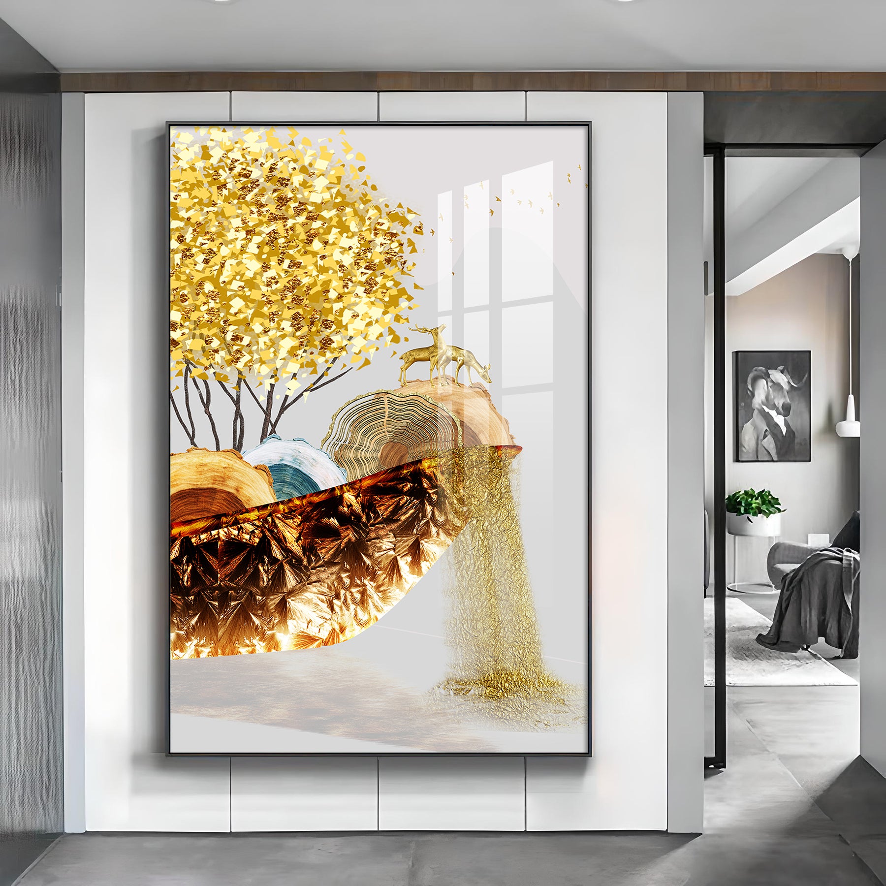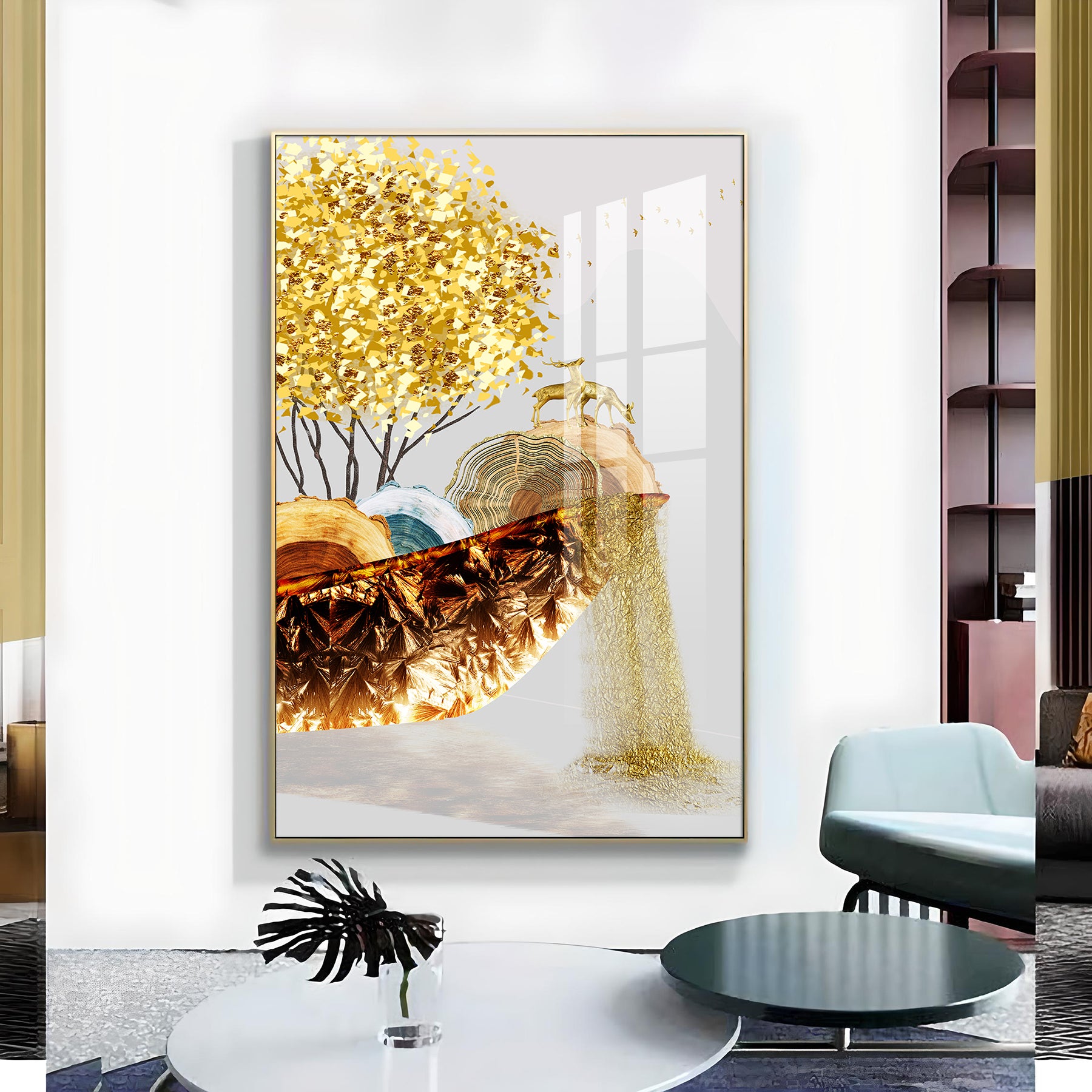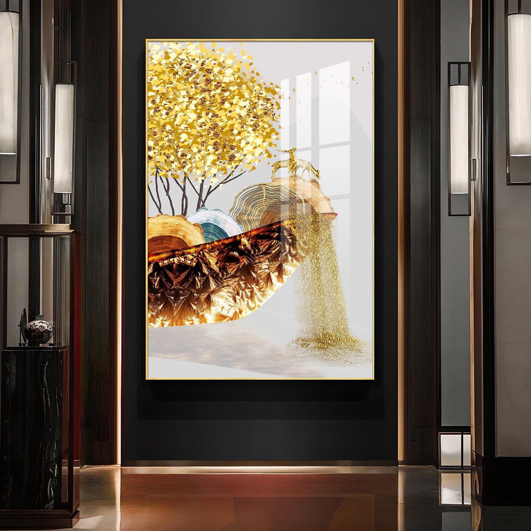 Golden Serenity Glass Finish Vertical Wall Art