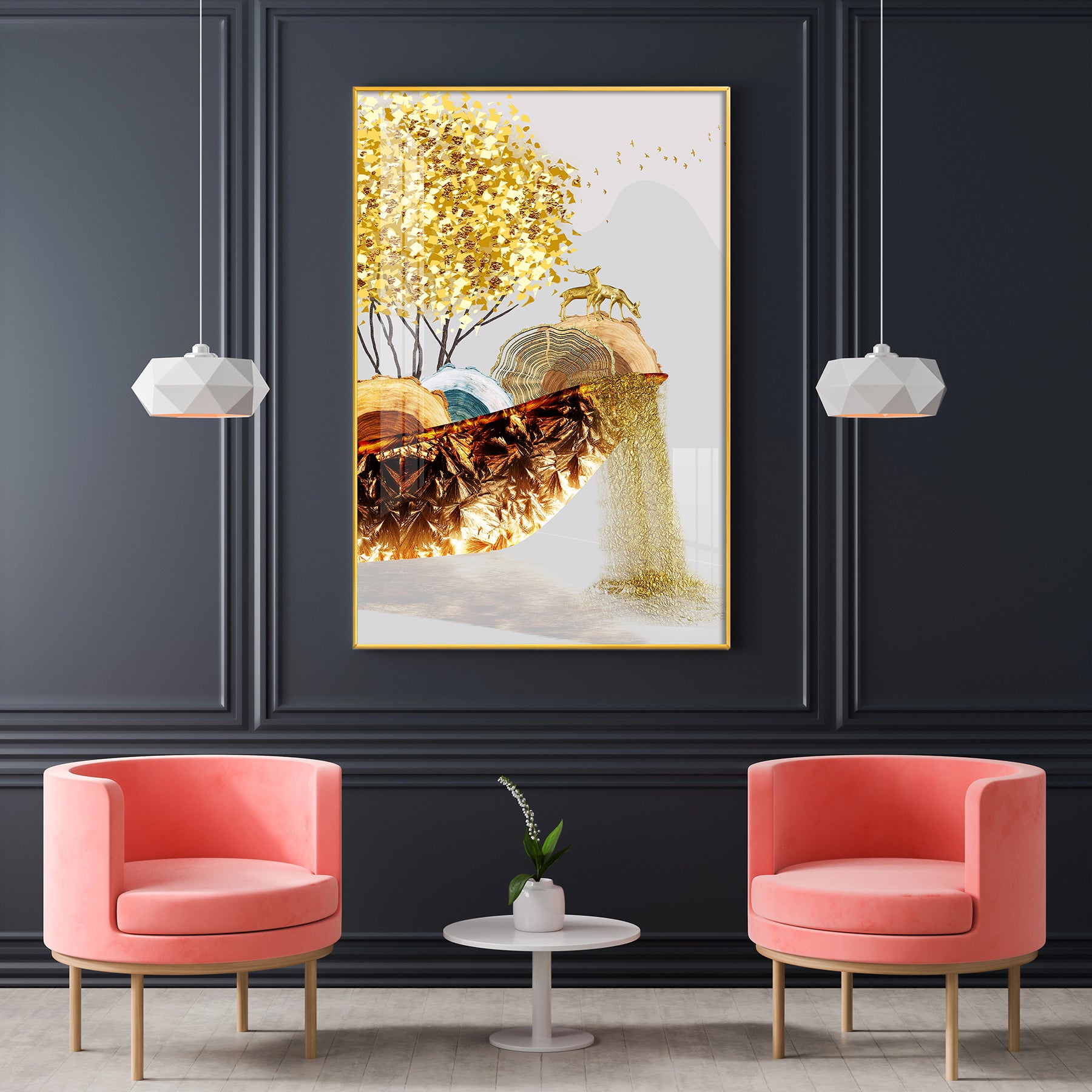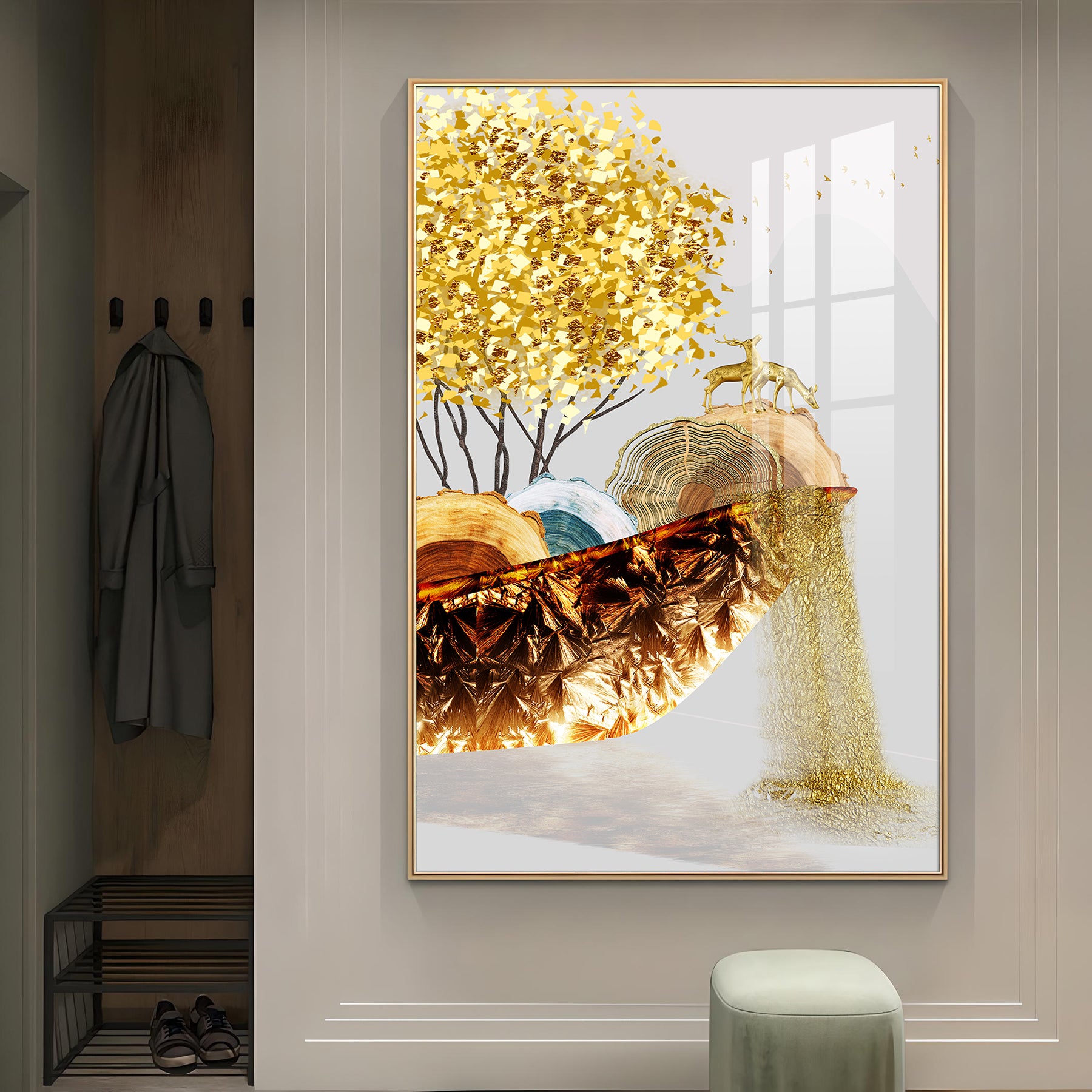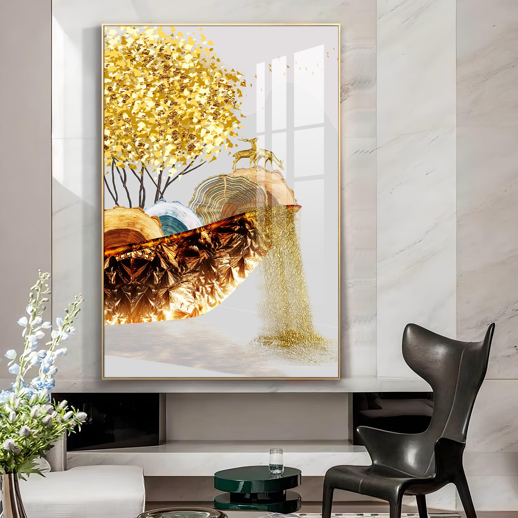 Golden Serenity Glass Finish Vertical Wall Art