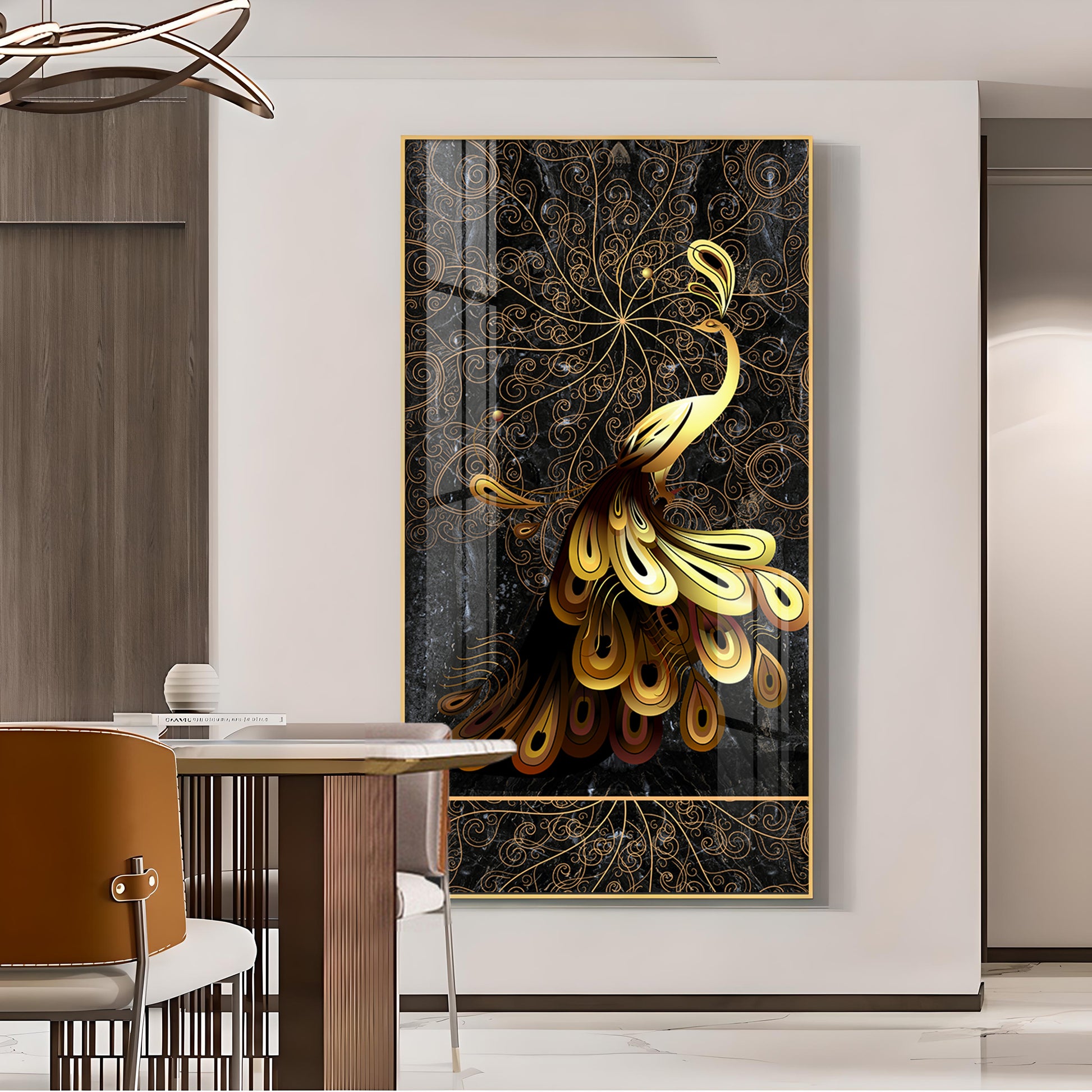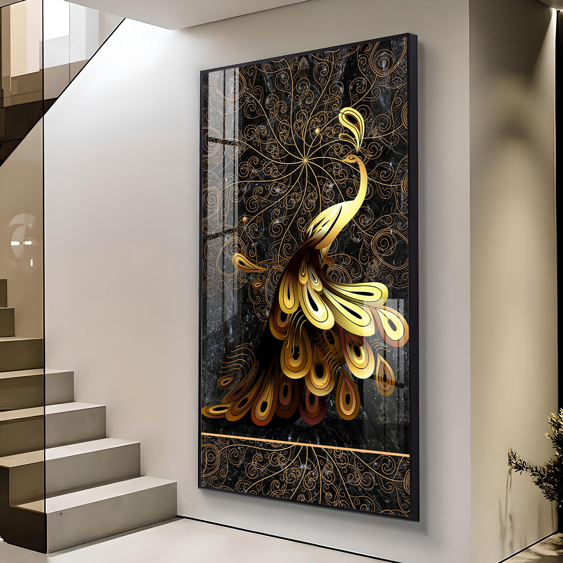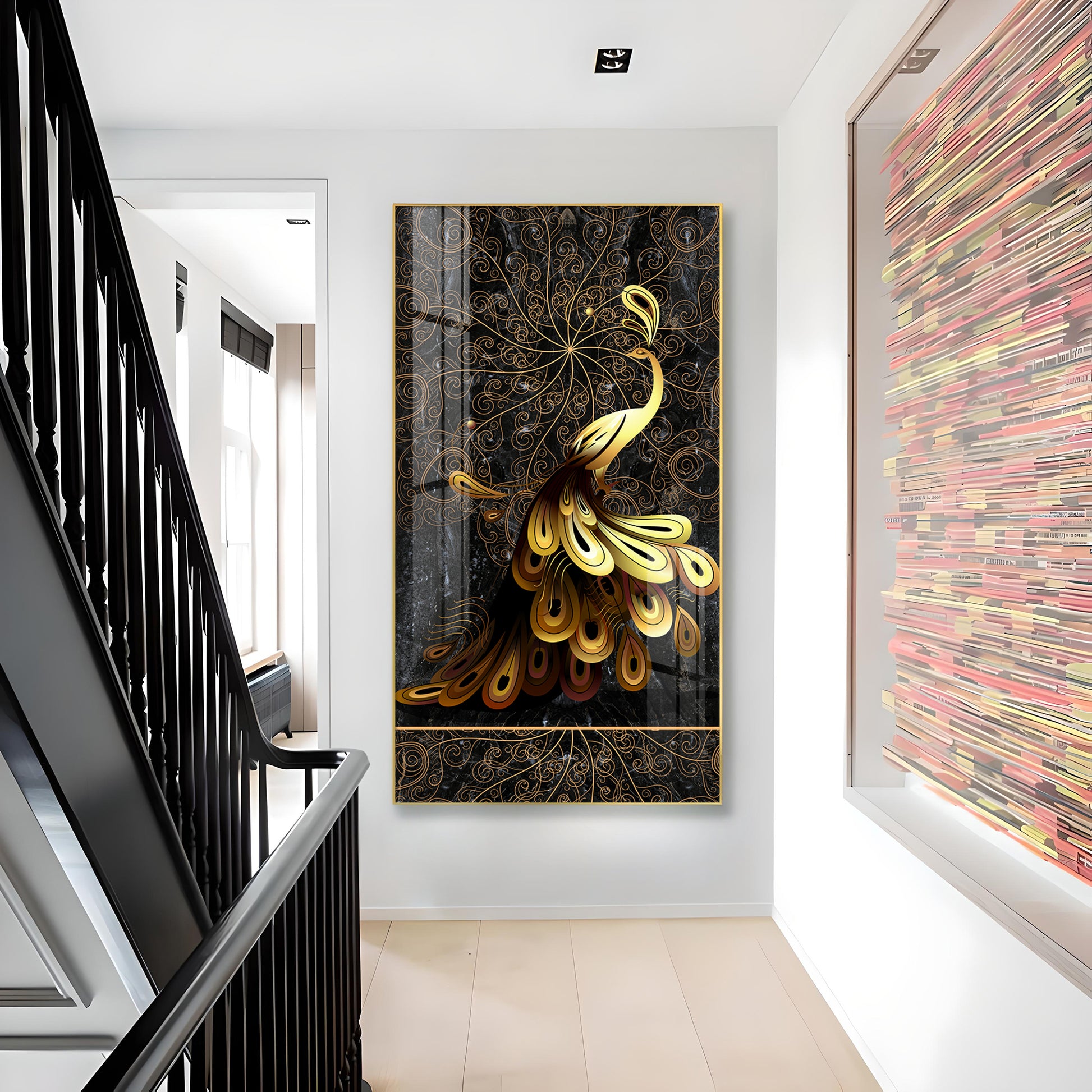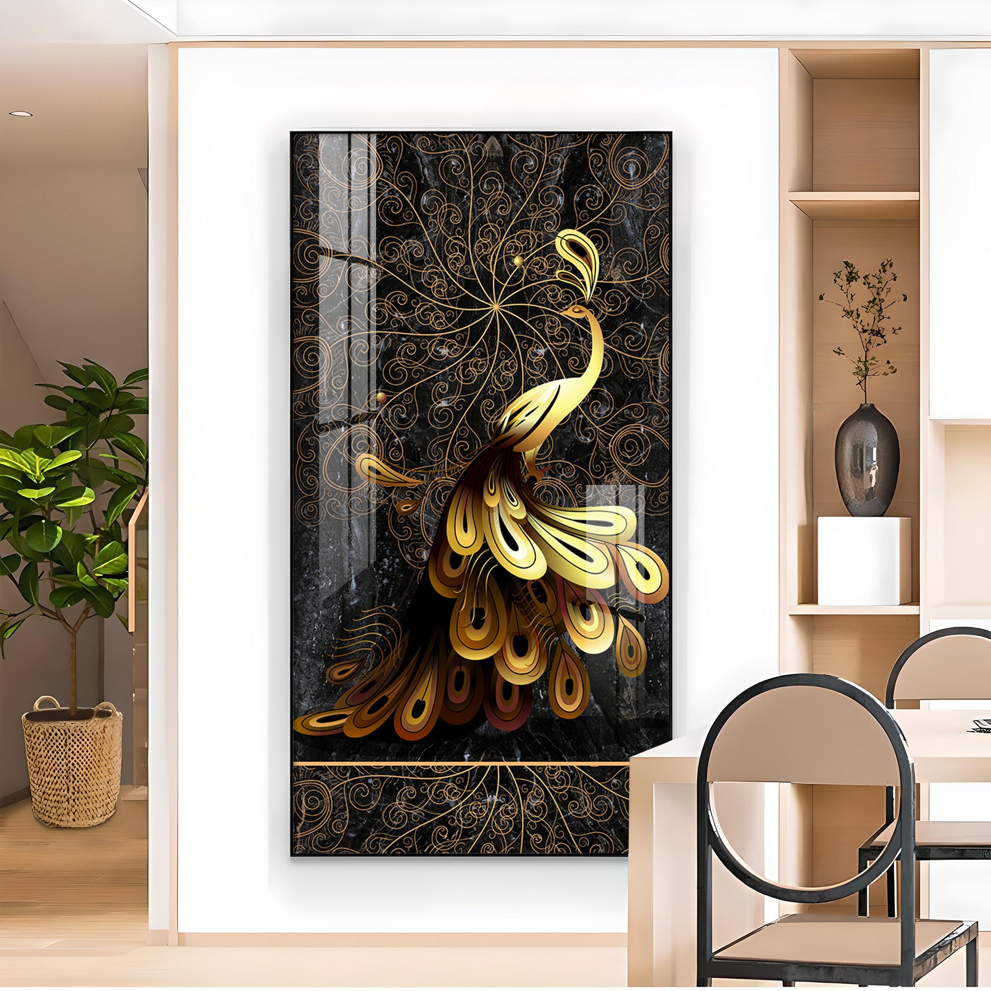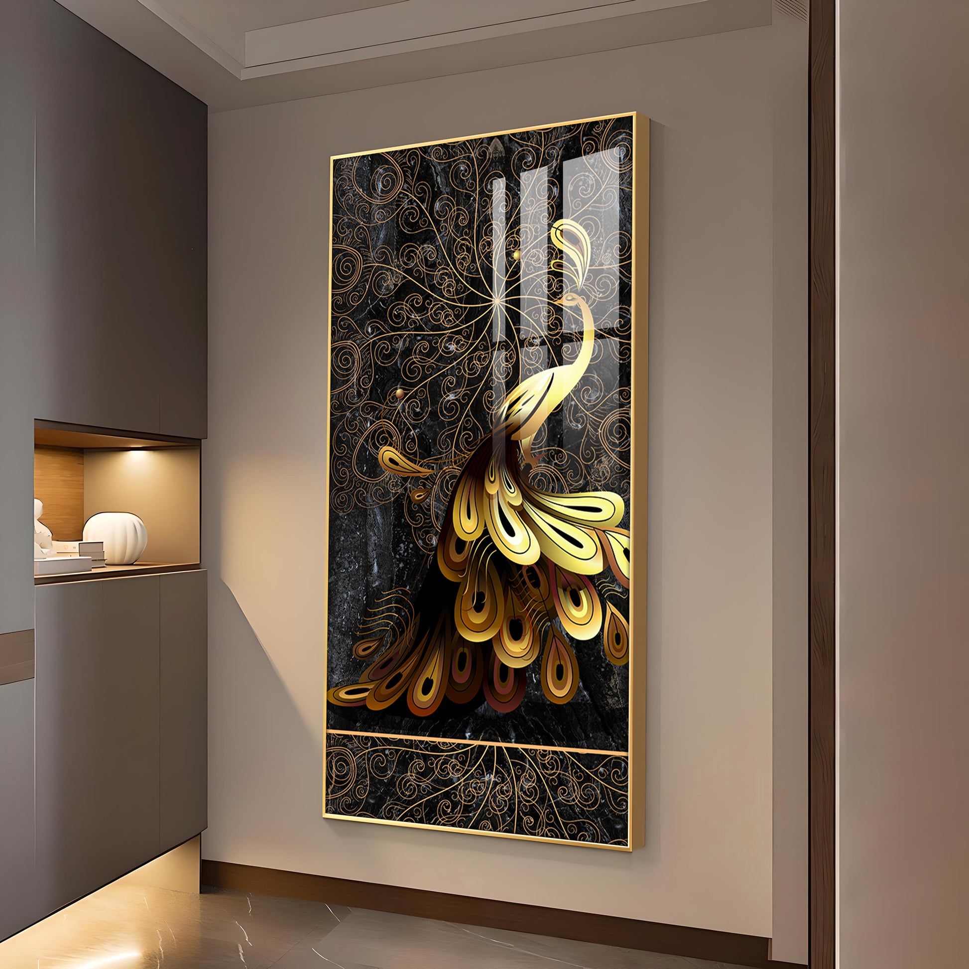 Golden Veil Peacock Glass Finish Vertical Wall Art